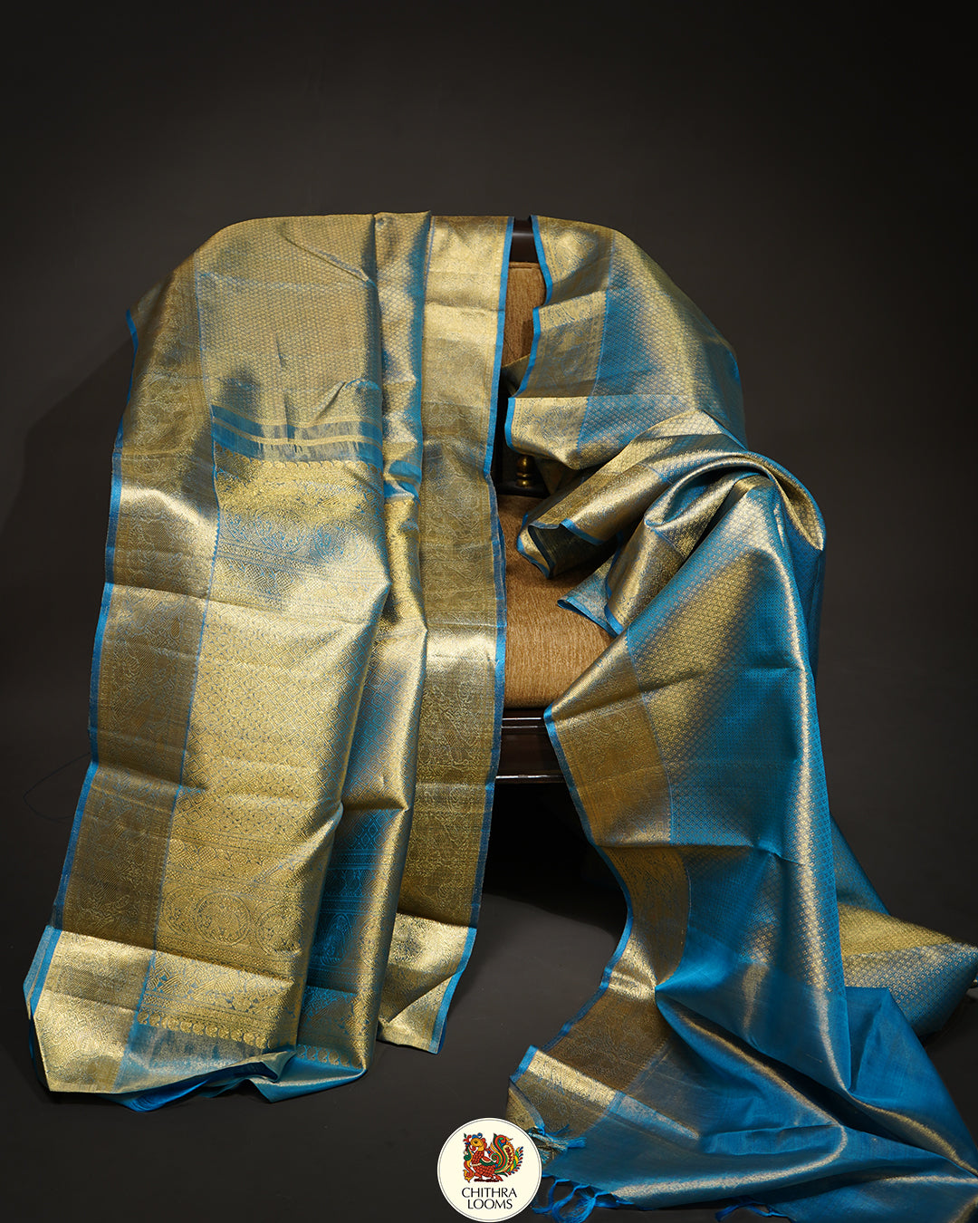 This tissue kanjipuram is a classic kanjipuram silk , the warp is blue and the weft is pure gold Zari tissue , the whole body is brocade , the border is yazhli pet and the Palla is dense pure Zari Palla and blouse