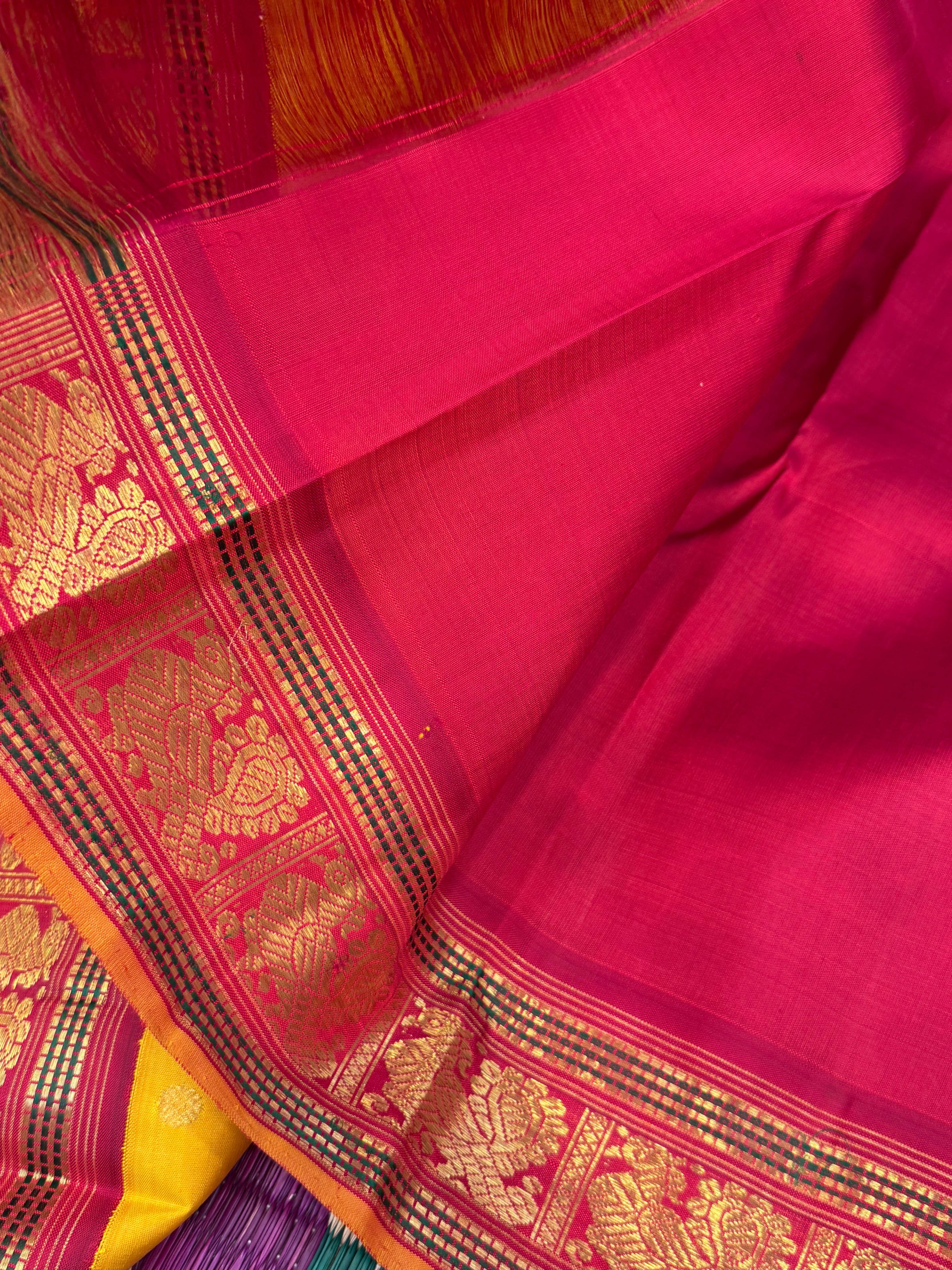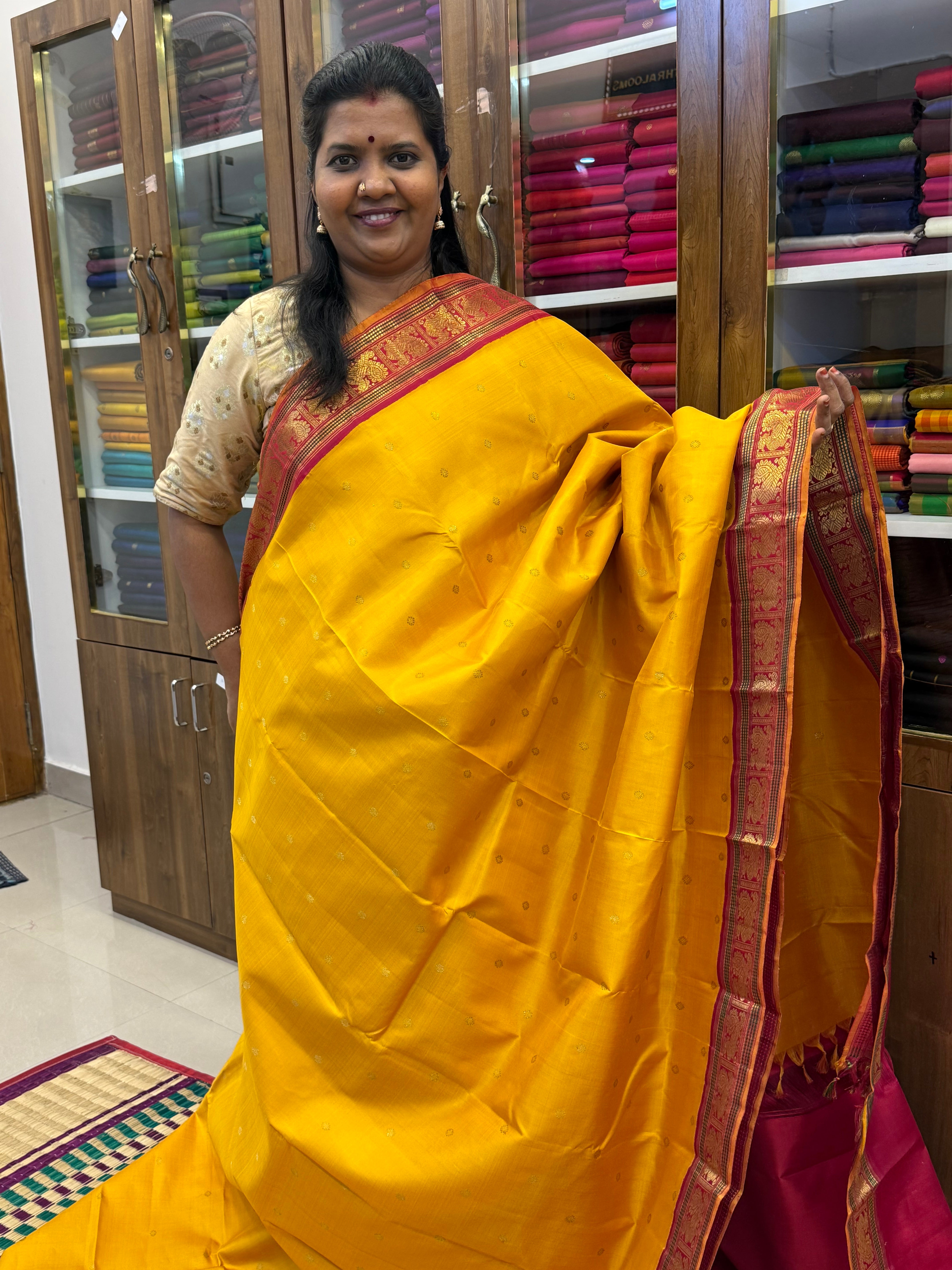 This saree is designed by master weaver with annam pet border in red Kai Korvai and yellow body with Kamalam Butta and the Palla is dense pure Zari Palla and blouse