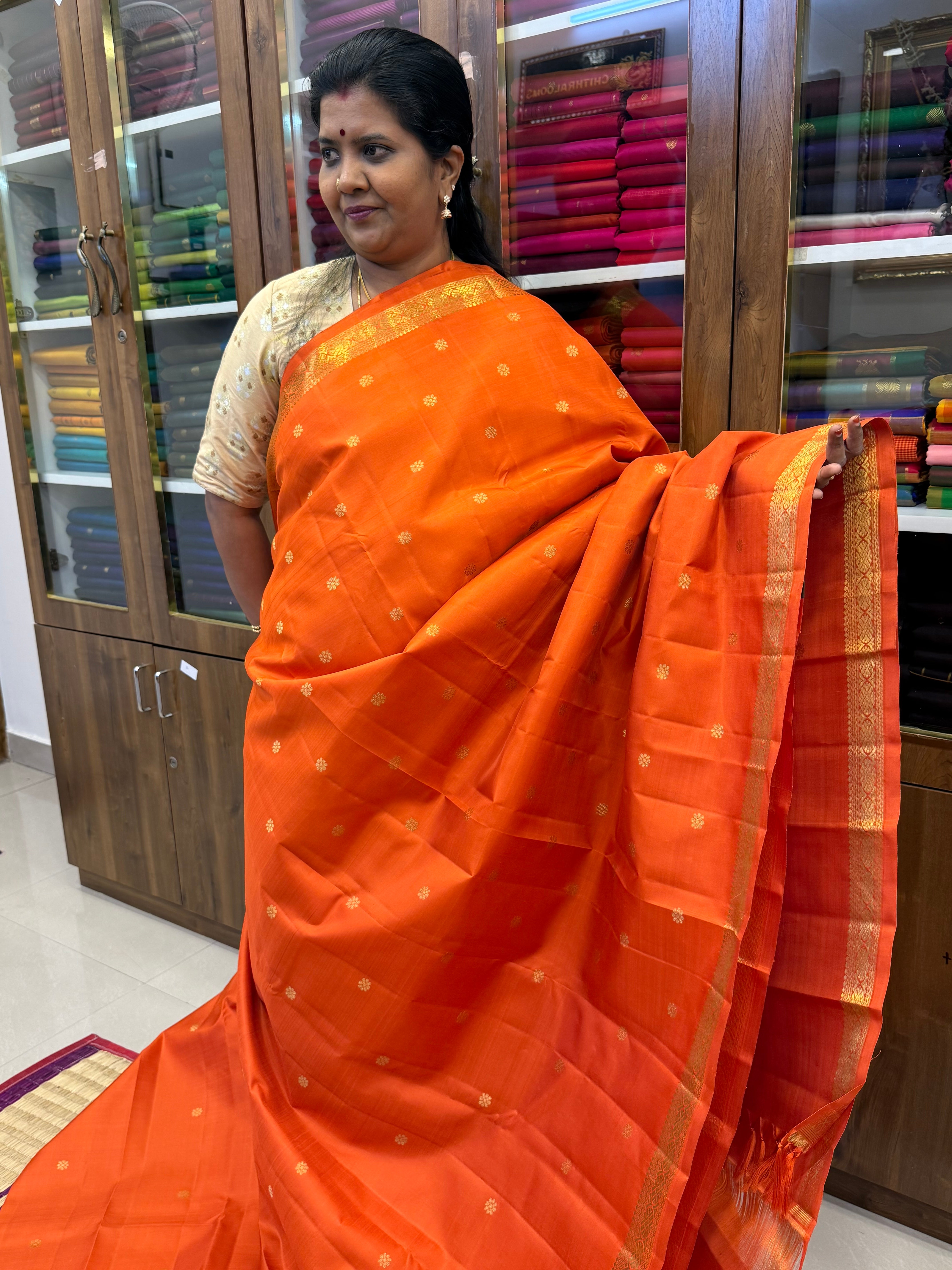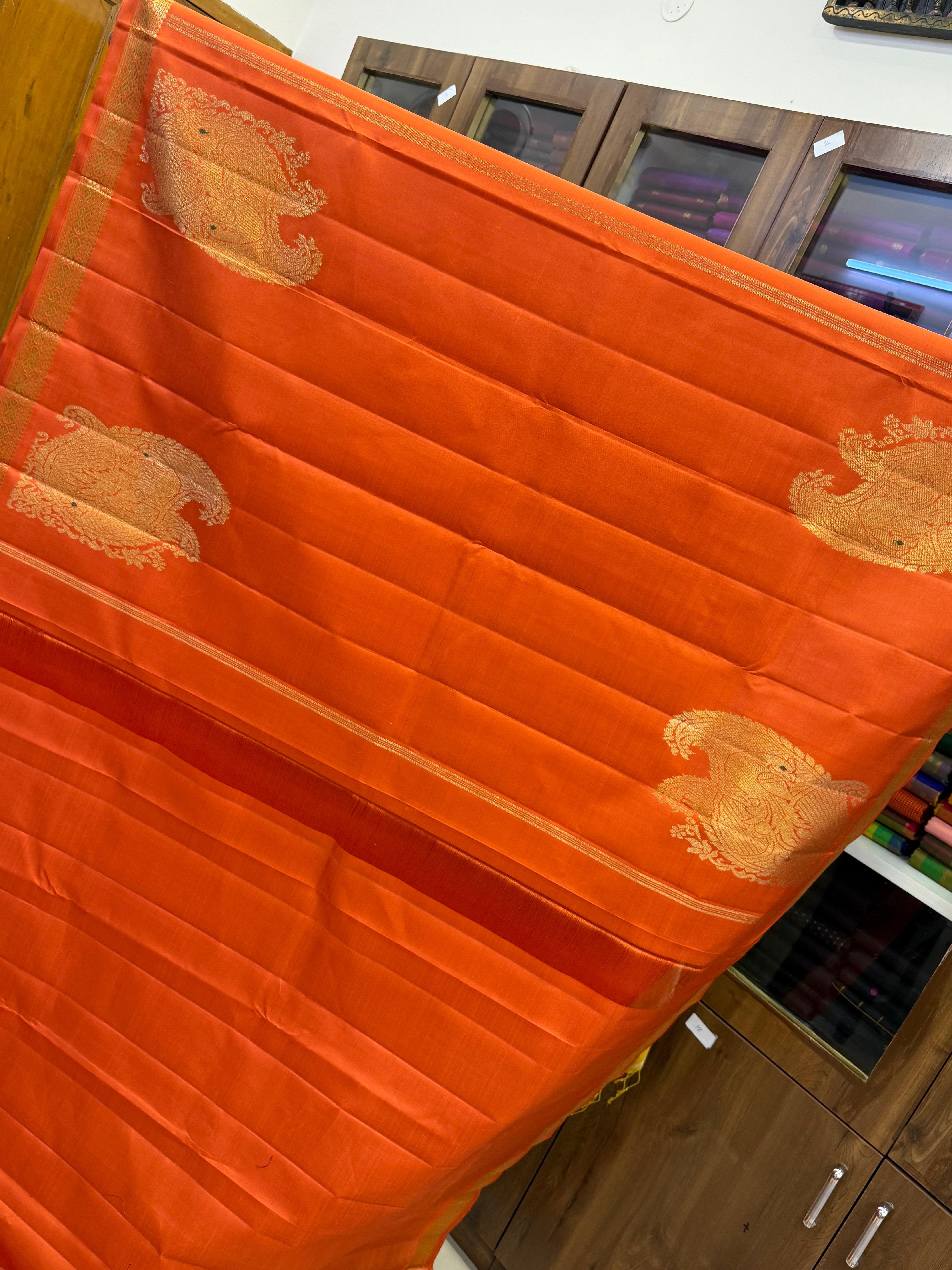 This saree is rust color with kamalam Butta and the border is Kamalam Kodi pet and 4 corner Adai Palla with paisley and annam attached blouse . Pure Zari Adai woven kanjipuram.