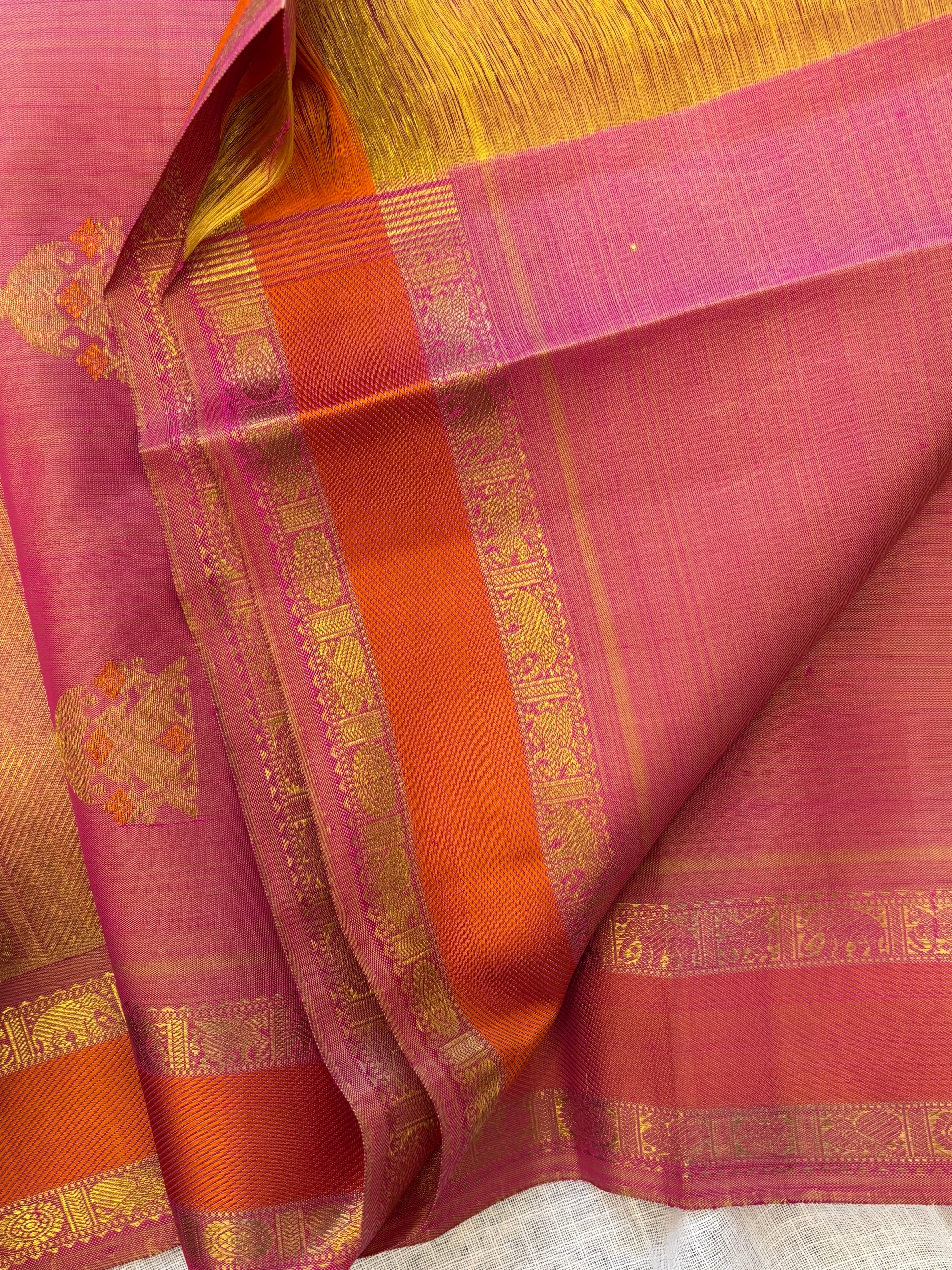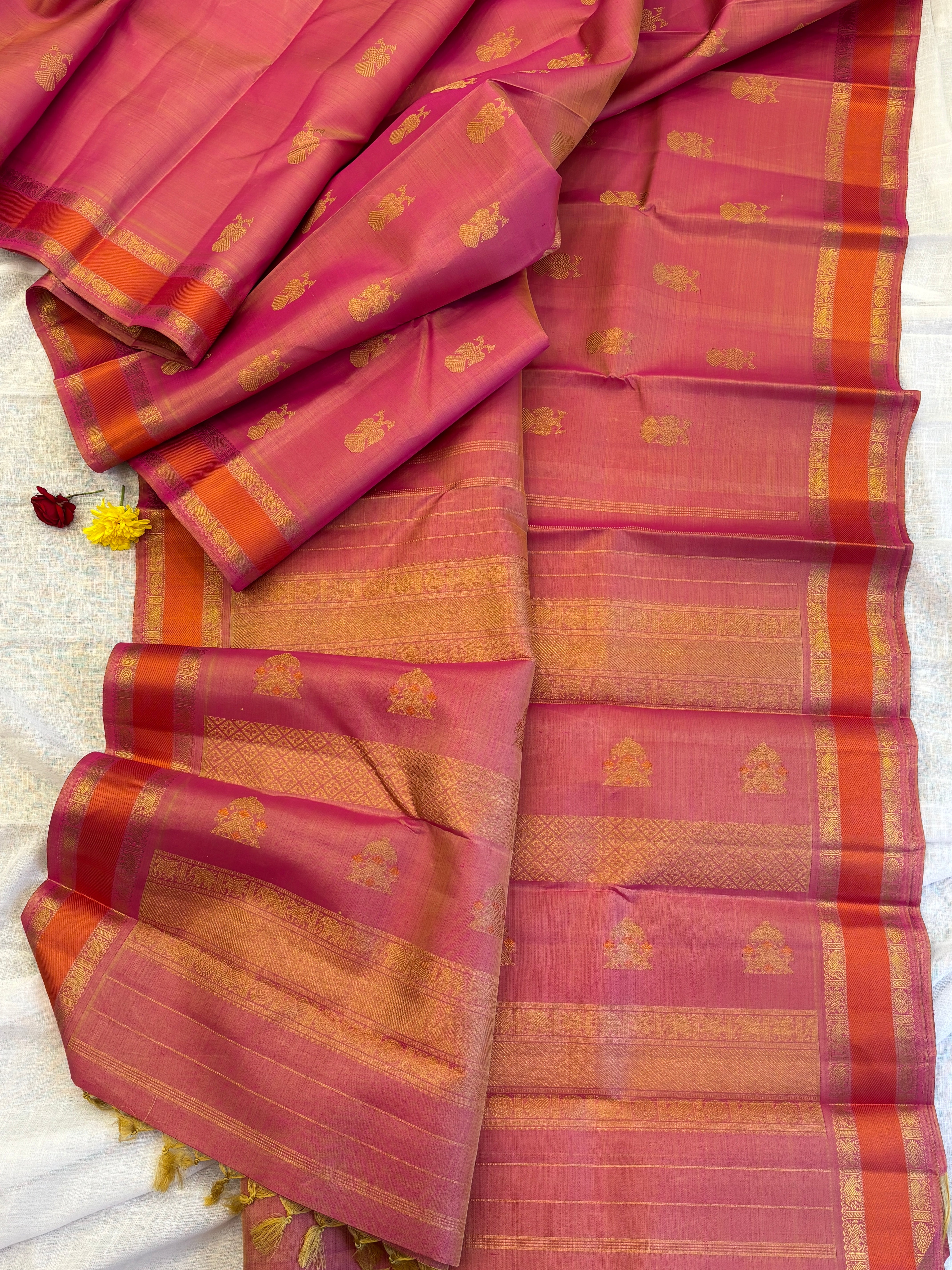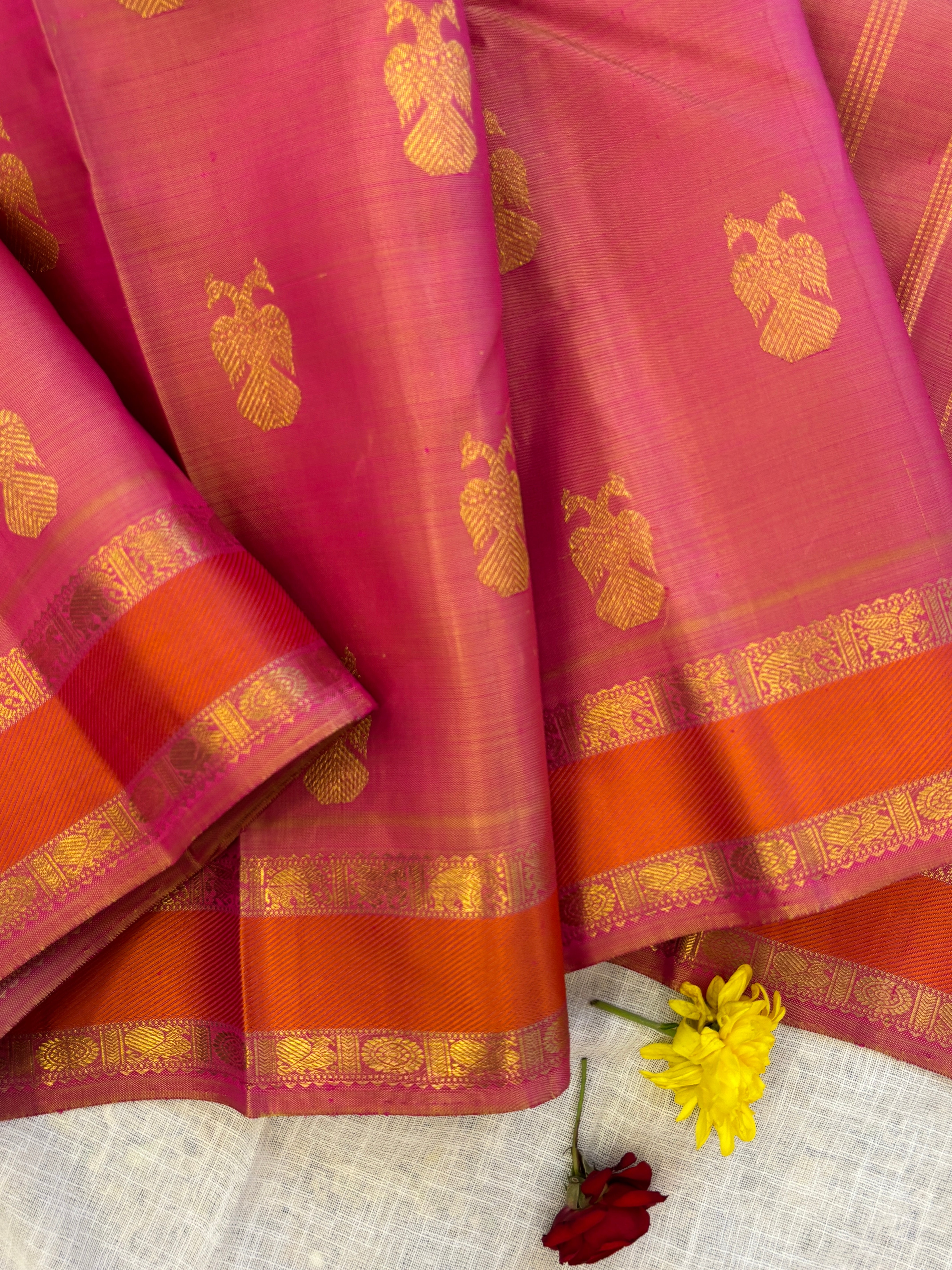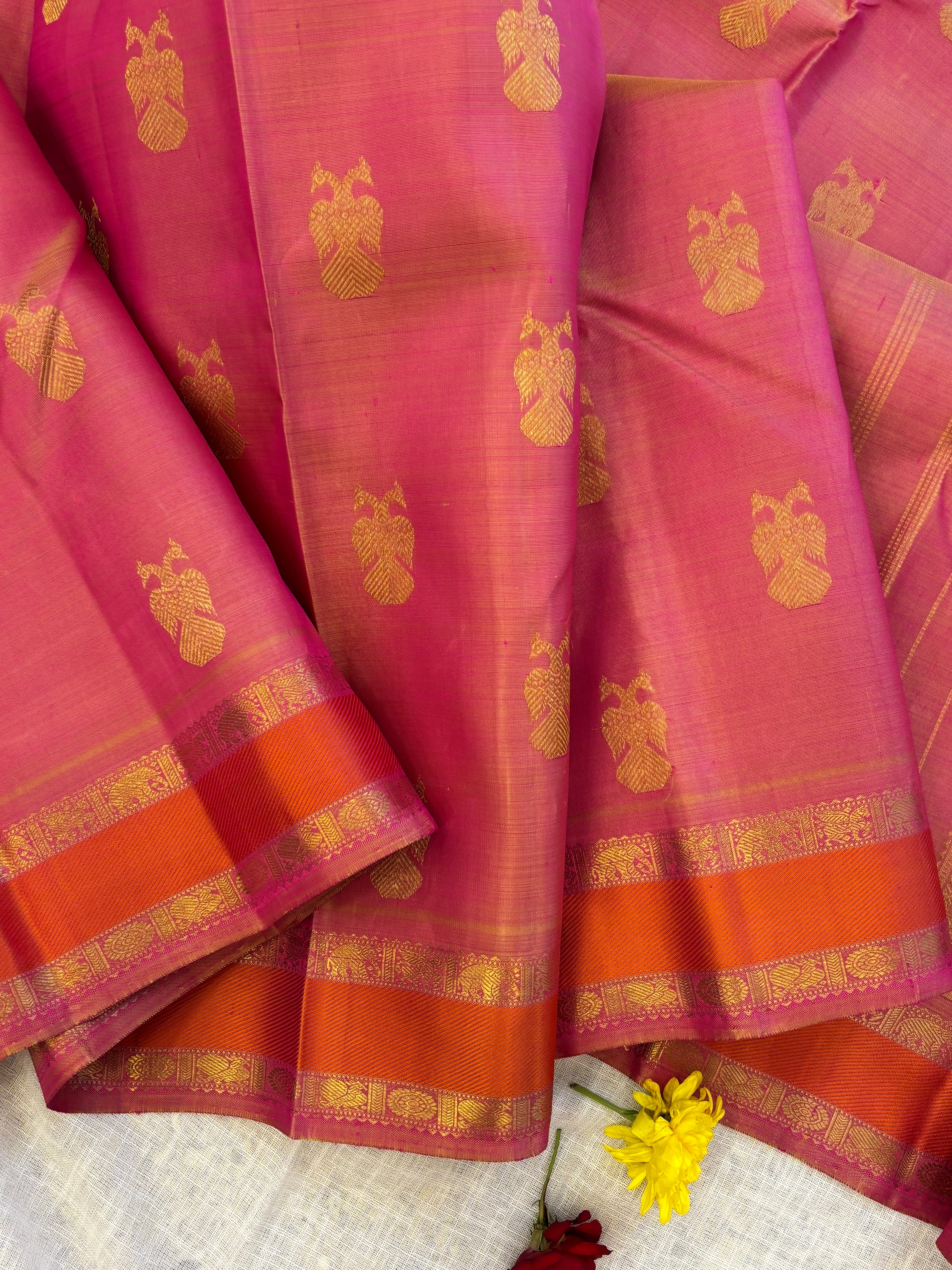 Pinkish orange Iruthalaipakshi butta and rettapet border - unique pallu / kanjipuram silk