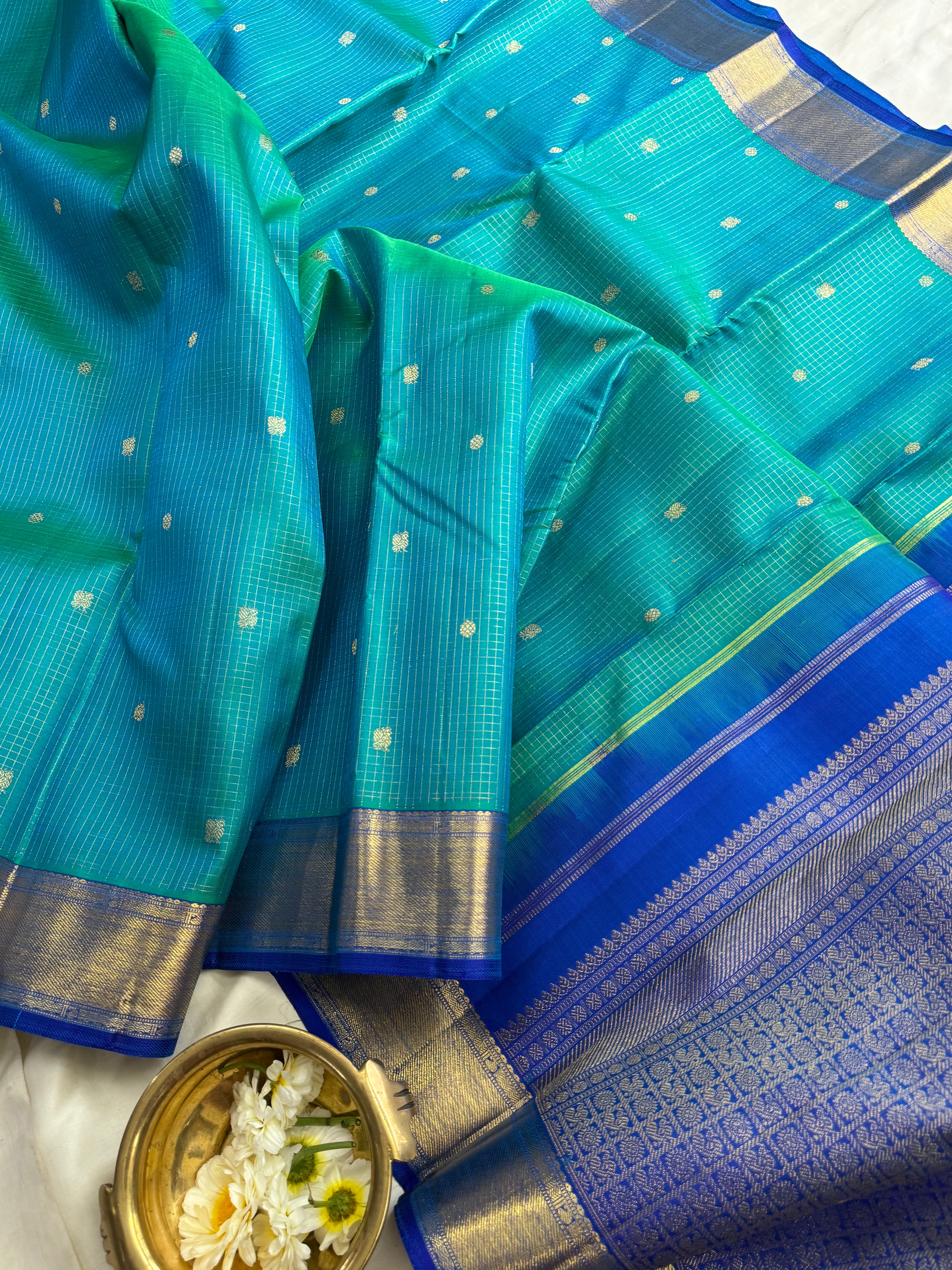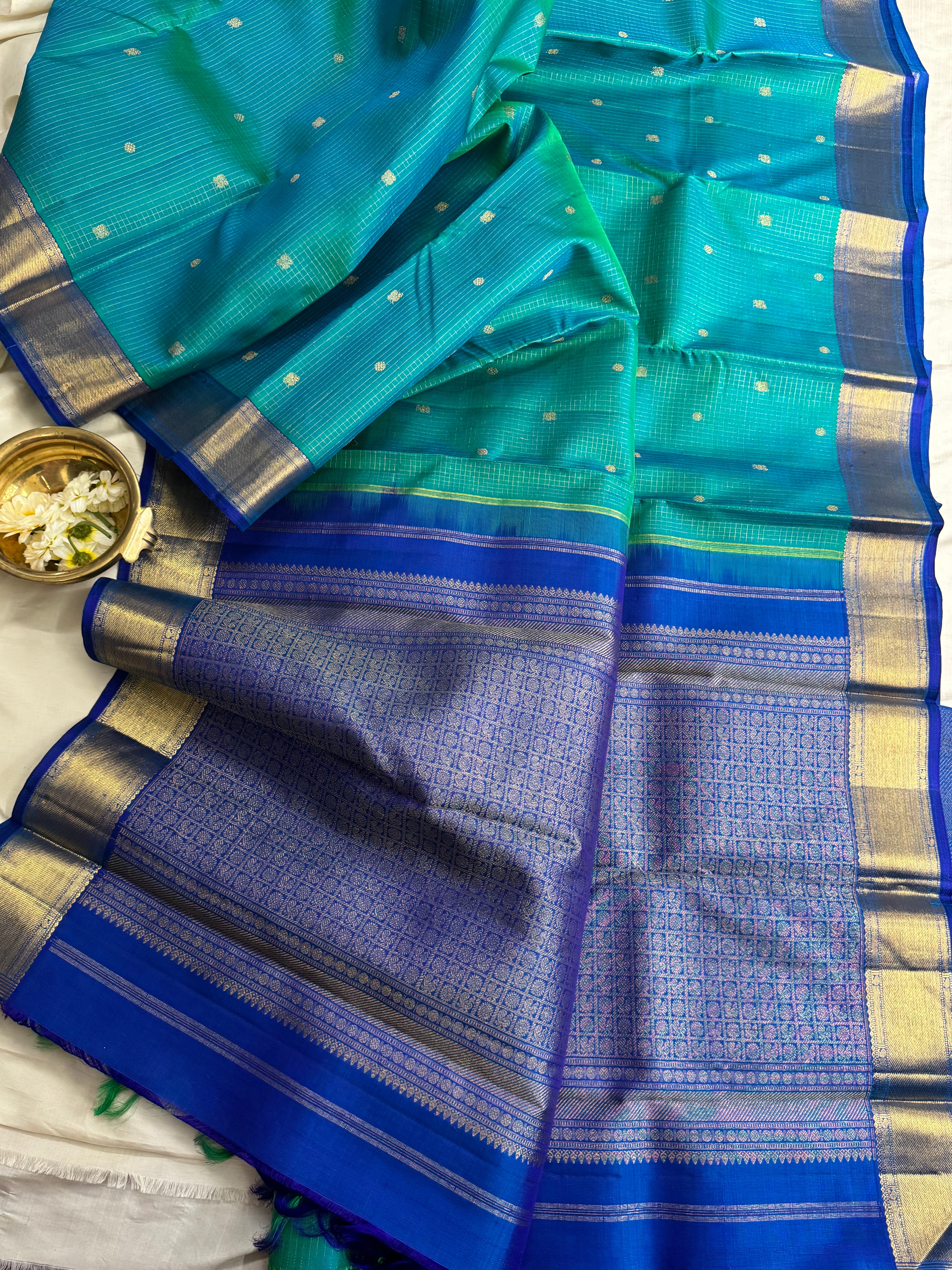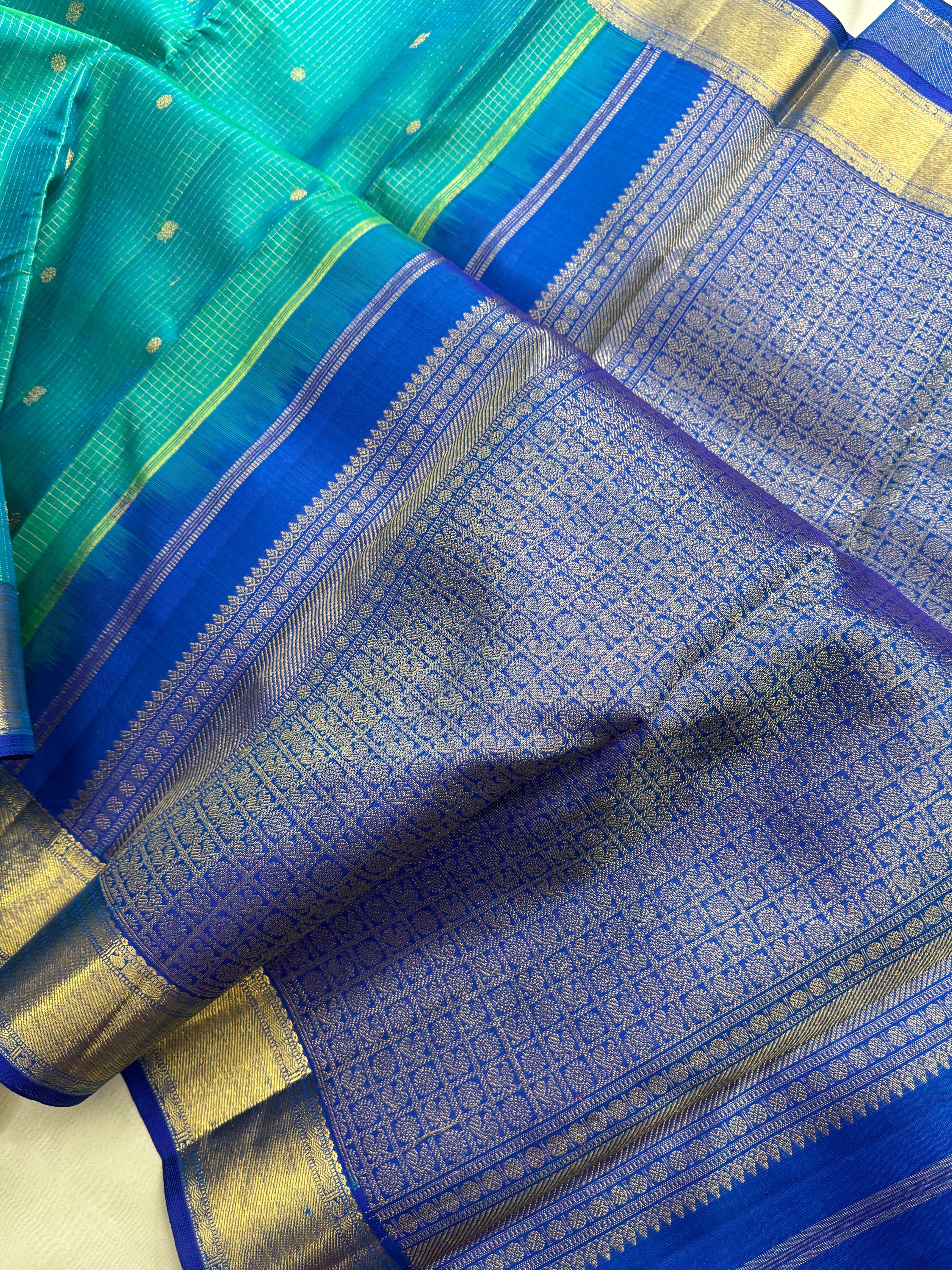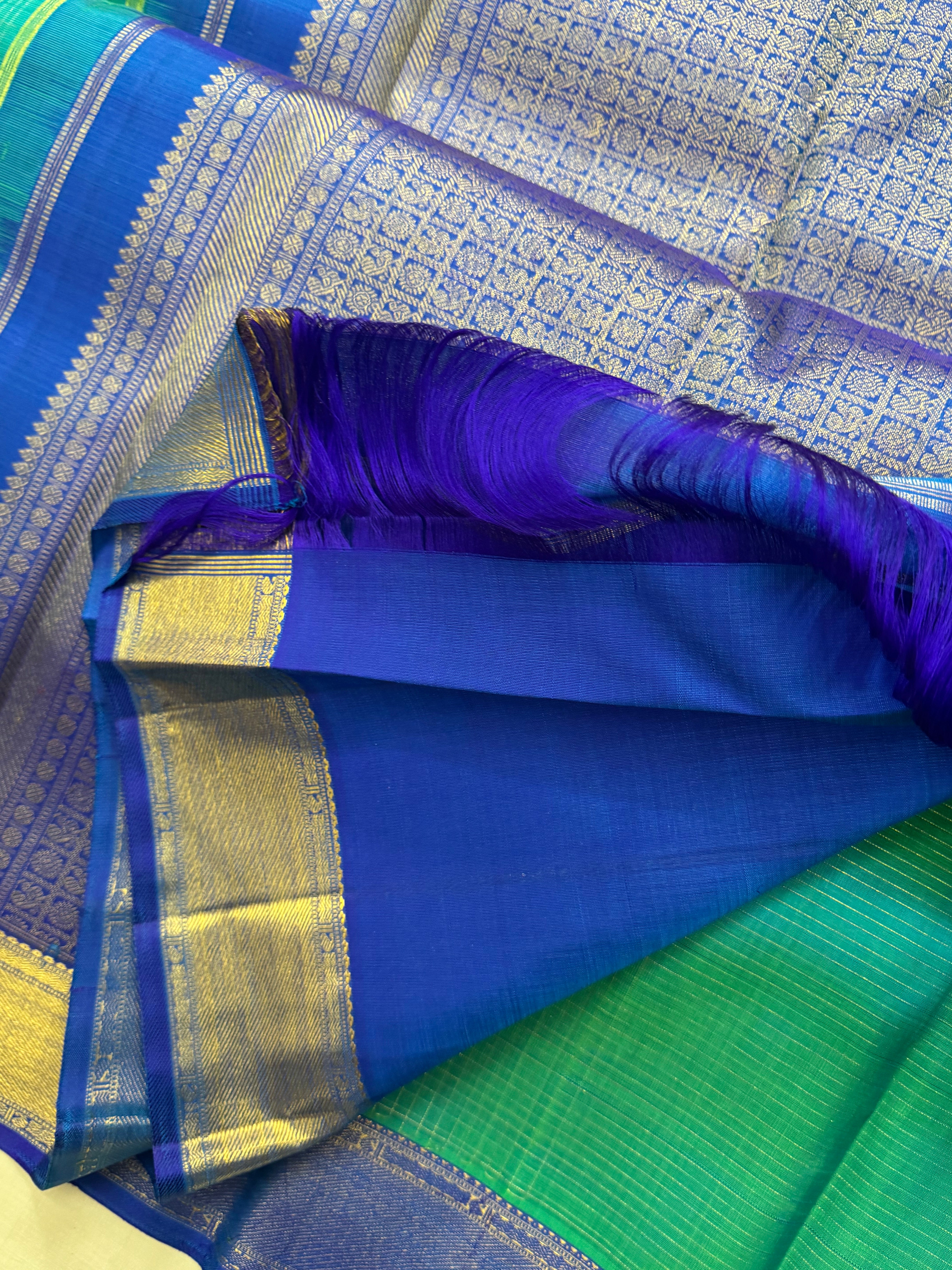 The body is a beautiful shot of blue and green with zari kattam with annam chakram Butta with dark blue Benars pet and dense pure zari Palla and blouse