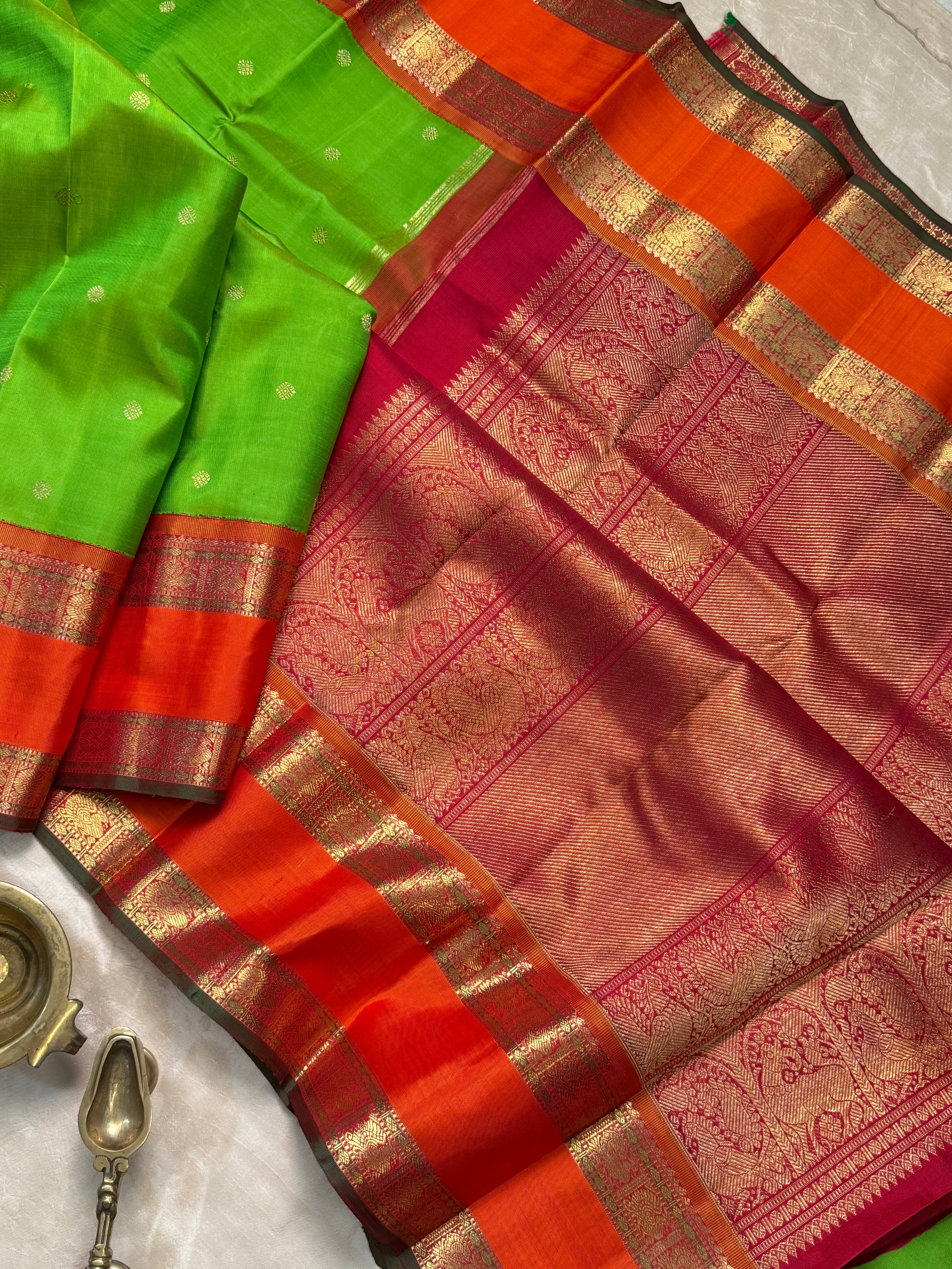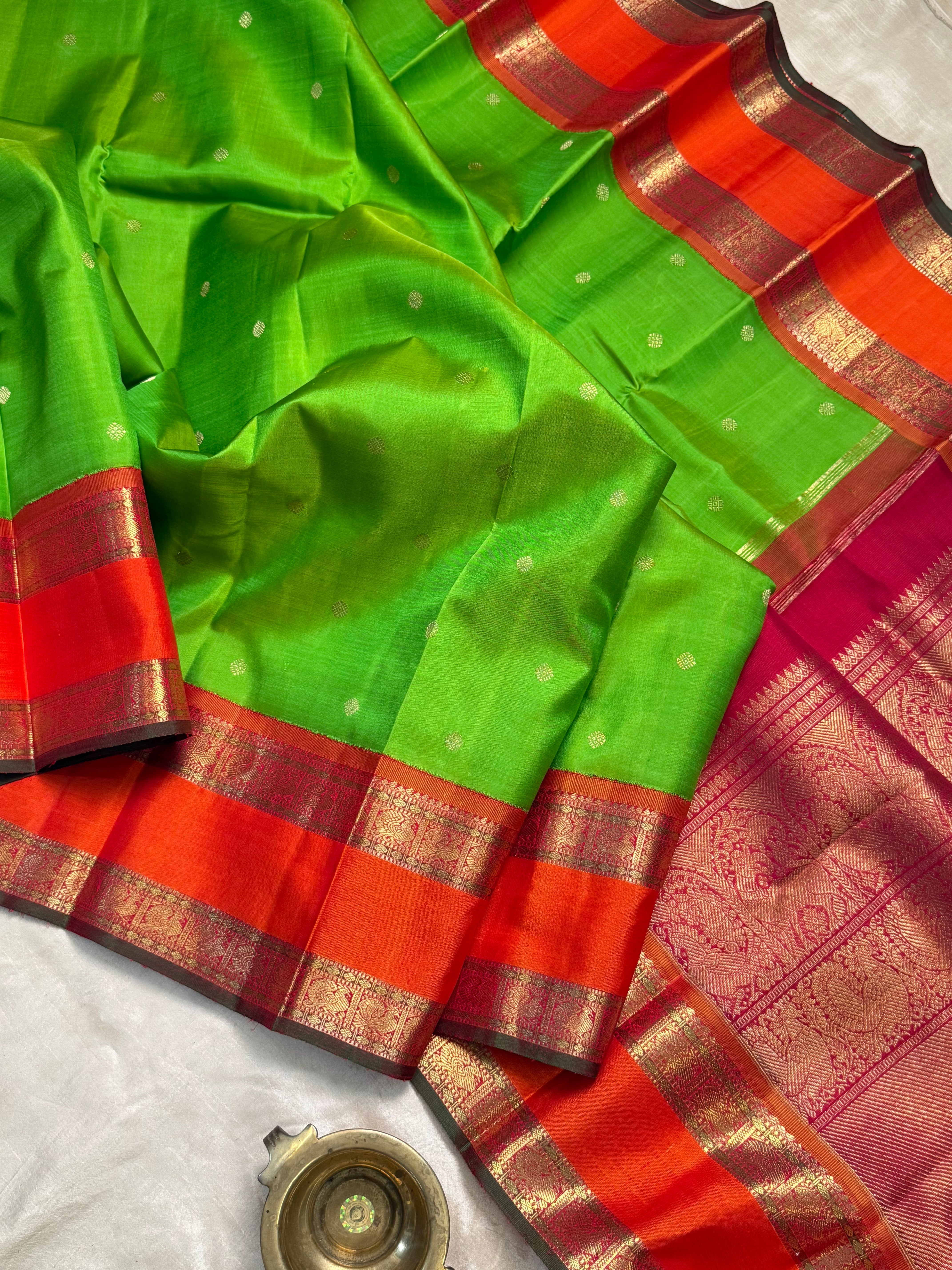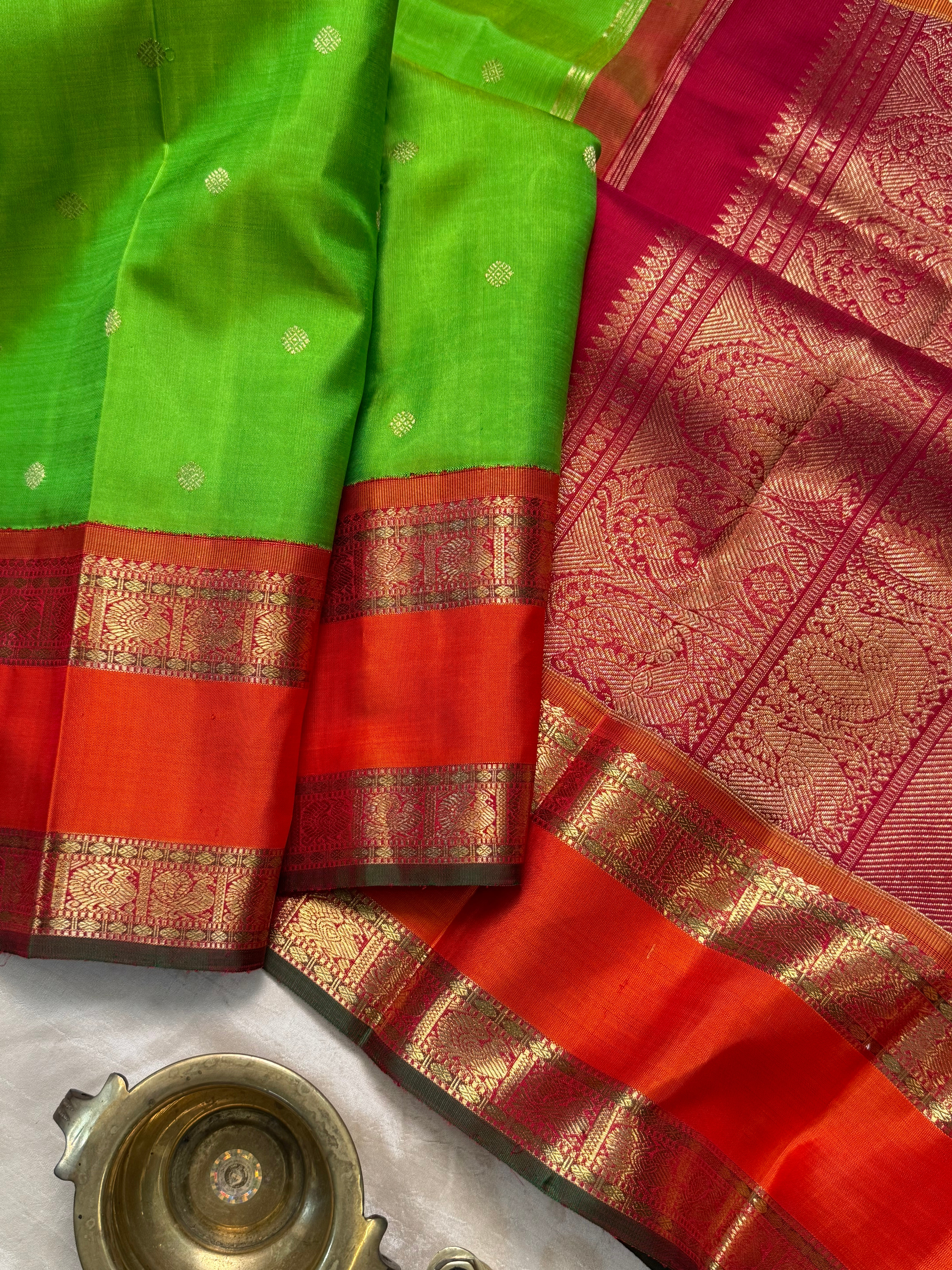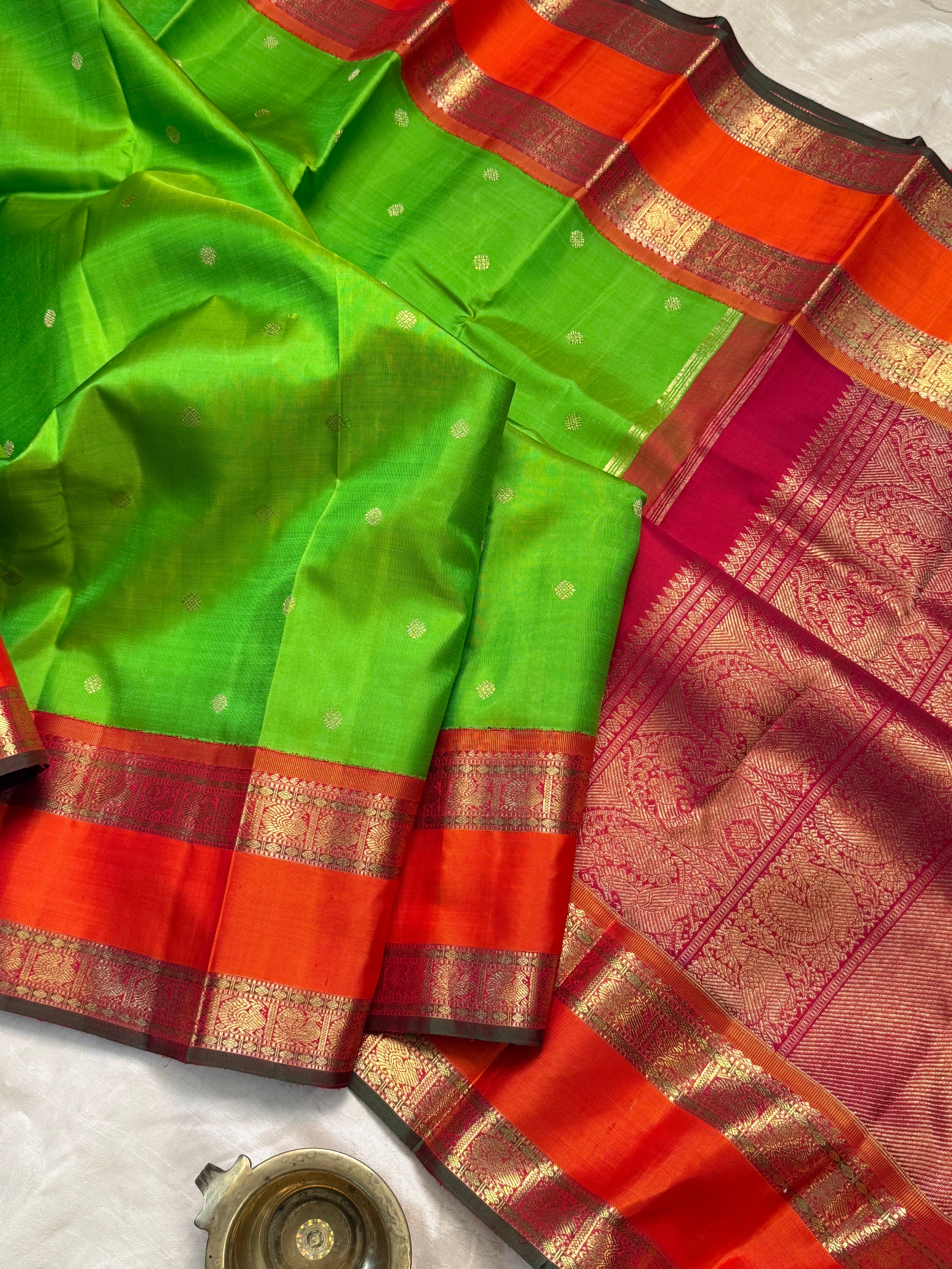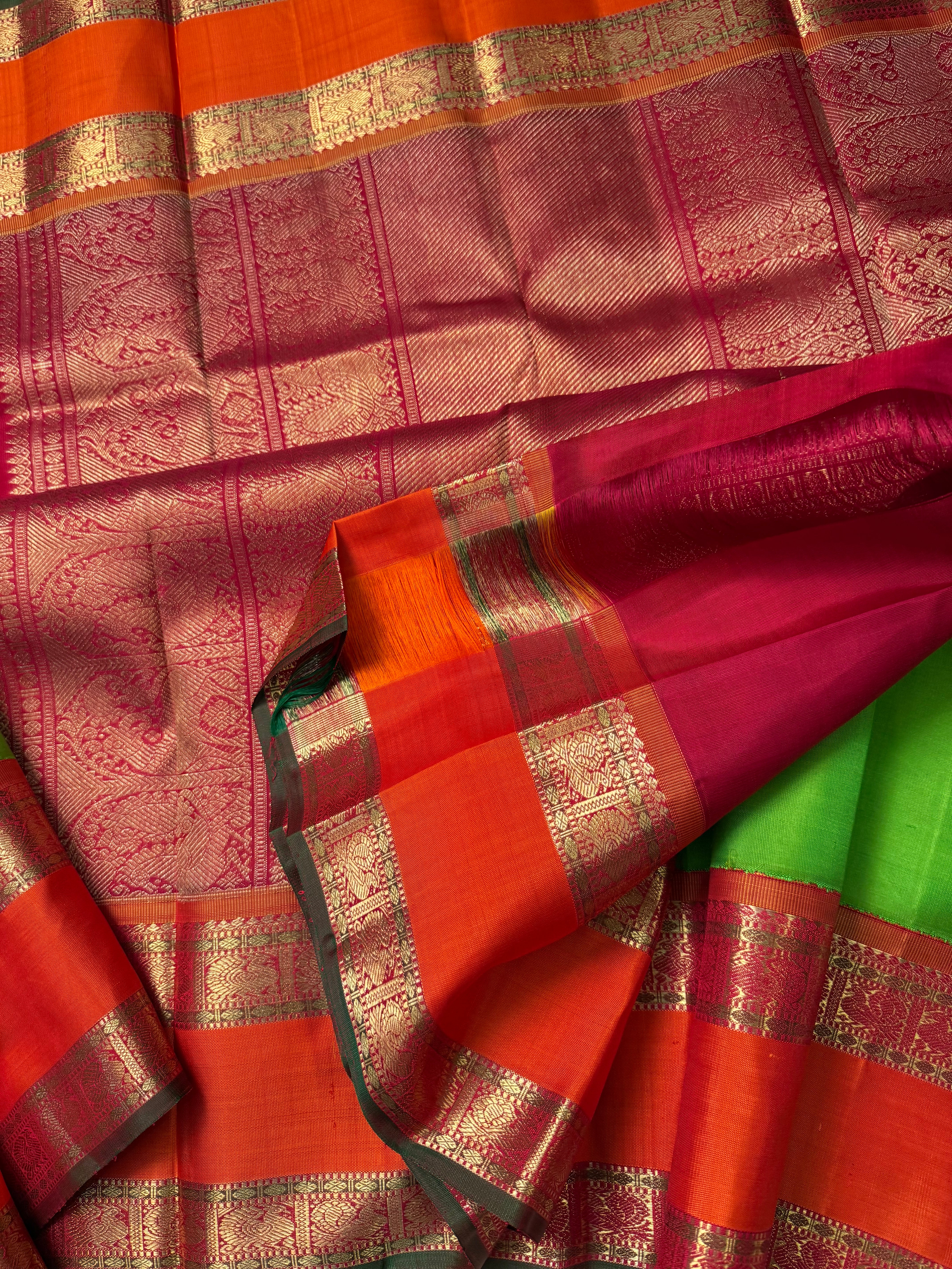 Shades of green : master piece apple green triple Palla Korvai Kanjipuram silk