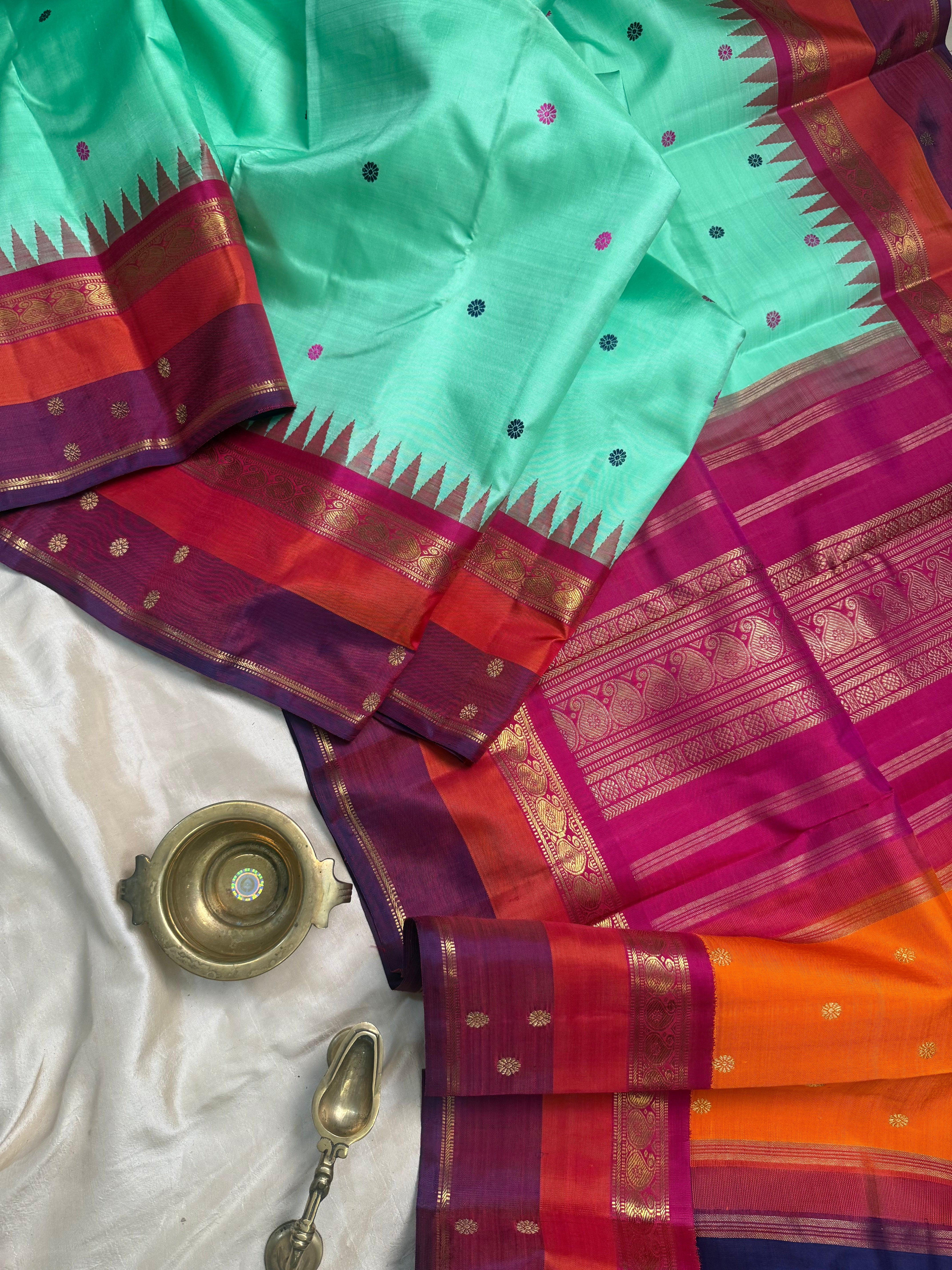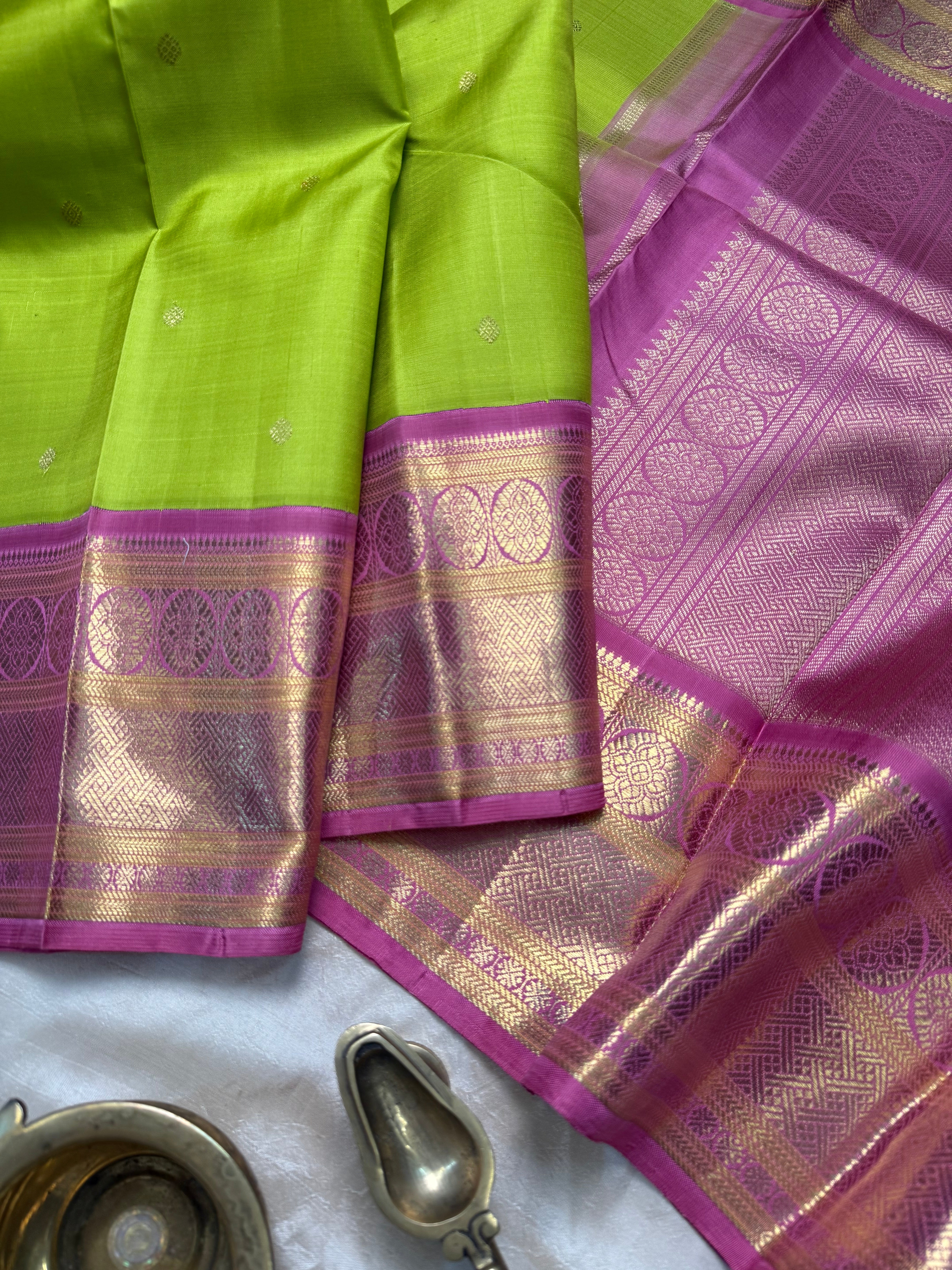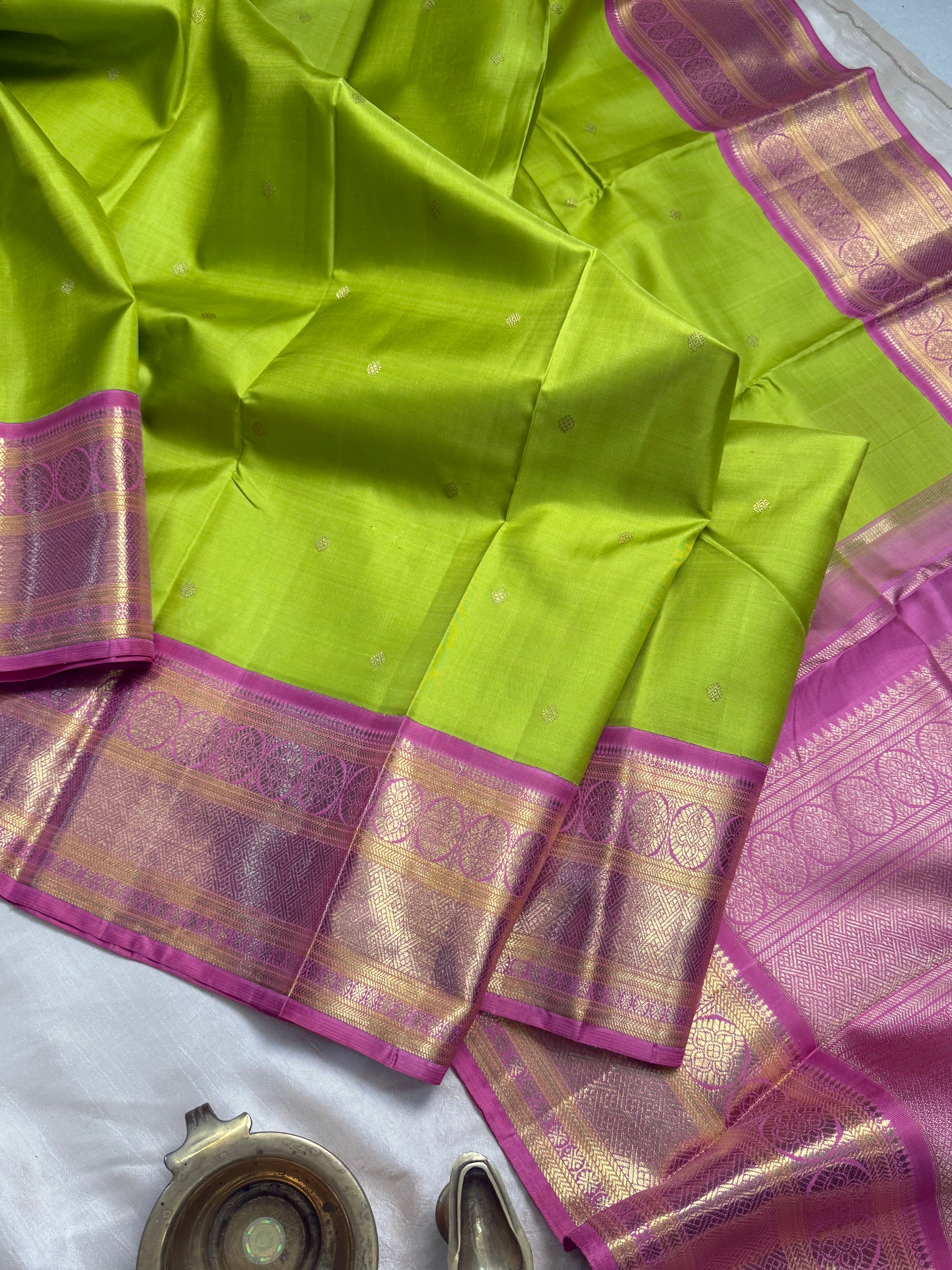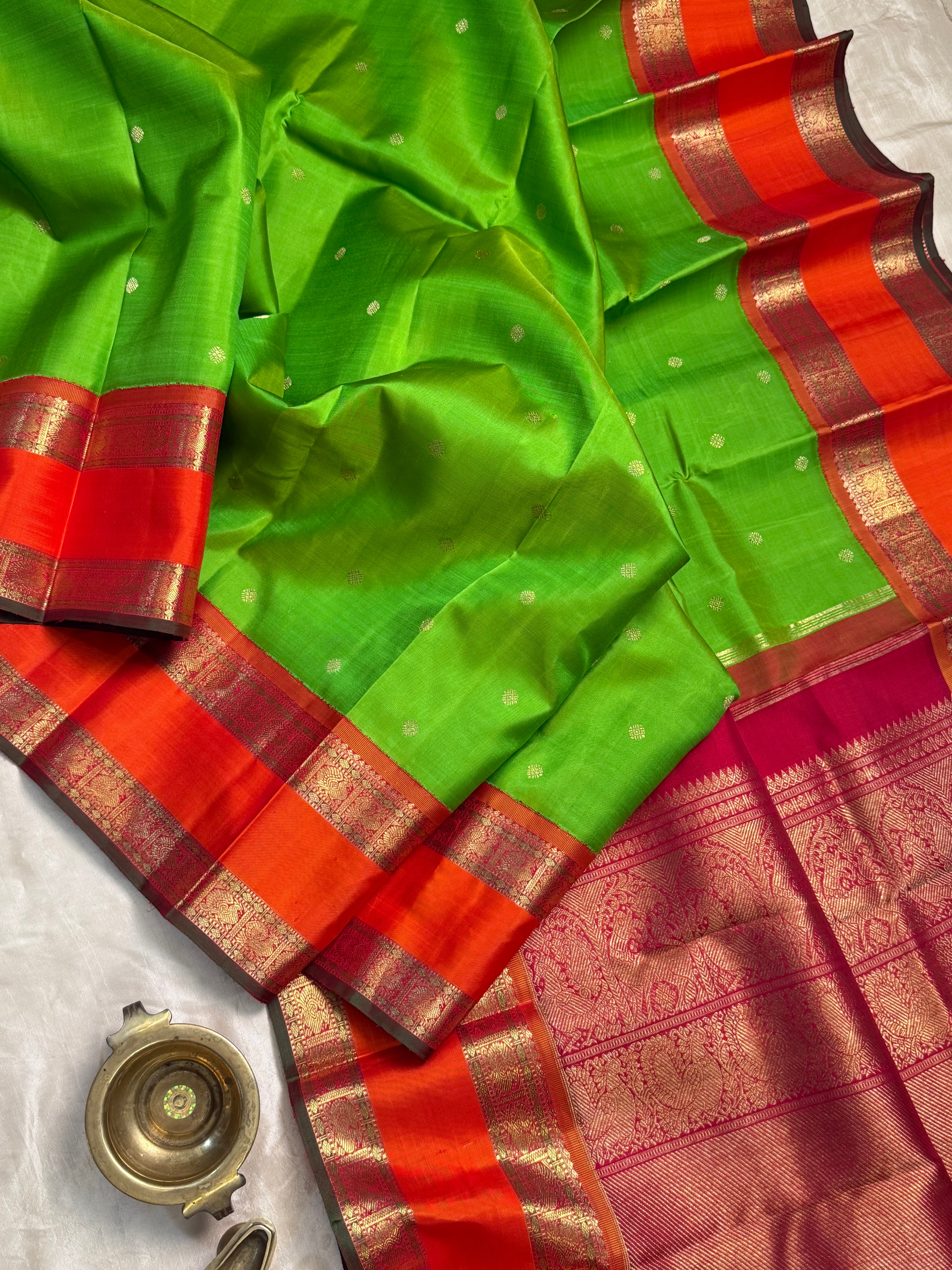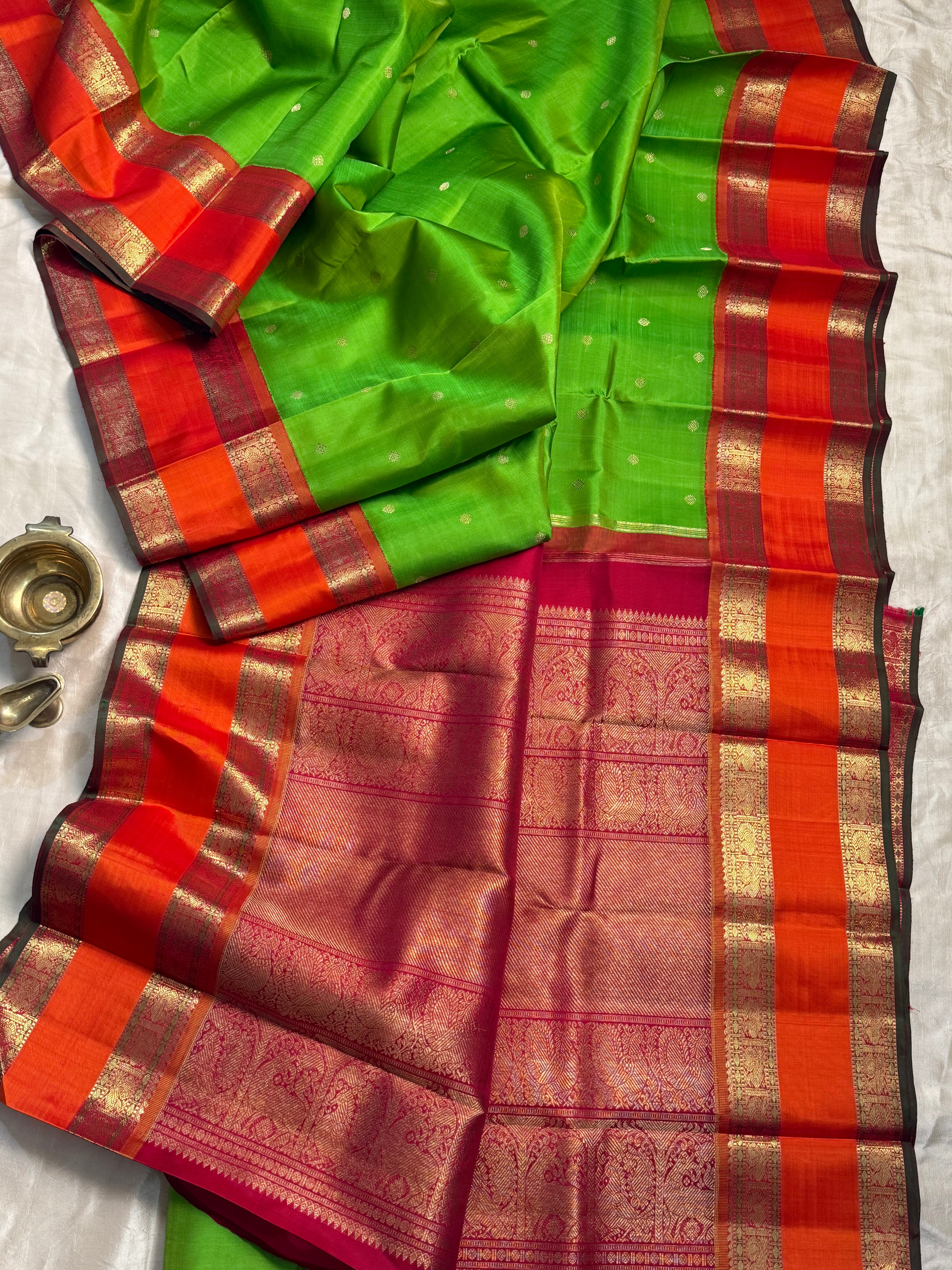 Shades of green : master piece apple green triple Palla Korvai Kanjipuram silk