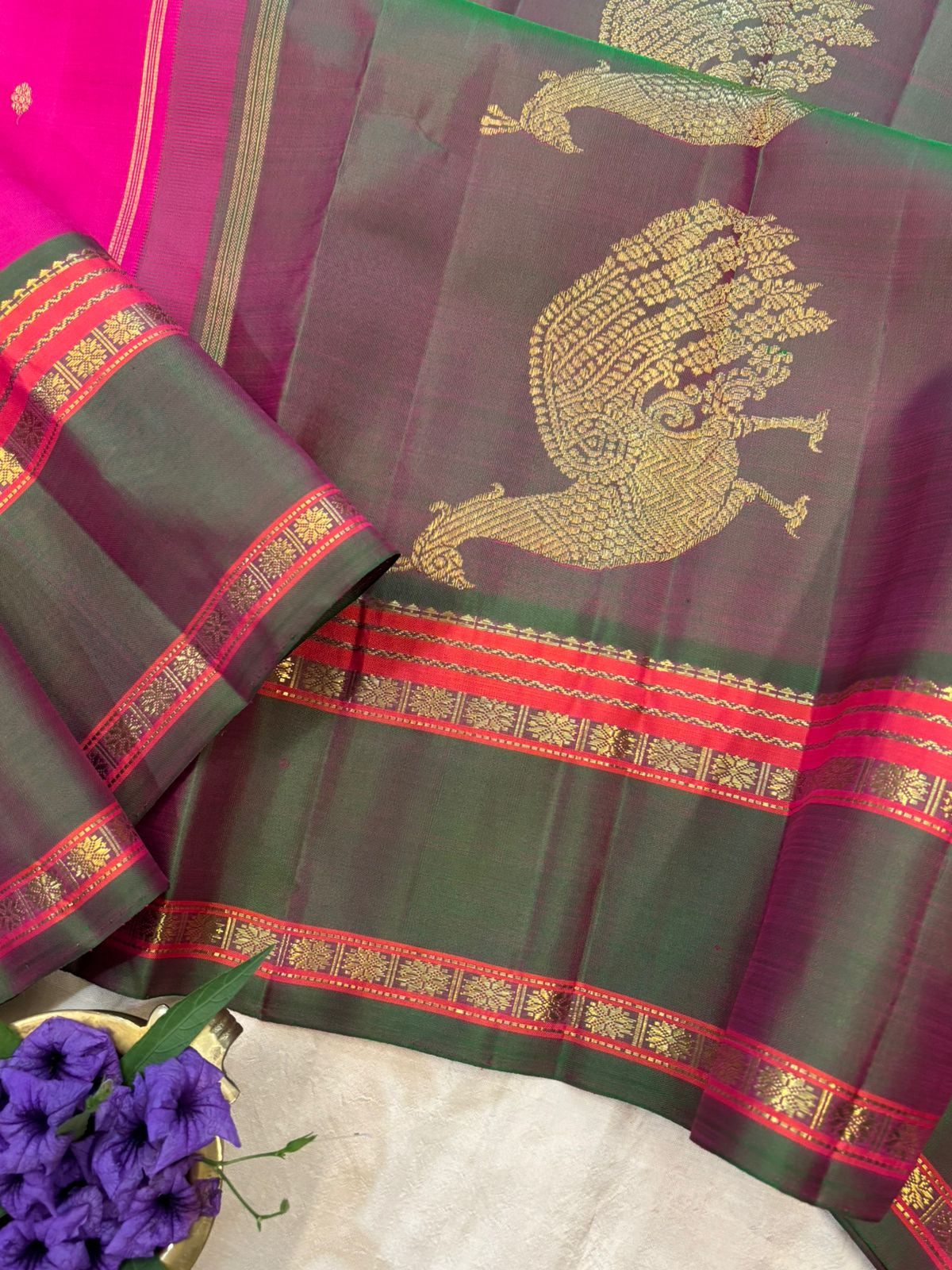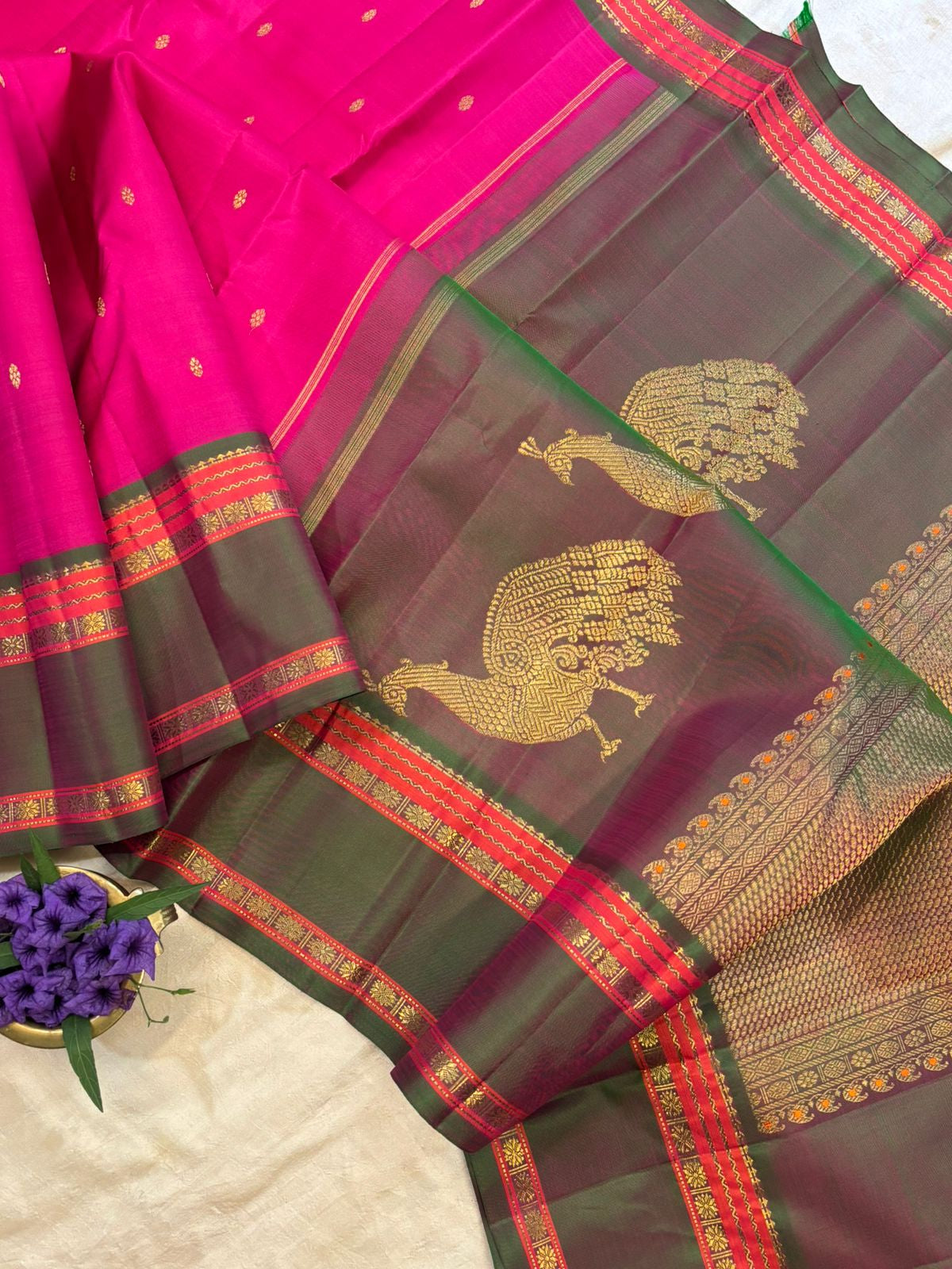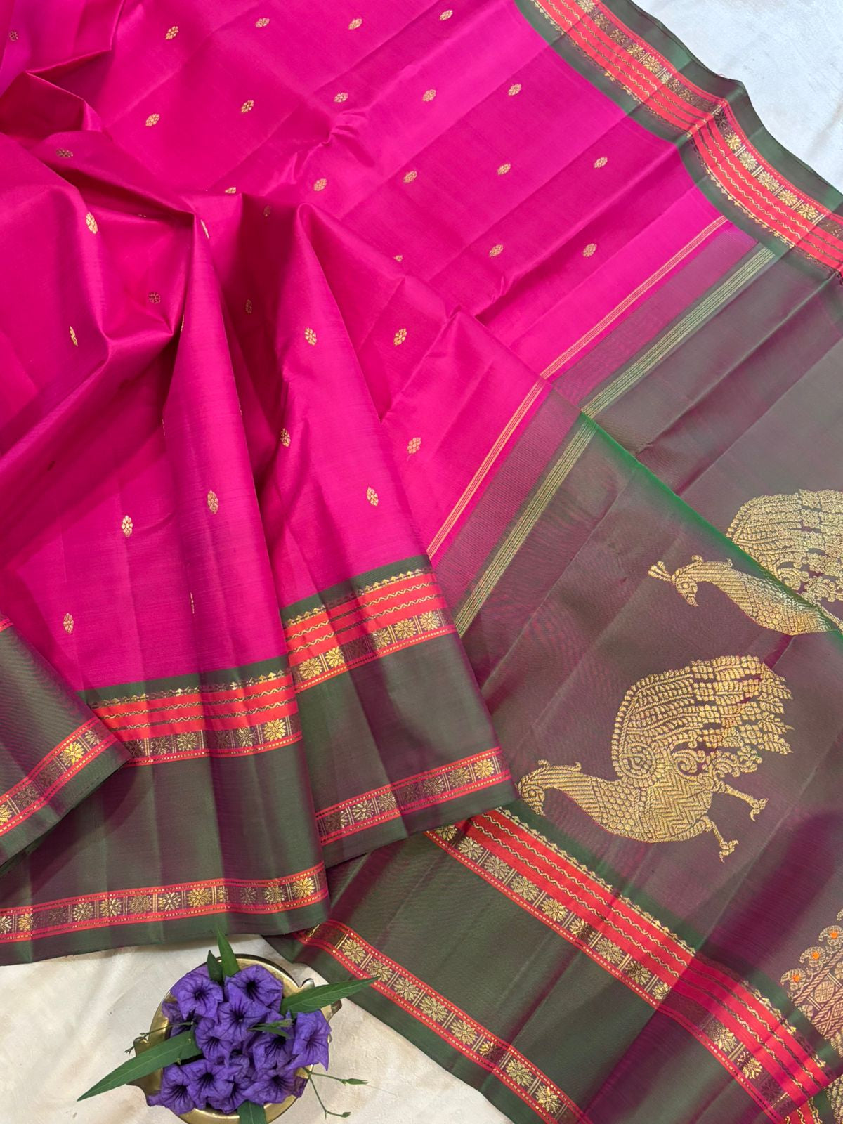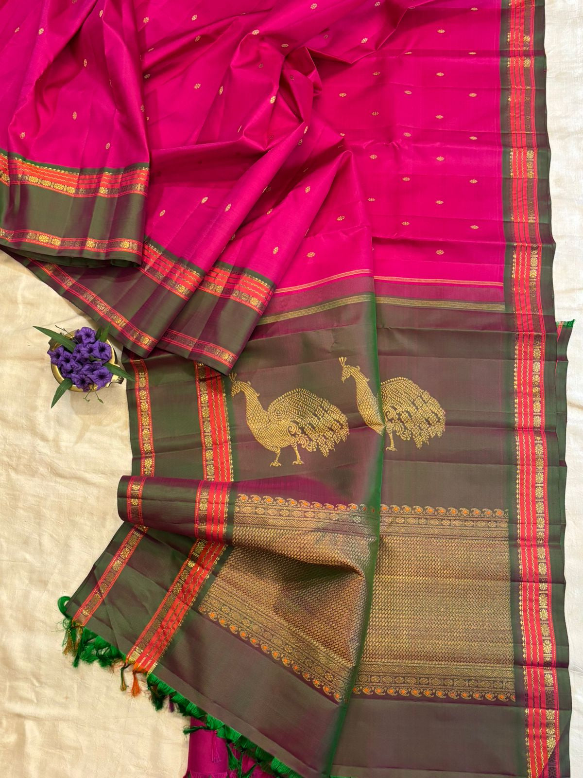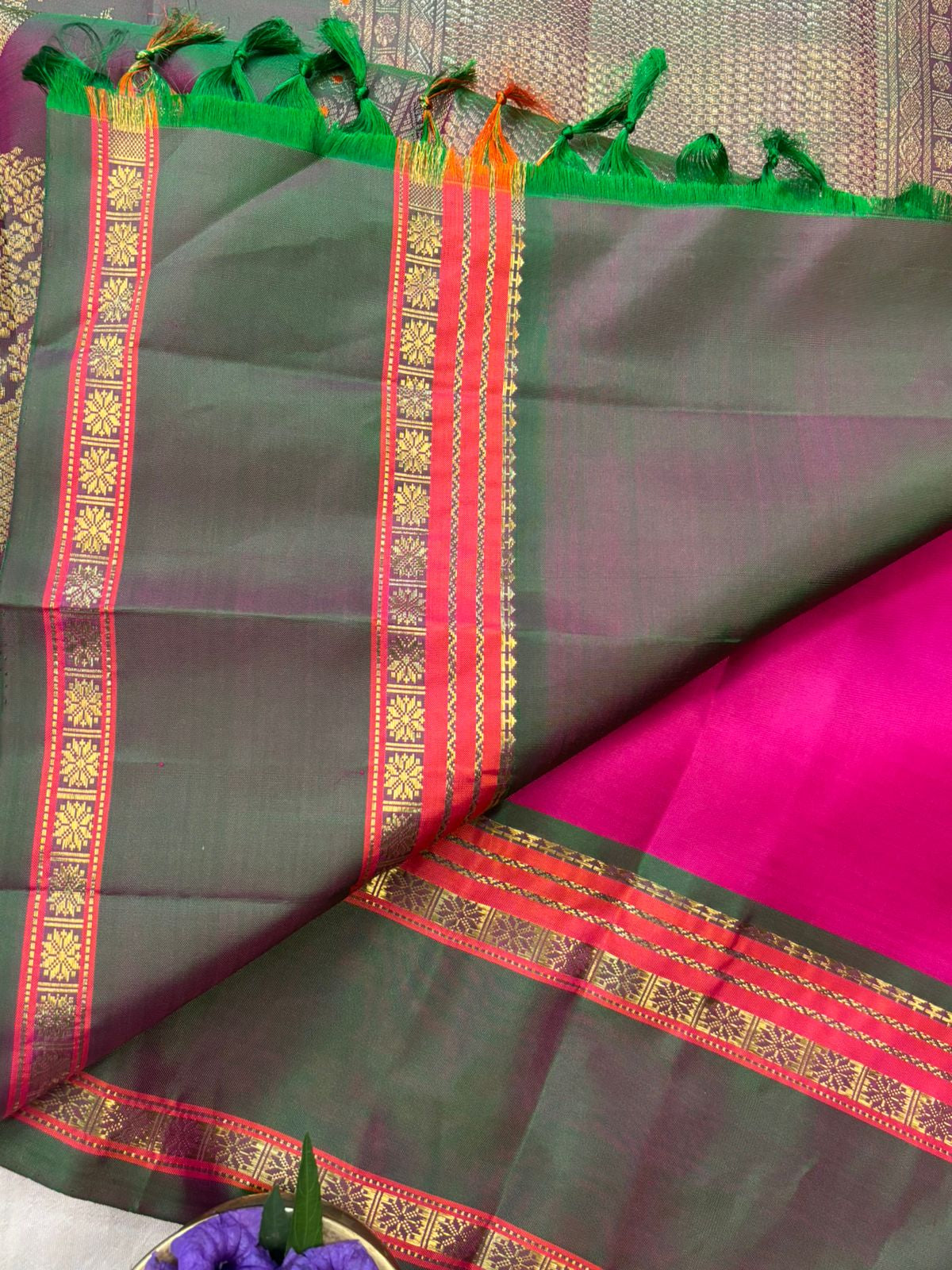 Mayilkazhuthu kili korvai and red kai korvai/ kanjipuram silk