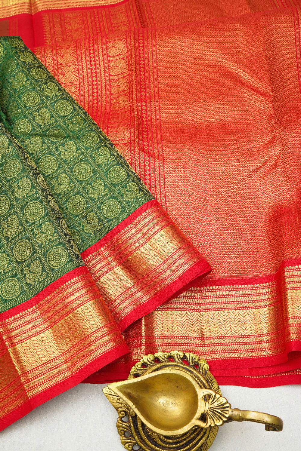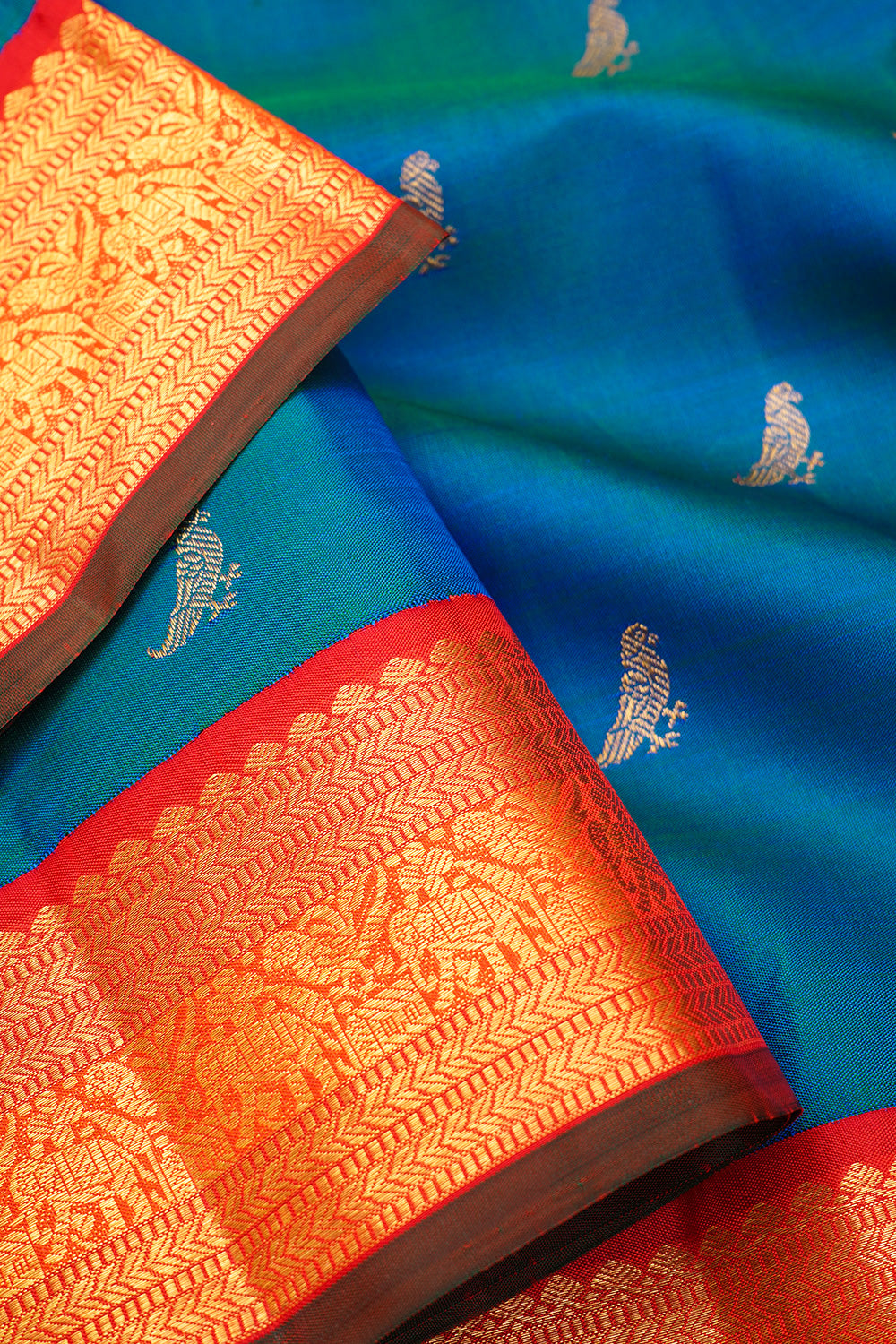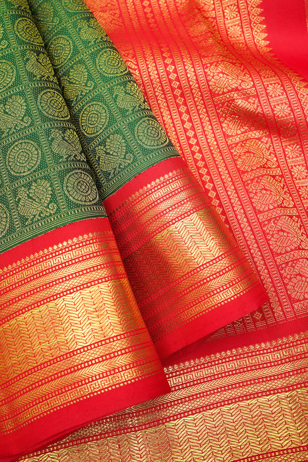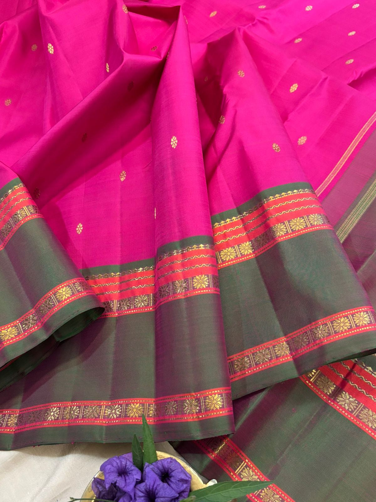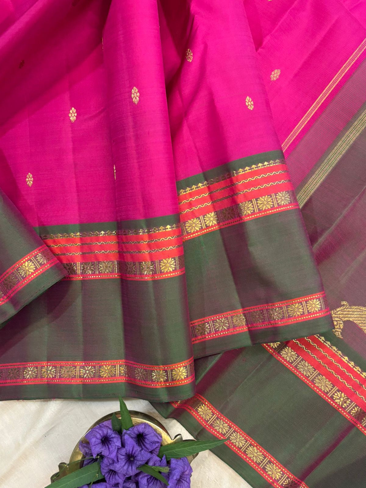 Mayilkazhuthu kili korvai and red kai korvai/ kanjipuram silk