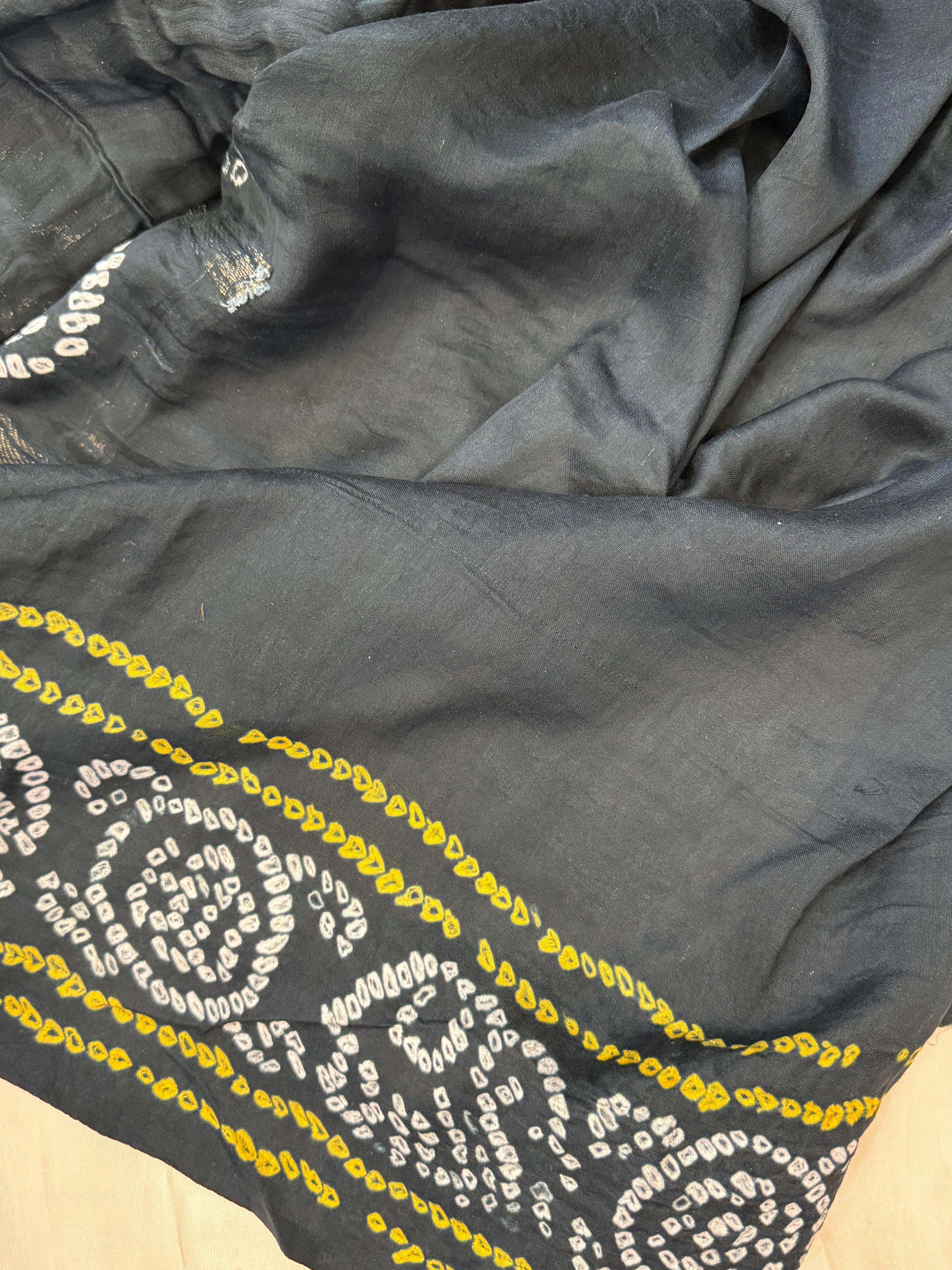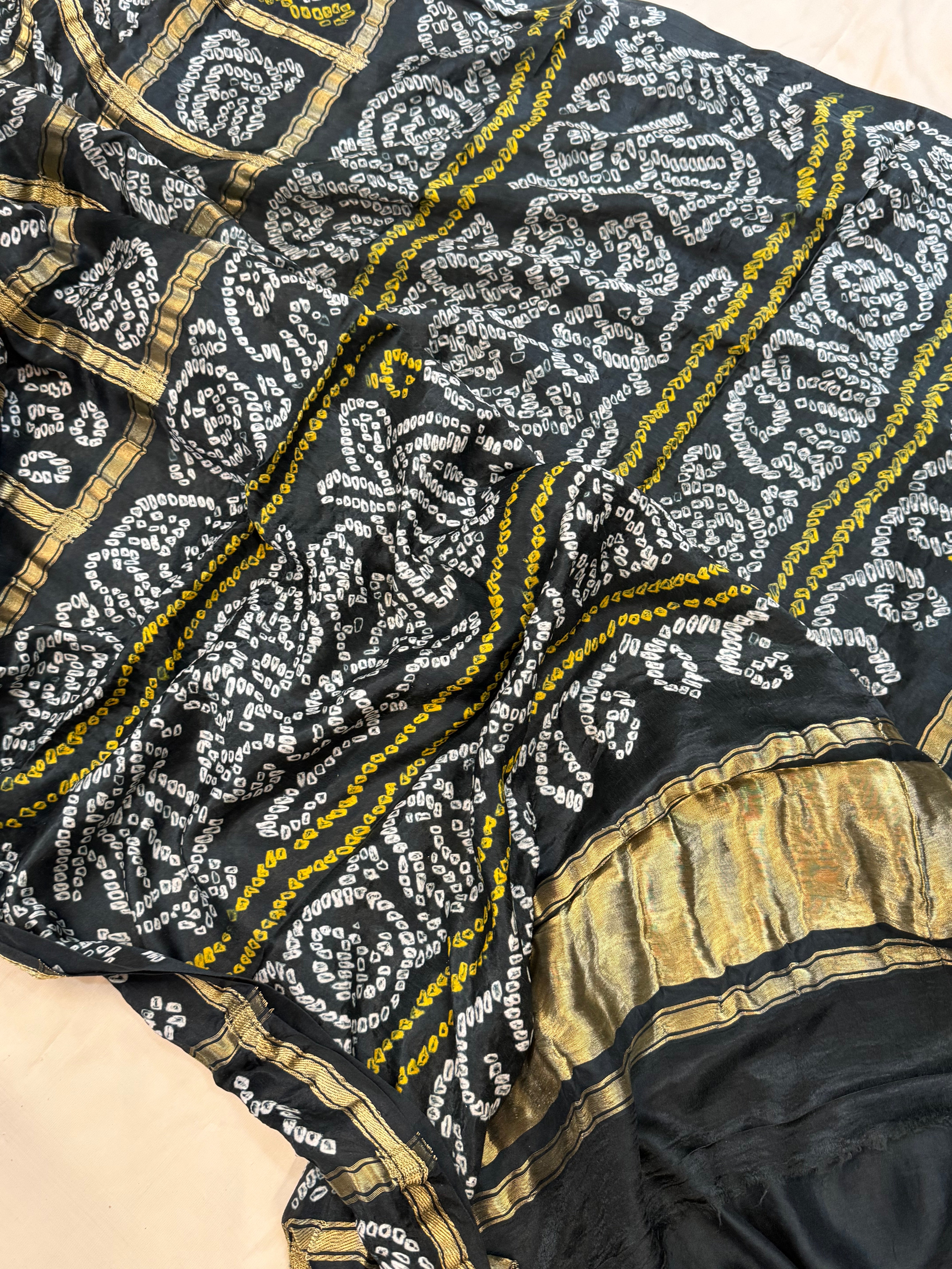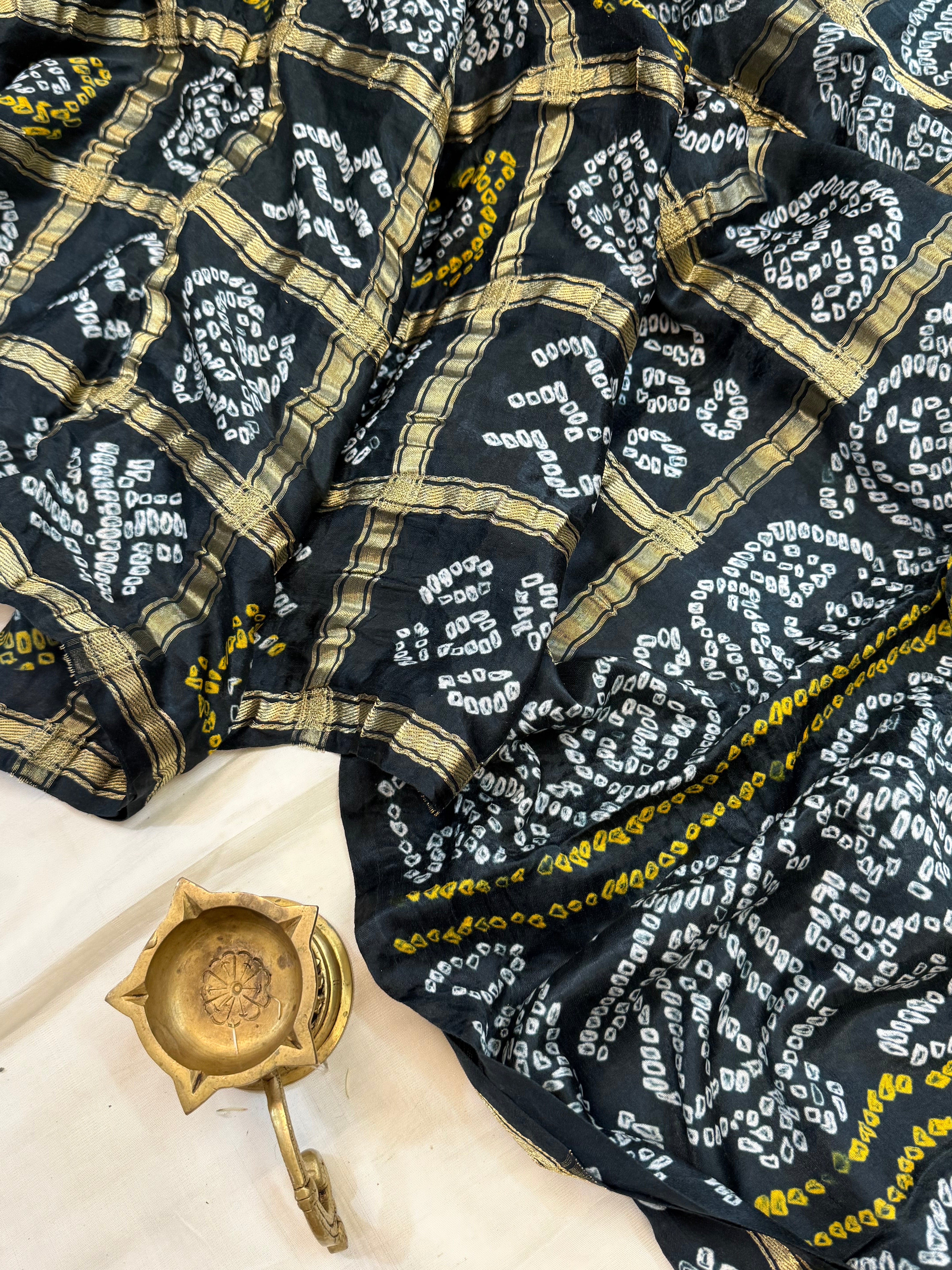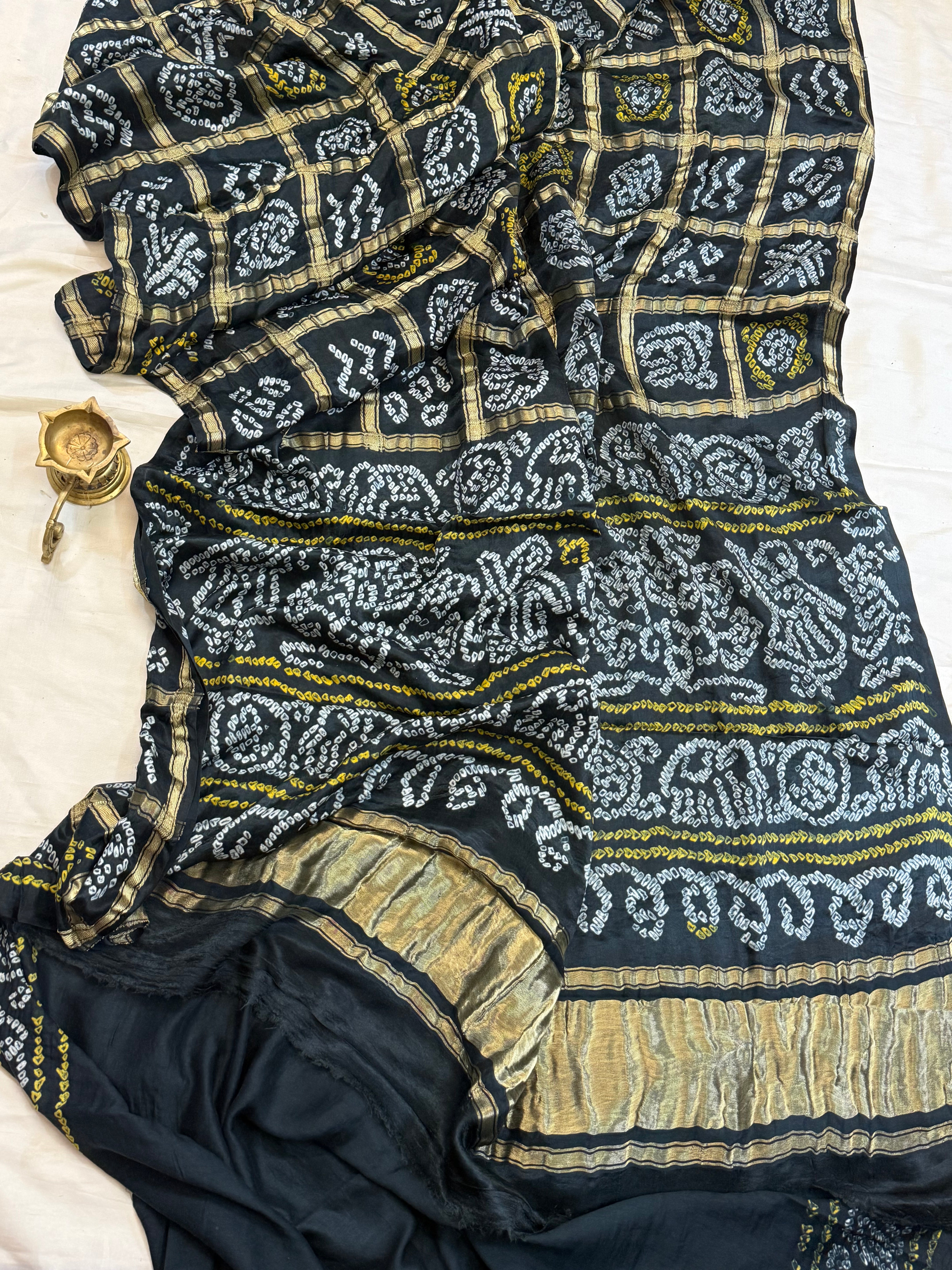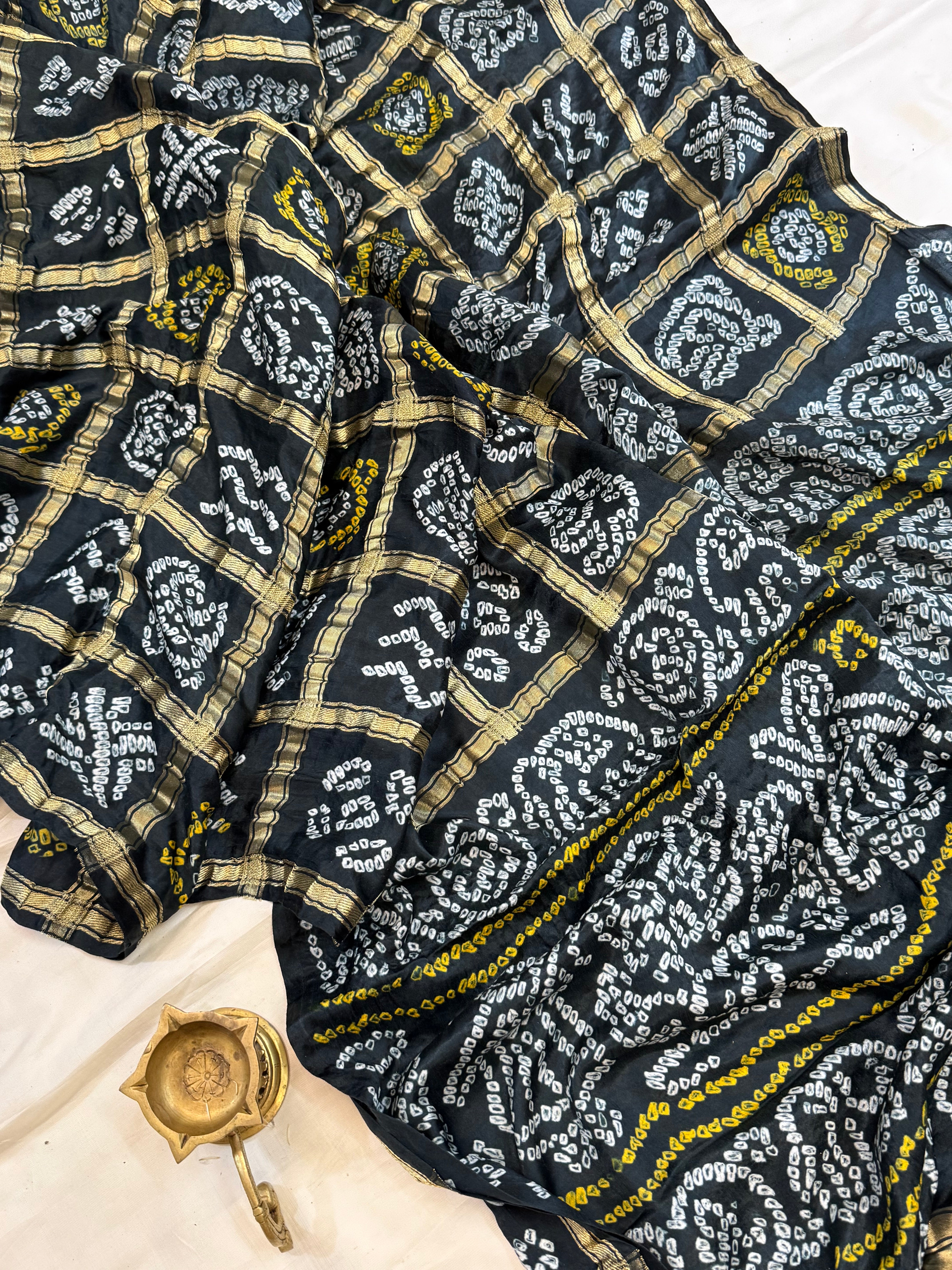 The base is gajji silk with black colour , with zari checks with Bandhini in body and zari Palla and blouse