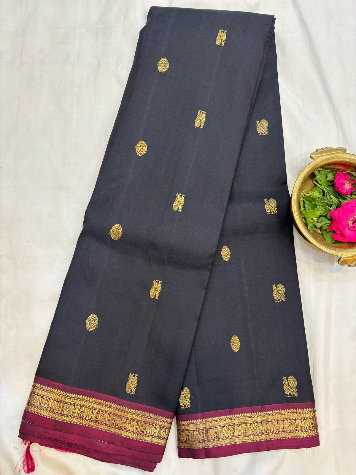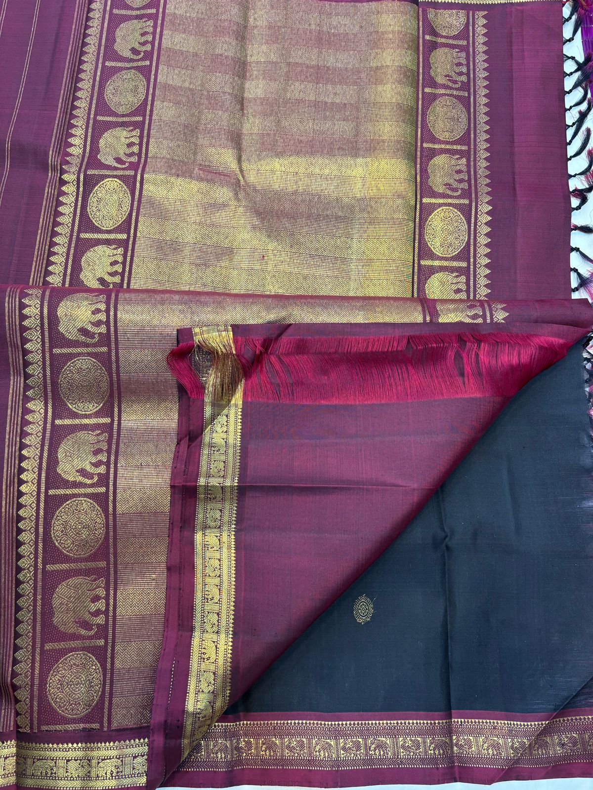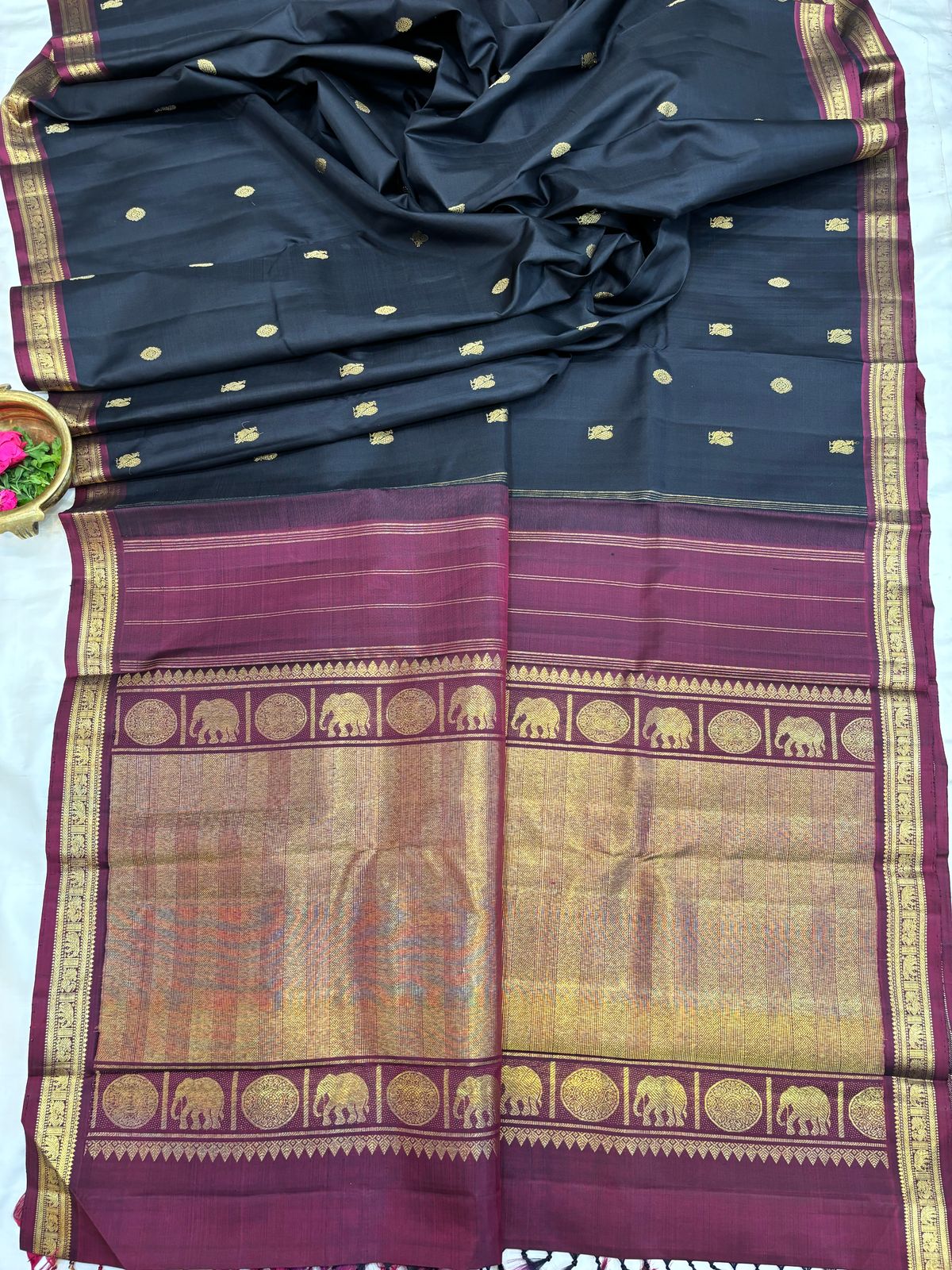 The body has black with annam chakram buttas overall all body, border has araku small pet, the pallu has araku yanai and chakram pallu with attached blouse