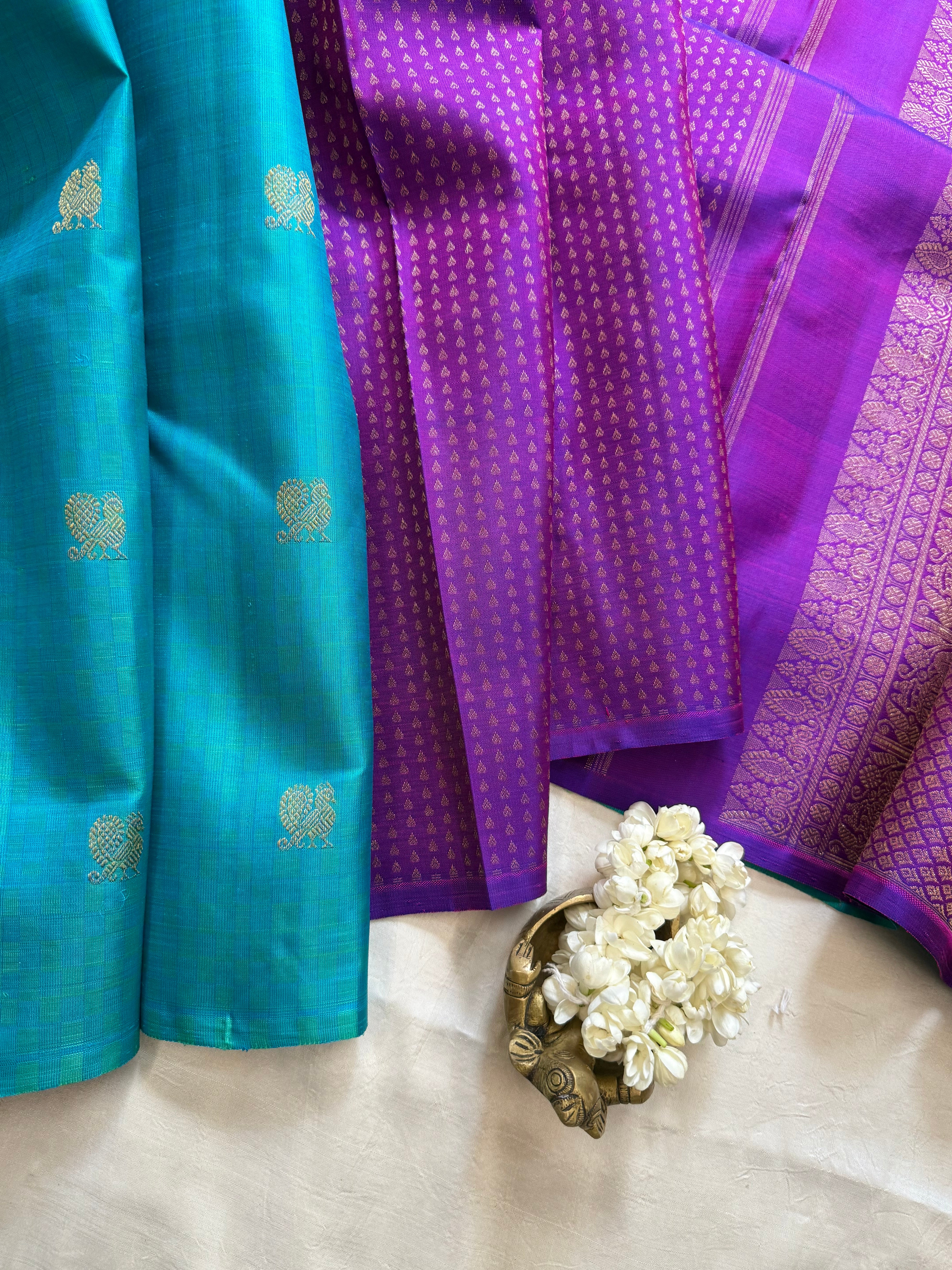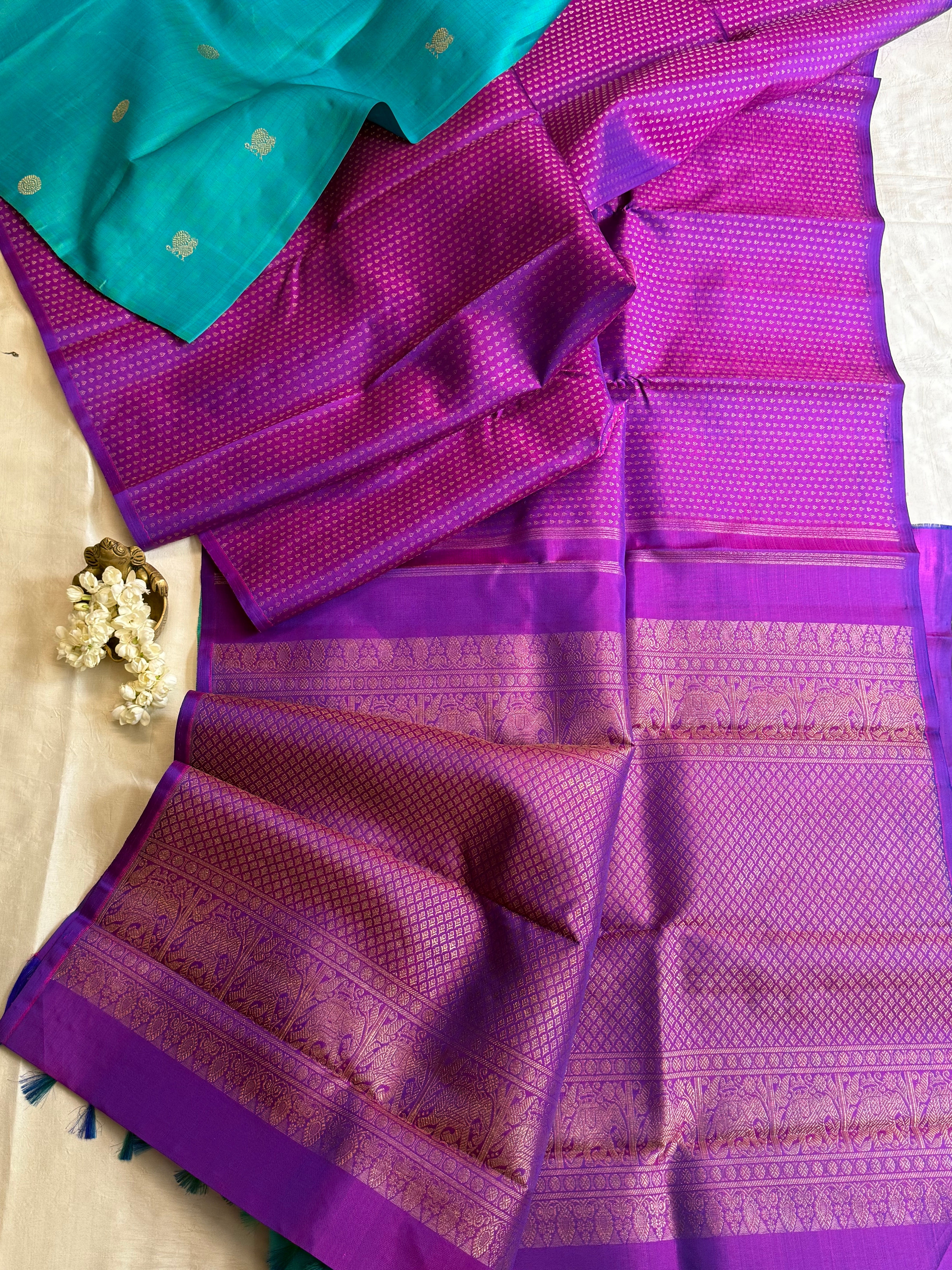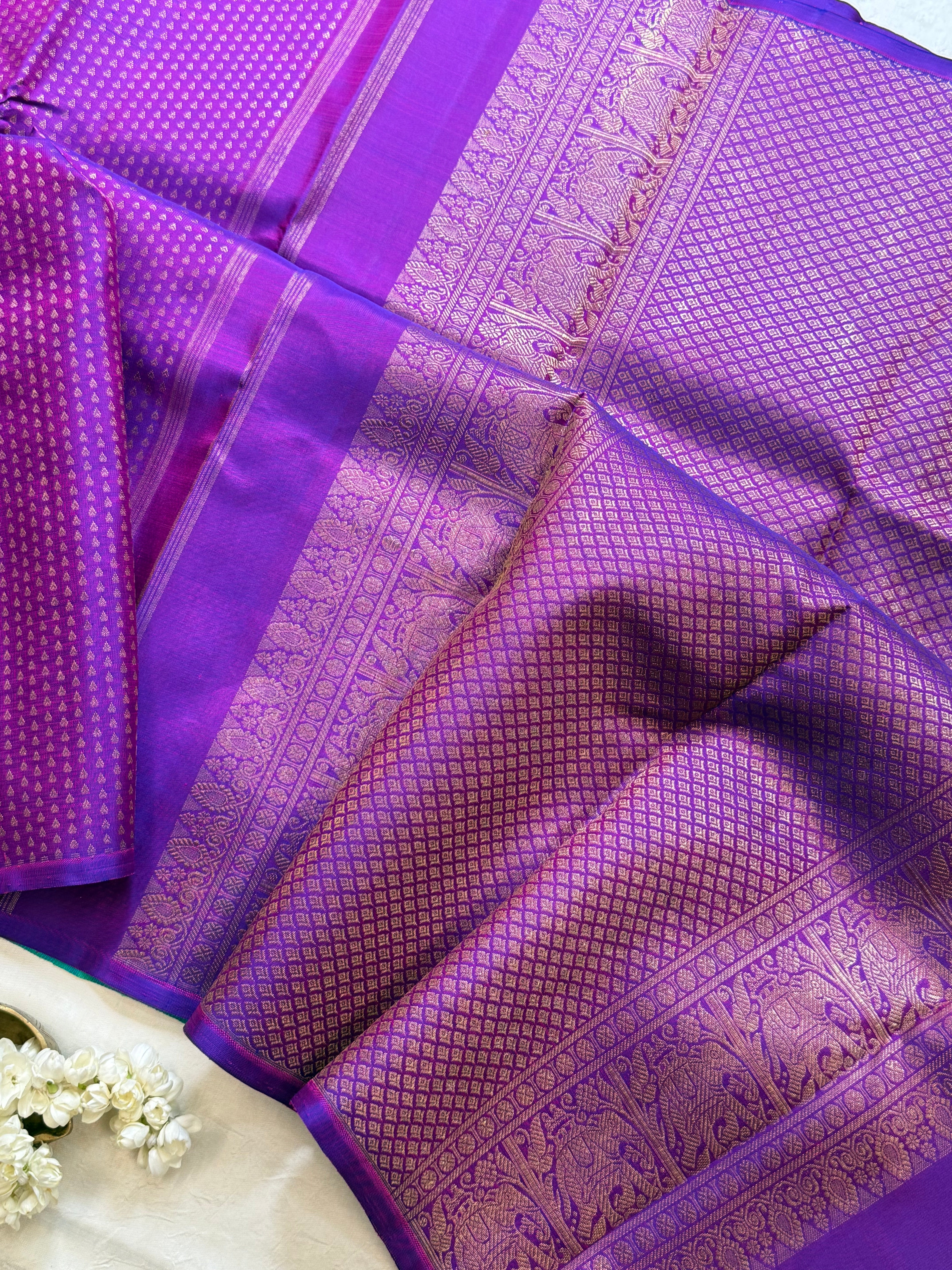 The body is purple with small Butta in body and rich Palla and the pleats is Paimadi with annam chakram Butta and purple color blouse