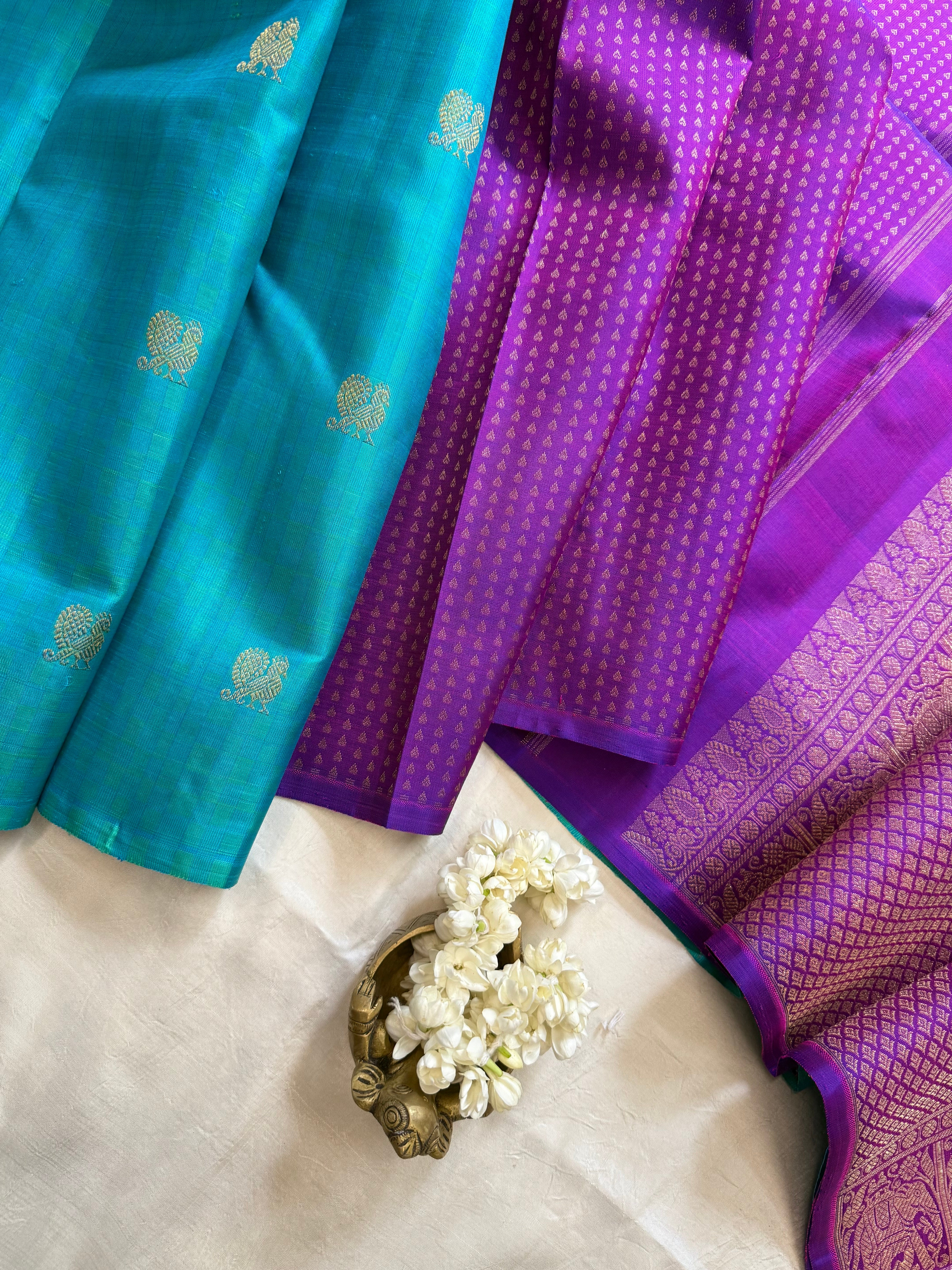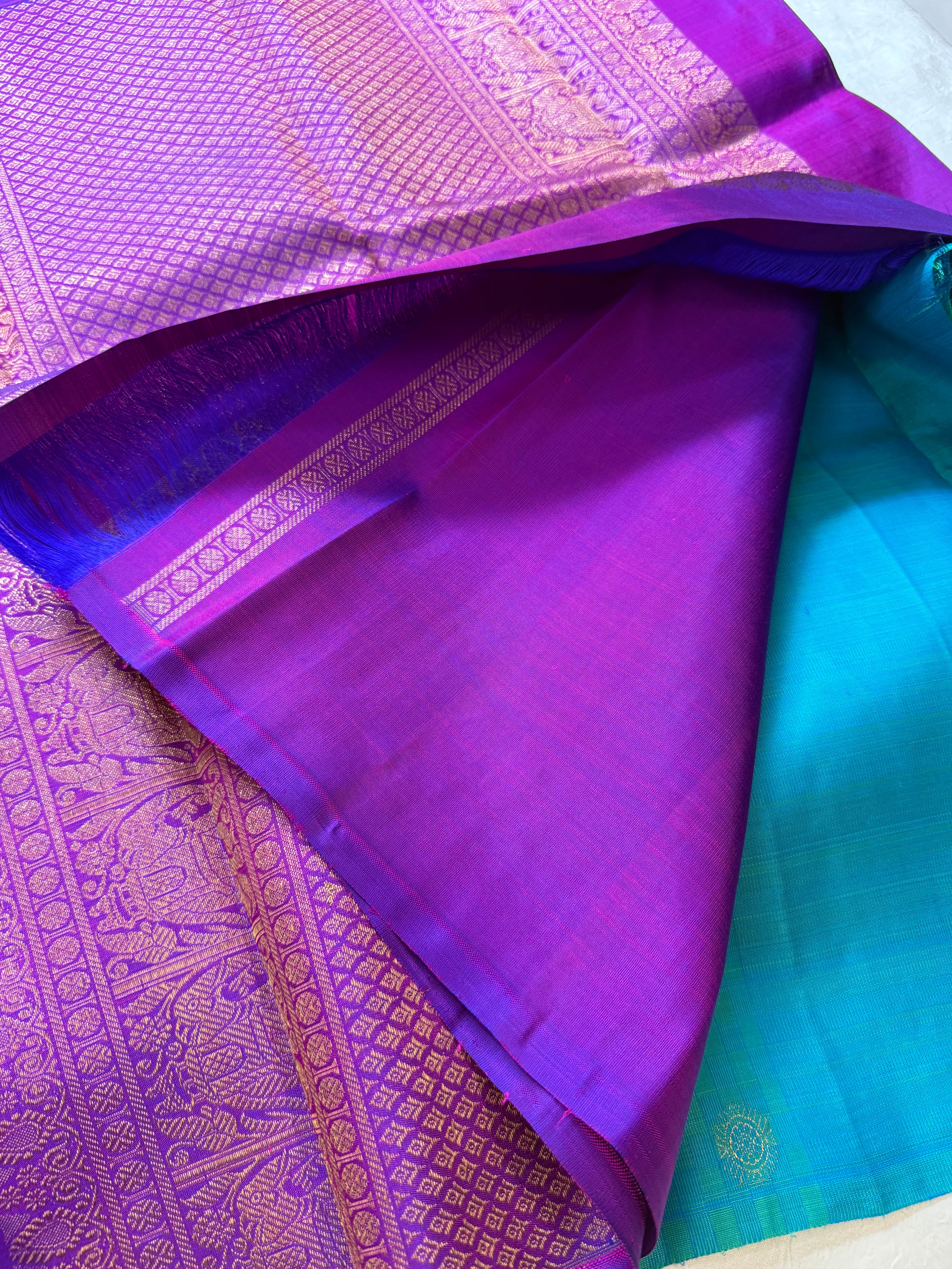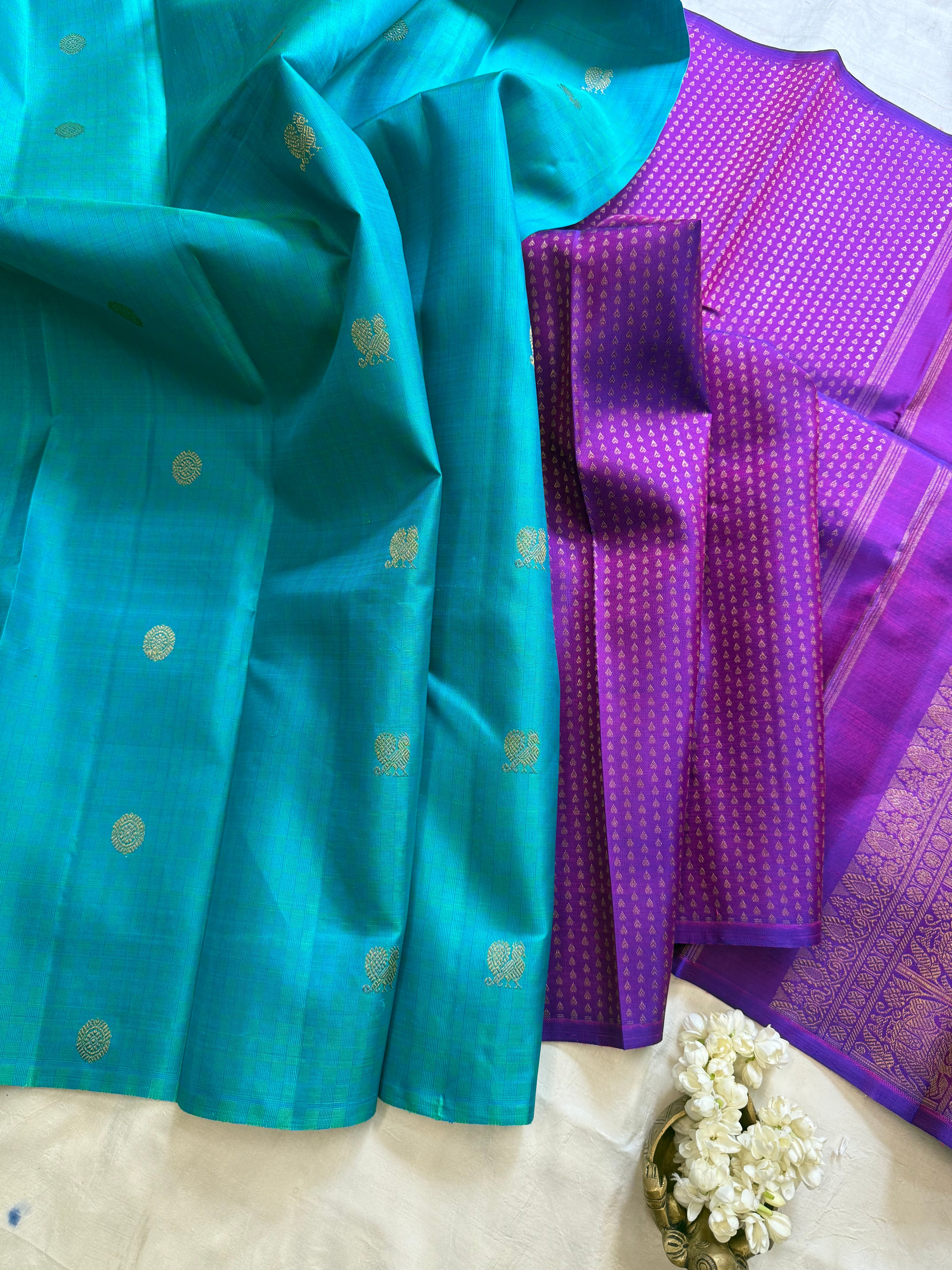 The body is purple with small Butta in body and rich Palla and the pleats is Paimadi with annam chakram Butta and purple color blouse