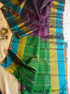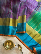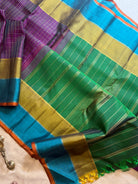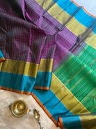 The saree is colourful , the body is deep purple with thread Muthu kattam and the border is multi color olive and blue border with rust selvedge and Zari rekku Palla in pure Zari