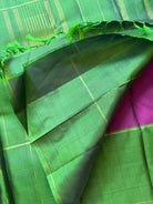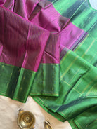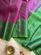 The body is purple with thread Oosi stripes in body and the border is dark green with malli Moggu and Zari rekku Palla in pure Zari and blouse