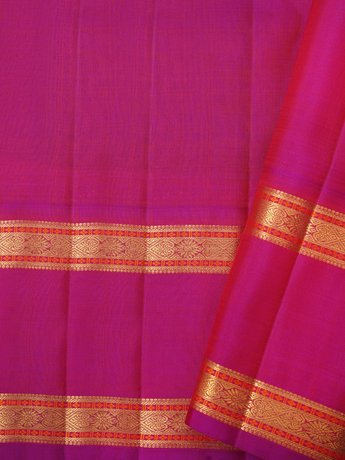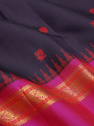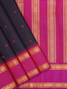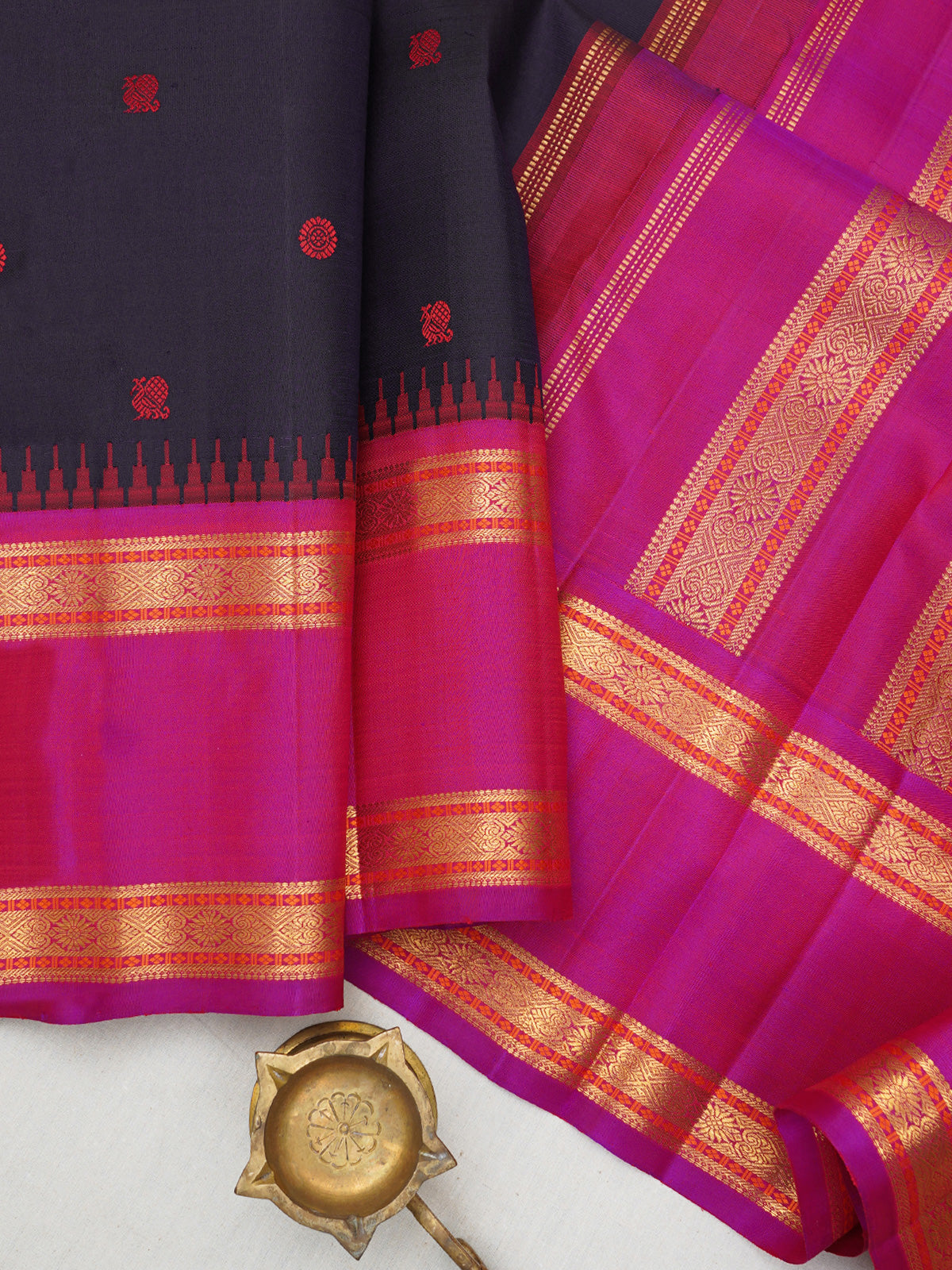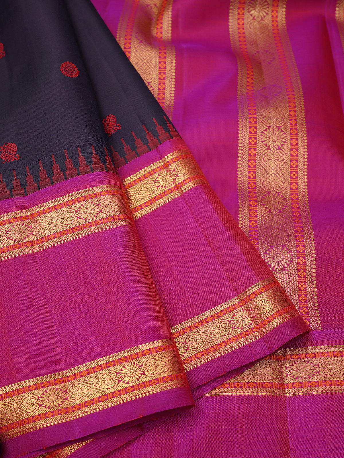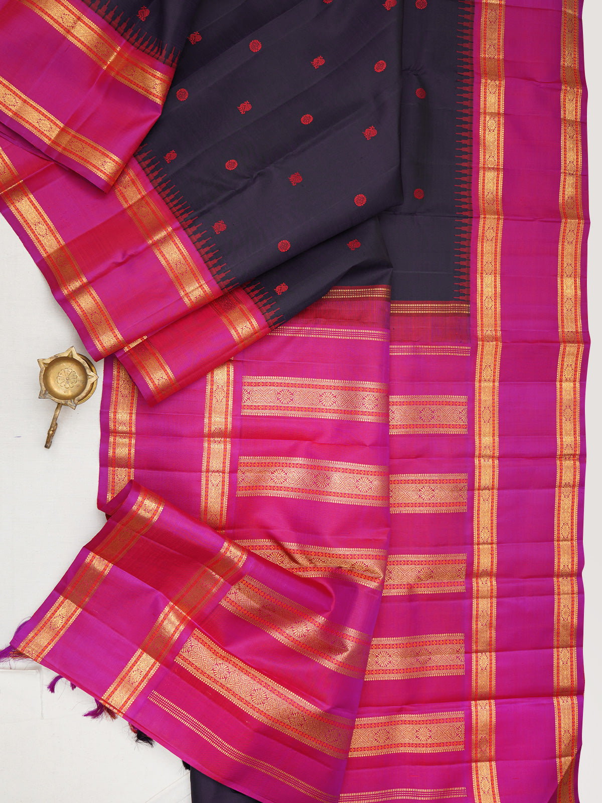 The body Is midnight blue with dark pink retta pet border with pillayar Moggu Korvai and the body has annam chakram Butta and the Palla is rich dense pure Zari Palla and blouse