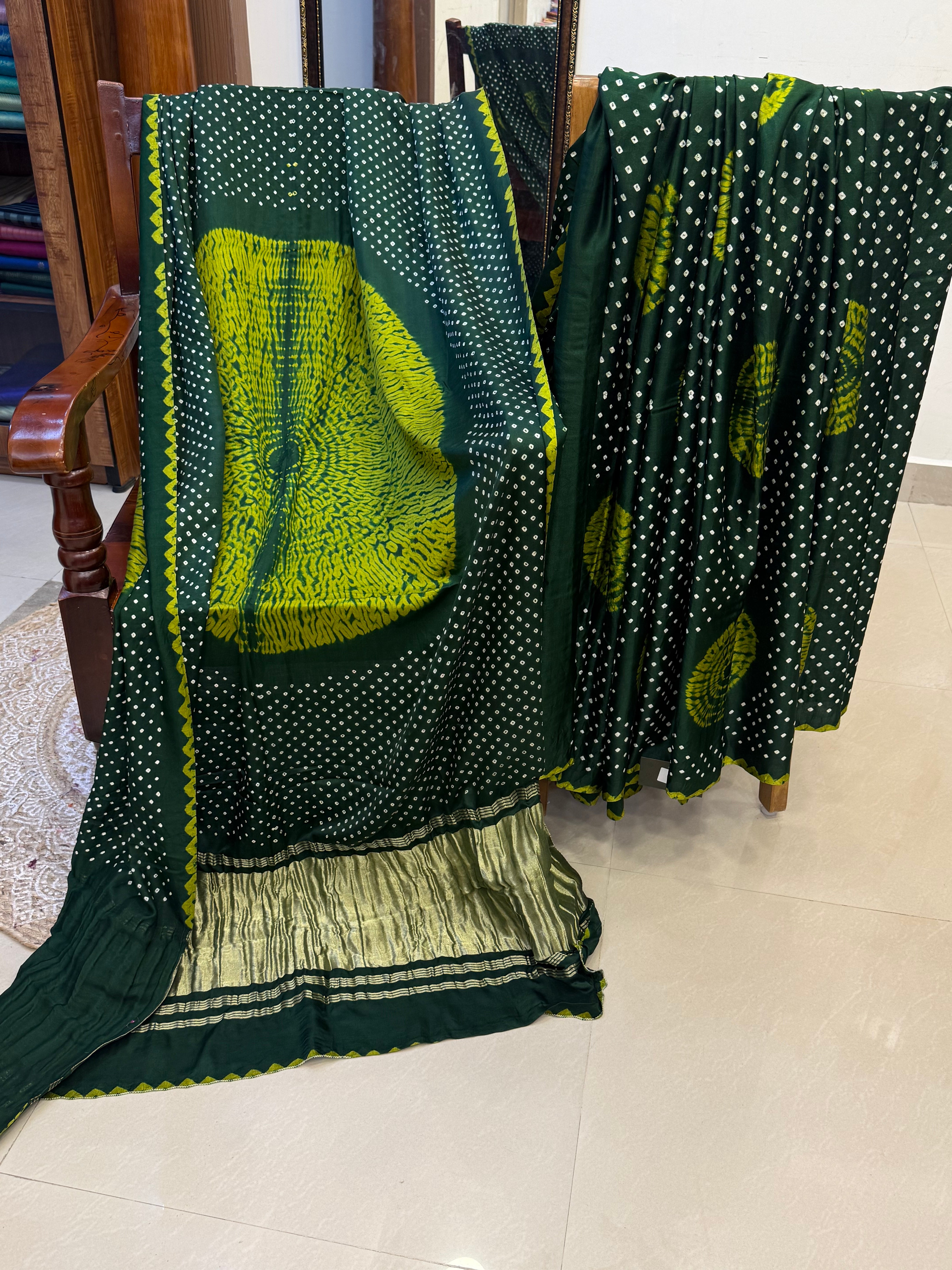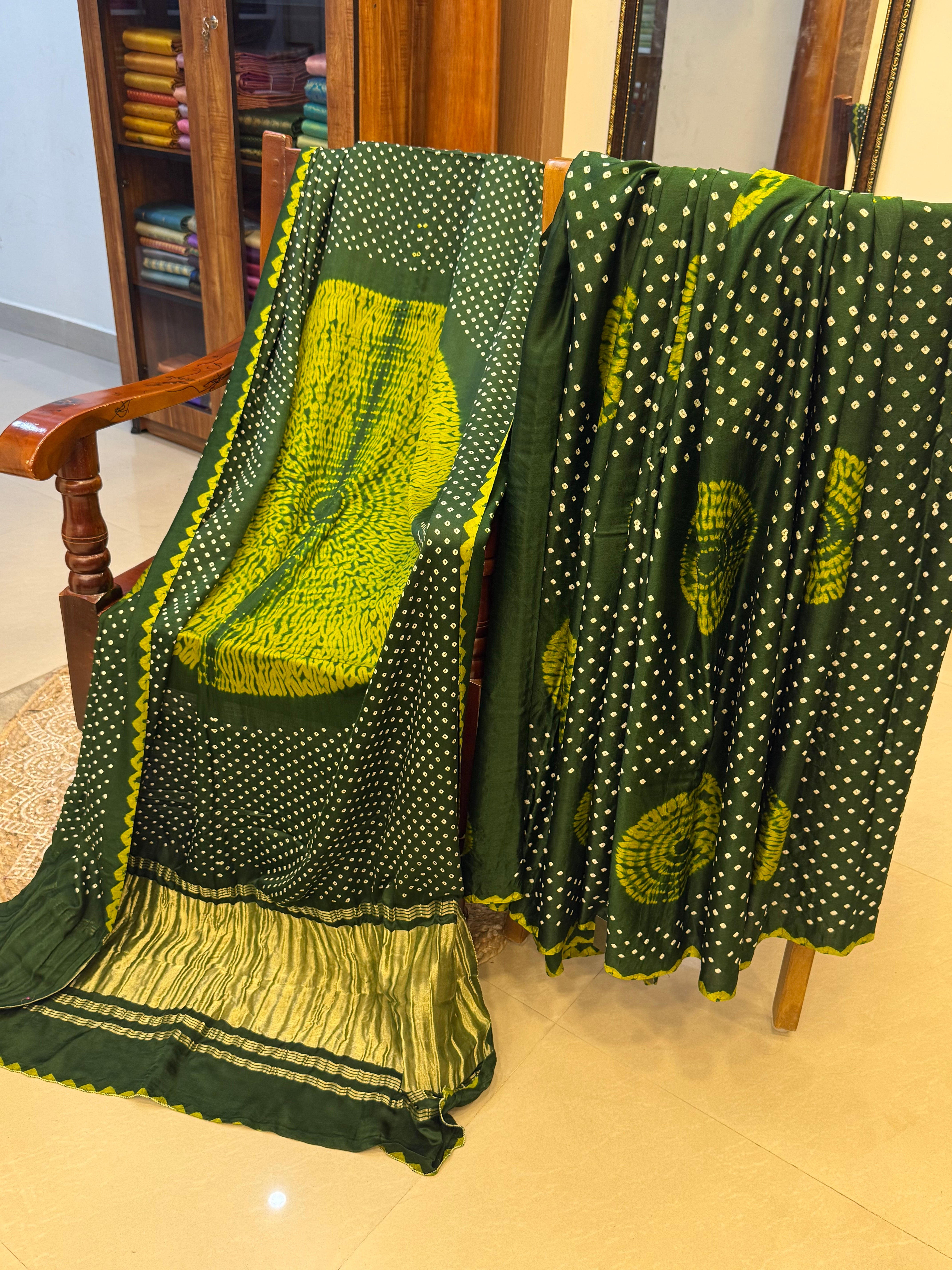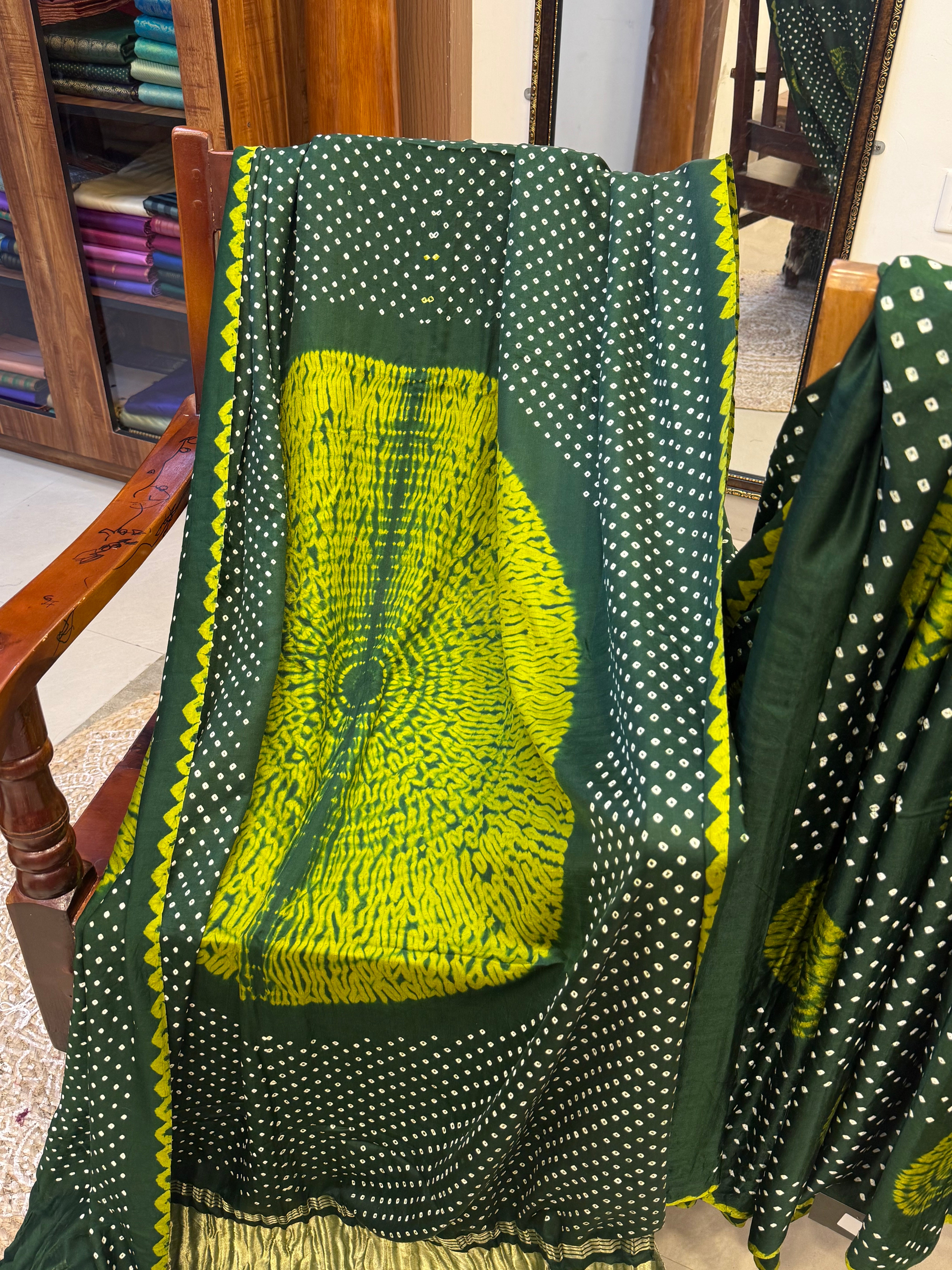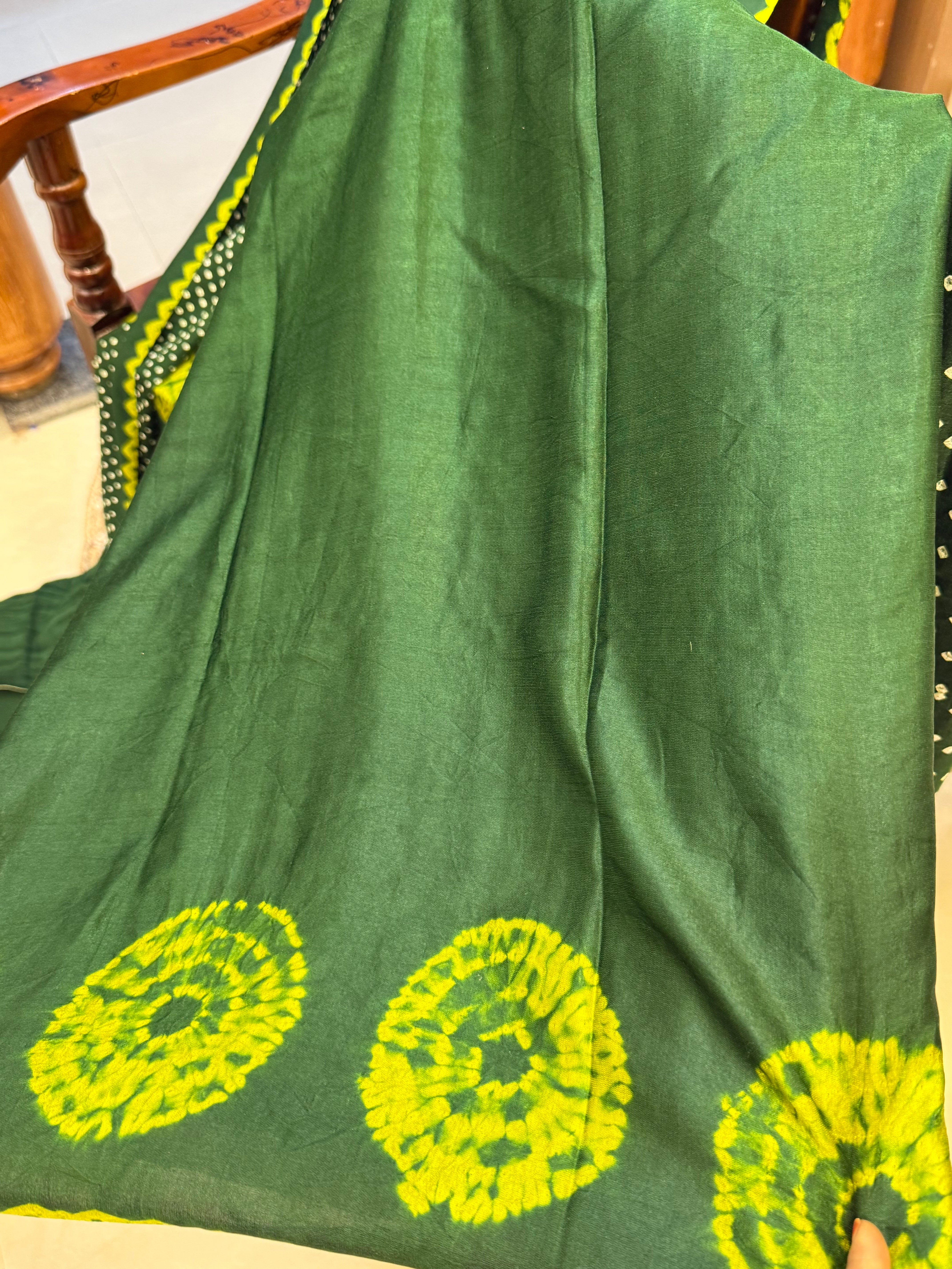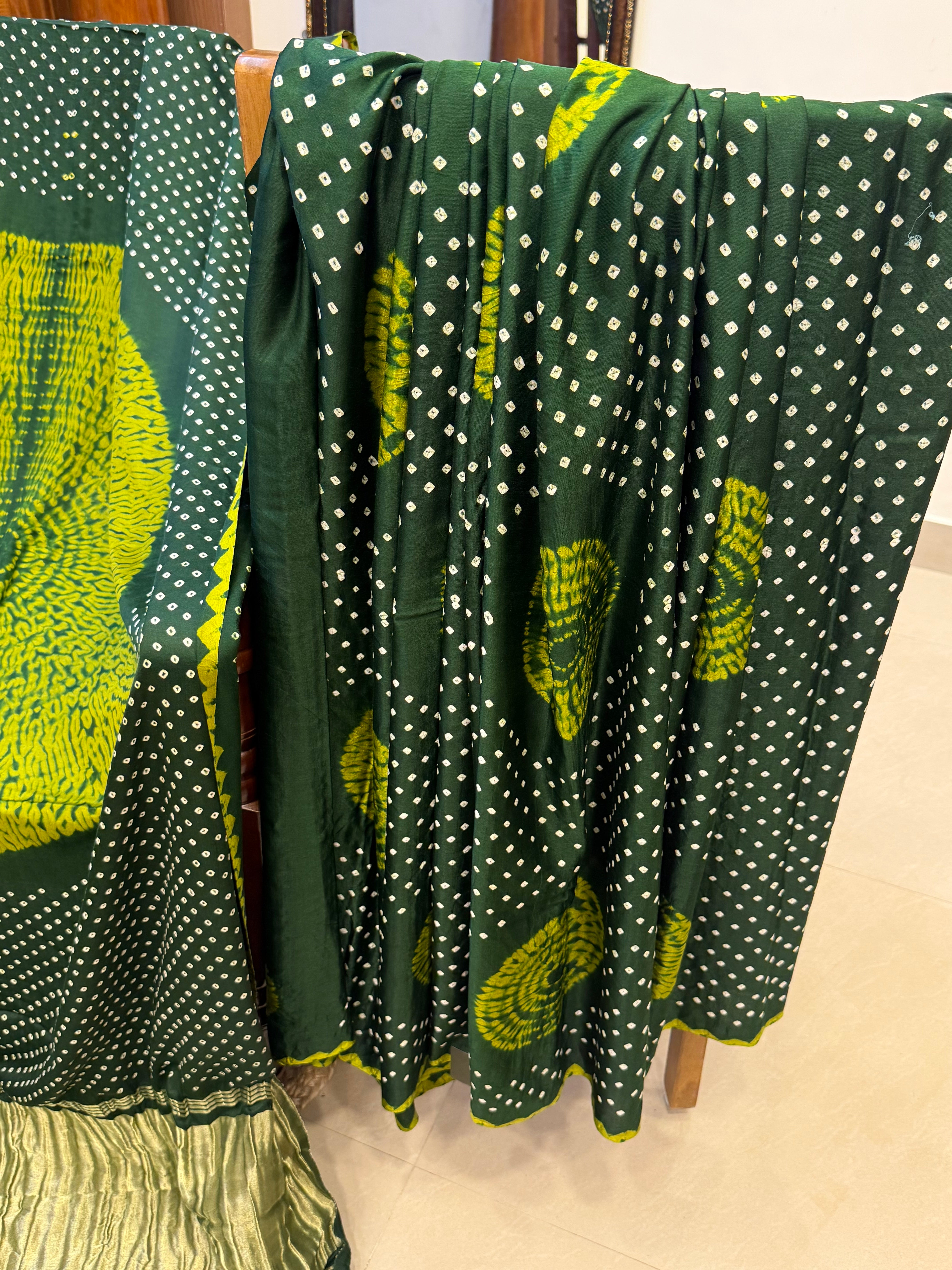 The saree is gajji silk roll pressed , attached blouse , the bandhini in the saree is hand knotted