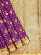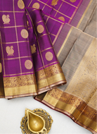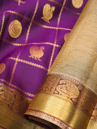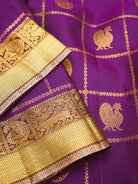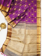 The body is deep Aubergine color with veldhari Kattam annam chakram Butta with araku border having yazhli and paisley pet with grey selvedge and grey Palla with dense pure Zari Palla and blouse