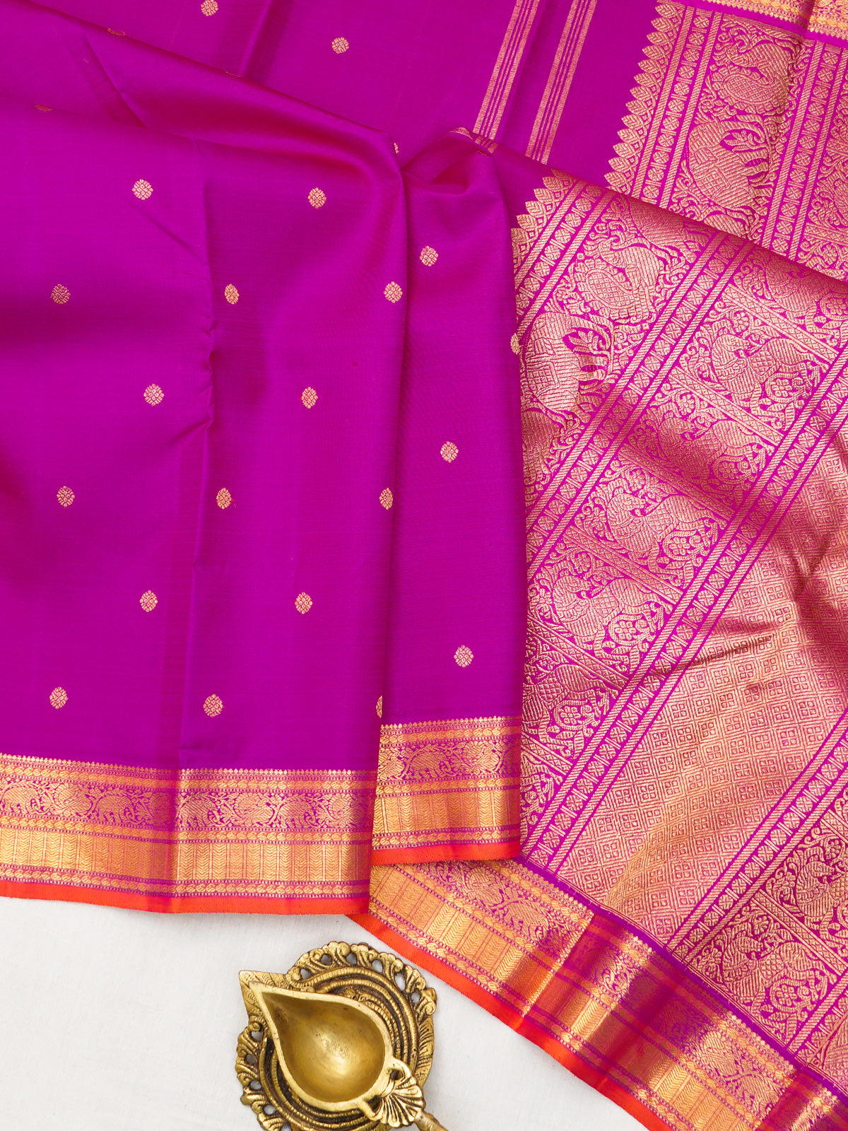 The body is deep pink with Kamalam Butta and the border is annam yannai kodi pet and the lower border is bentex pet and rich dense pure Zari Palla and blouse