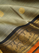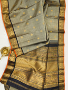 The body is beautiful grey colour with nice annam chakram Butta and the border has annam chandbali pet and dense pure Zari Palla and blouse
