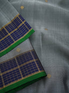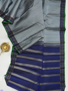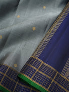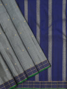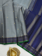 The body is beautiful elephant grey with border blue color with Zari Kattam and body has small Butta and the Palla is blue varisapet and blouse