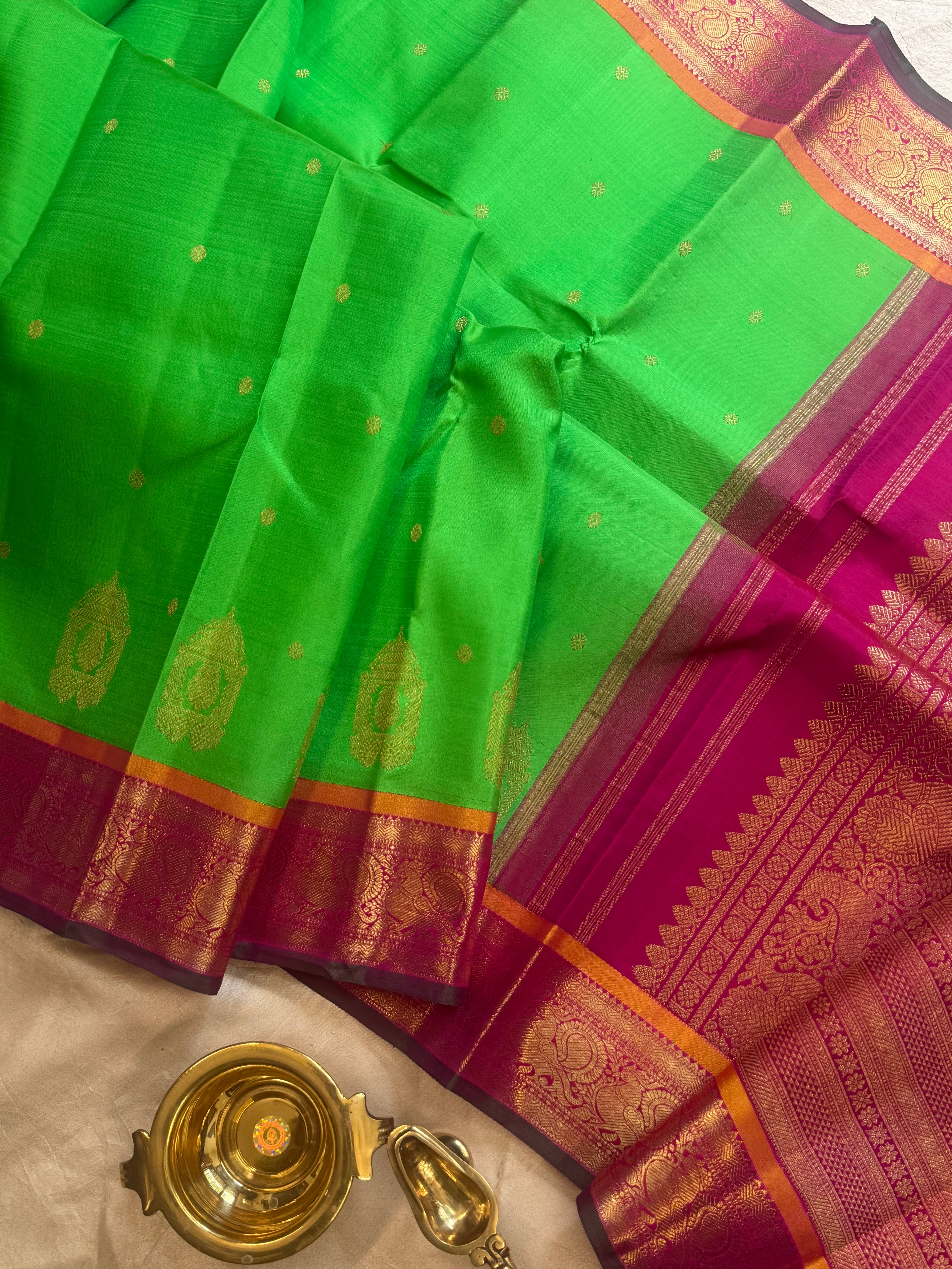 This saree is parrot green with  beetu Butta having ther Butta and Kamalam Butta in body and the border is Kai Korvai in pink colour annam pet and dense Palla in pure Zari and blouse