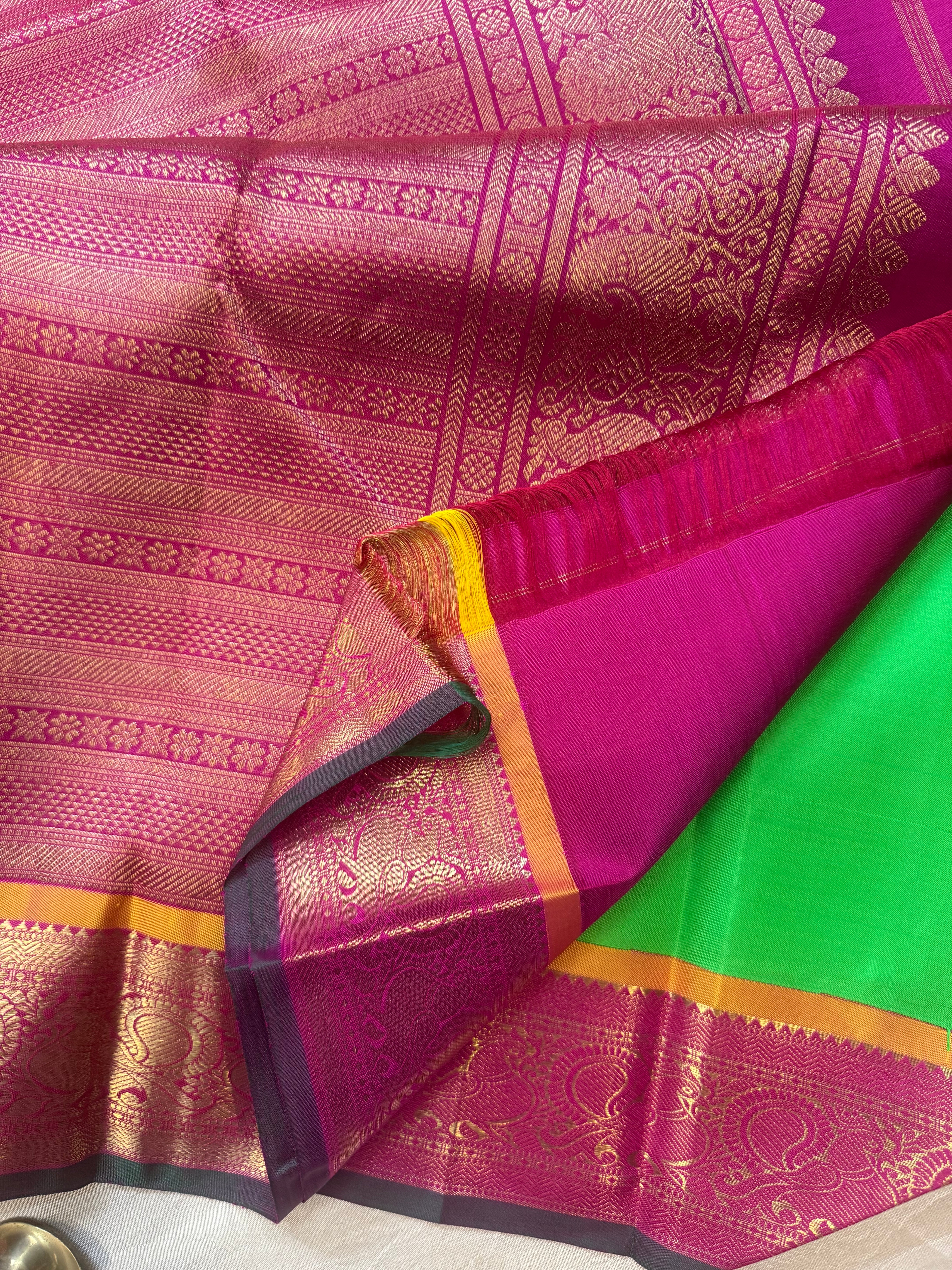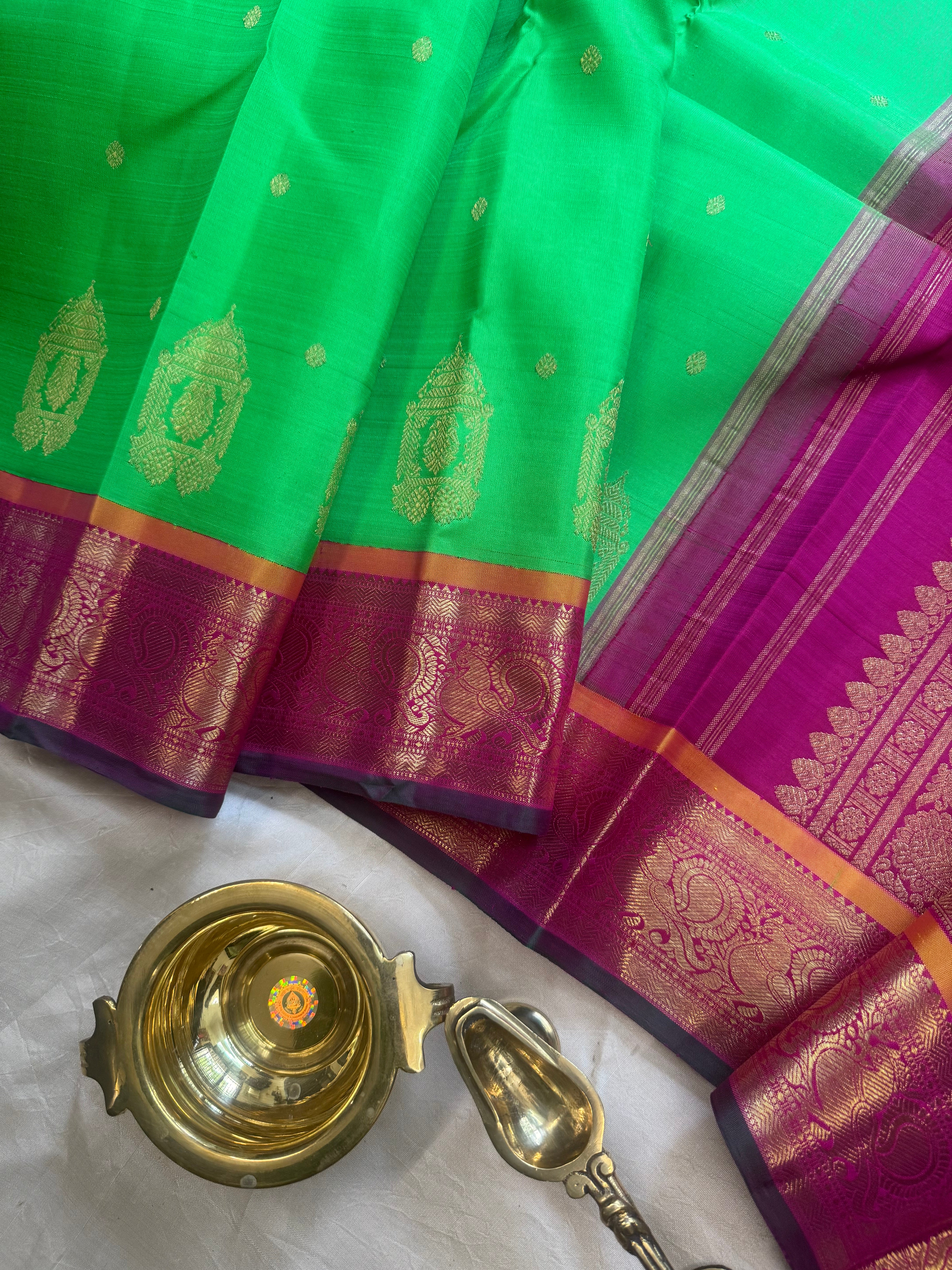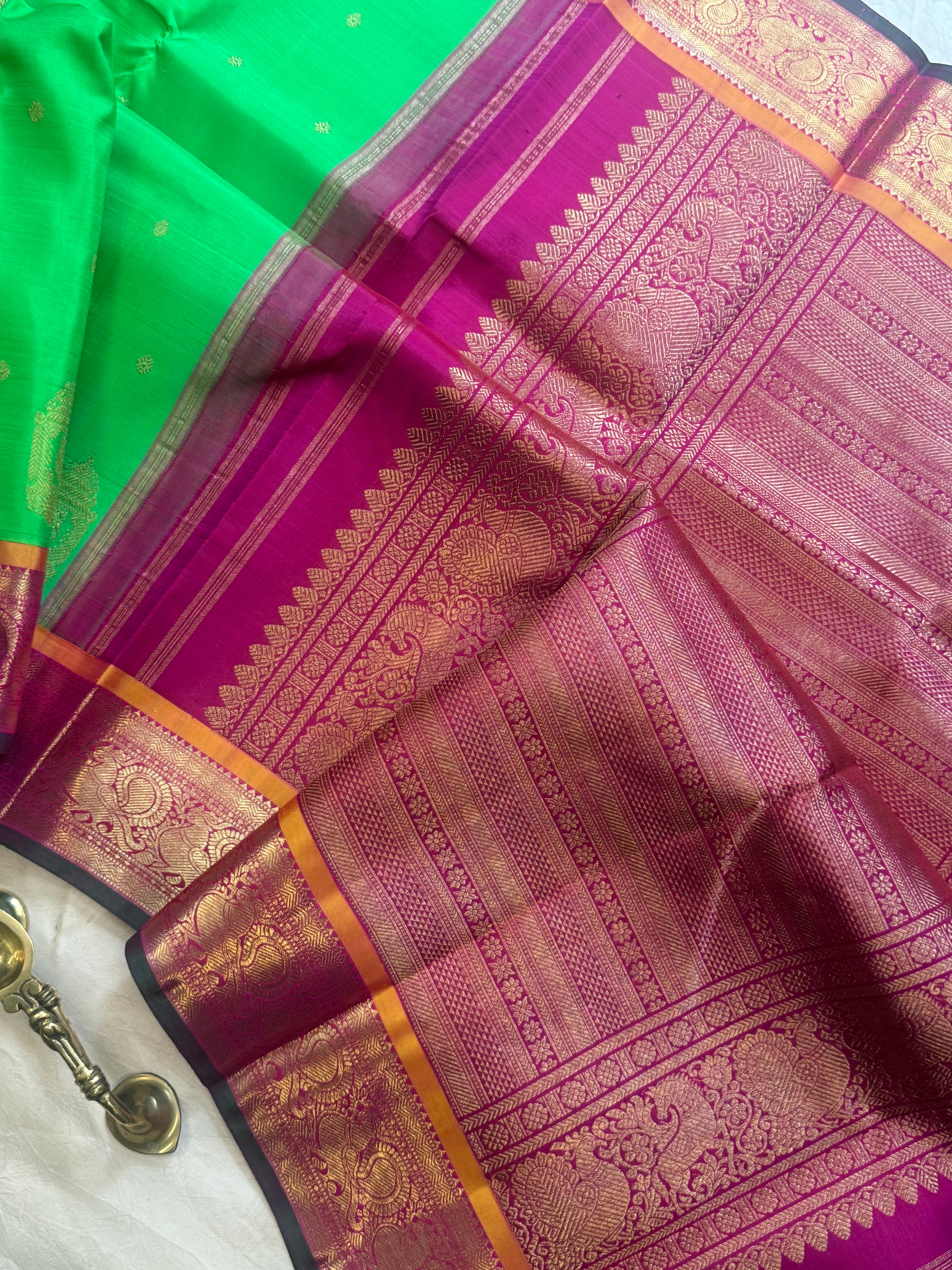 Parrot green also called kili Pachai is a old color in kanjipuram silk usually paired with red , and pink and purple