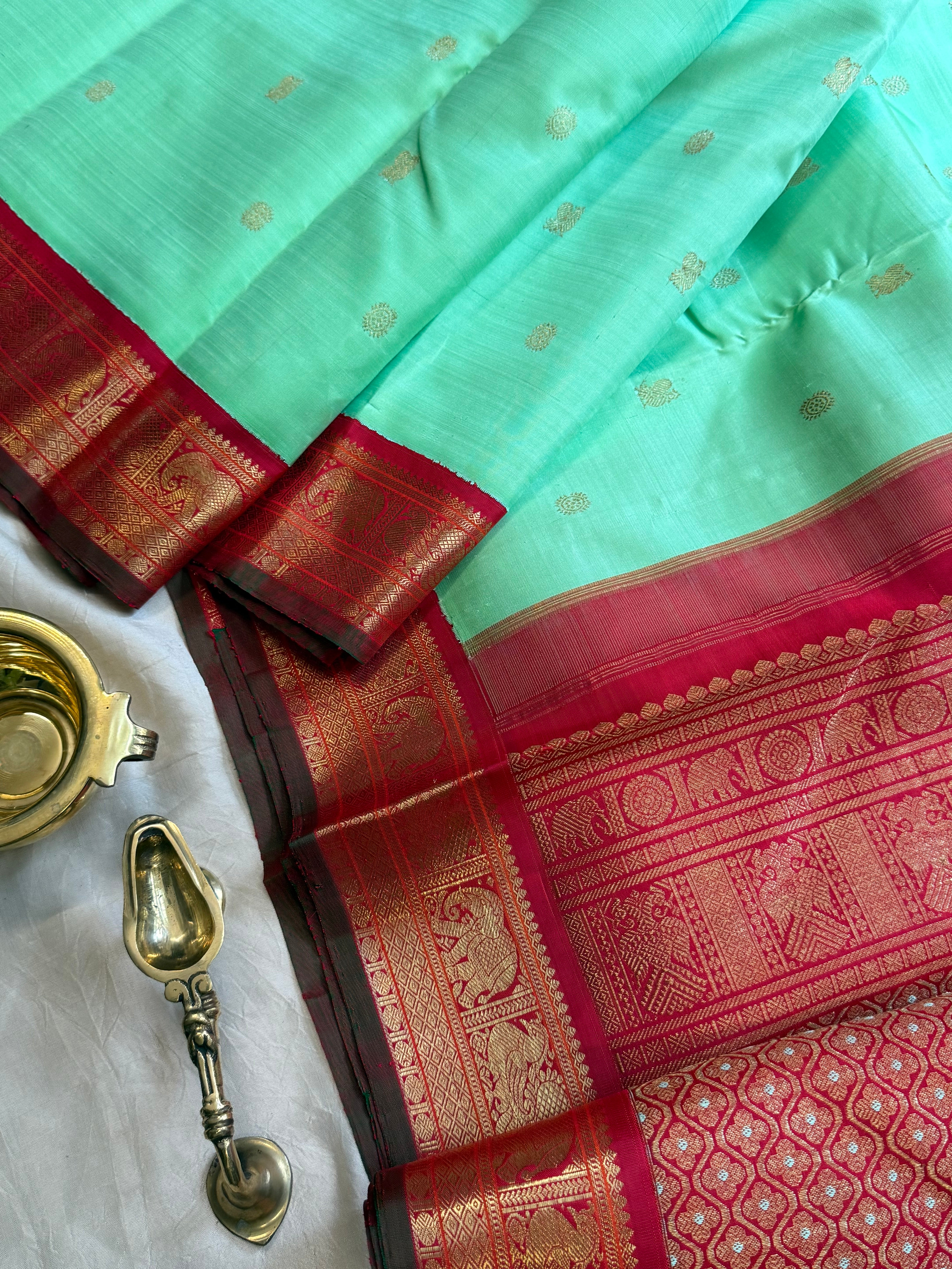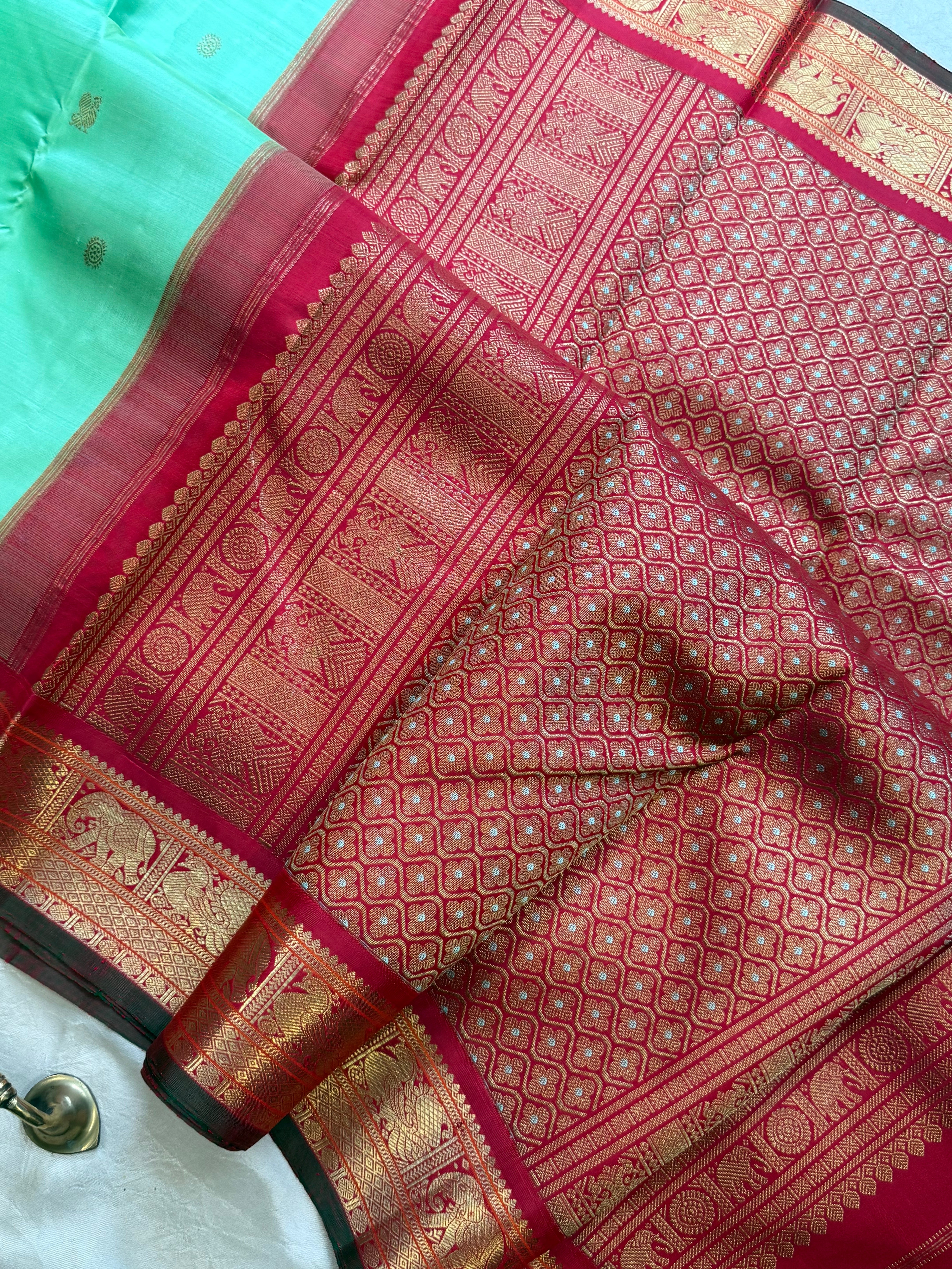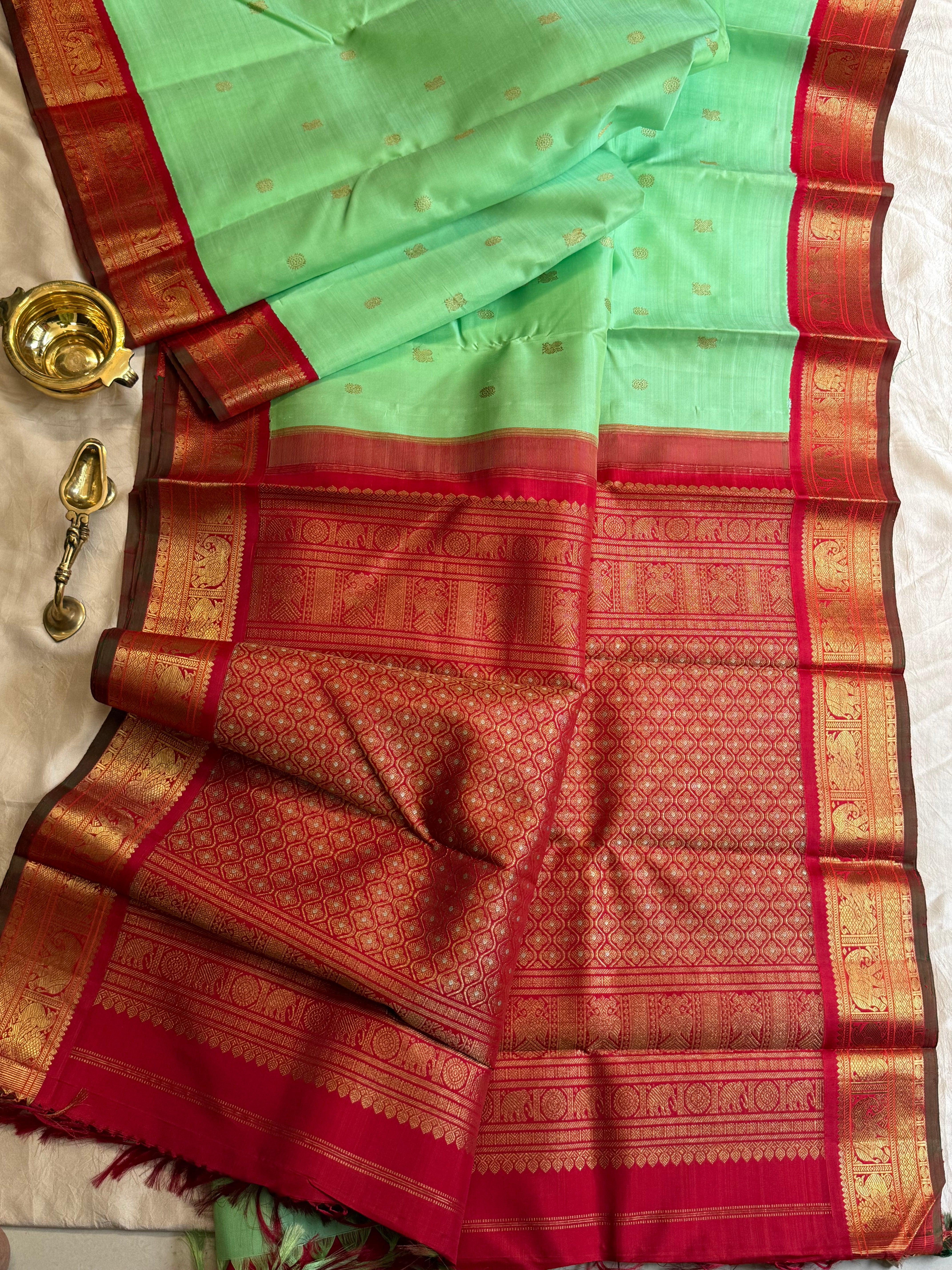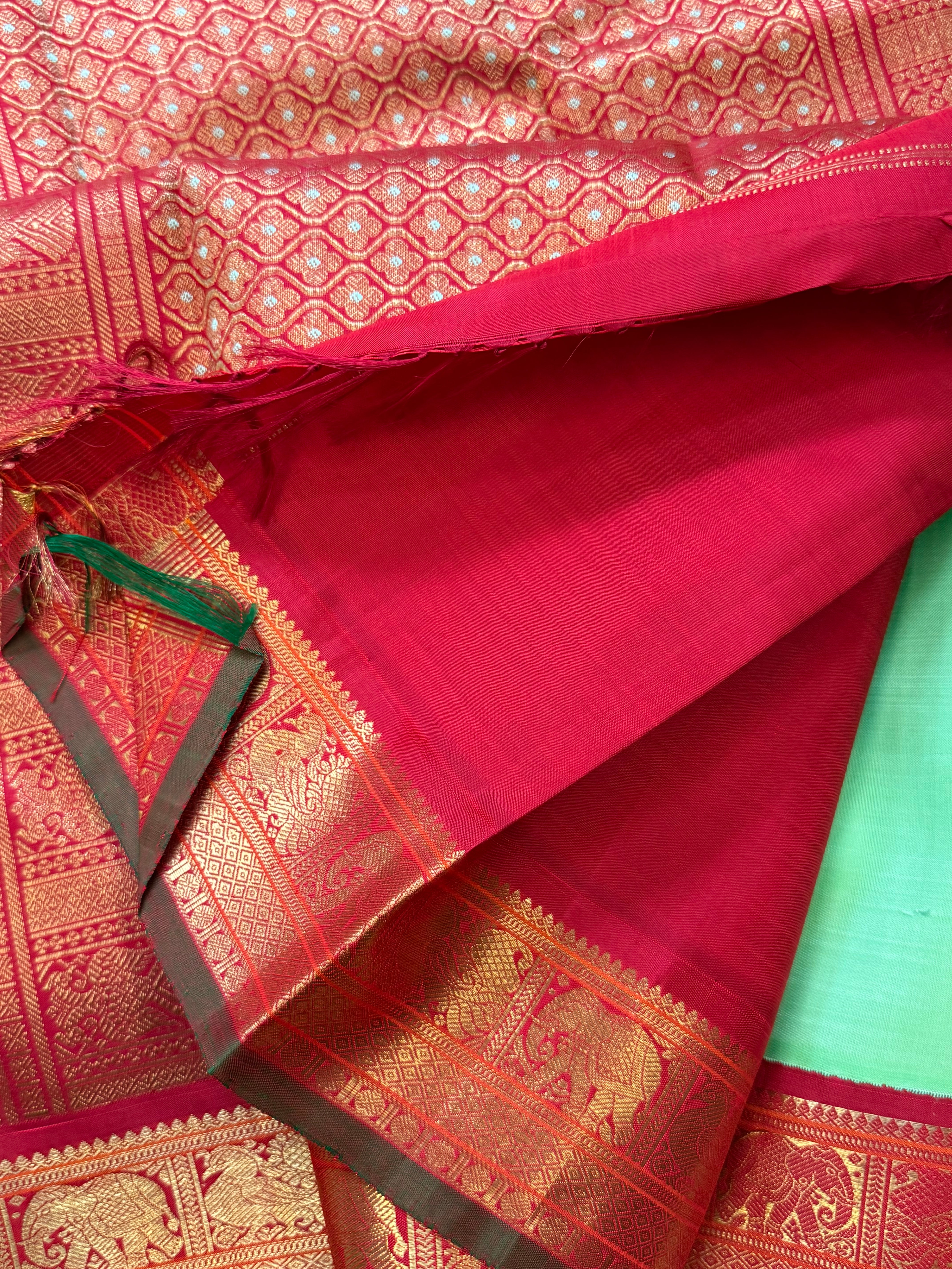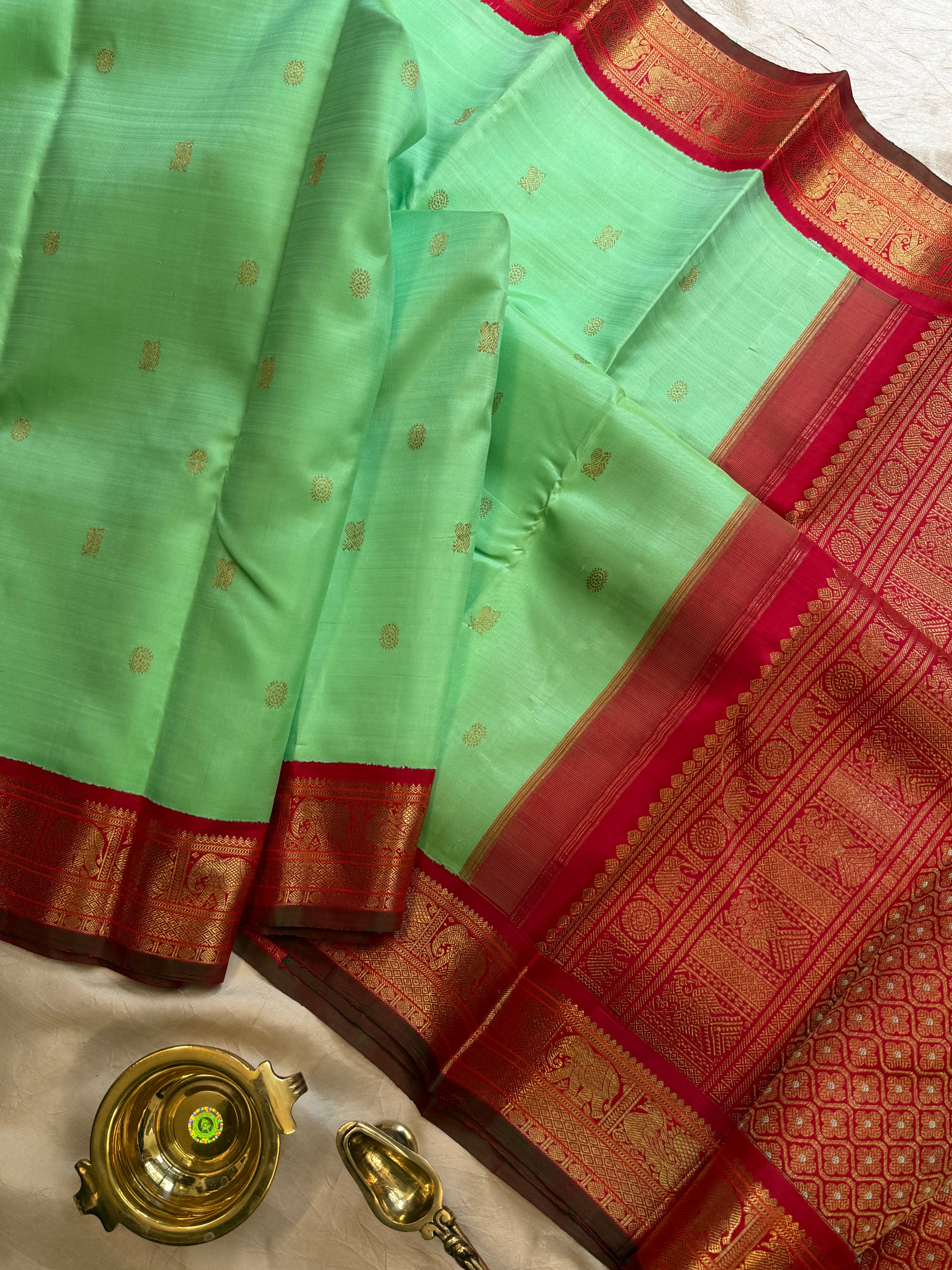 This saree is flore scent green with annam chakram butta and the border is Kai Korvai in red colour with annam yannai pet and dense pure Zari Palla and blouse