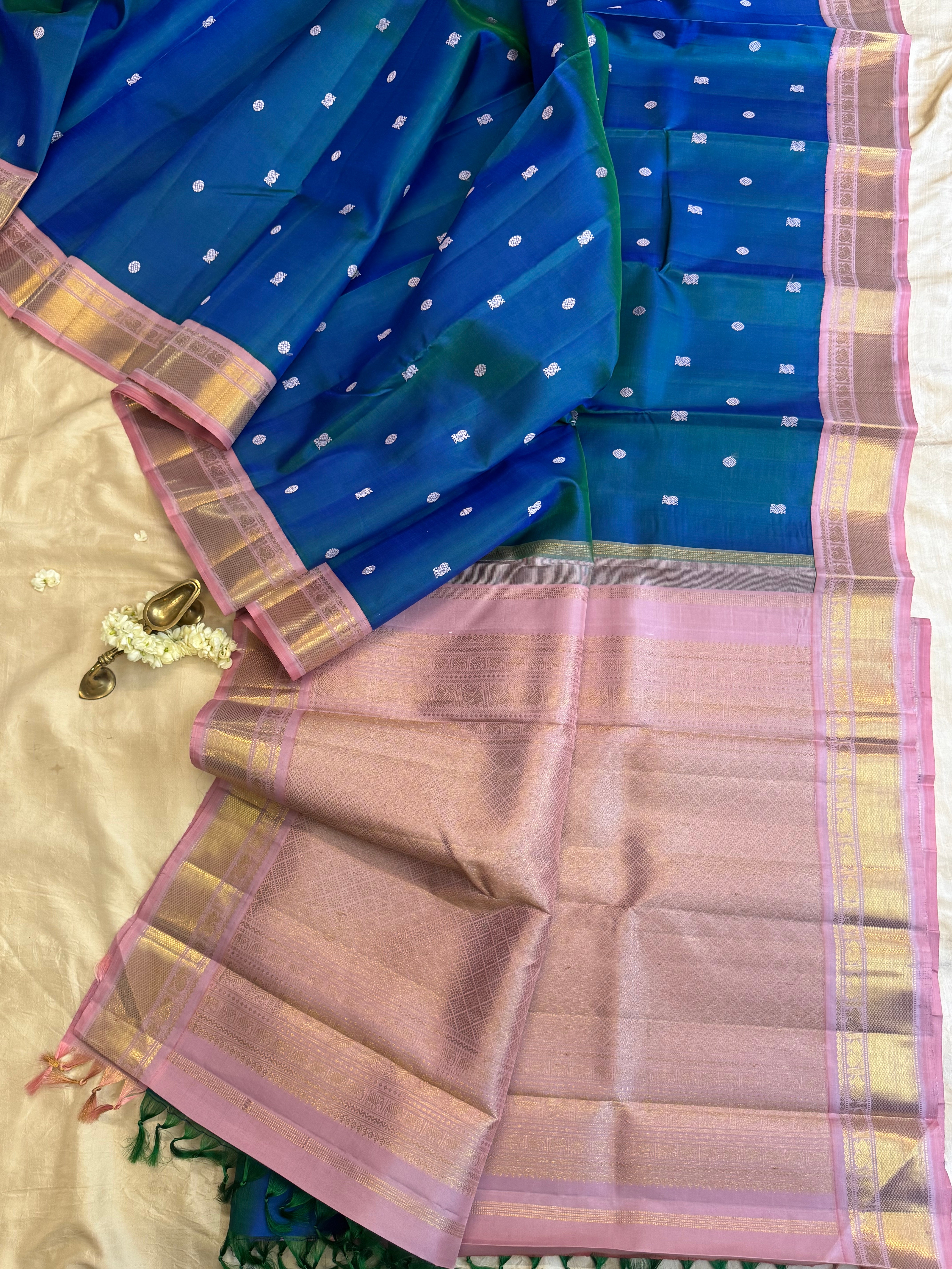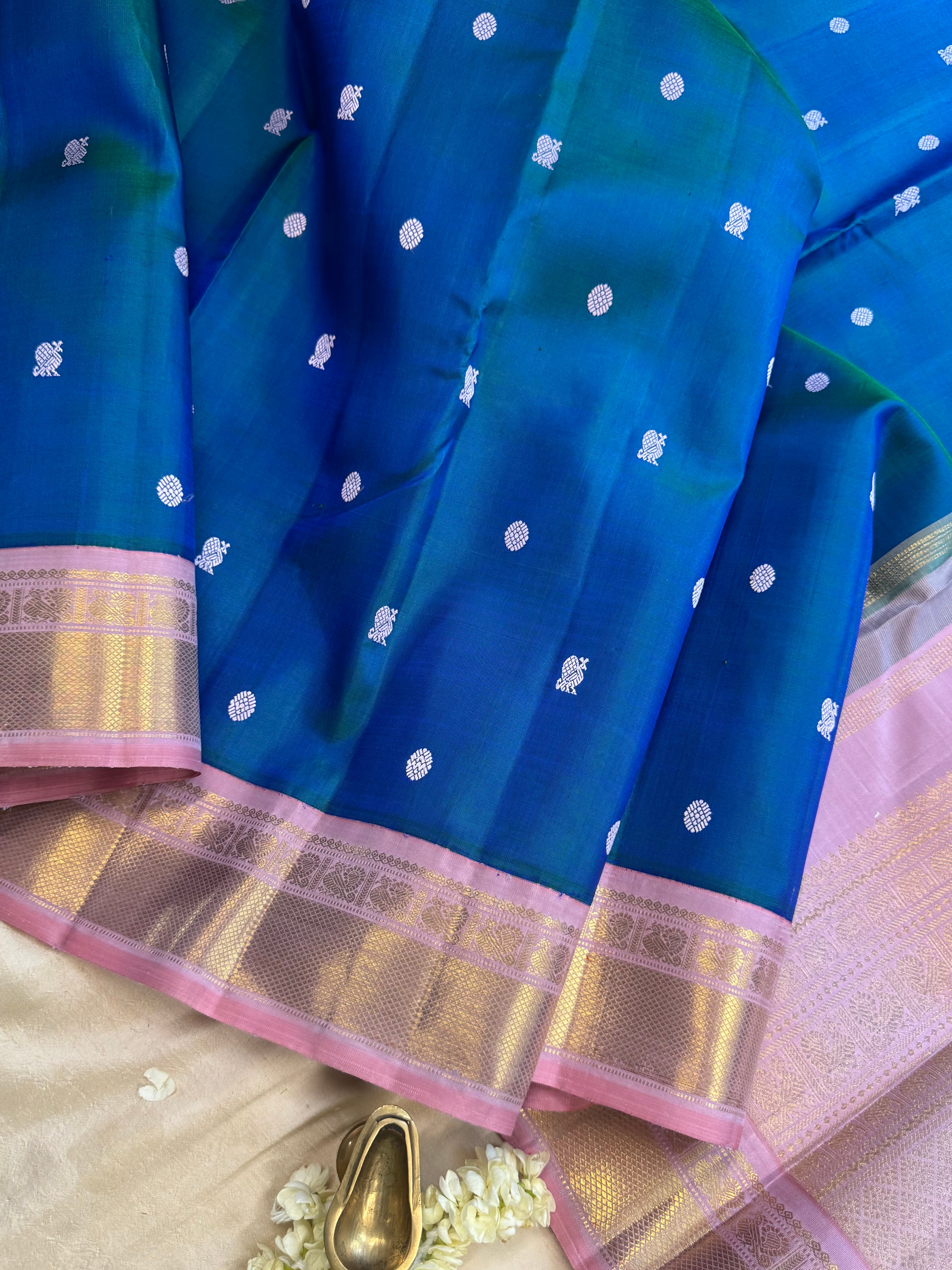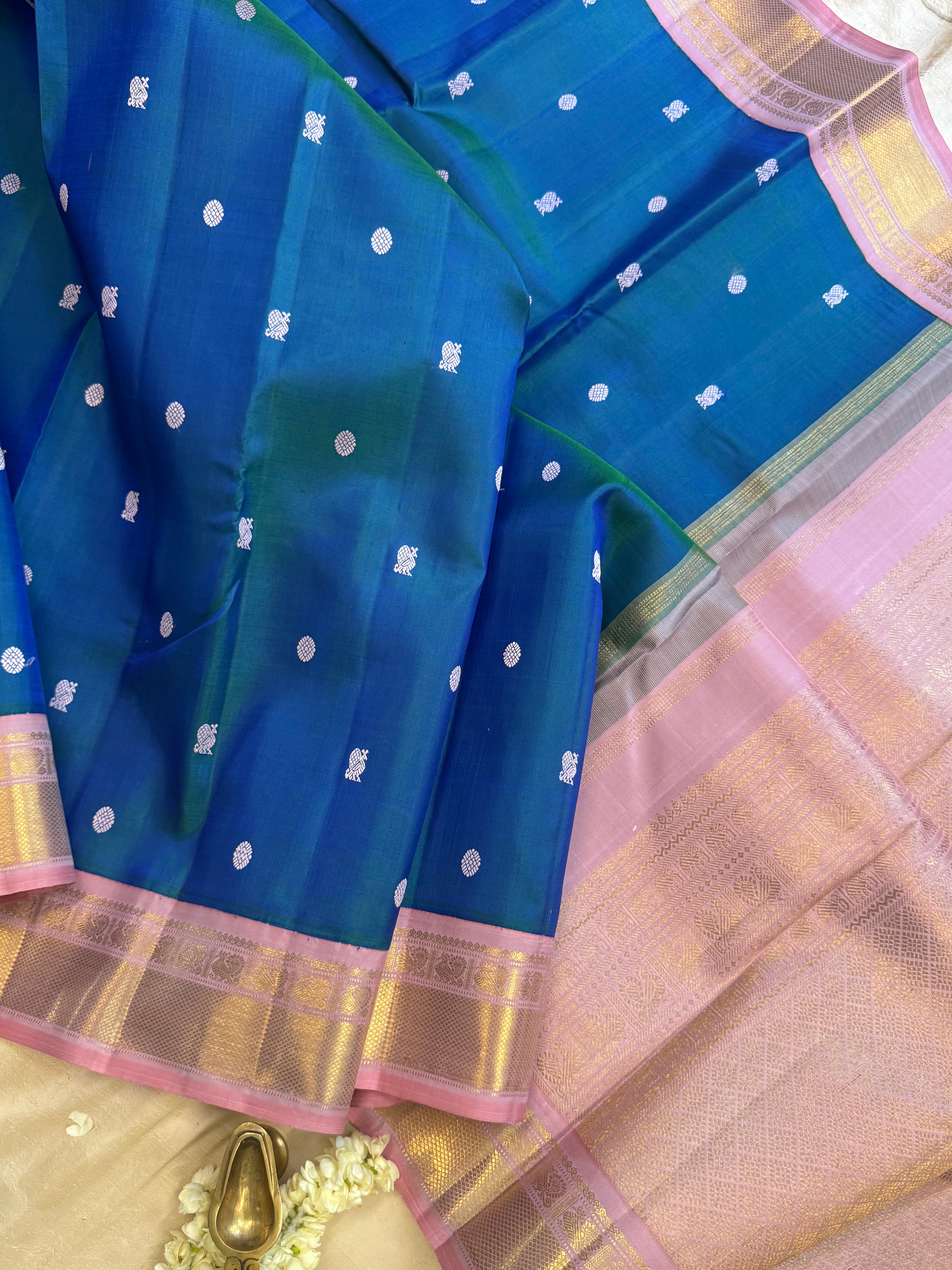 The body is mayilkazhuthu colour with pink thread Butta annam chakram Butta and the border is Kai korvai in pastel pink with annam chakram pet and dense pure zari Palla and blouse