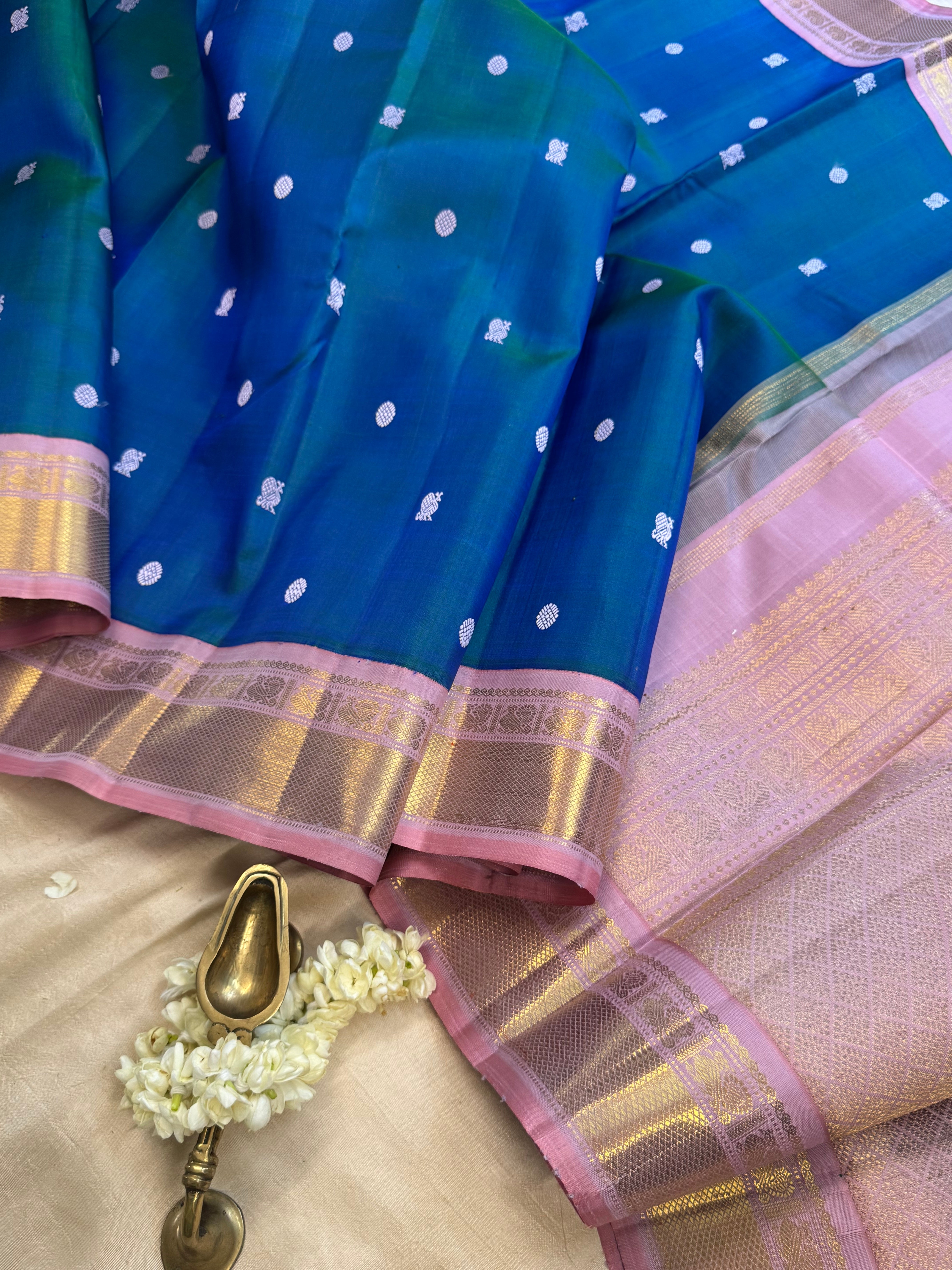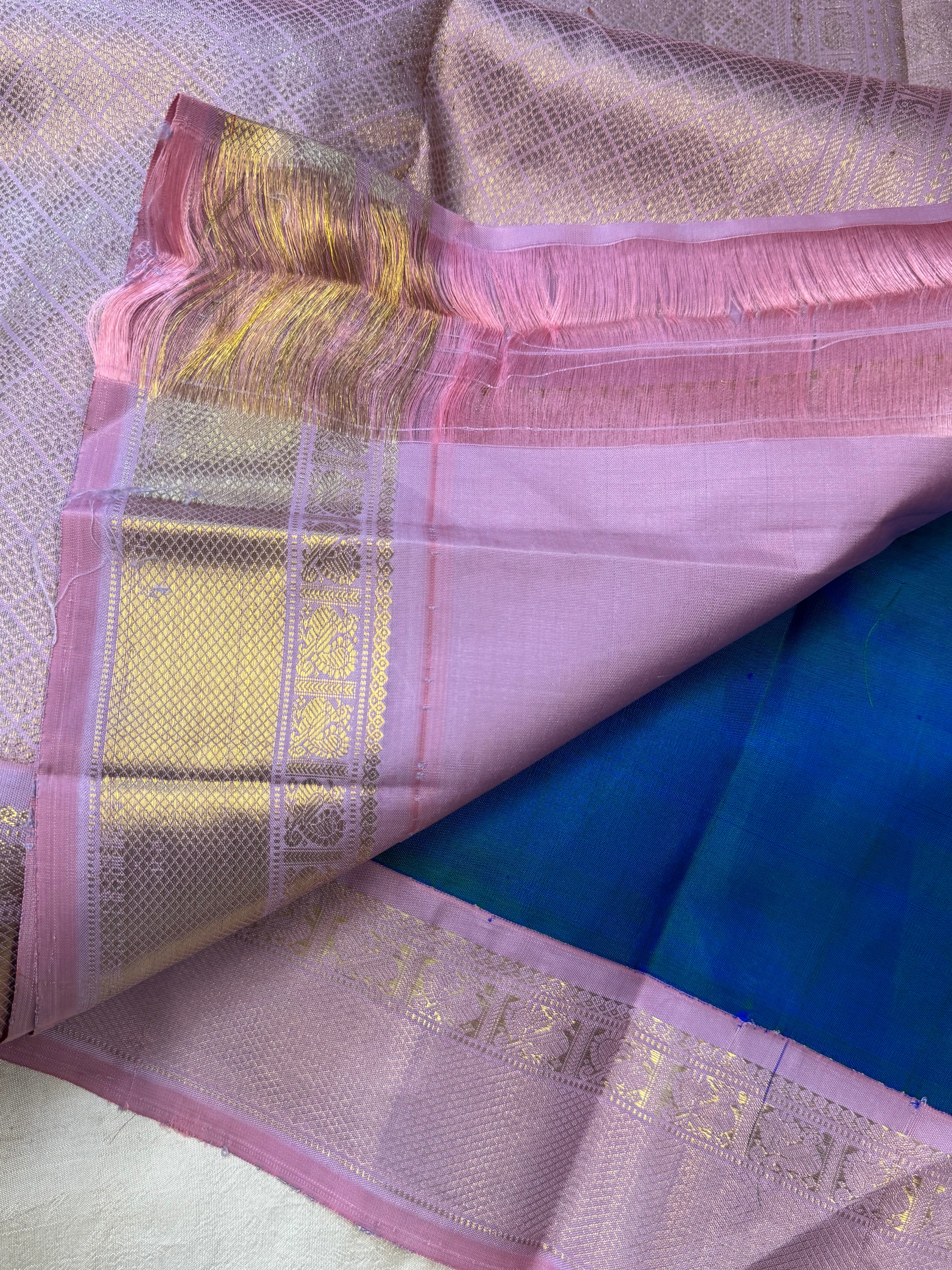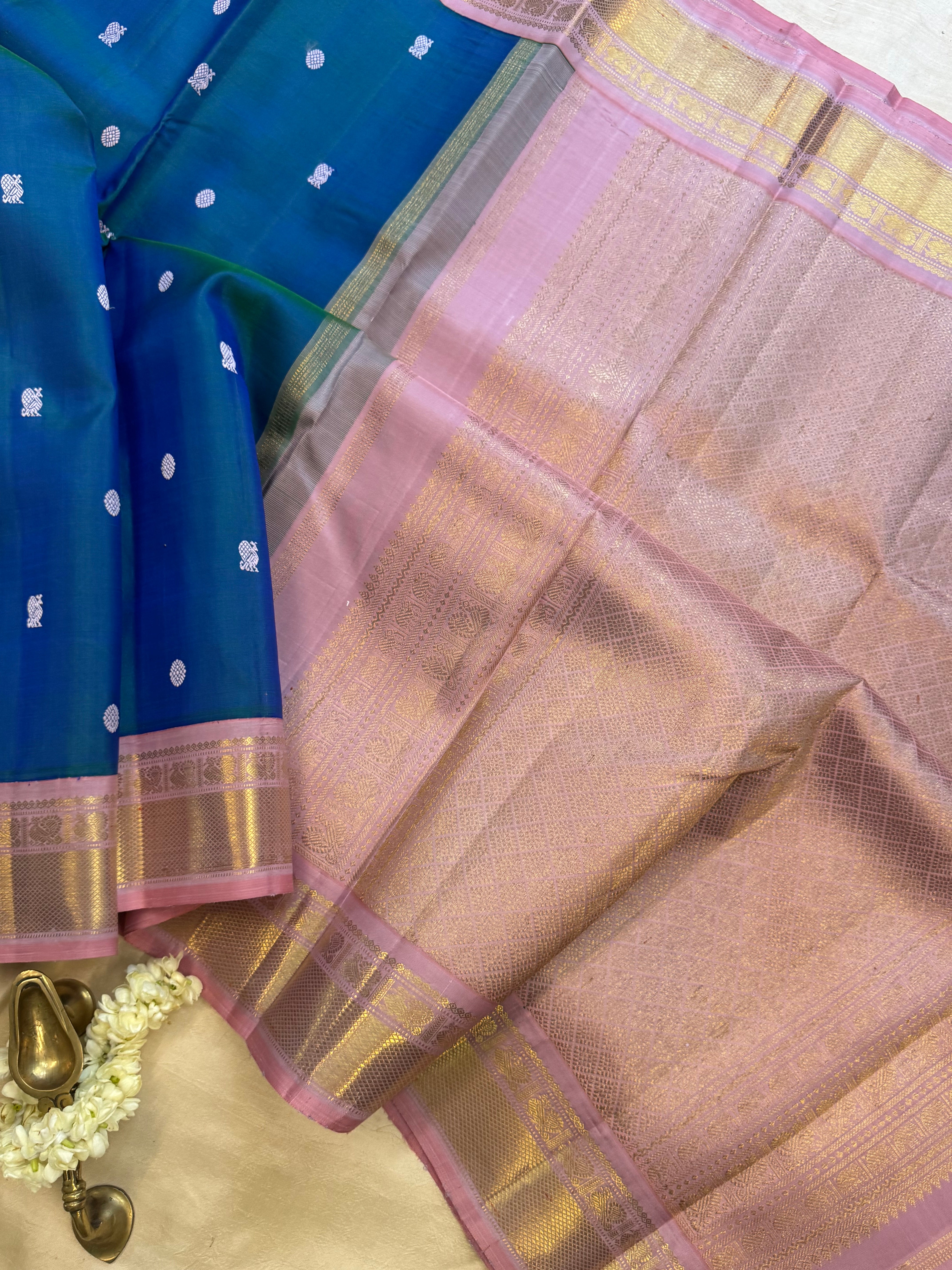 The body is mayilkazhuthu colour with pink thread Butta annam chakram Butta and the border is Kai korvai in pastel pink with annam chakram pet and dense pure zari Palla and blouse