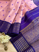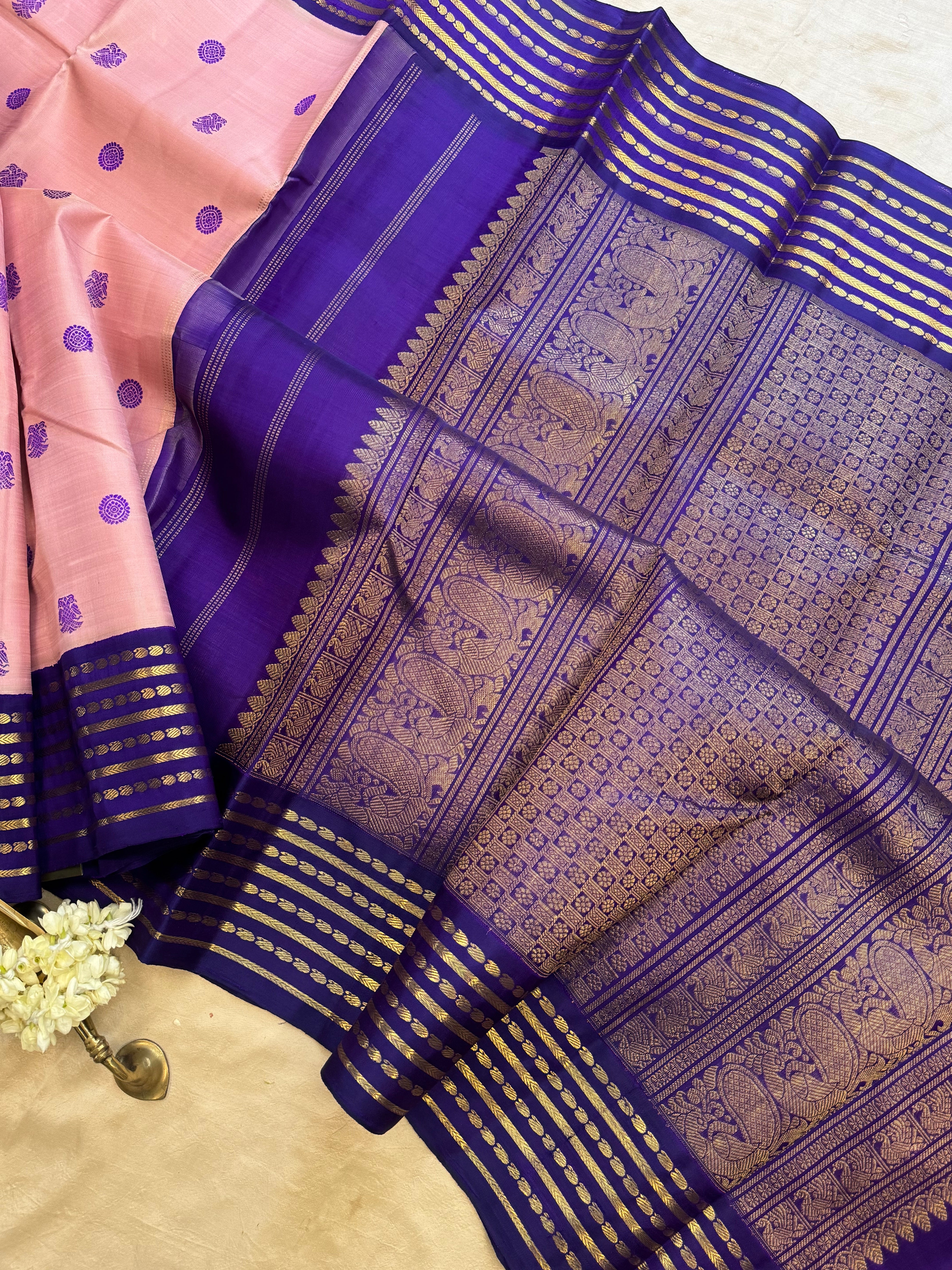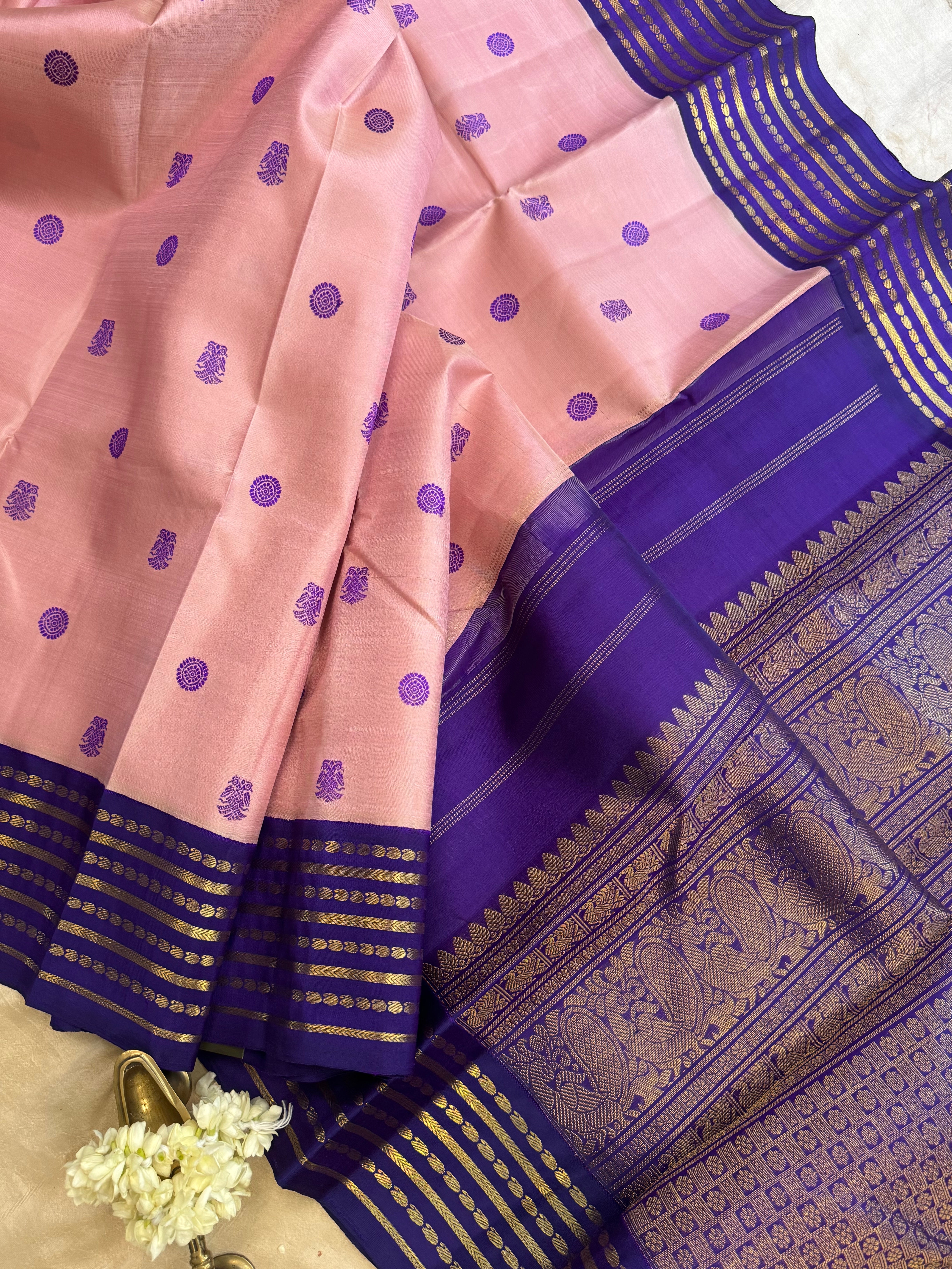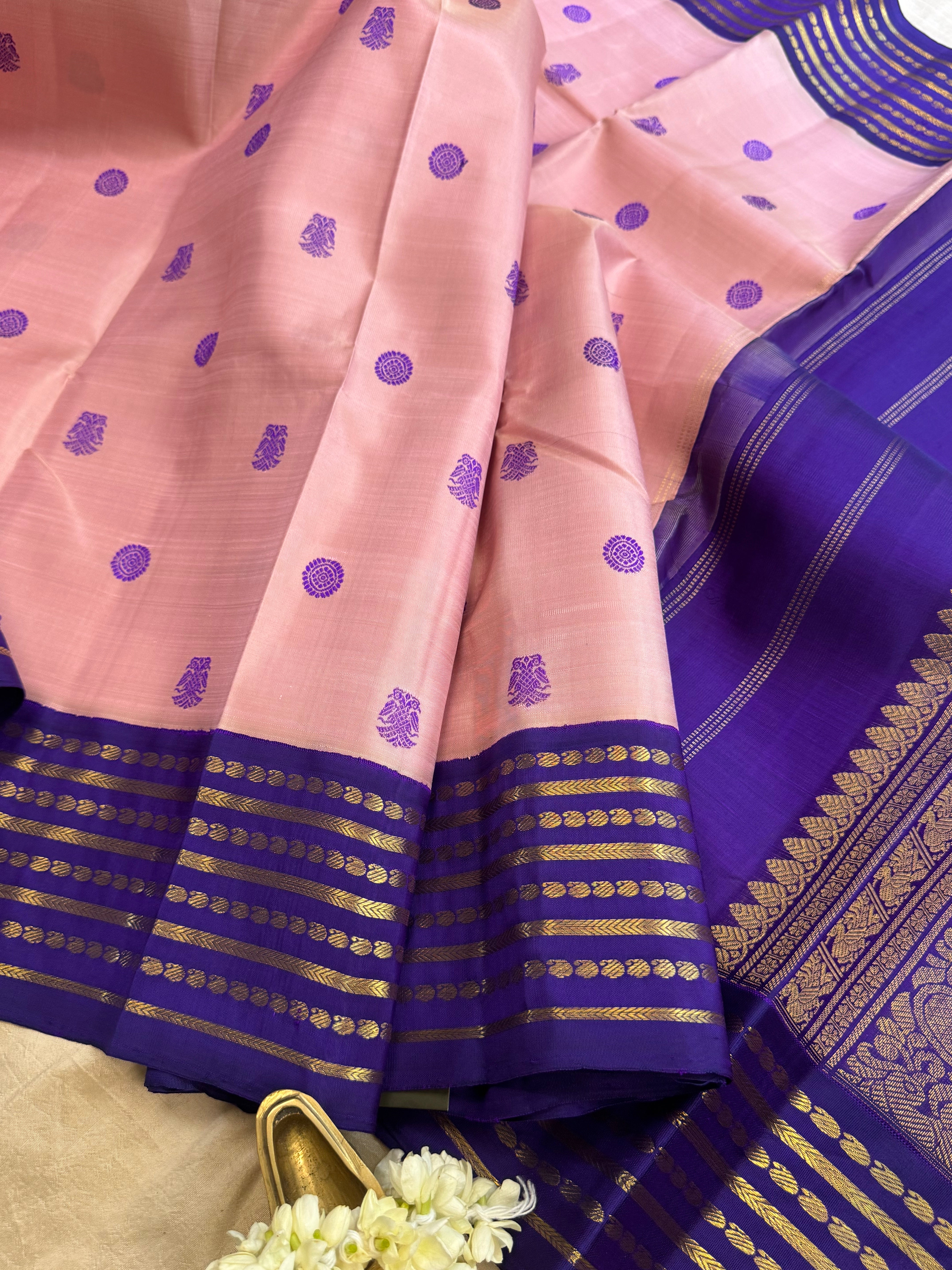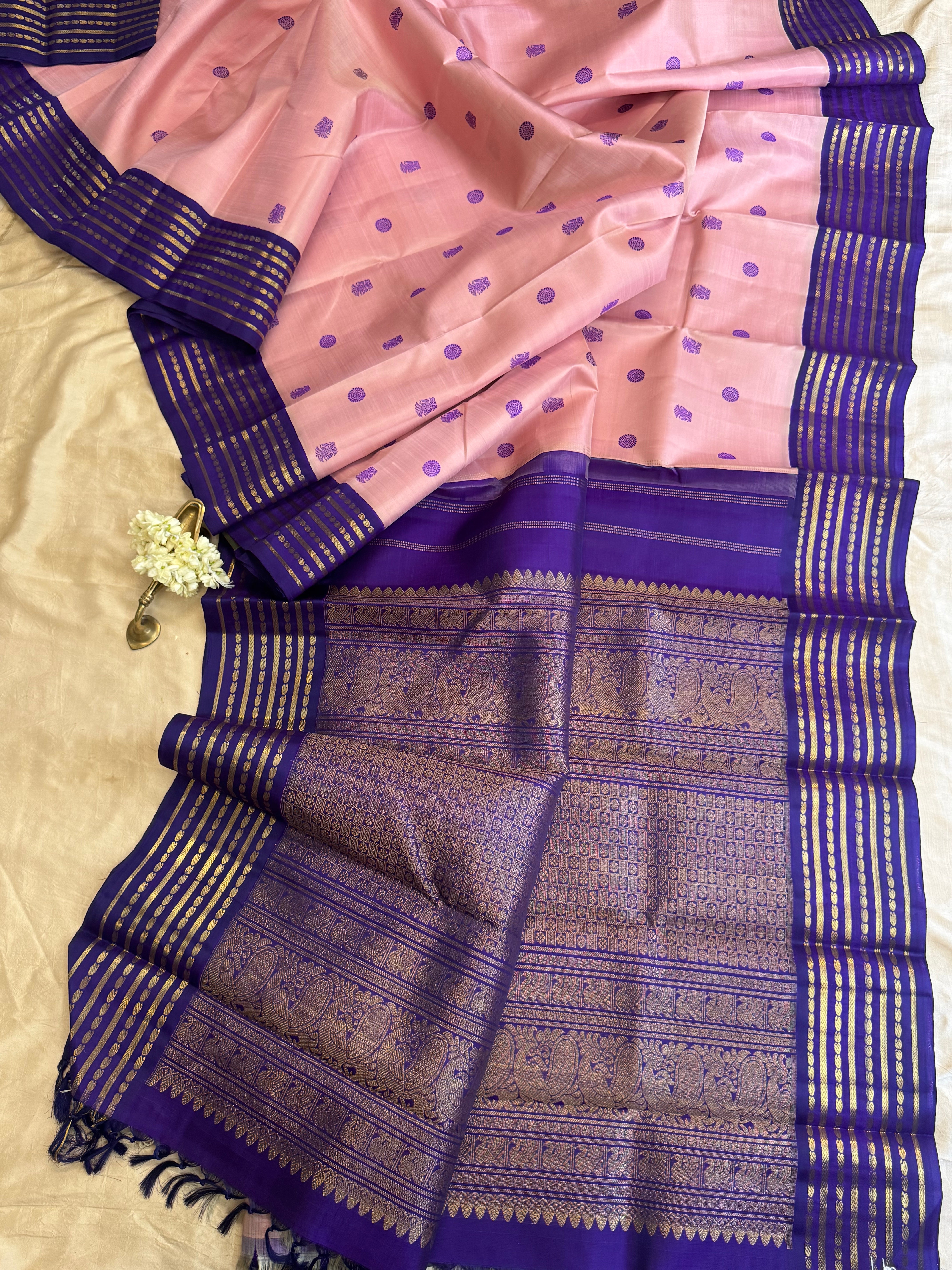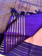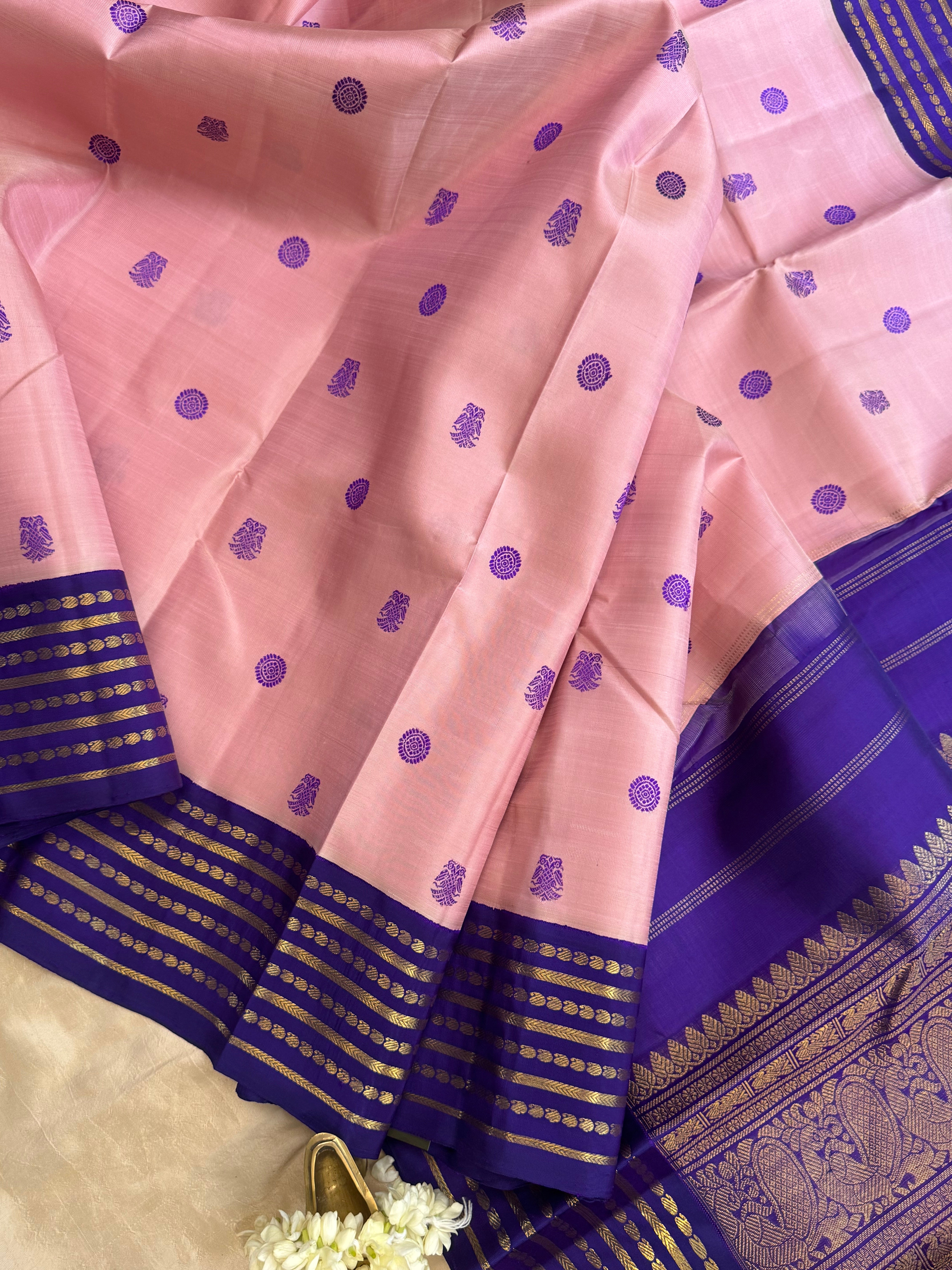 The body is light pink with thread Butta and the border is kai korvai in dark blue varisapet and the Palla is dense pure zari pala and blouse