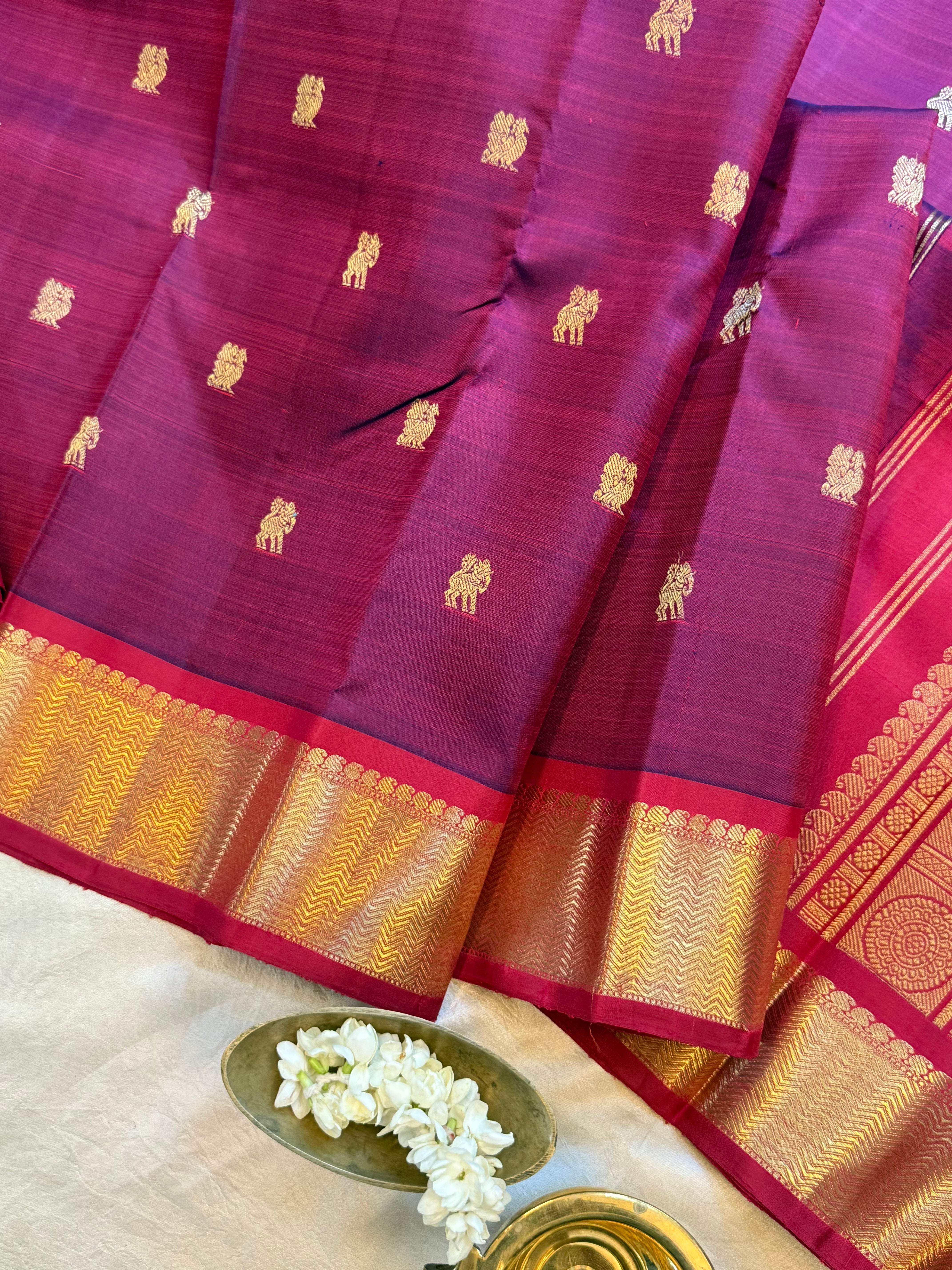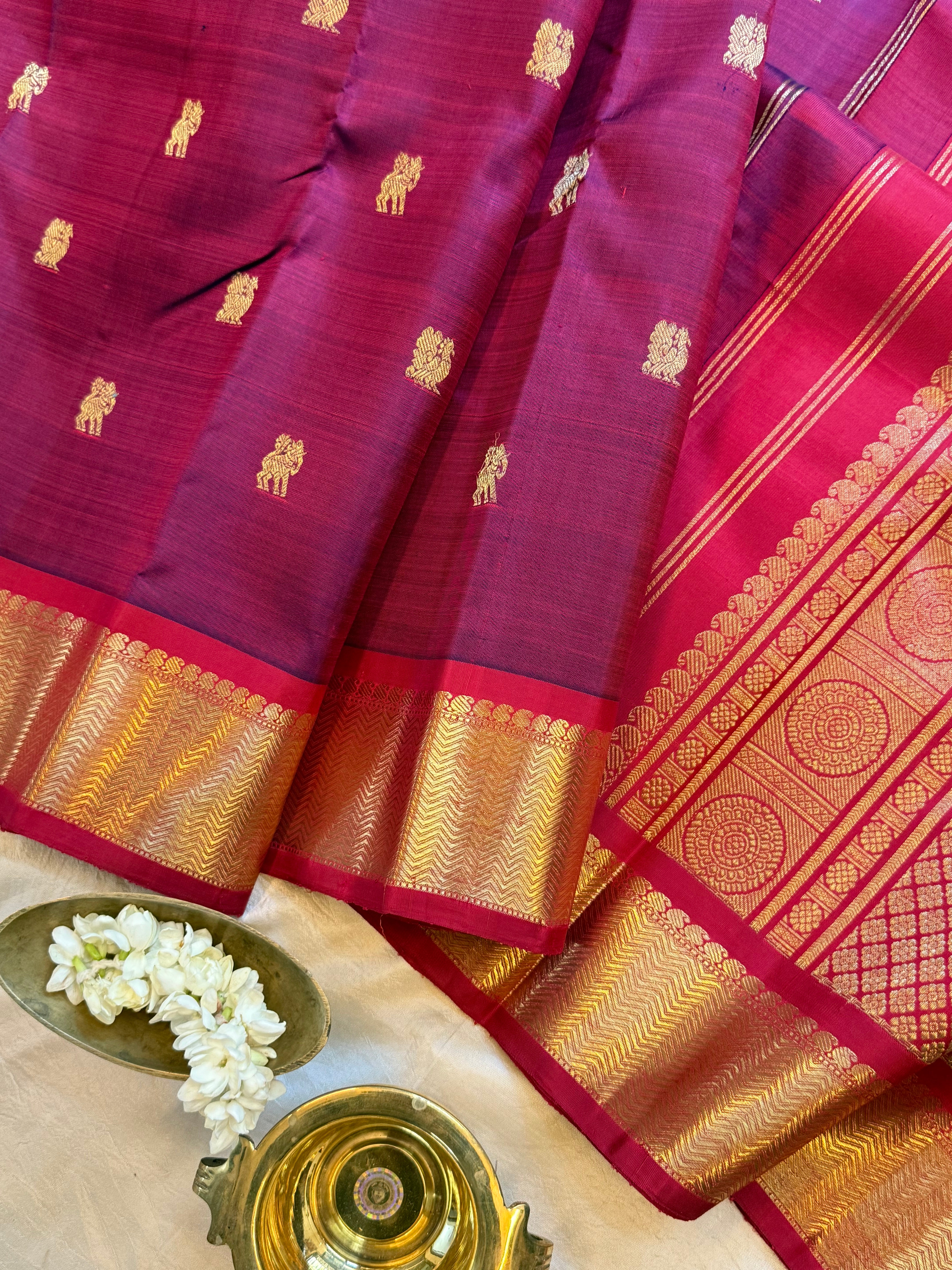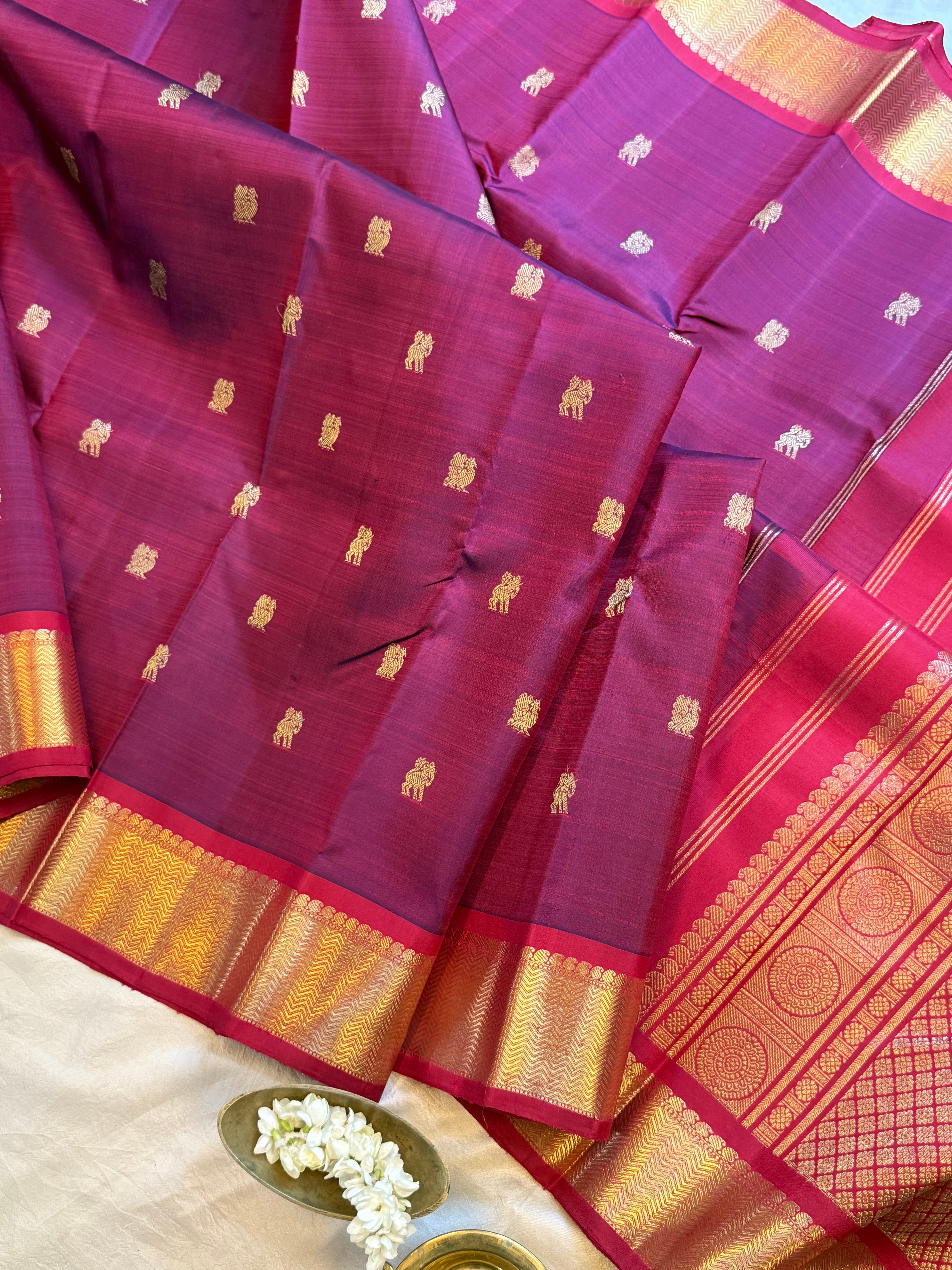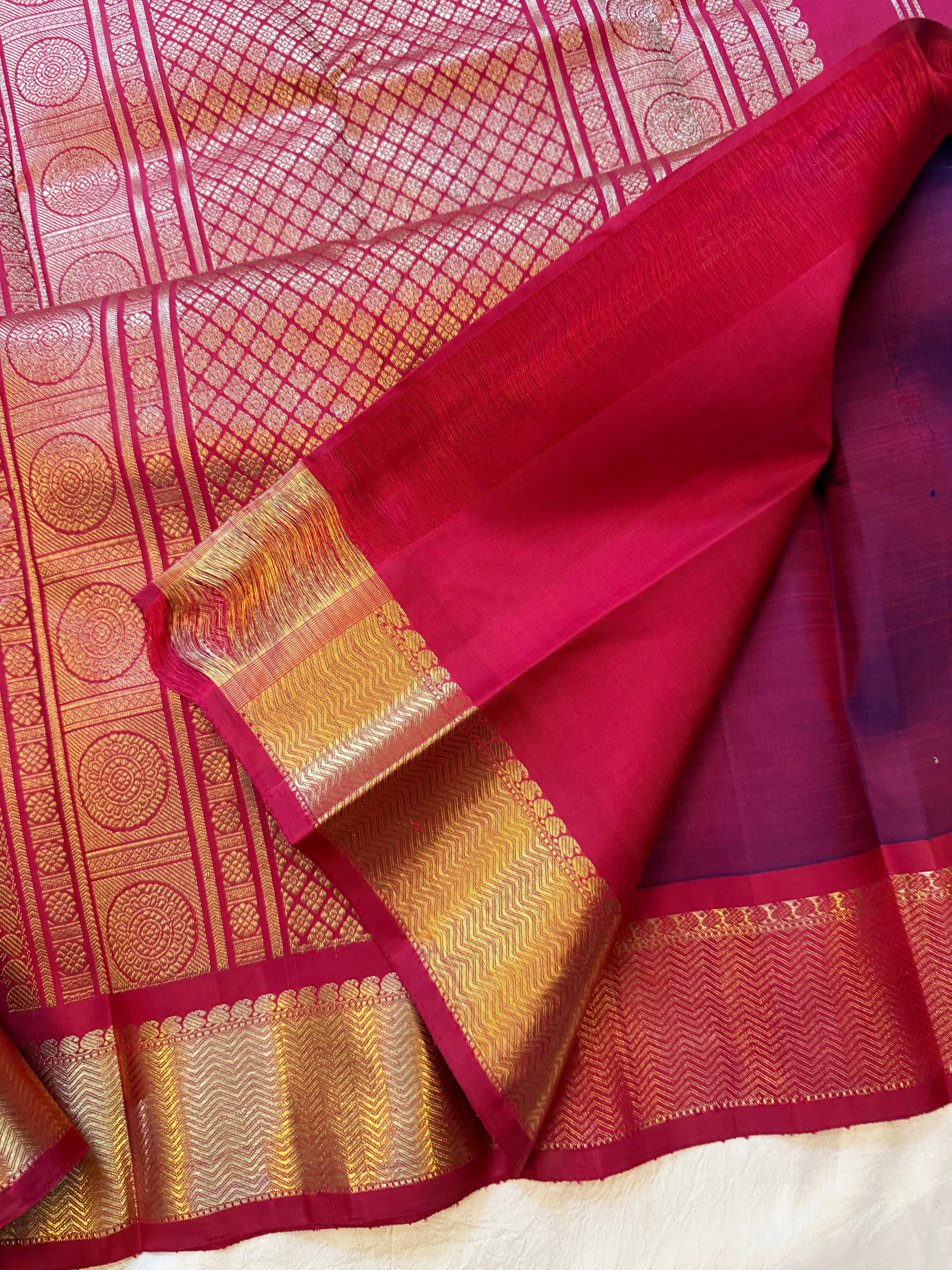 The body is shot of blue and red also called krishnamegam color with yazhli and annam Butta and the border has vangi pet in araku color and the Palla is dense pure Zari Palla and blouse