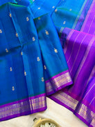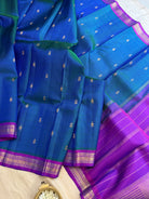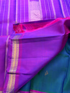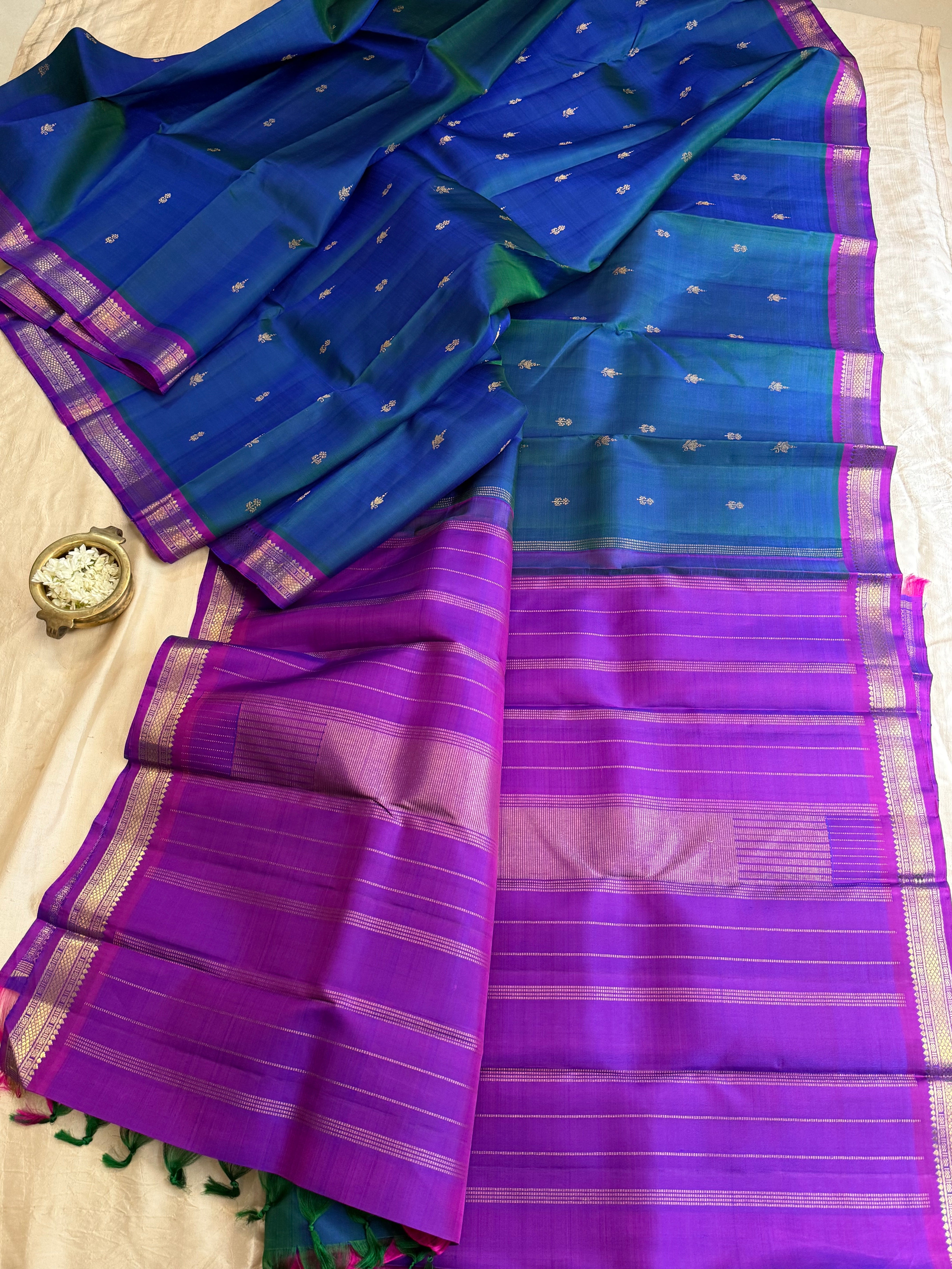 The body is mayilkazhuthu colour with thamarai thilagam Butta and the border is pink shot Kuil kann pet and simple rekku Palla in pure Zari and blouse