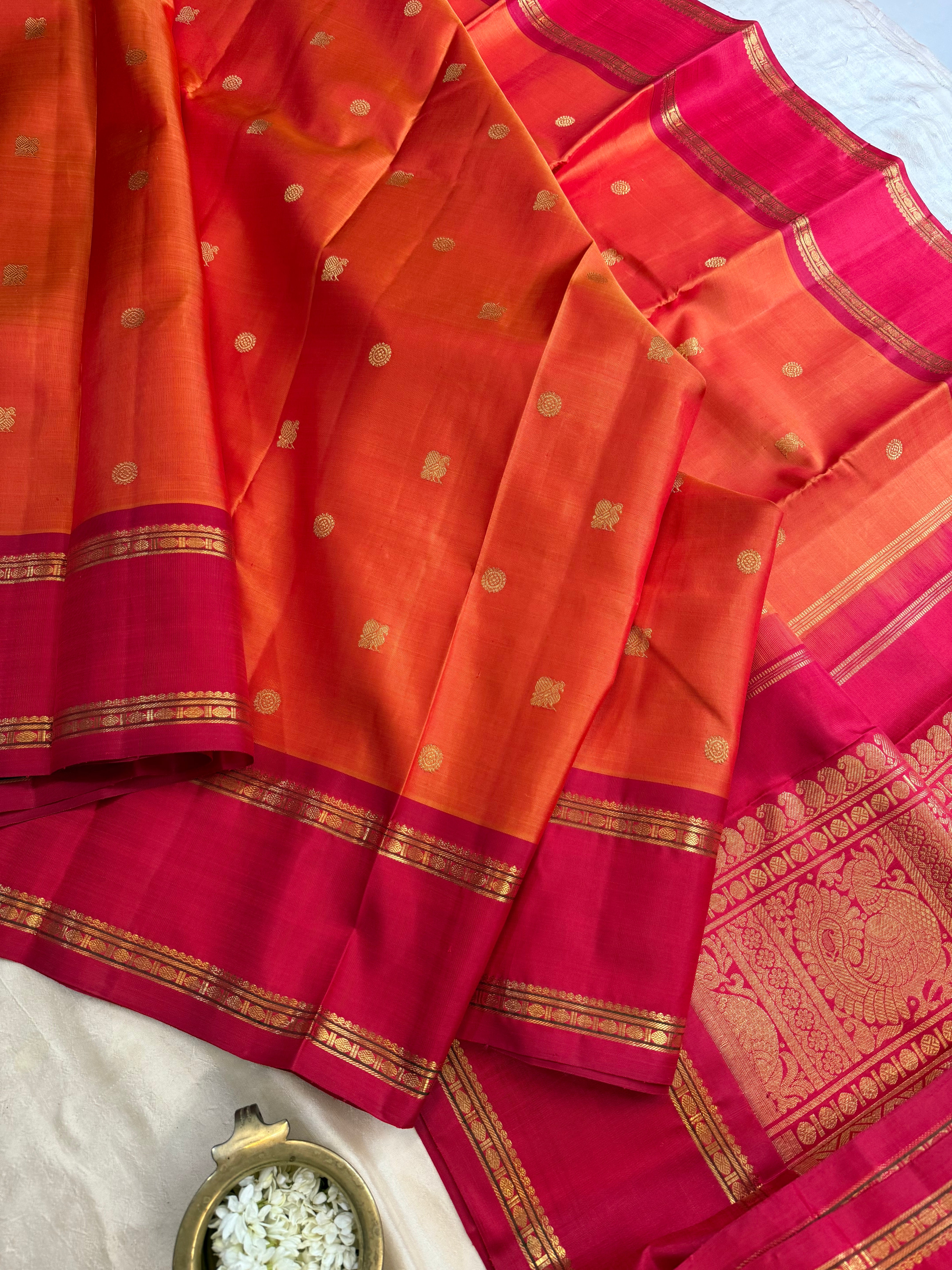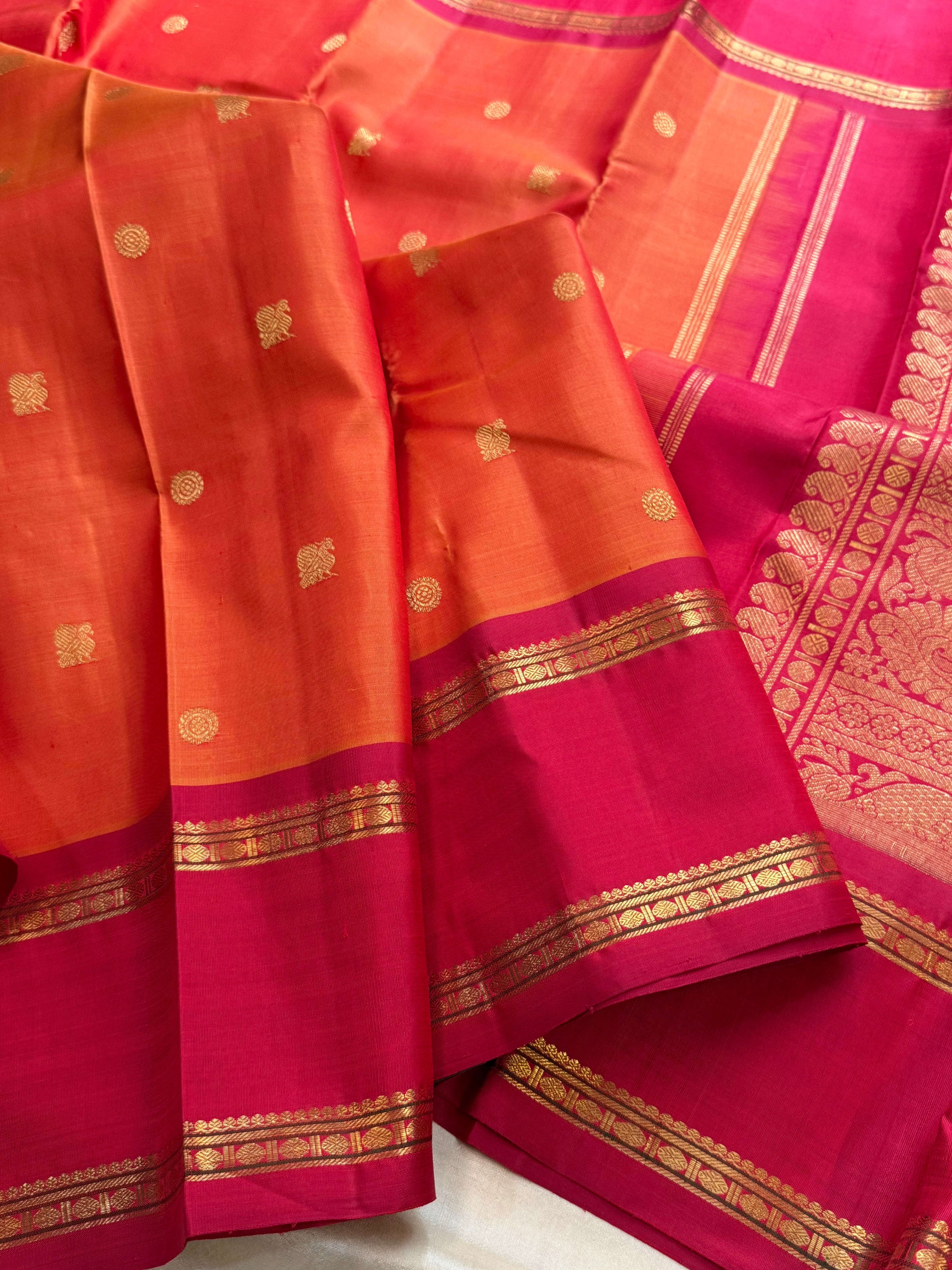 The body is rust with annam Chakram Butta and araku retta pet border and dense pure Zari Palla and blouse