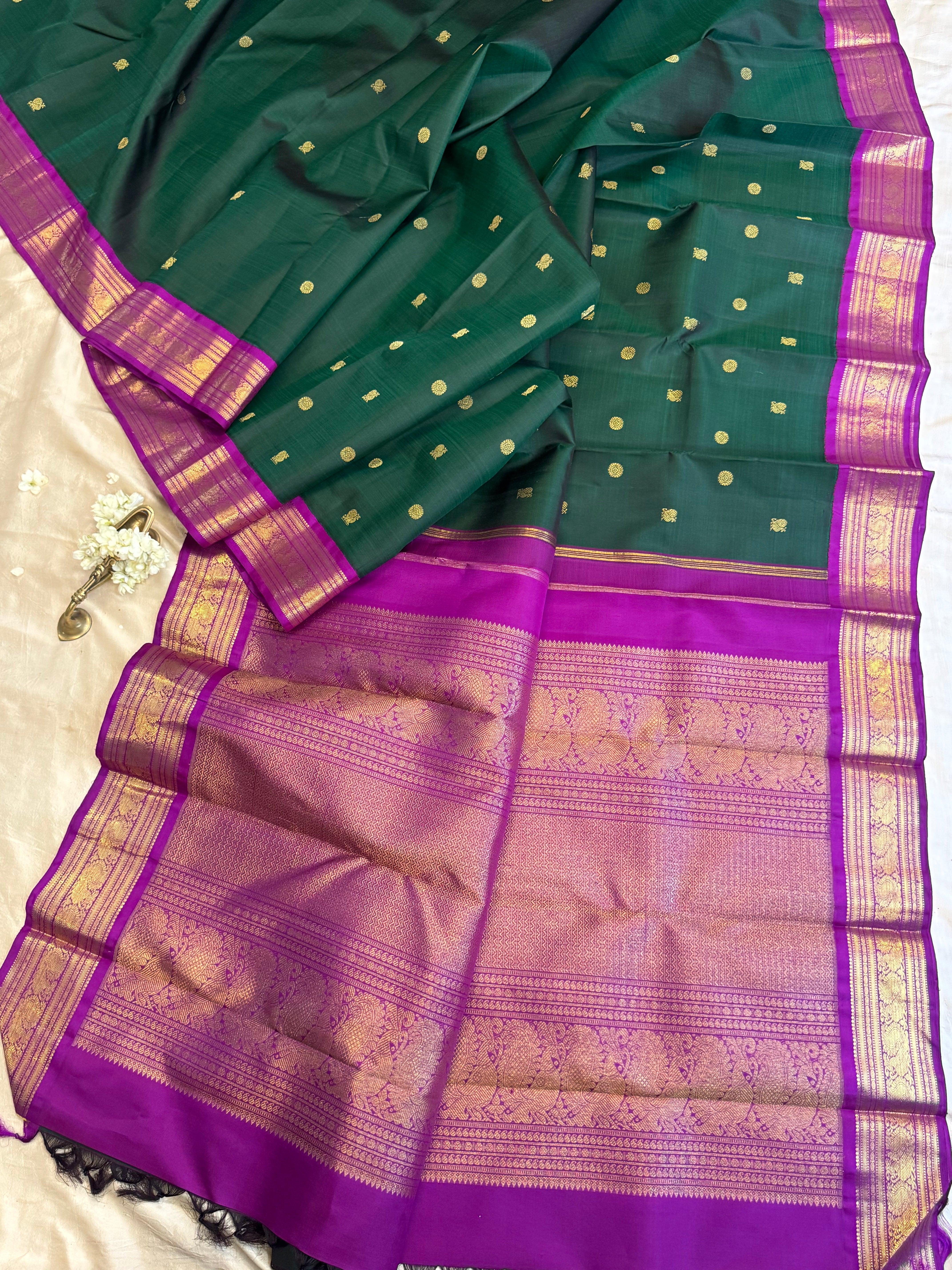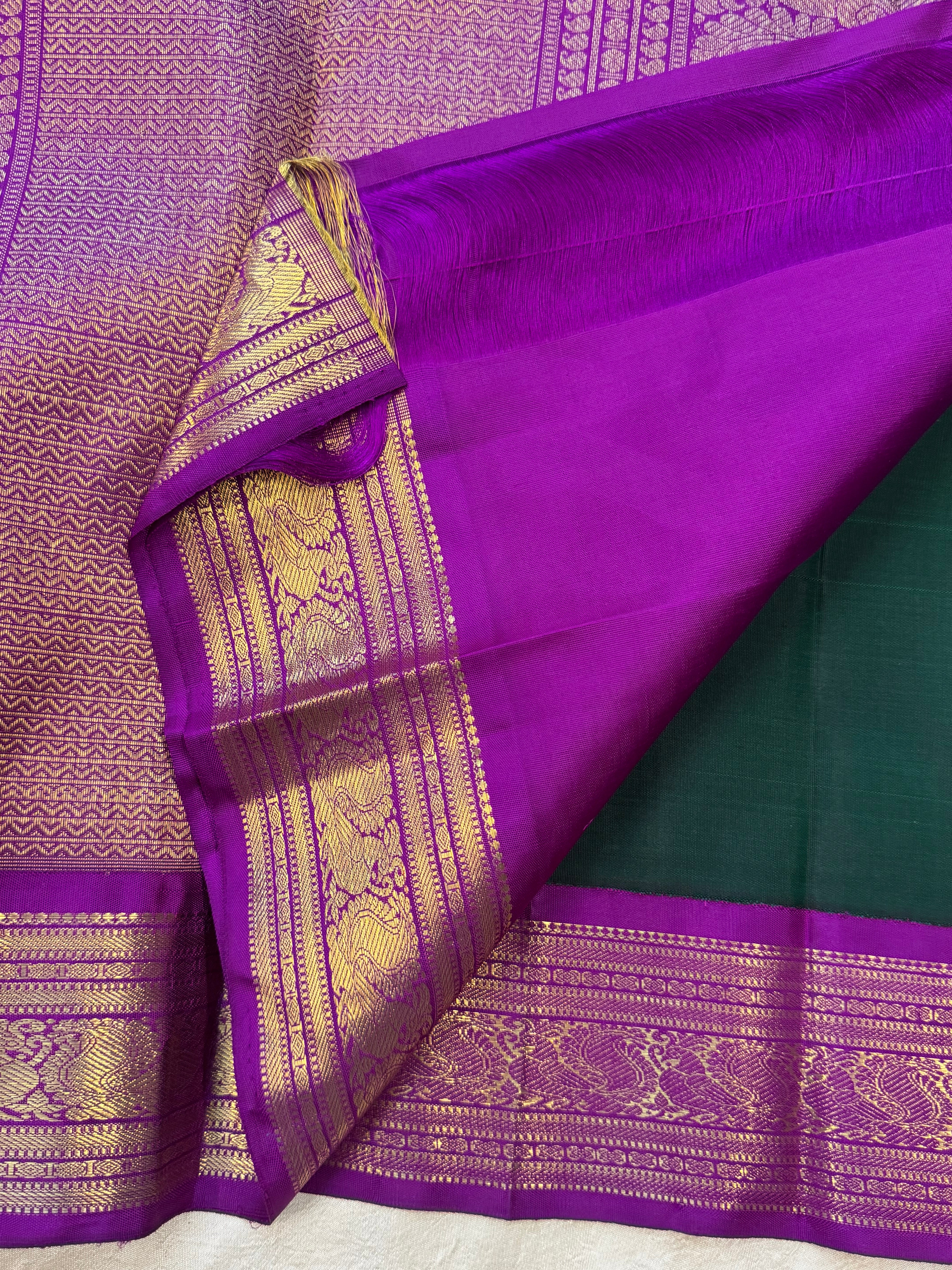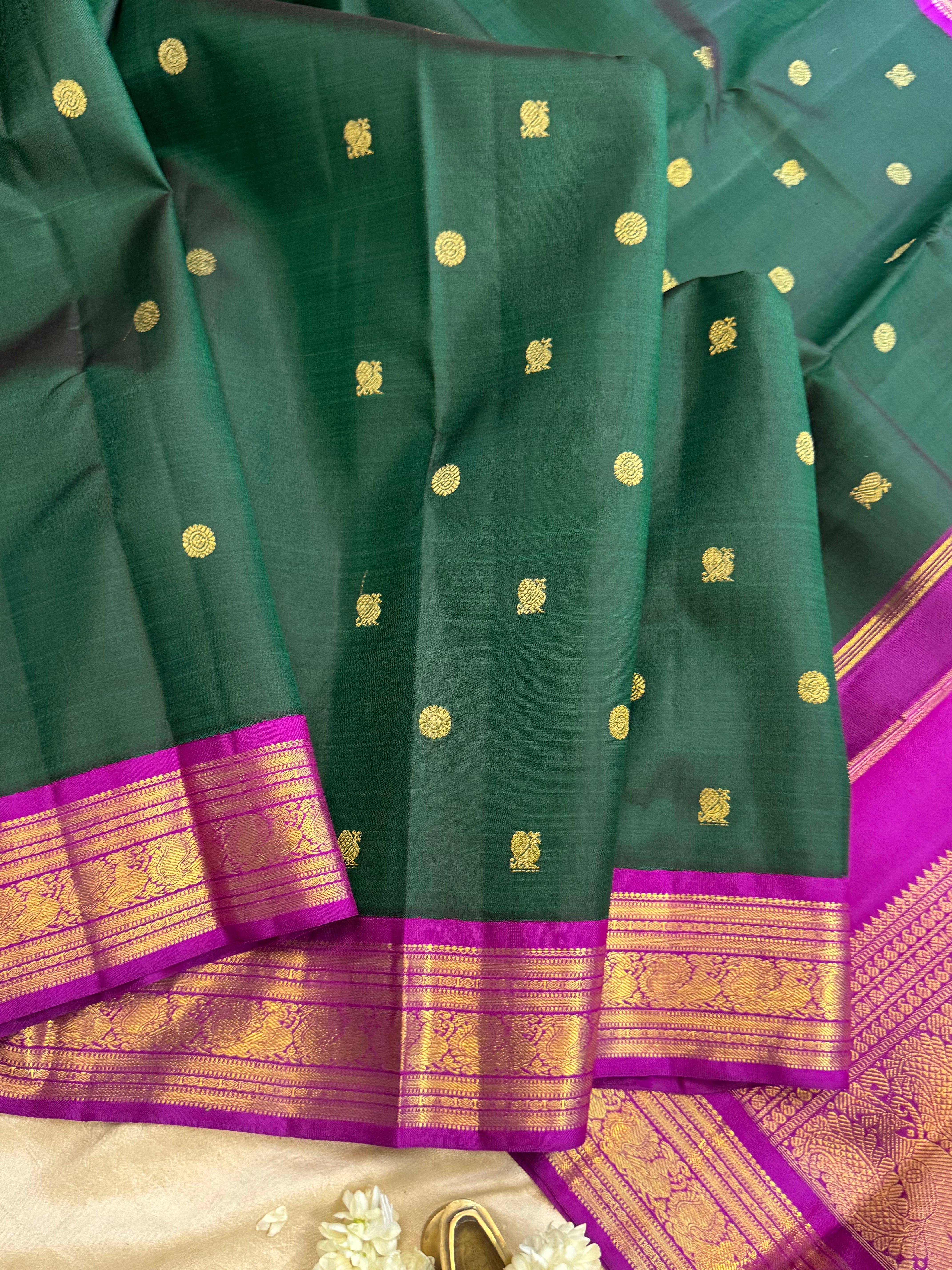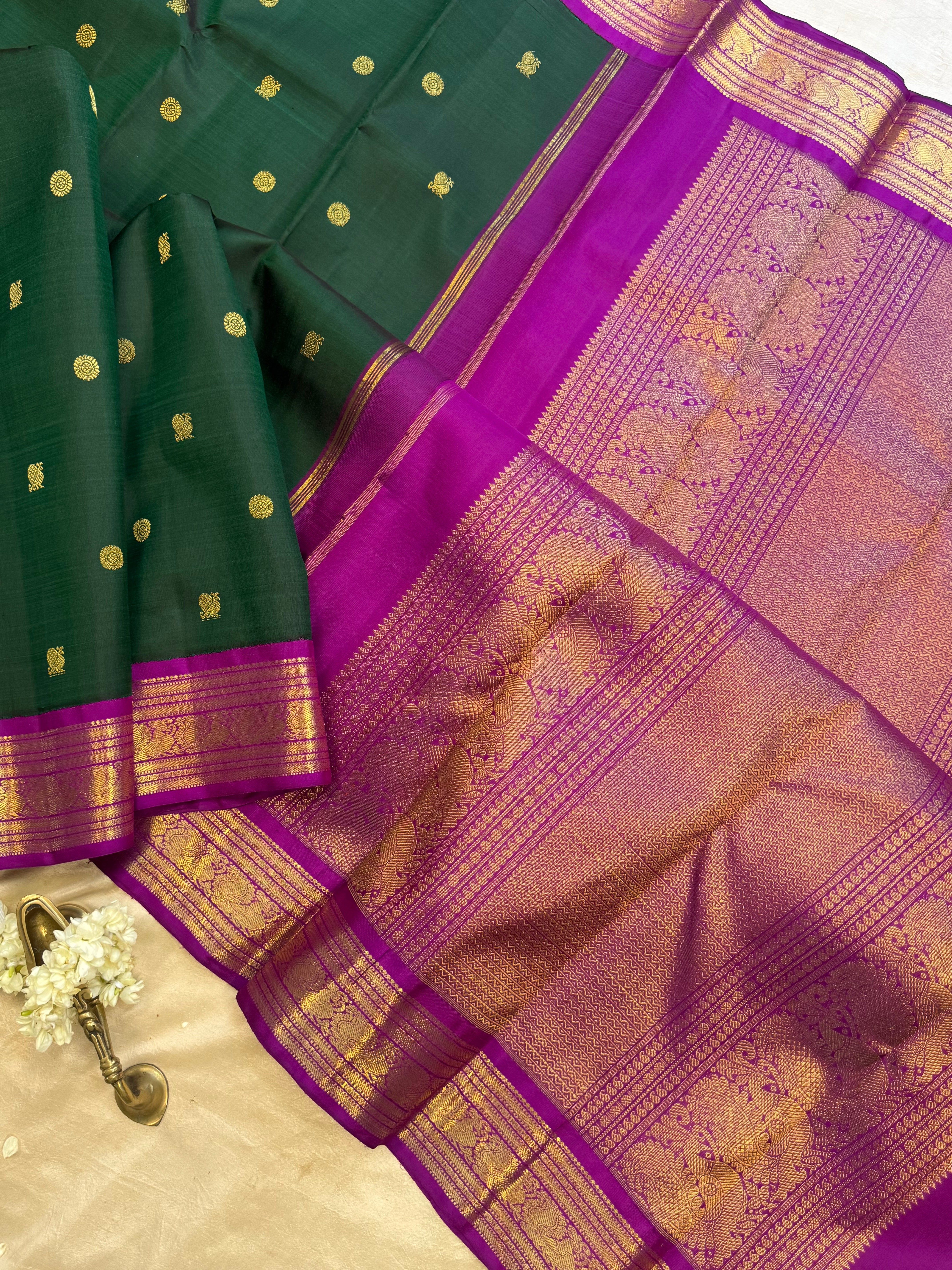 The body is dark bottle green with annam chakram Butta and the border is deep purple annam pet and dense pure zari Palla and blouse