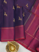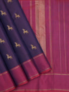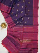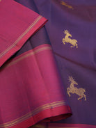The body is purplish blue with maan Butta and the border is deep pink and Zari rekku Palla and blouse