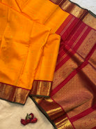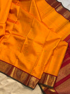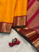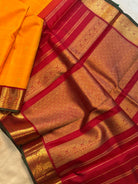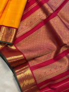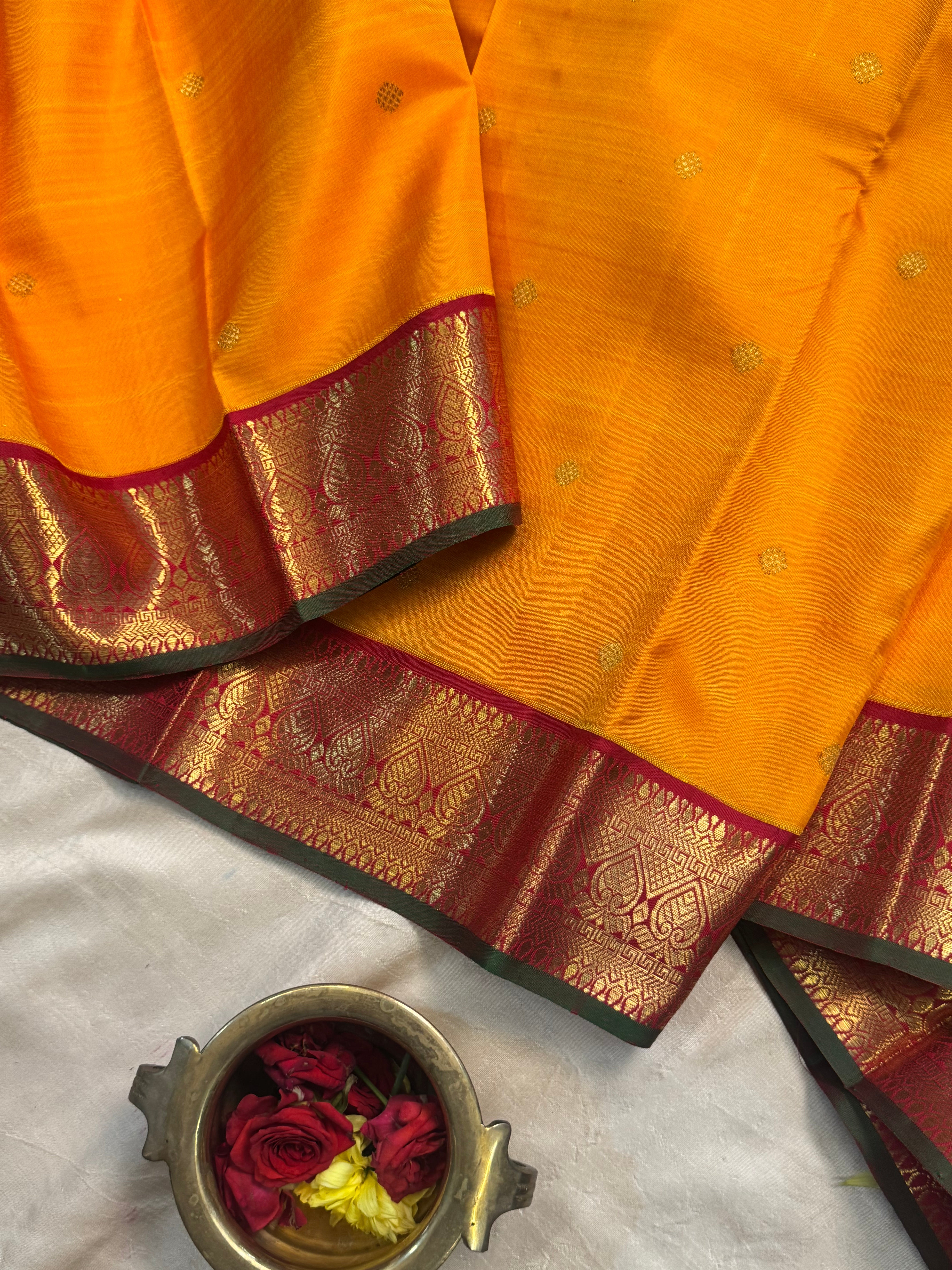 The body is mango yellow color with small Kamalam Butta and the border is deep red with jadanagam pet and green selvedge and a dense pure zari Palla and blouse