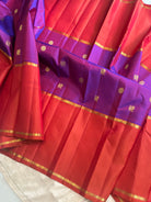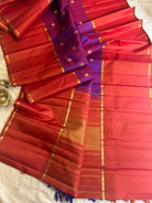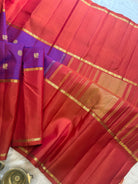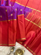 The body is purple with rust retta pet Long border and Zari rekku Palla and blouse
