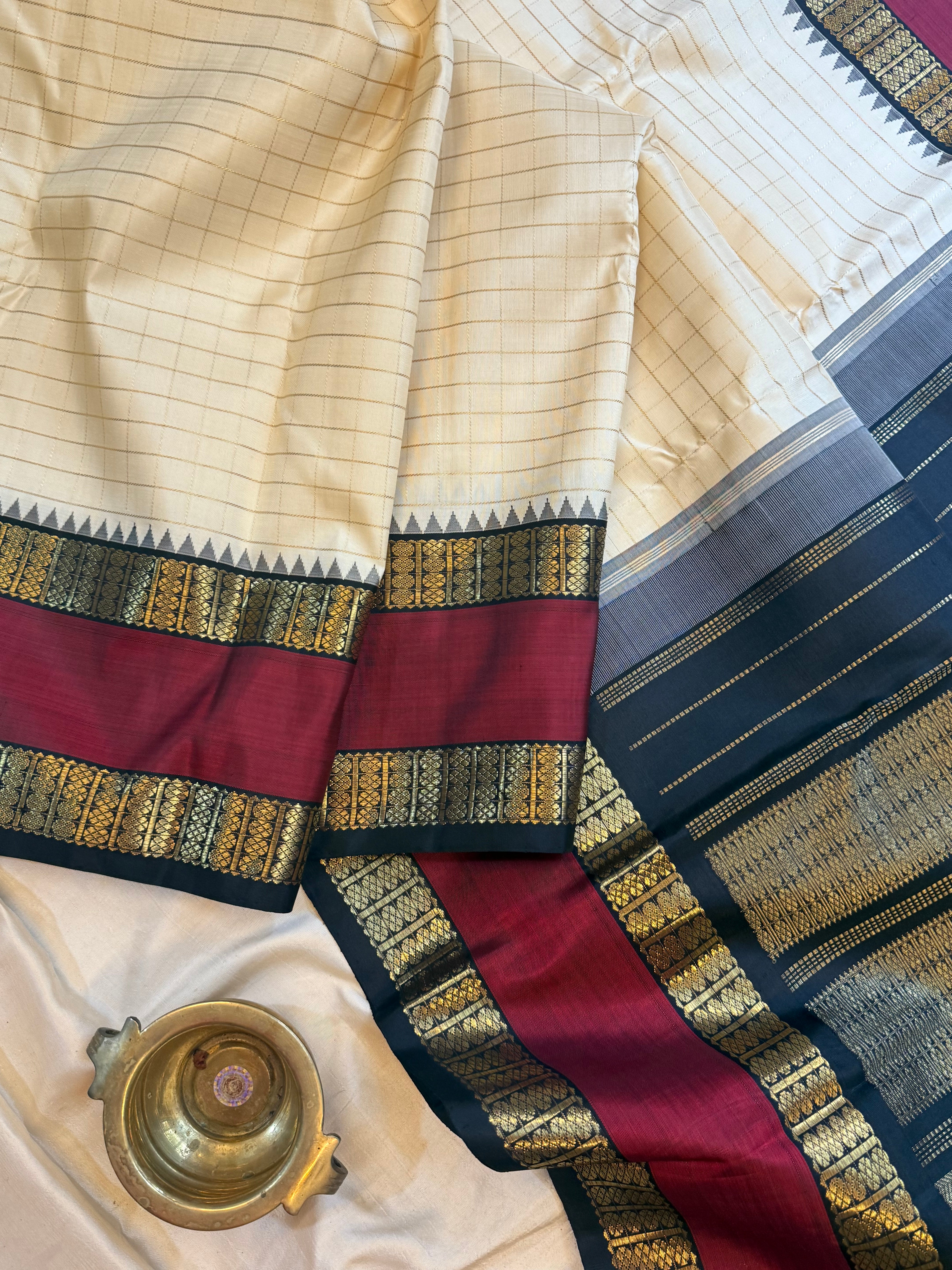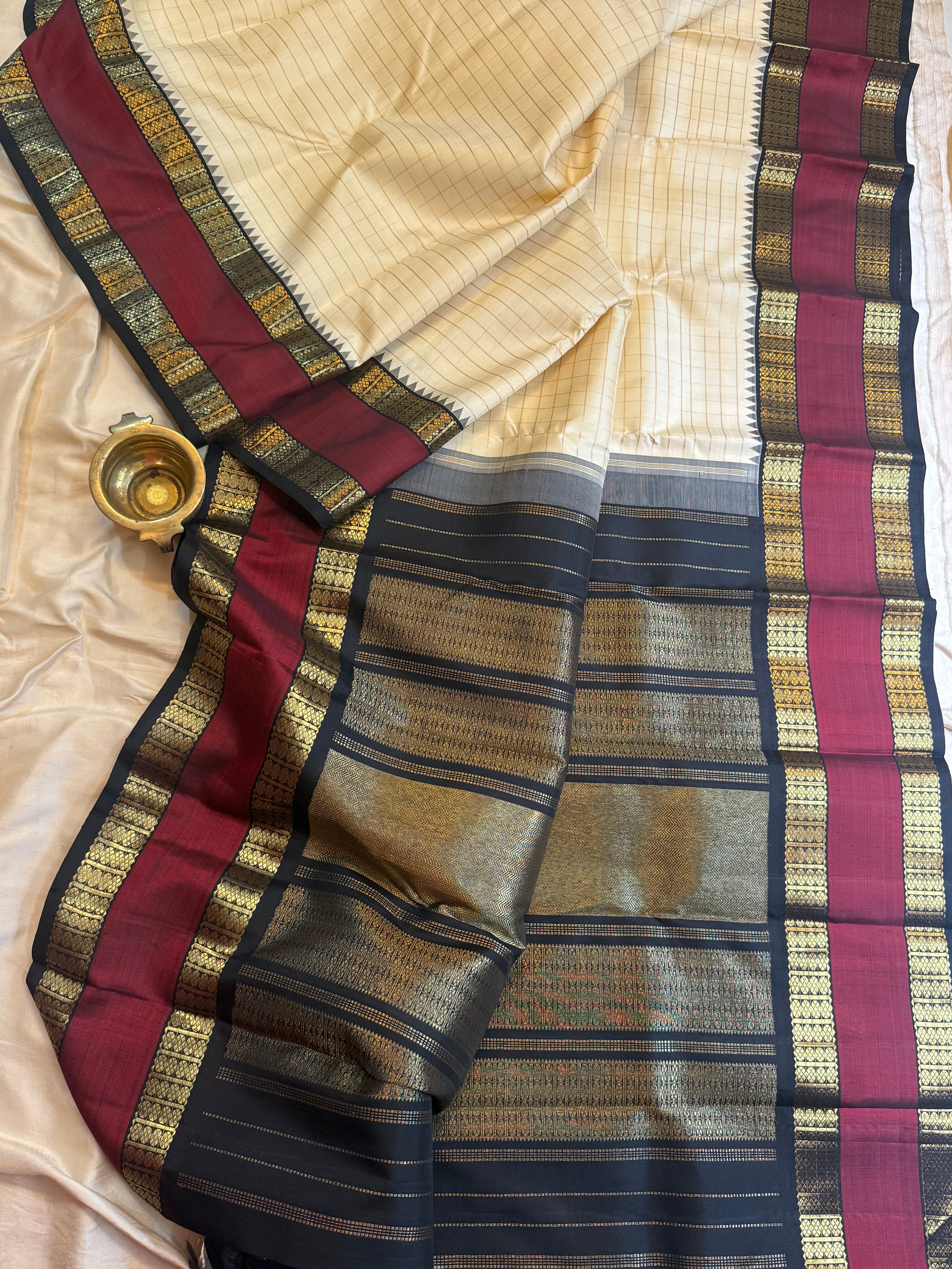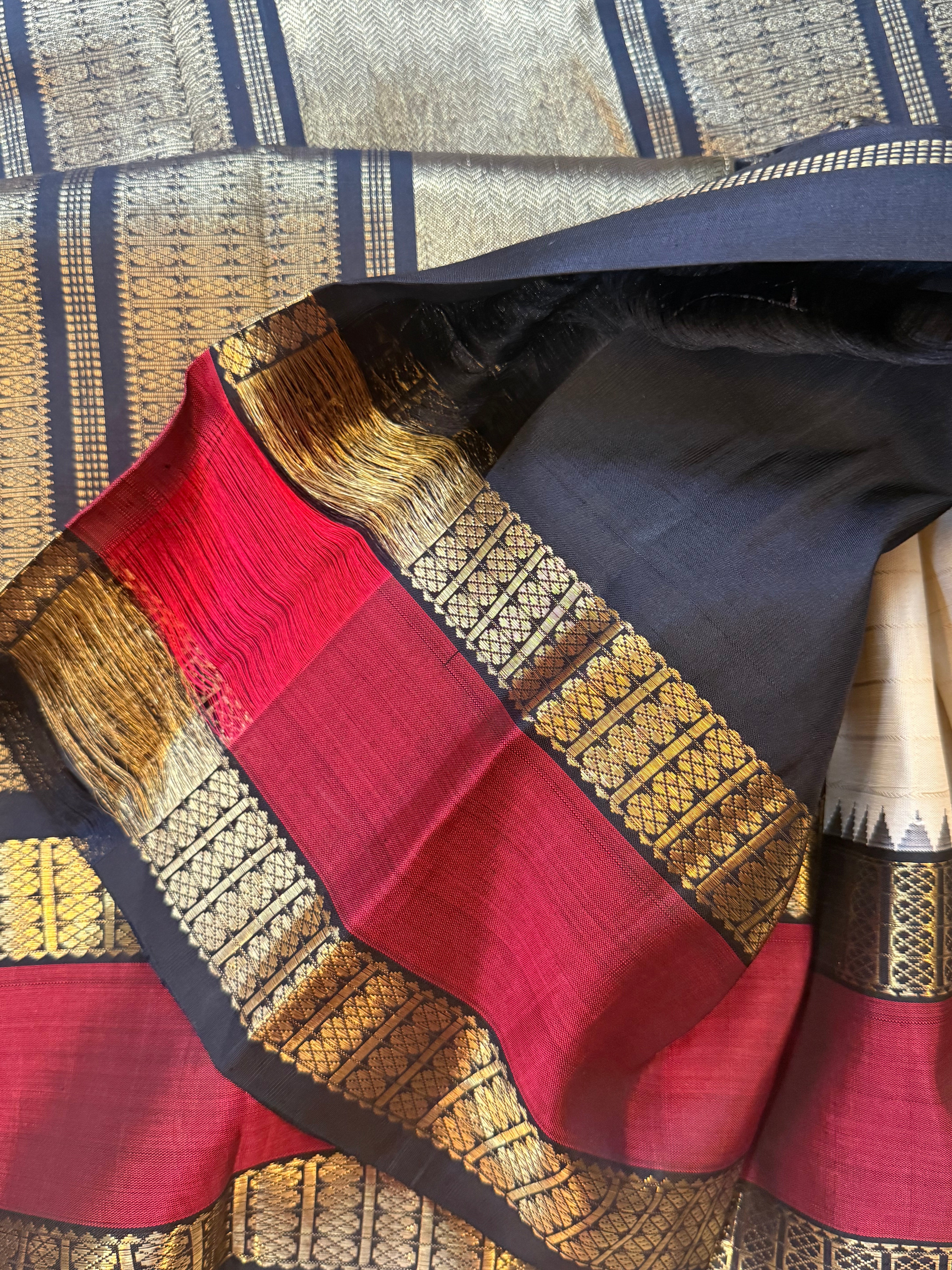 The body is off white with Benars Zari Kattam with black retta Rudraksh pet Kai Korvai with centre araku with dense pure Zari Palla and blouse