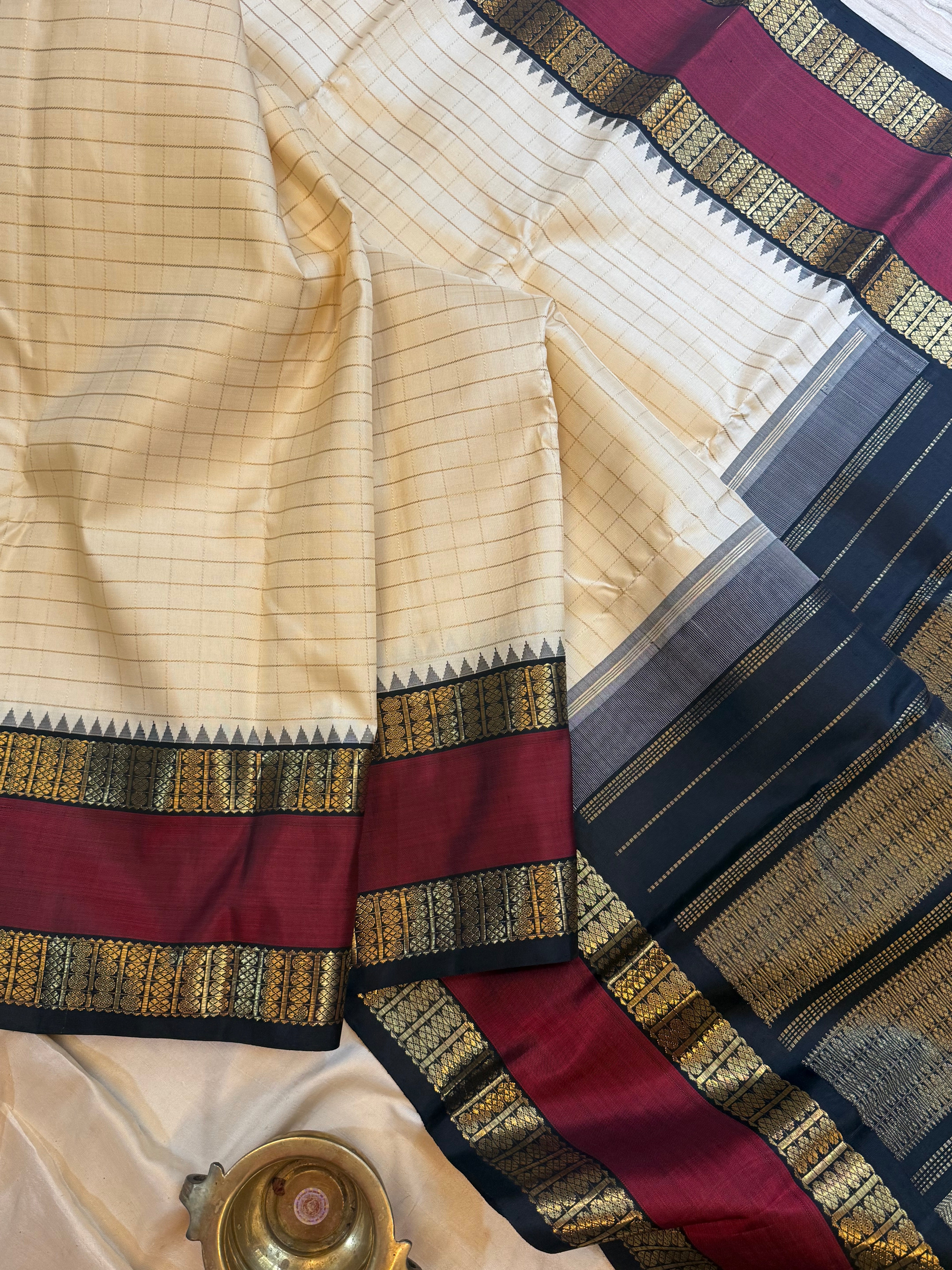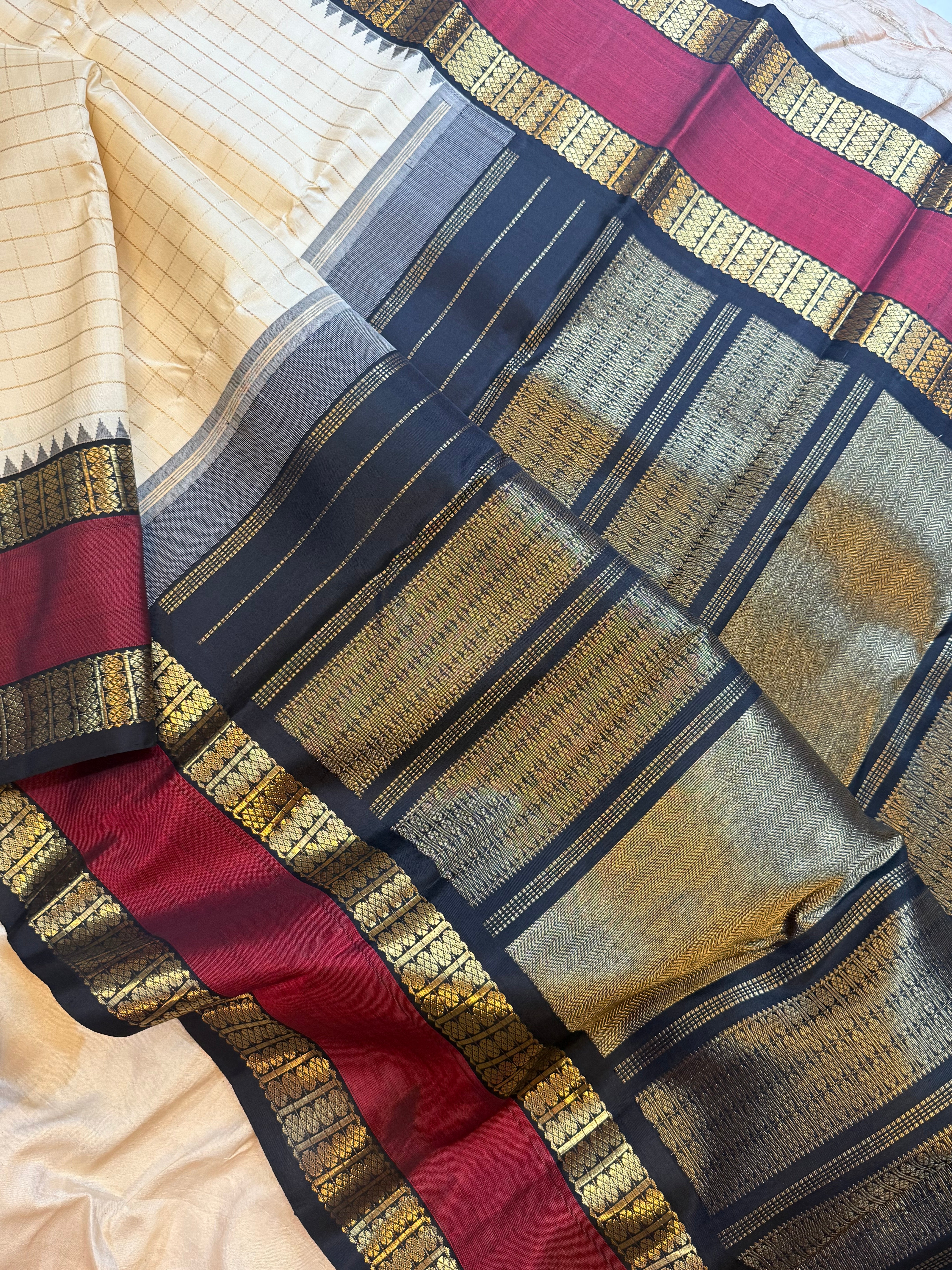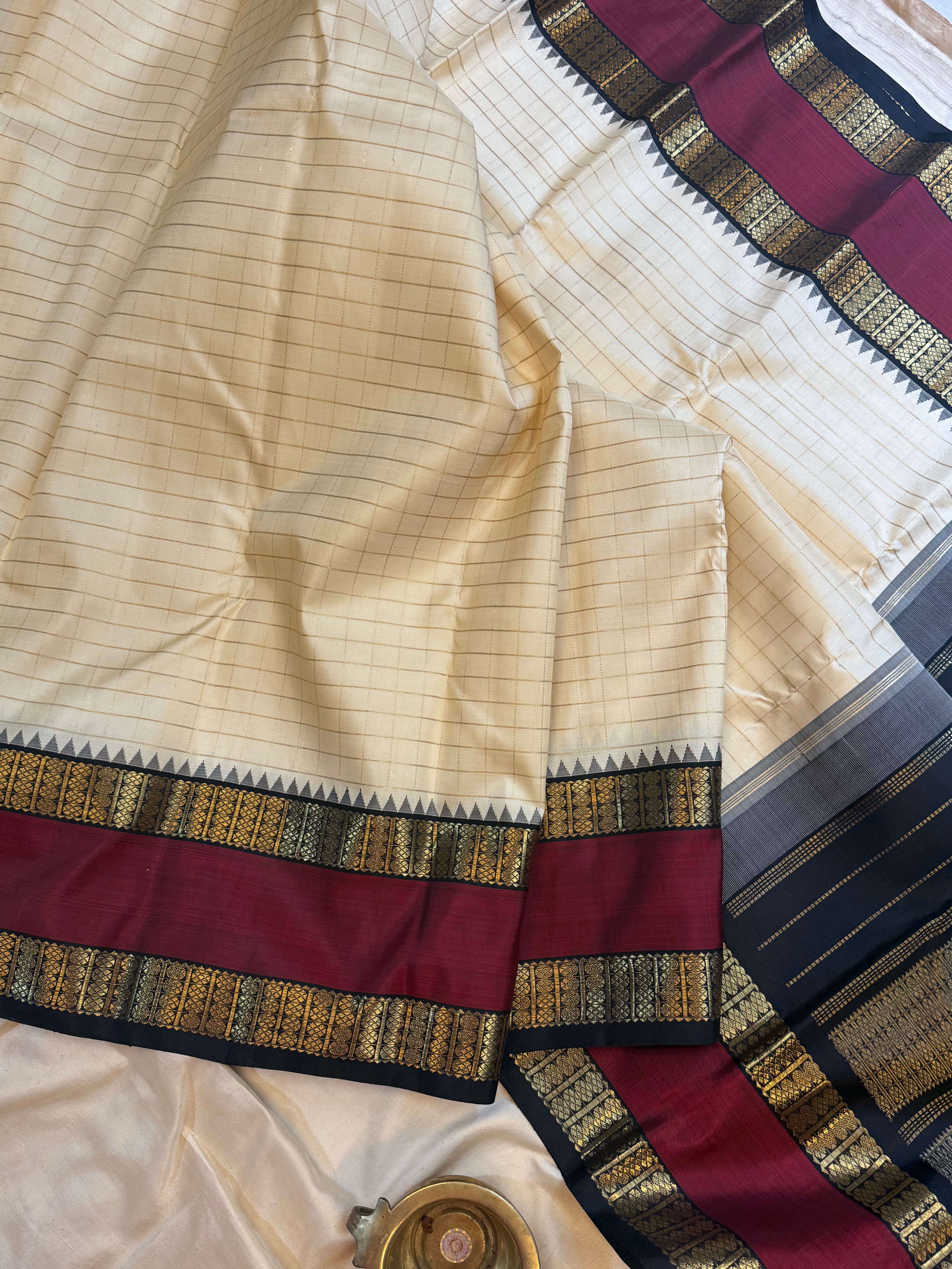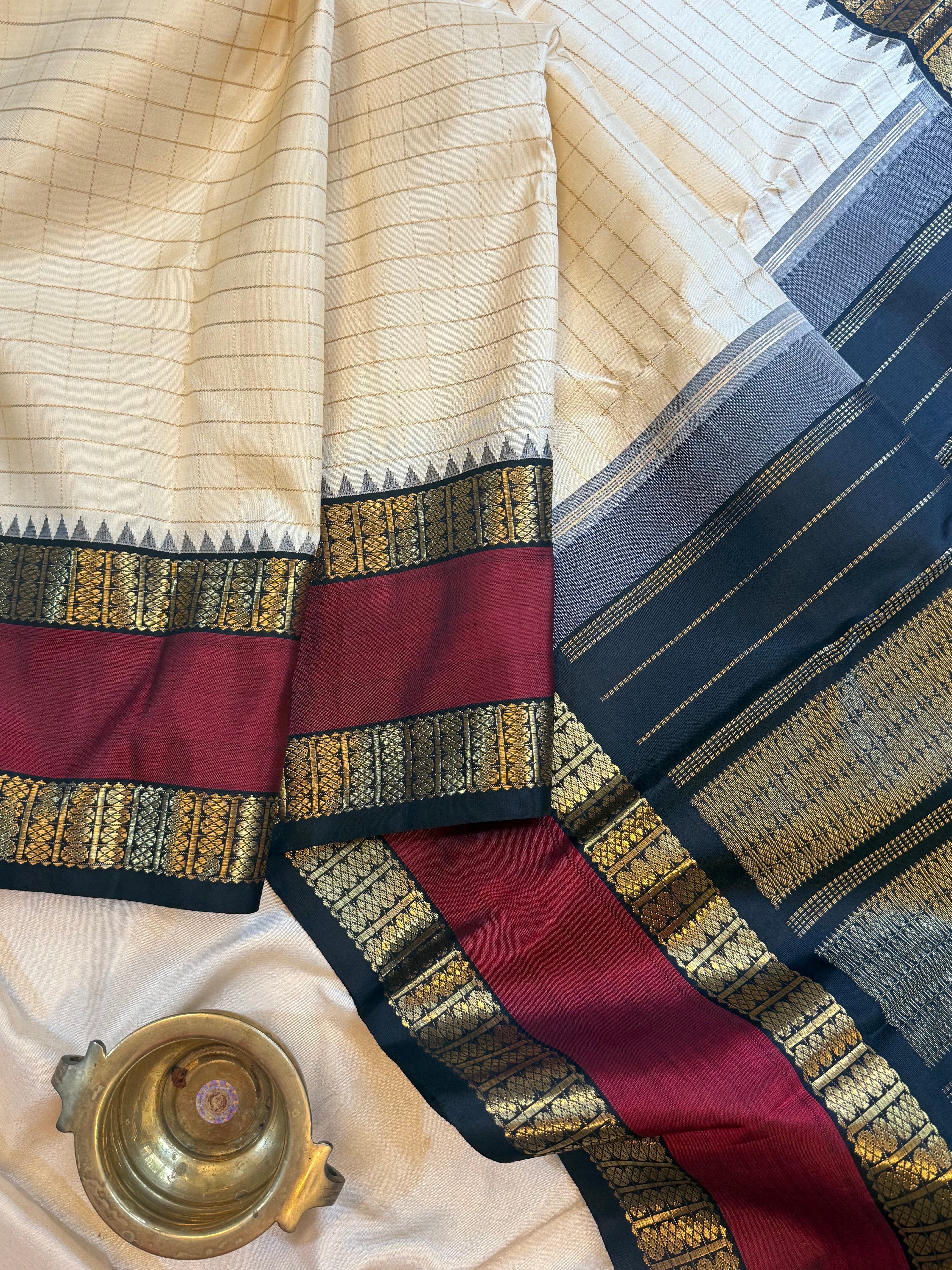 The body is off white with Benars Zari Kattam with black retta Rudraksh pet Kai Korvai with centre araku with dense pure Zari Palla and blouse