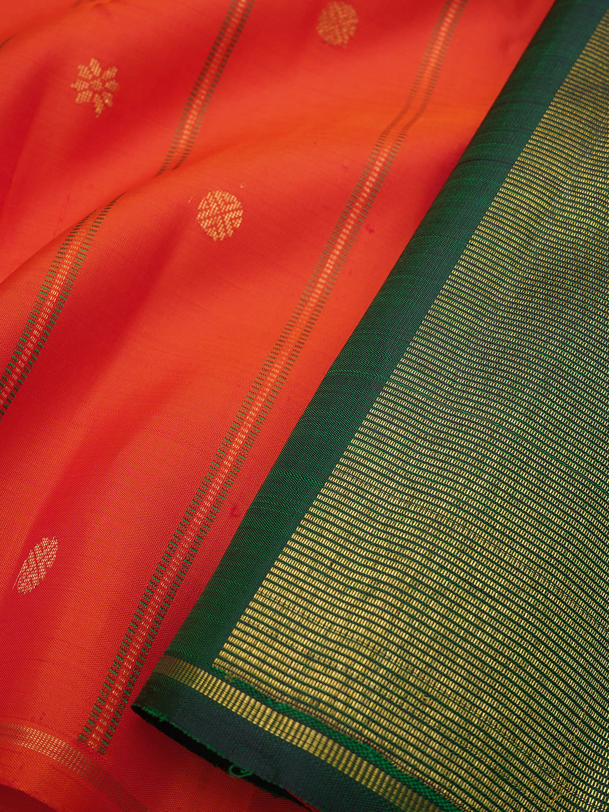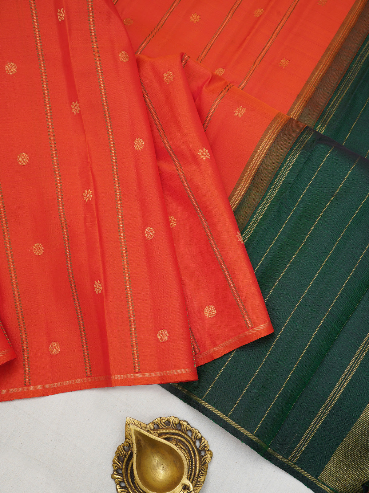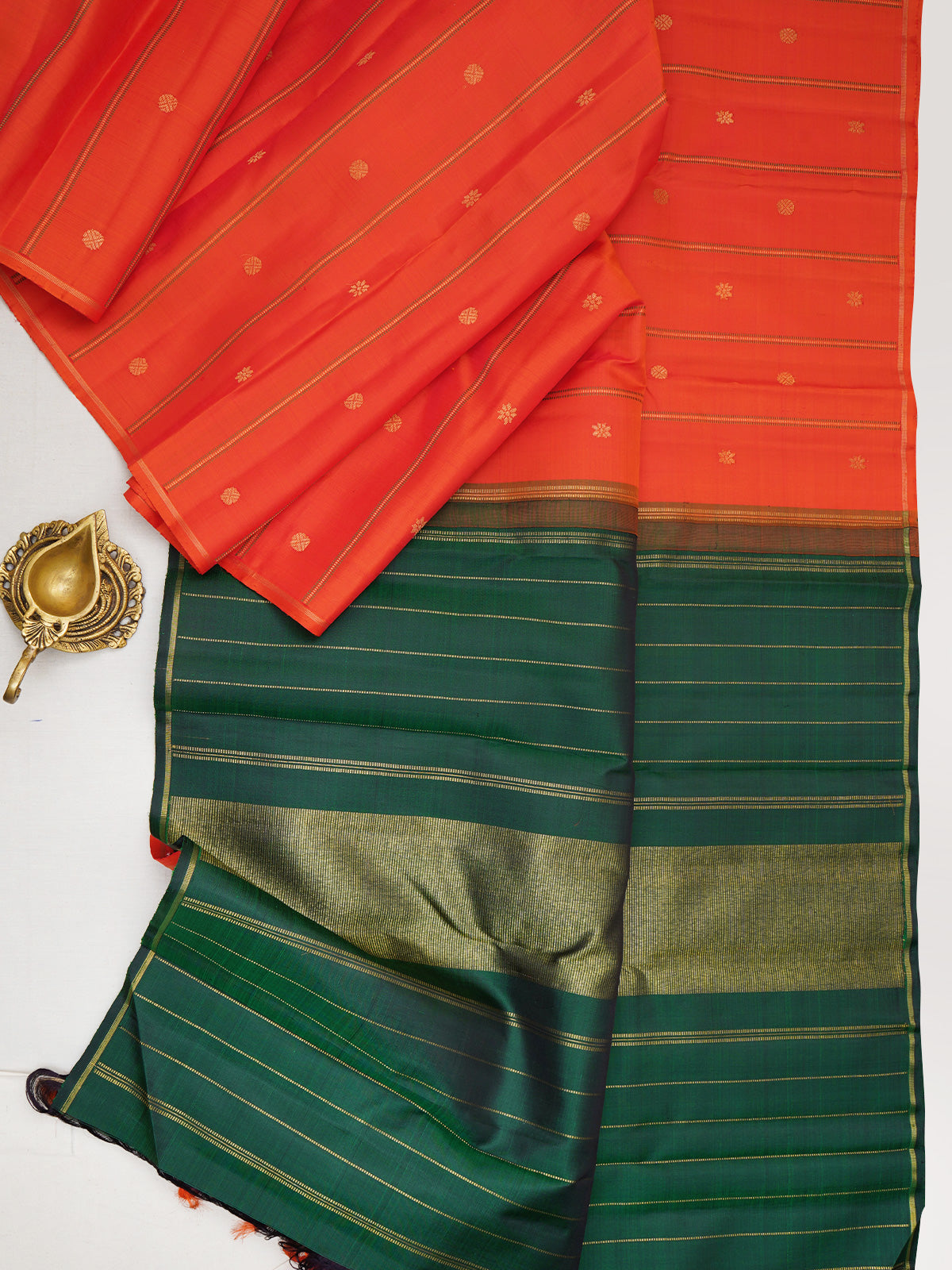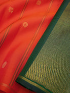 The body is orange with Kamalam woven body with seer pet and green Zari rekku Palla and blouse