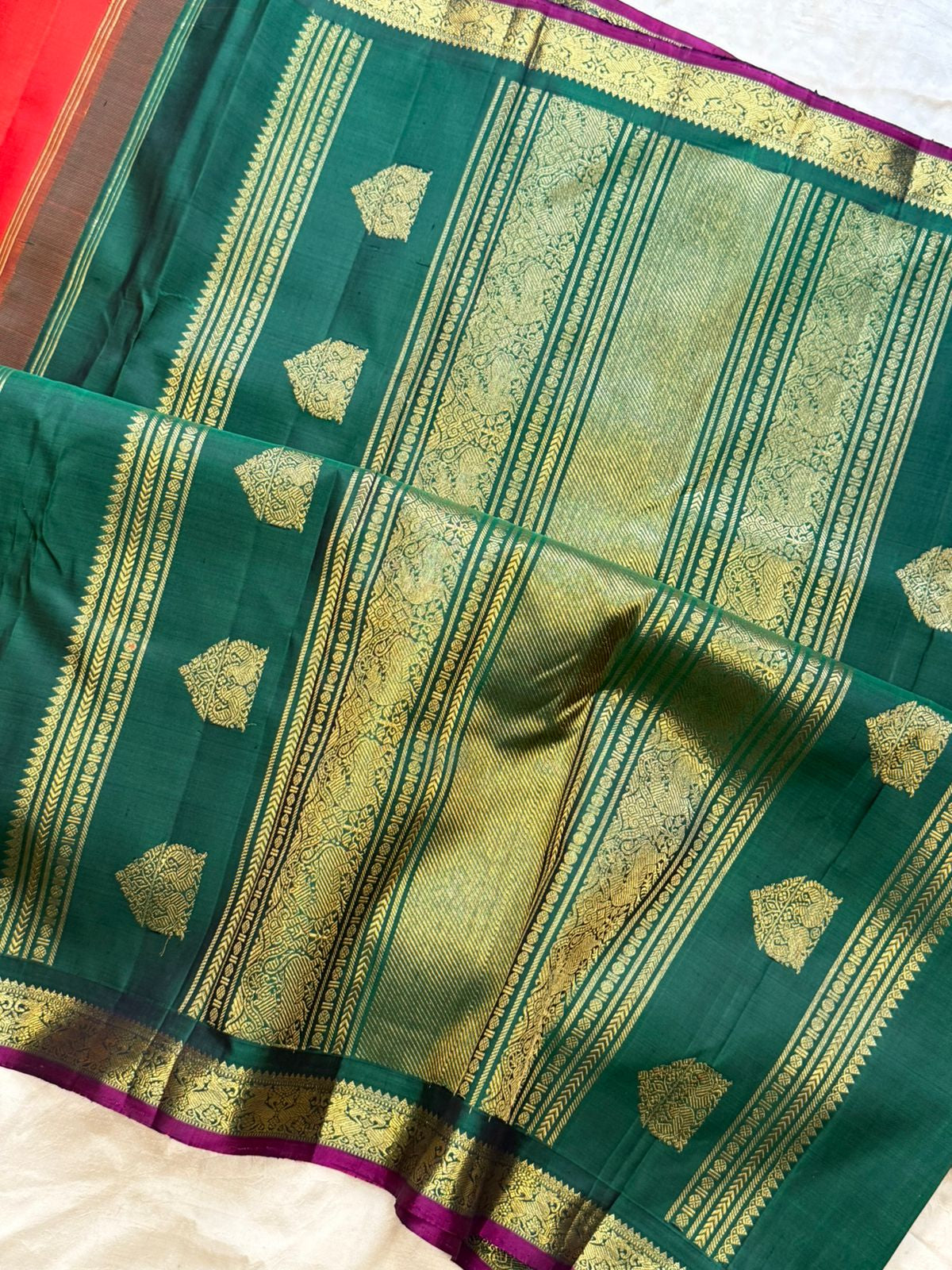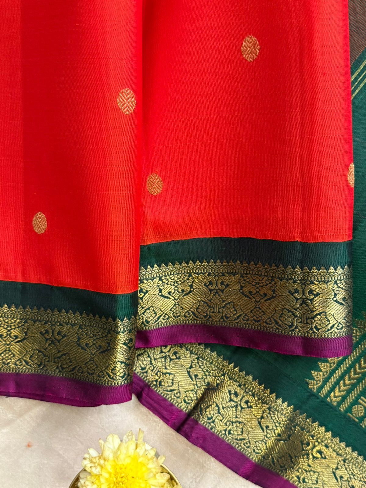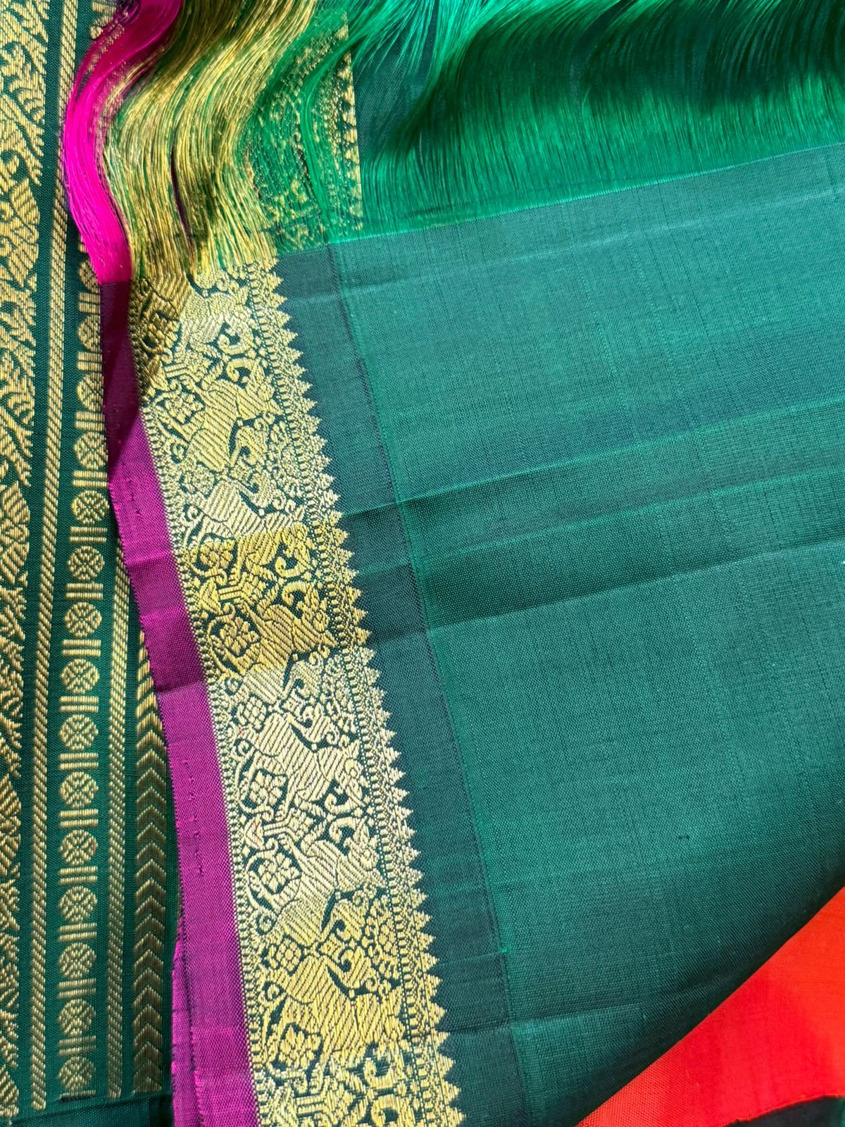 Orangish red and bottle green (yazhi border ) kai korvai/ kanjipuram silk