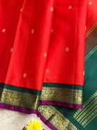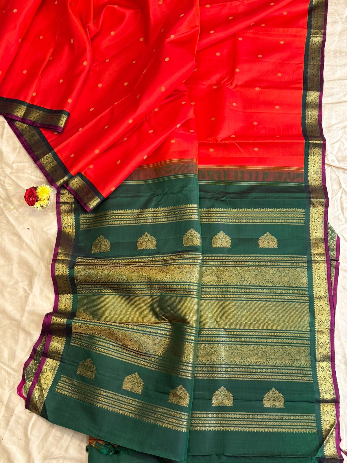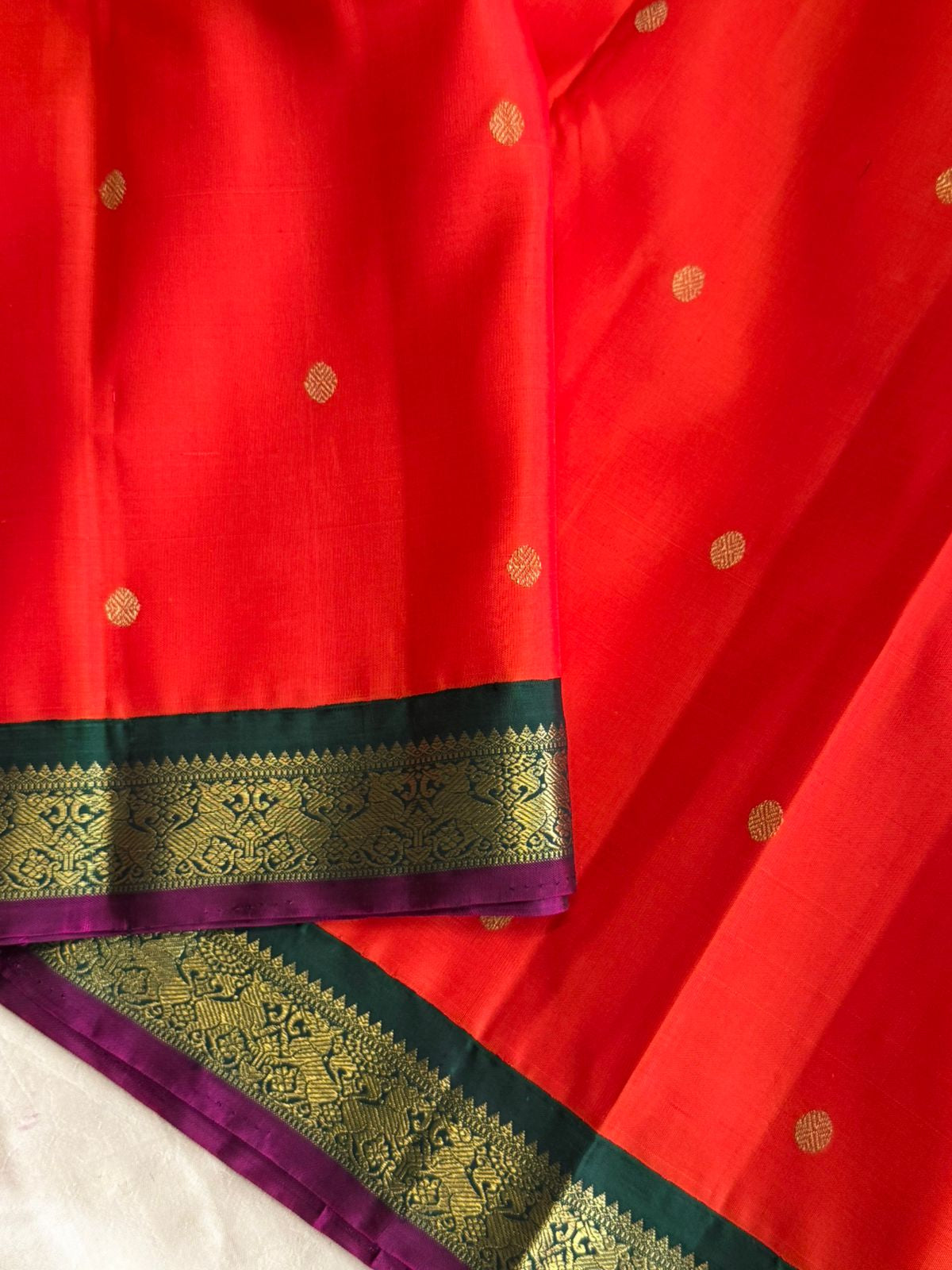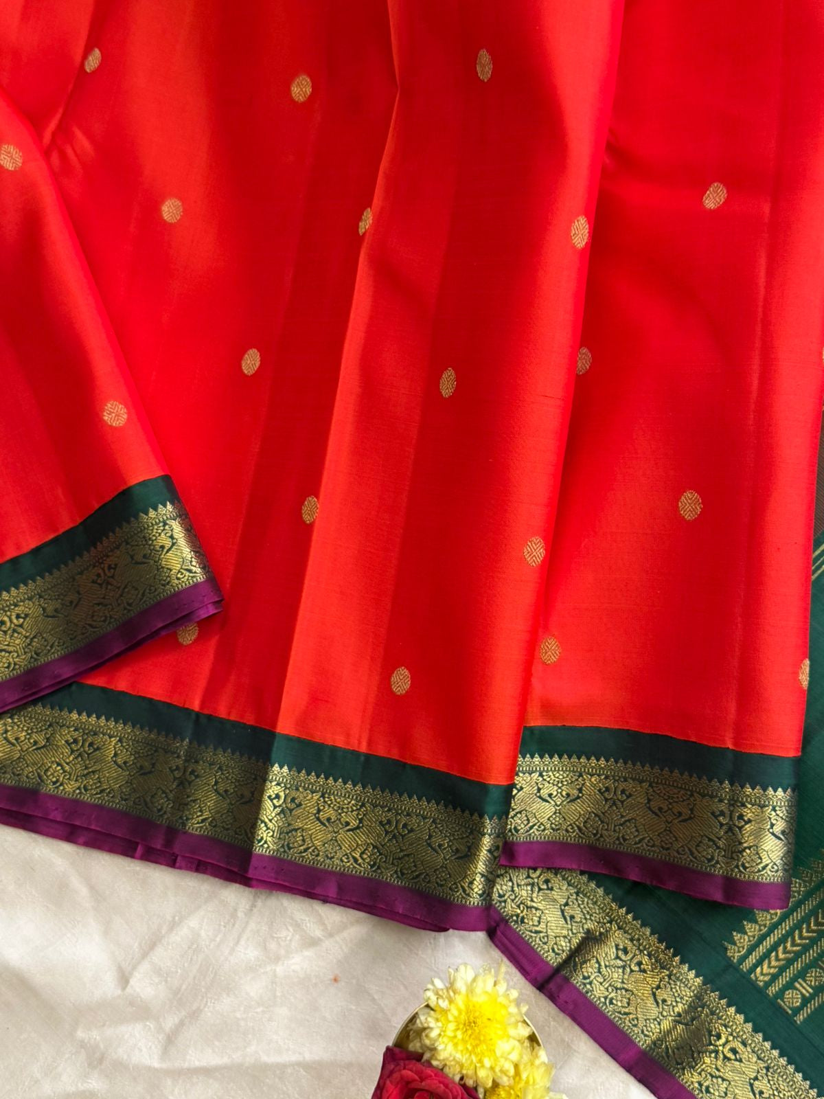 Orangish red and bottle green (yazhi border ) kai korvai/ kanjipuram silk