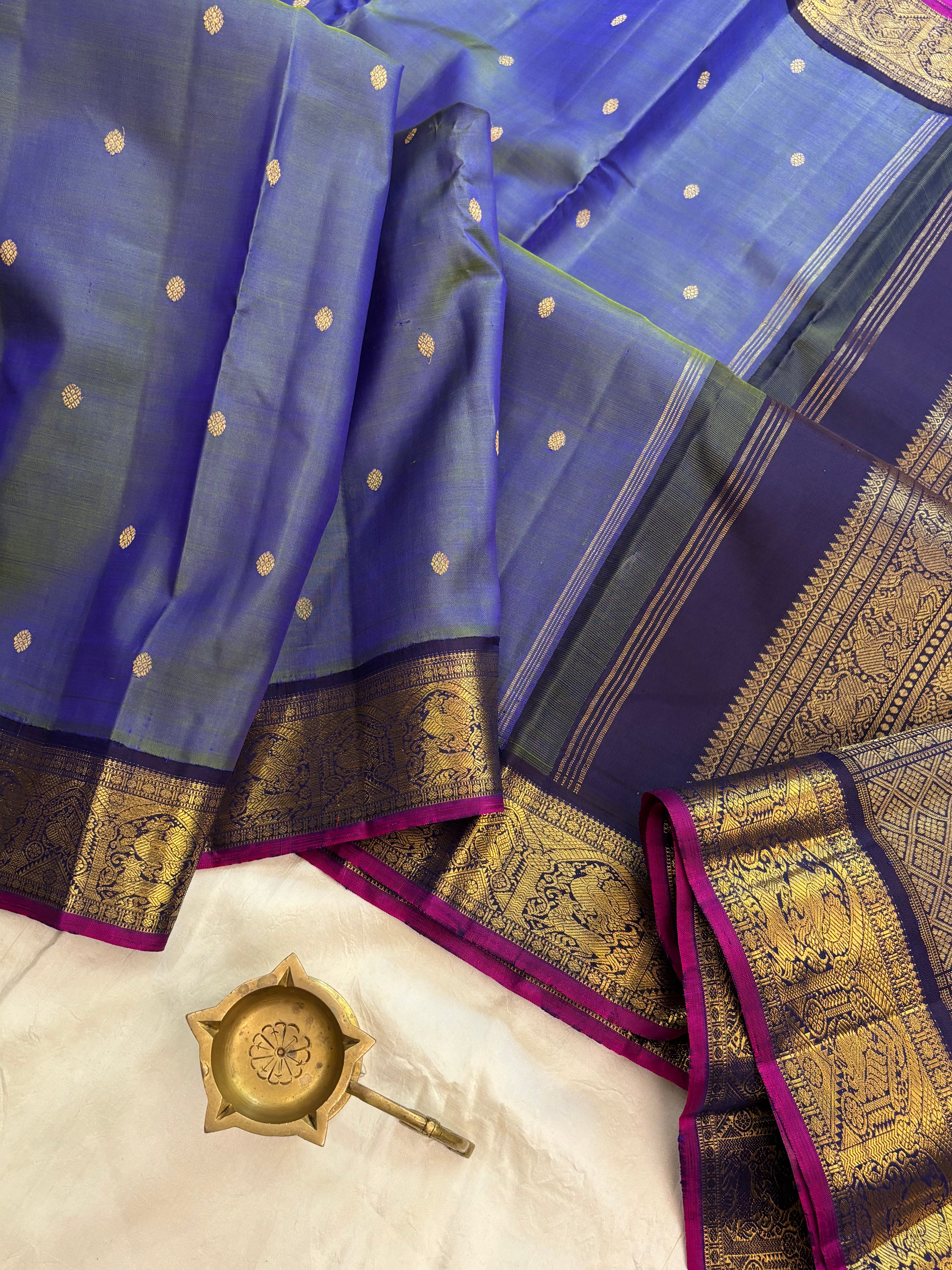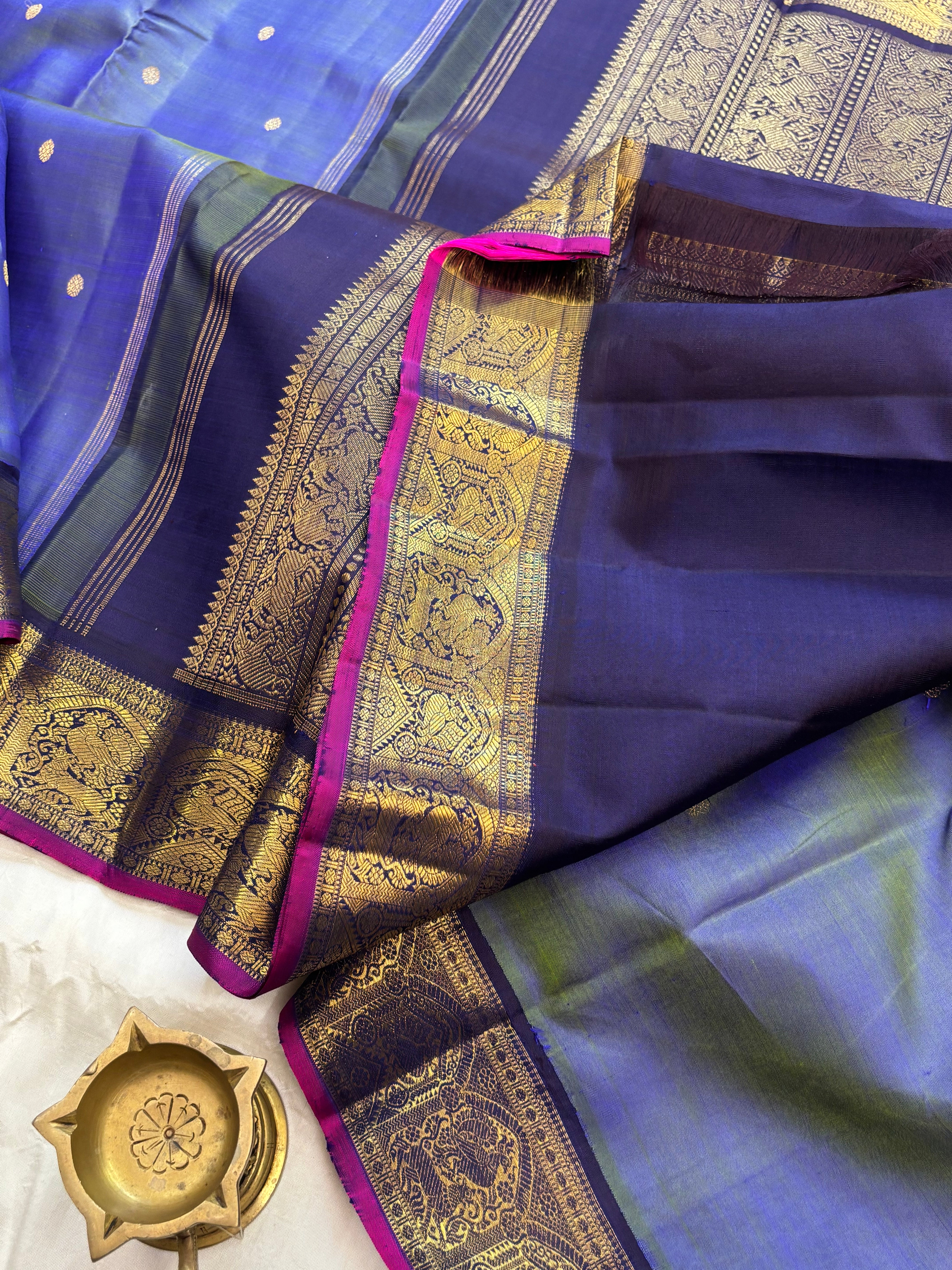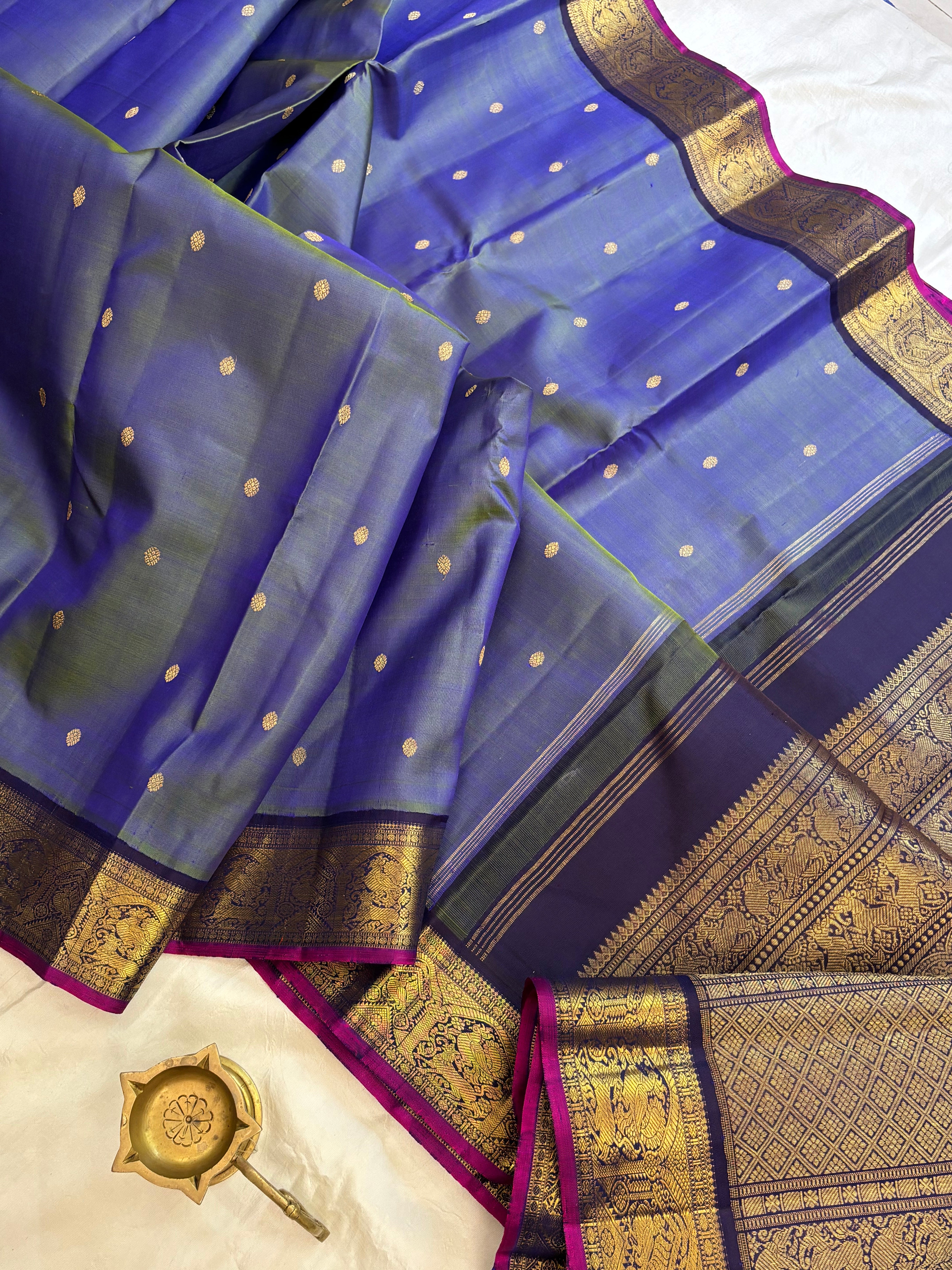 The body has beautiful peacock blue with chakram butta overall body , the pallu has navy blue with yazhi and peacock , the pallu has detailed with attached blouse