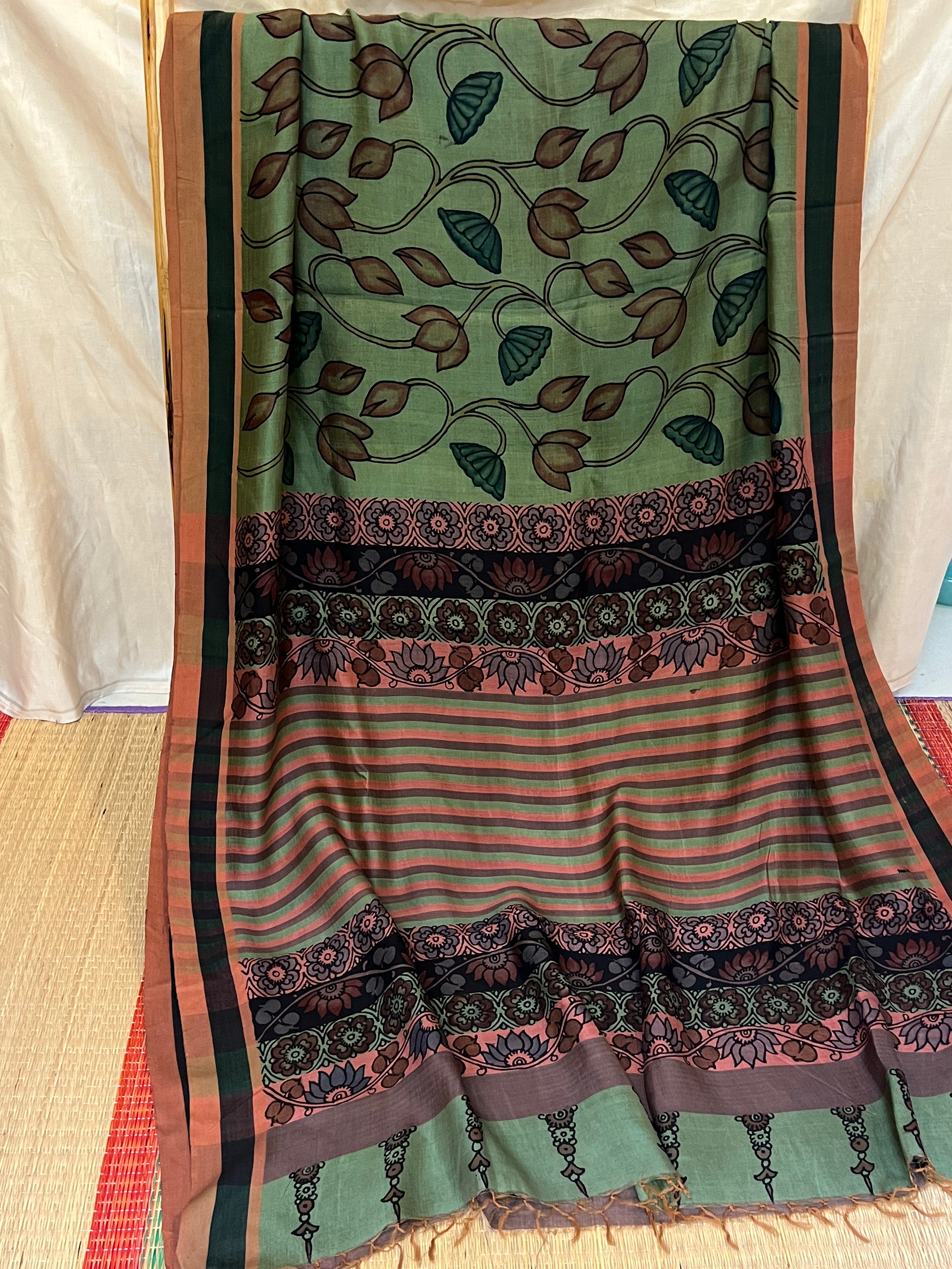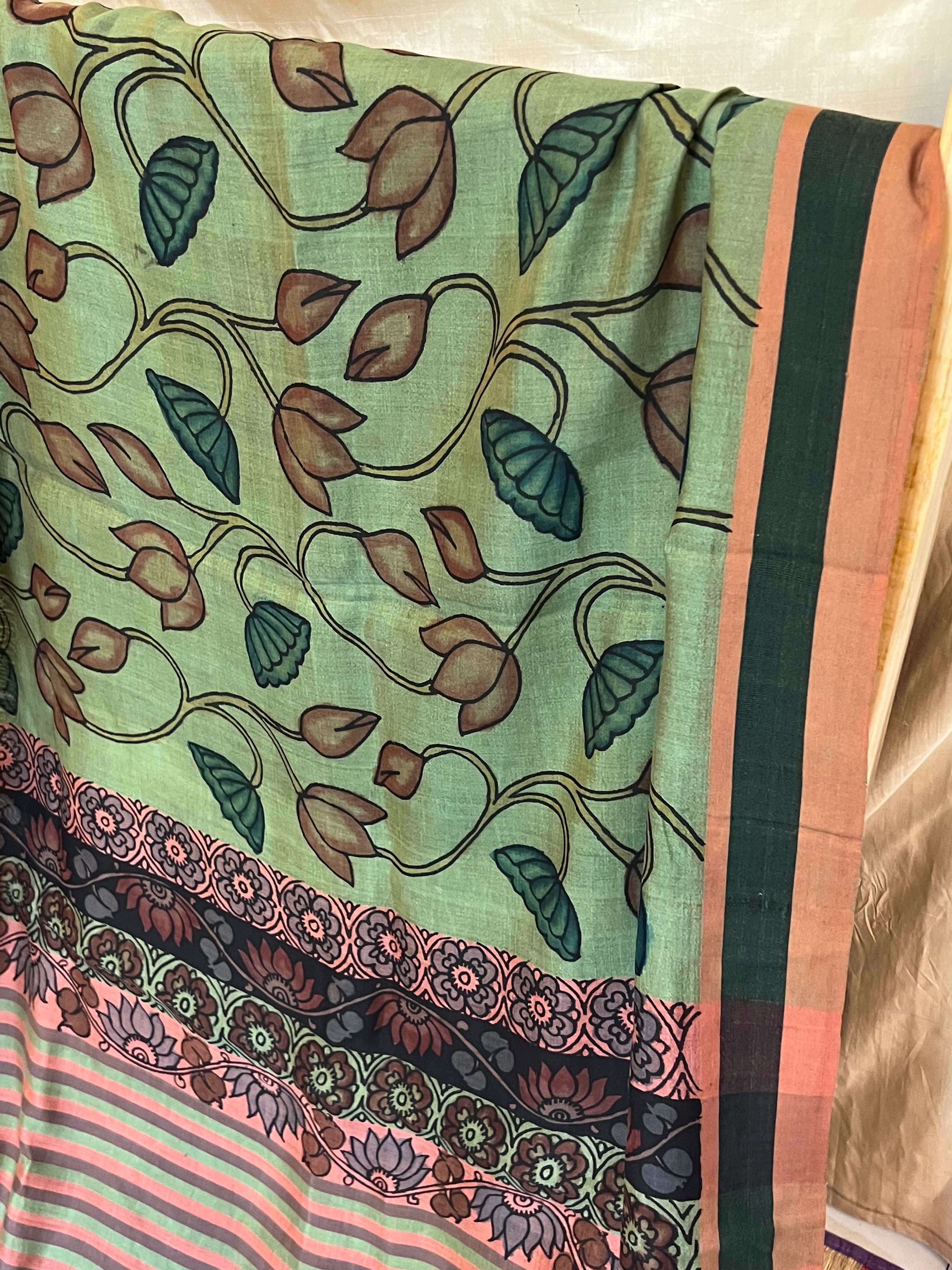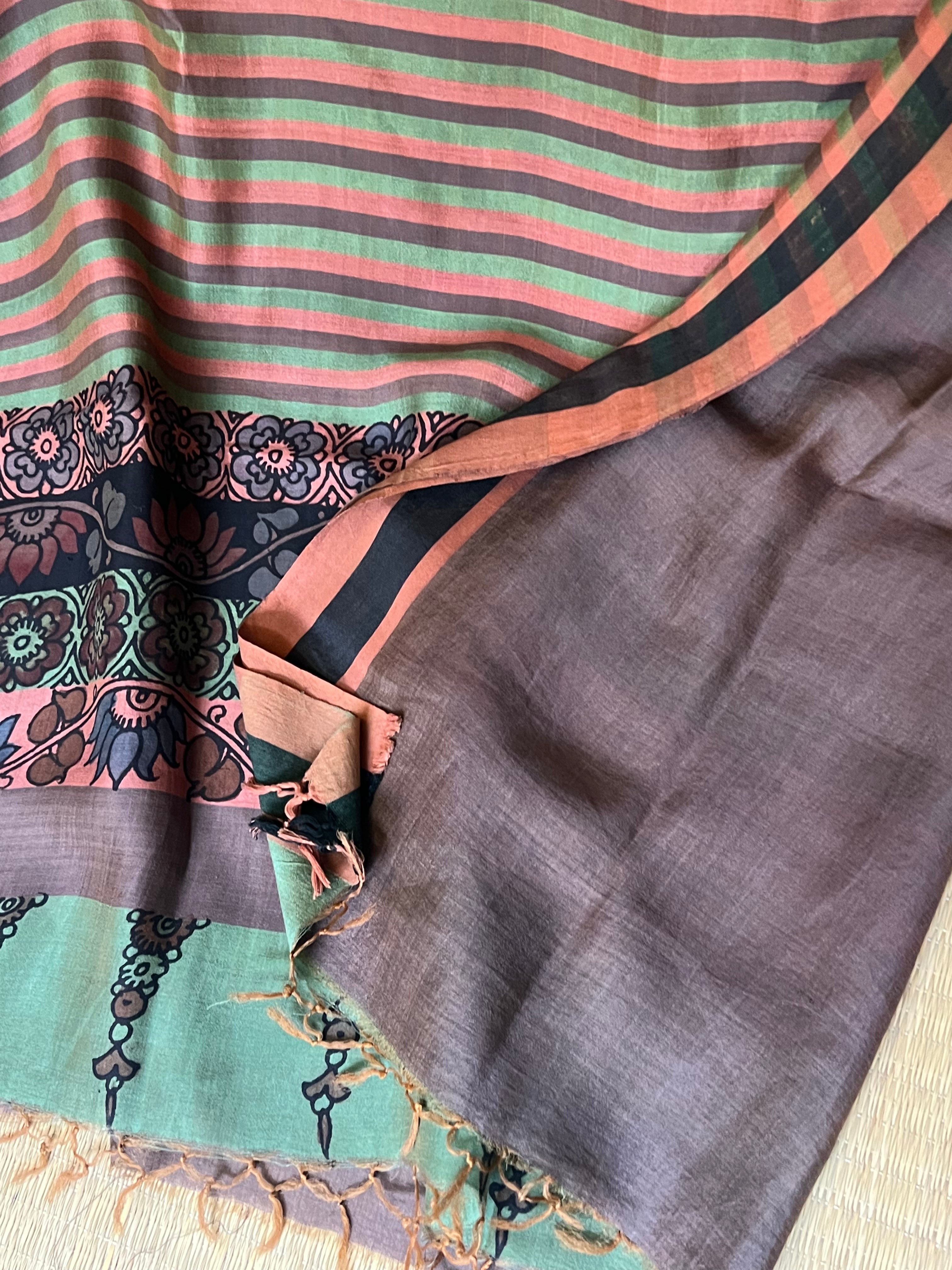 The Base of the saree is soft tussar with coffee bean color base and floral work on the body