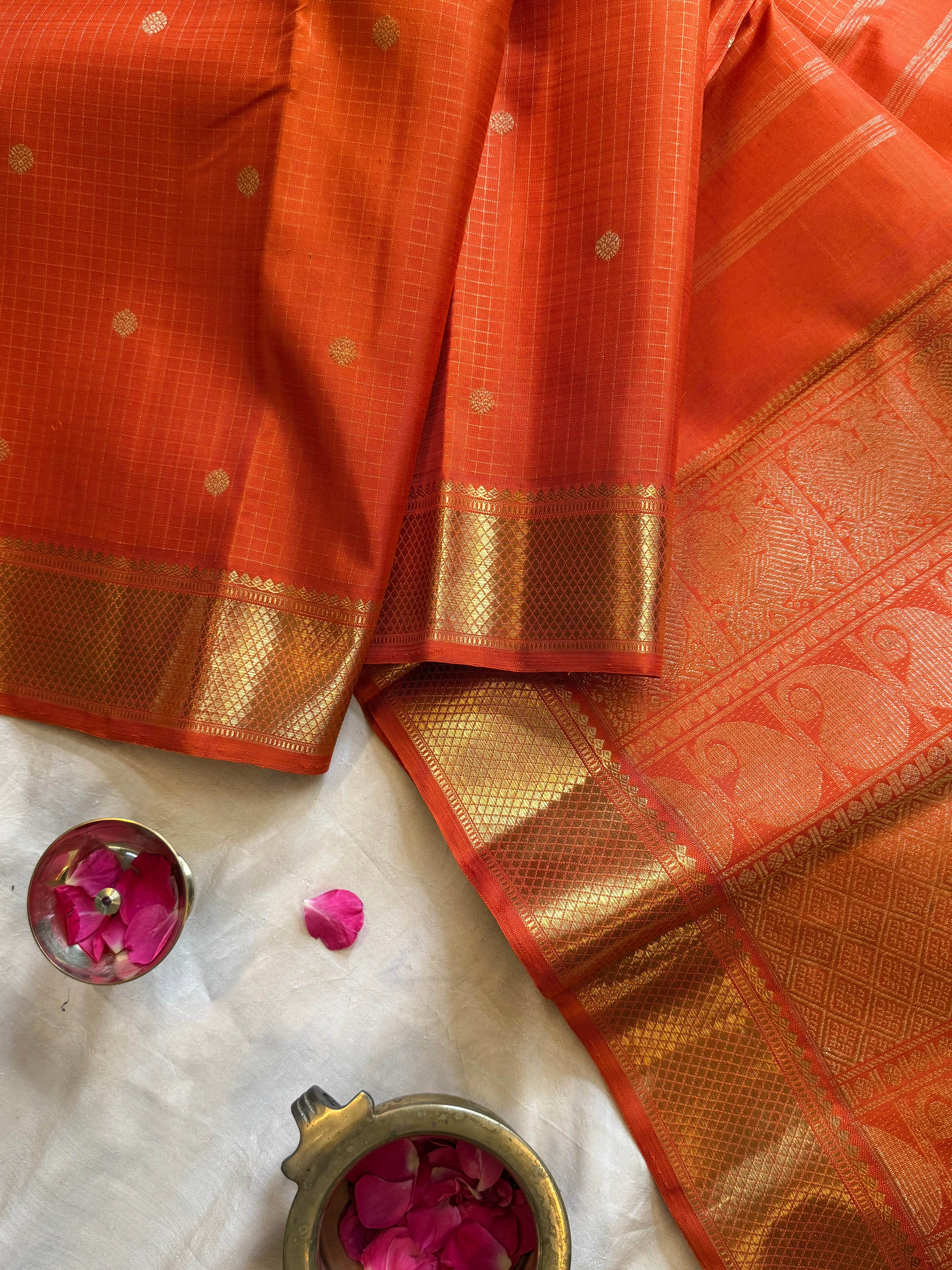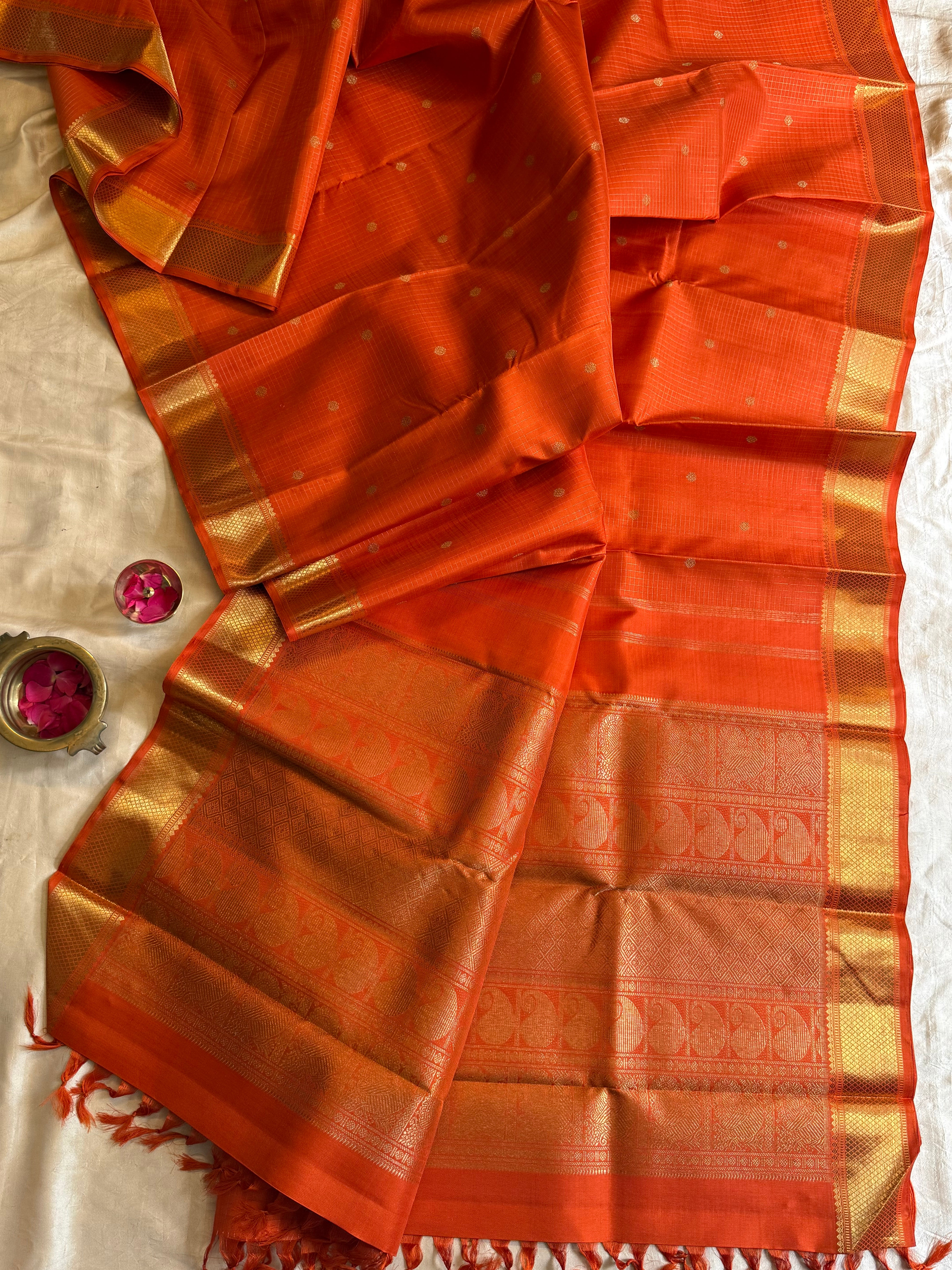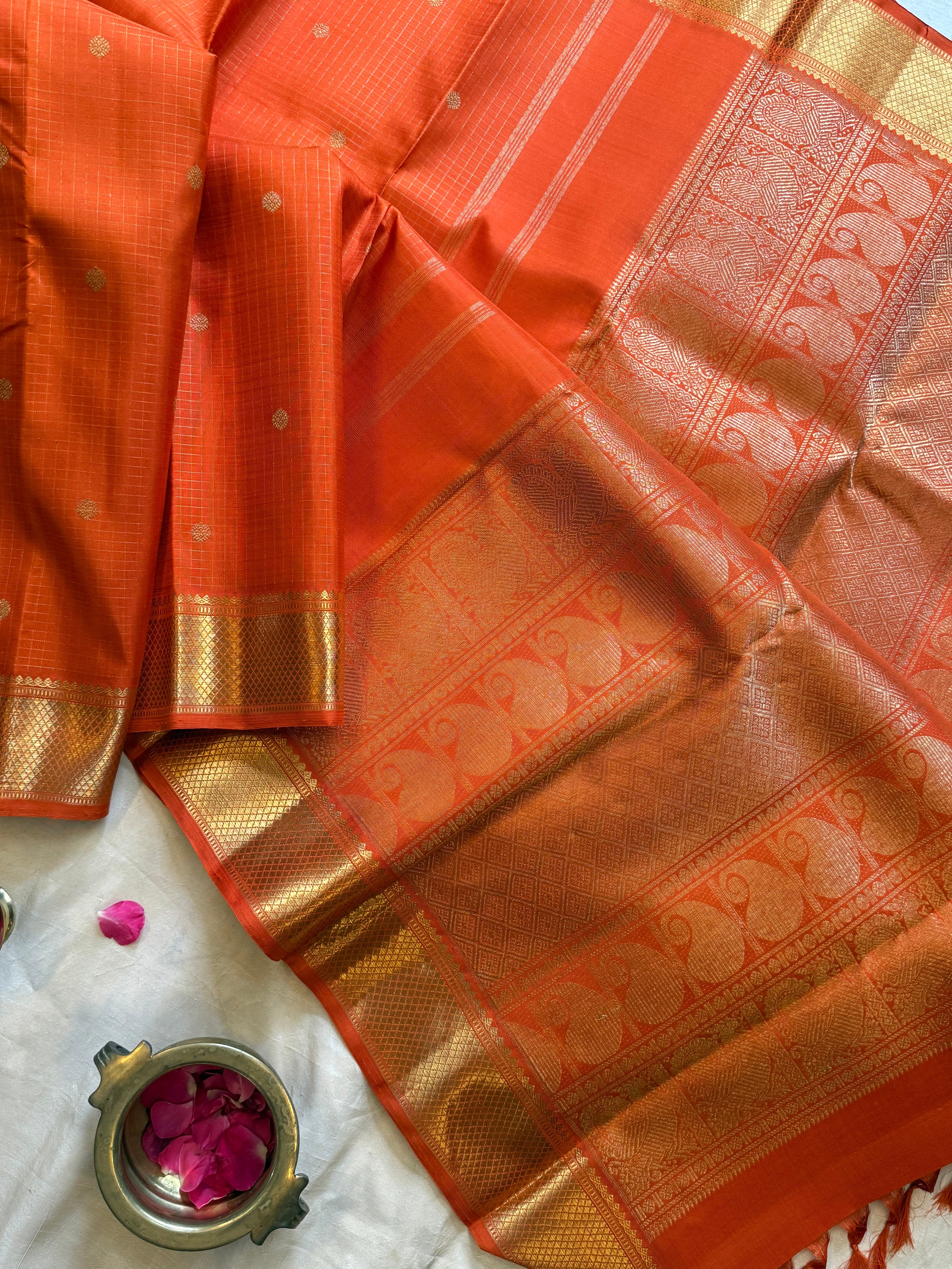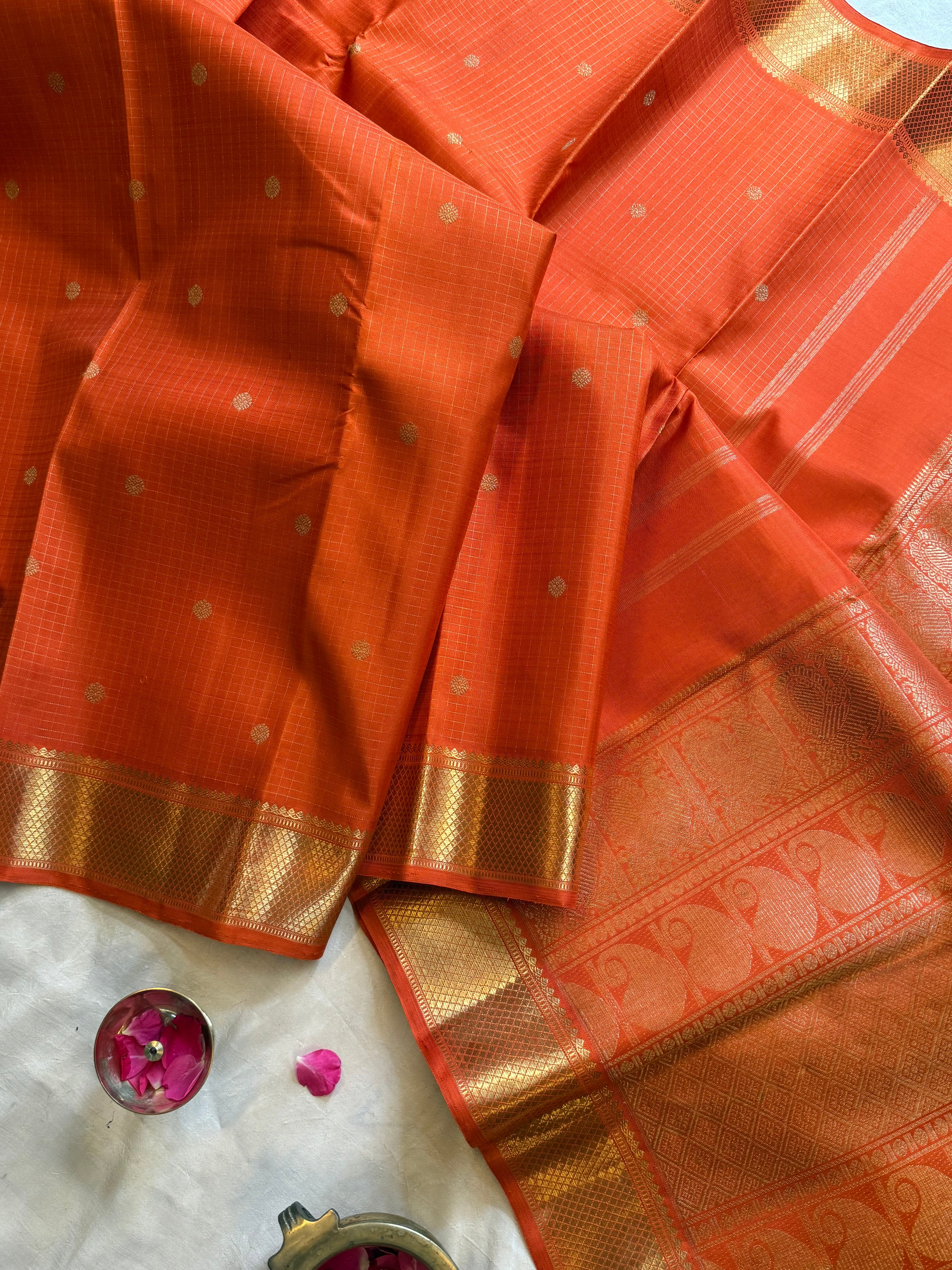 The body is rustic orange Zari Kattam in body and the border is Kuil kann pet and Kamalam Butta and dense pure Zari Palla and blouse