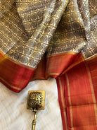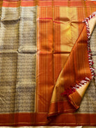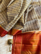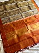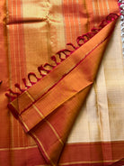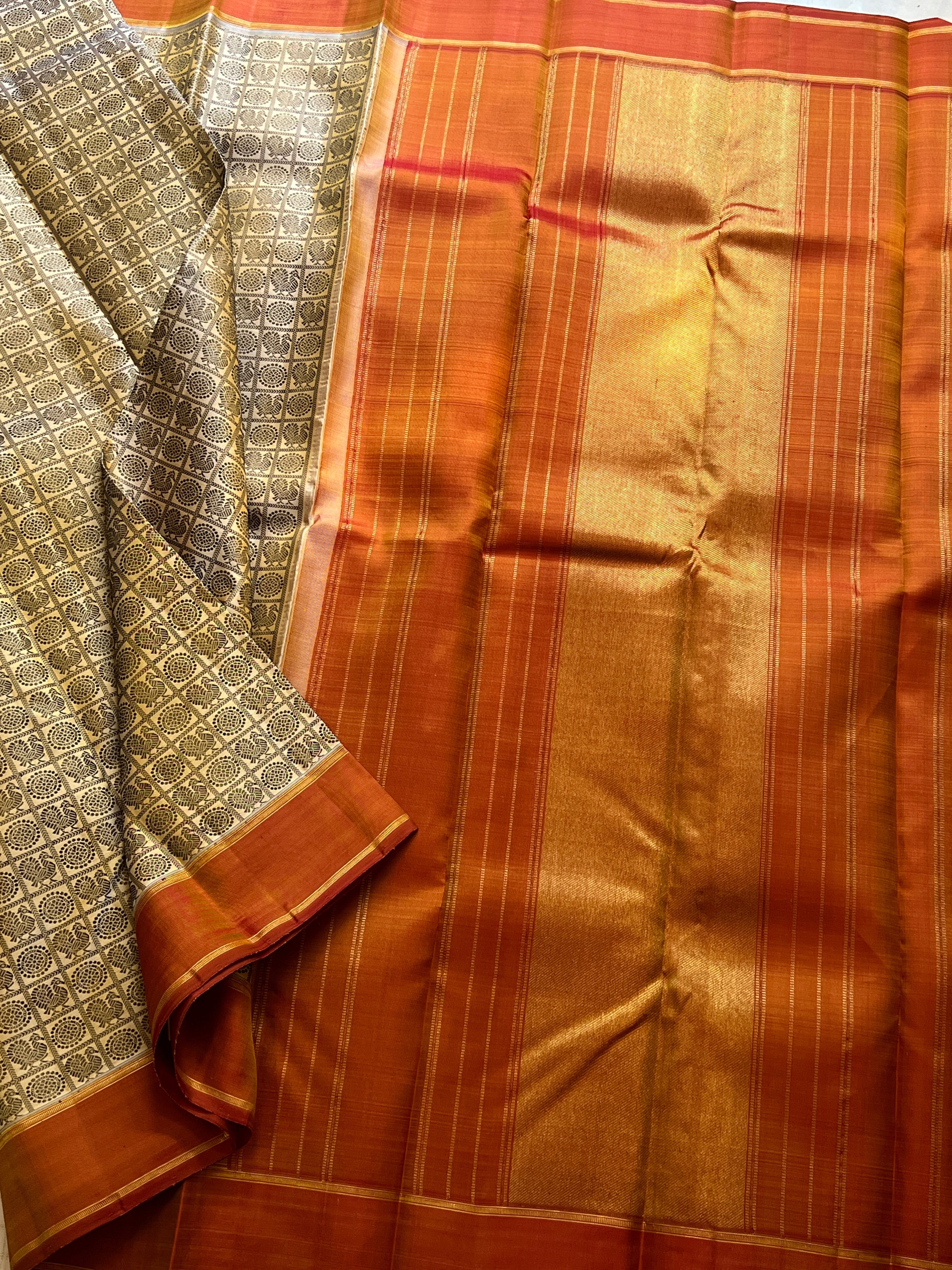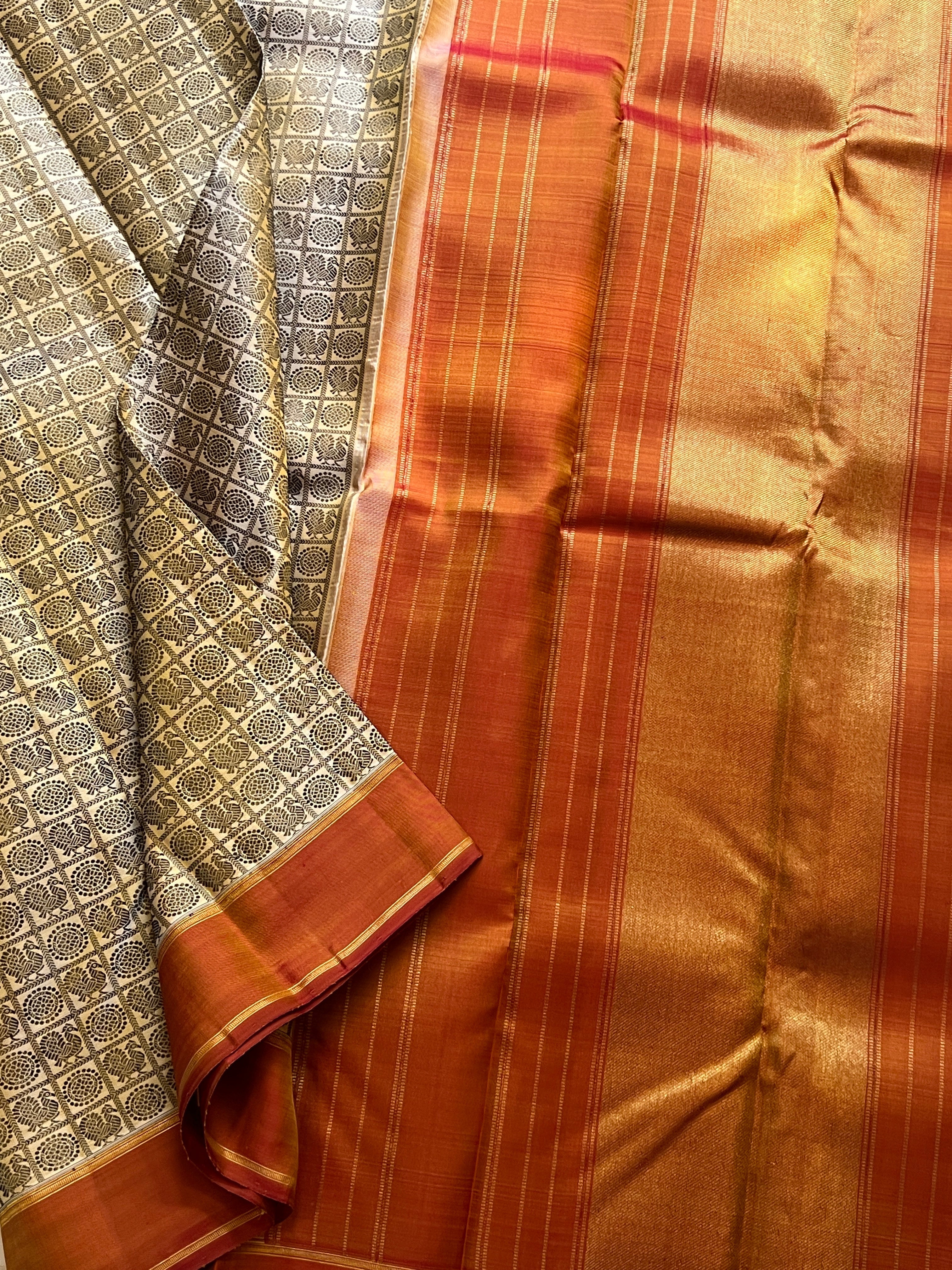 The base is beautiful yellowish cream with 1000 butta annam chakram woven in silk thread , the color is black  and the palla is rust  with pure zari rekku palla . Attached blouse . The saree has a rust border