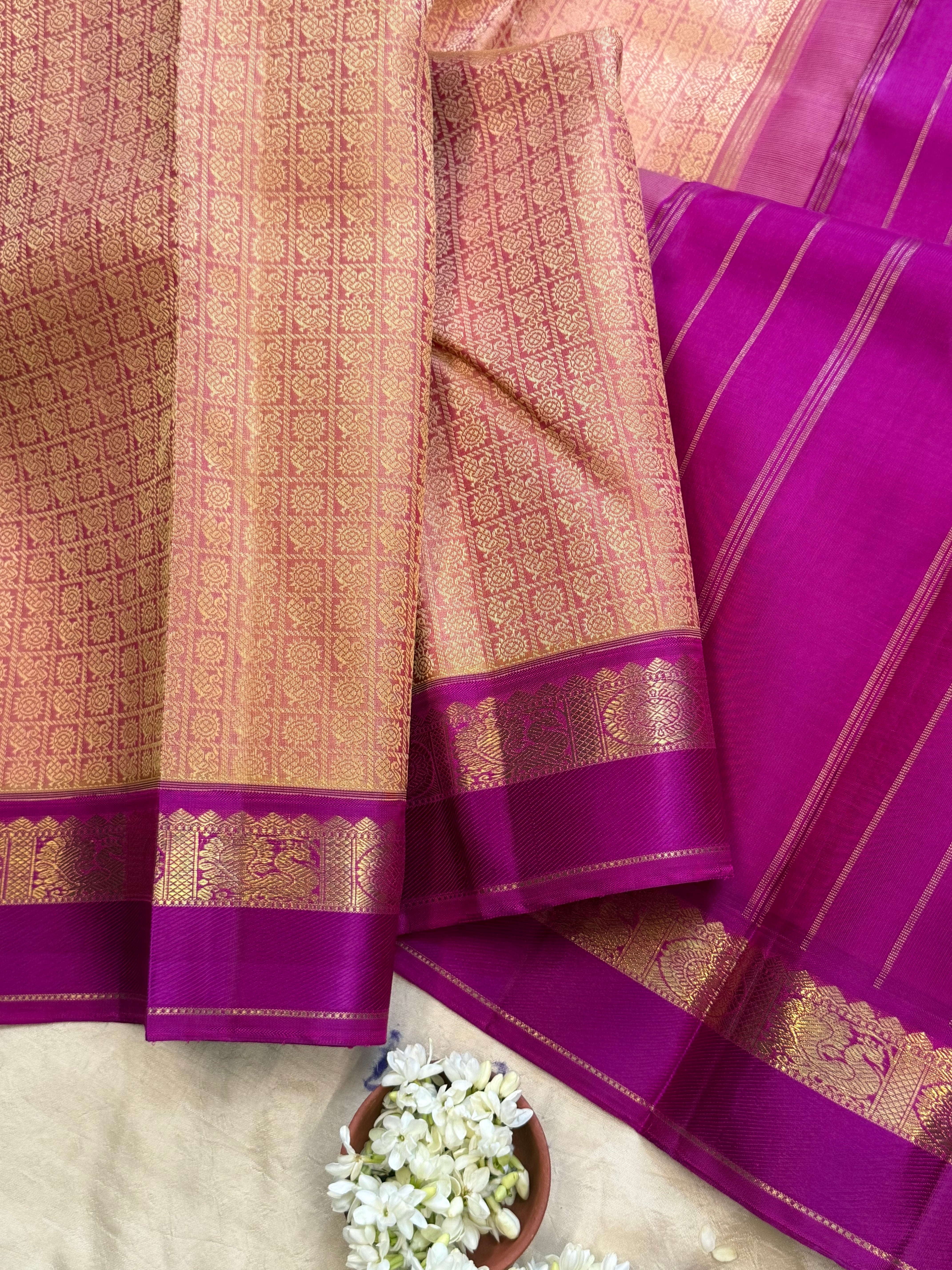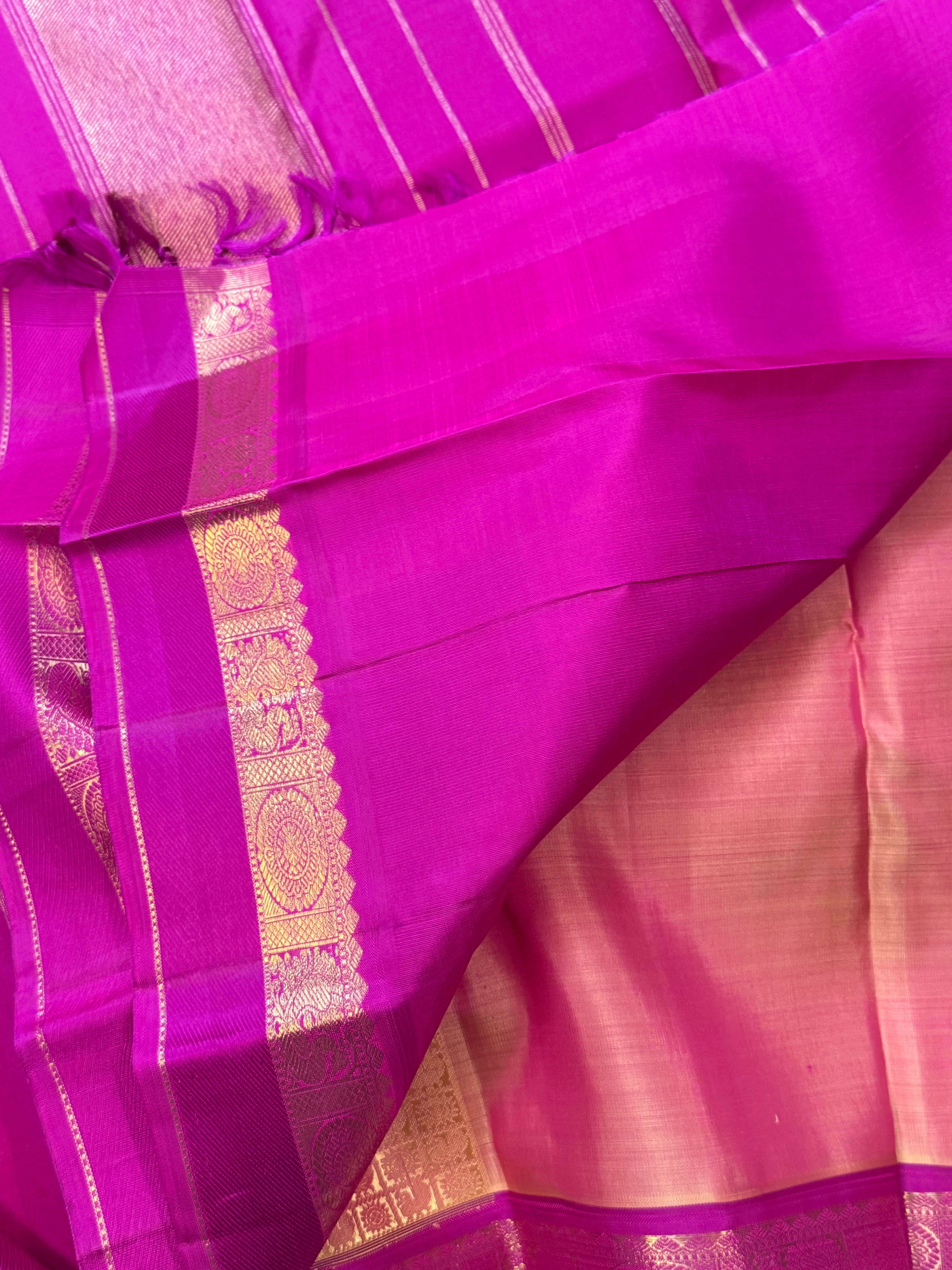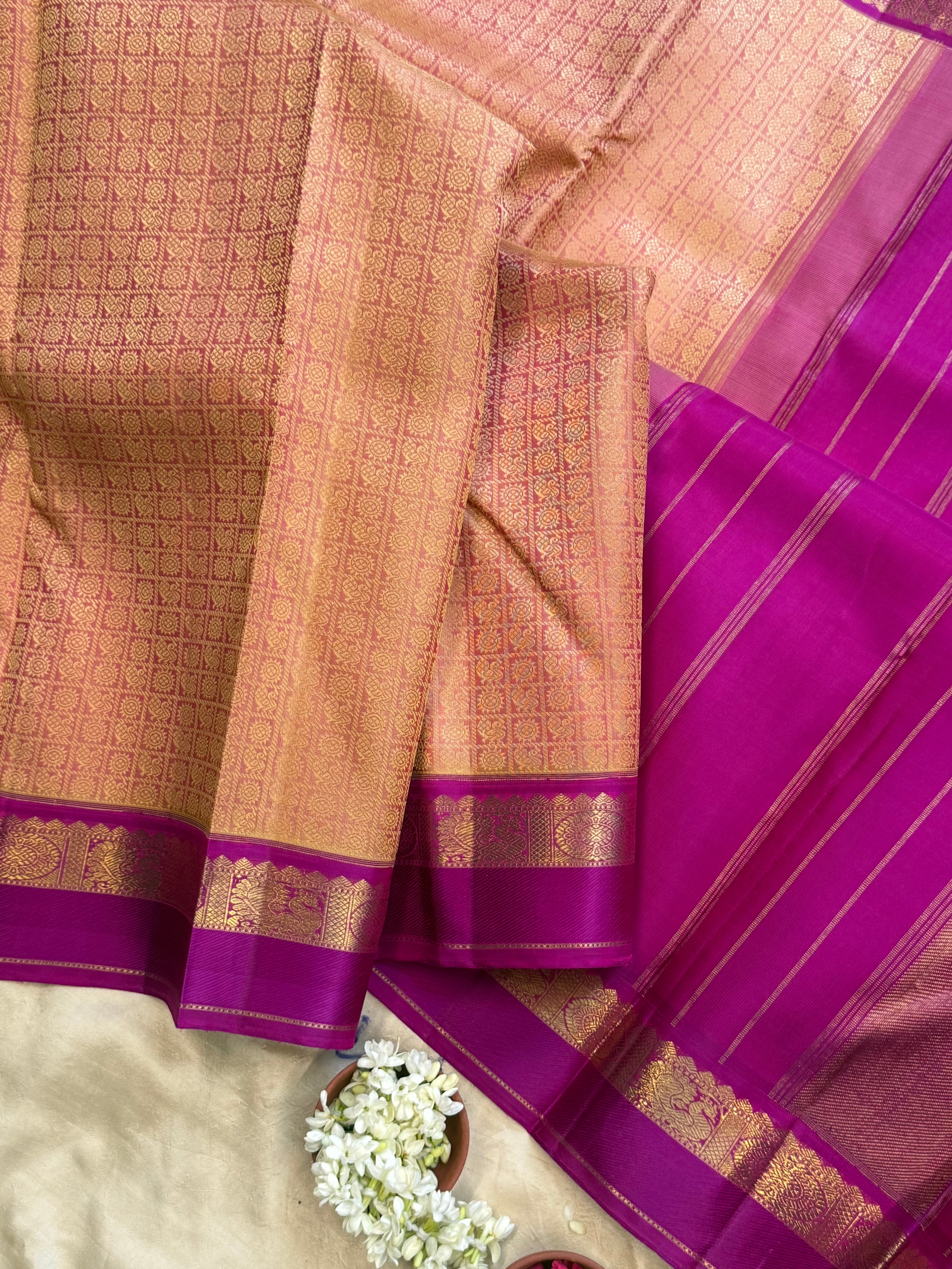 The body is blush pink with annam chakrm Butta and dark pink pure Zari border and rich rekku Palla and blouse