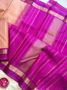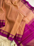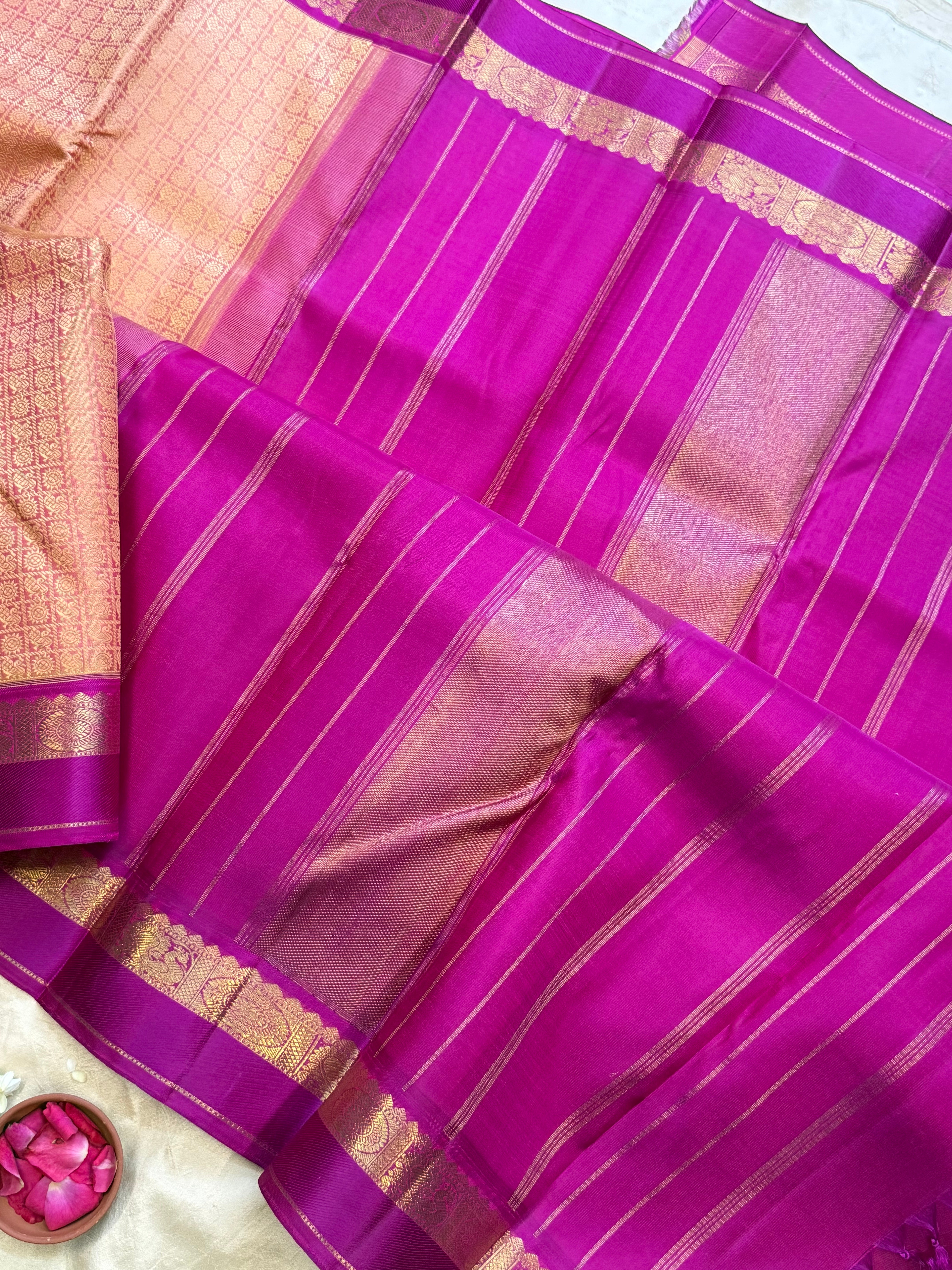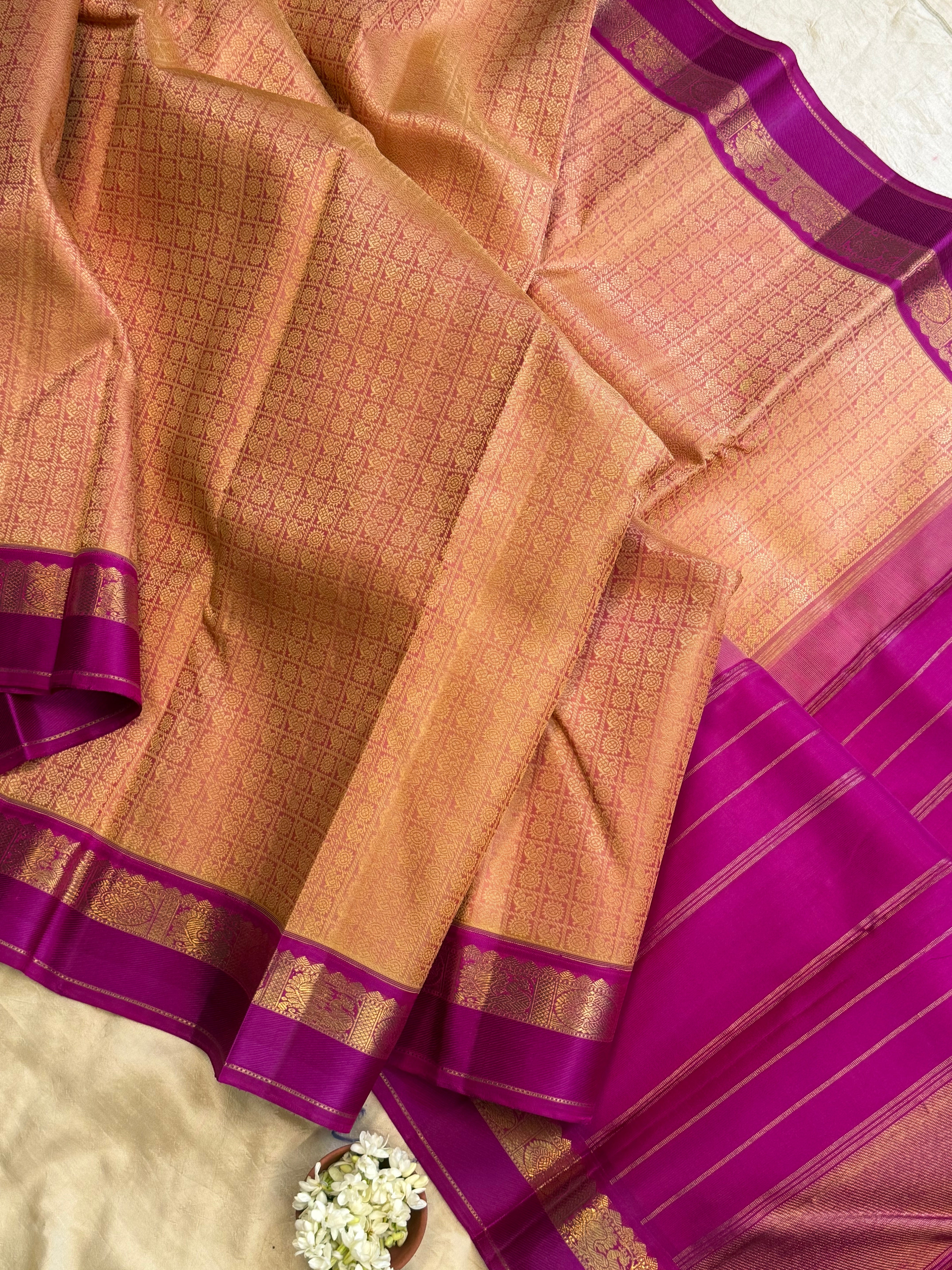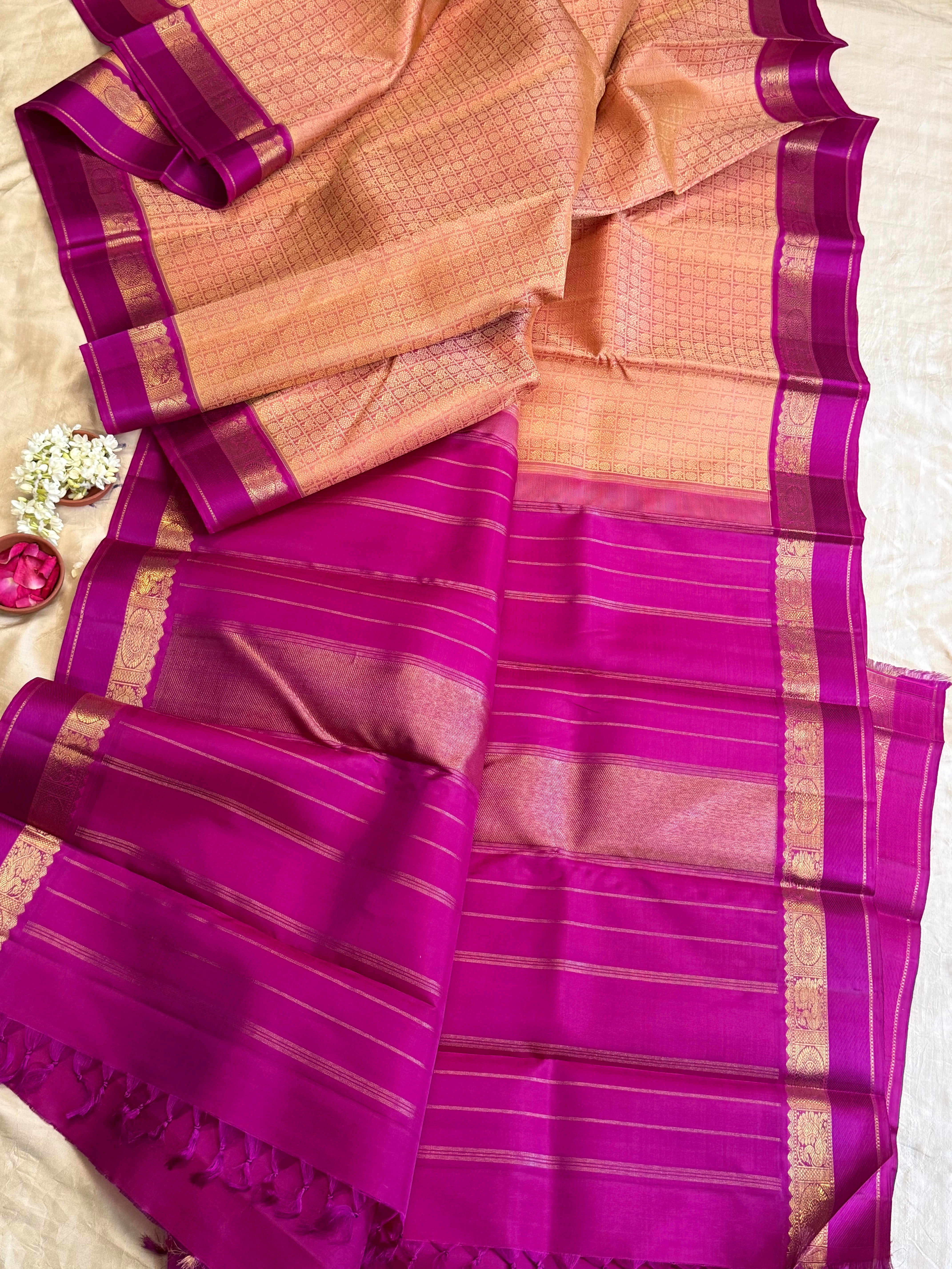 The body is blush pink with annam chakrm Butta and dark pink pure Zari border and rich rekku Palla and blouse