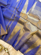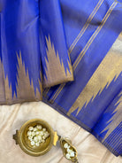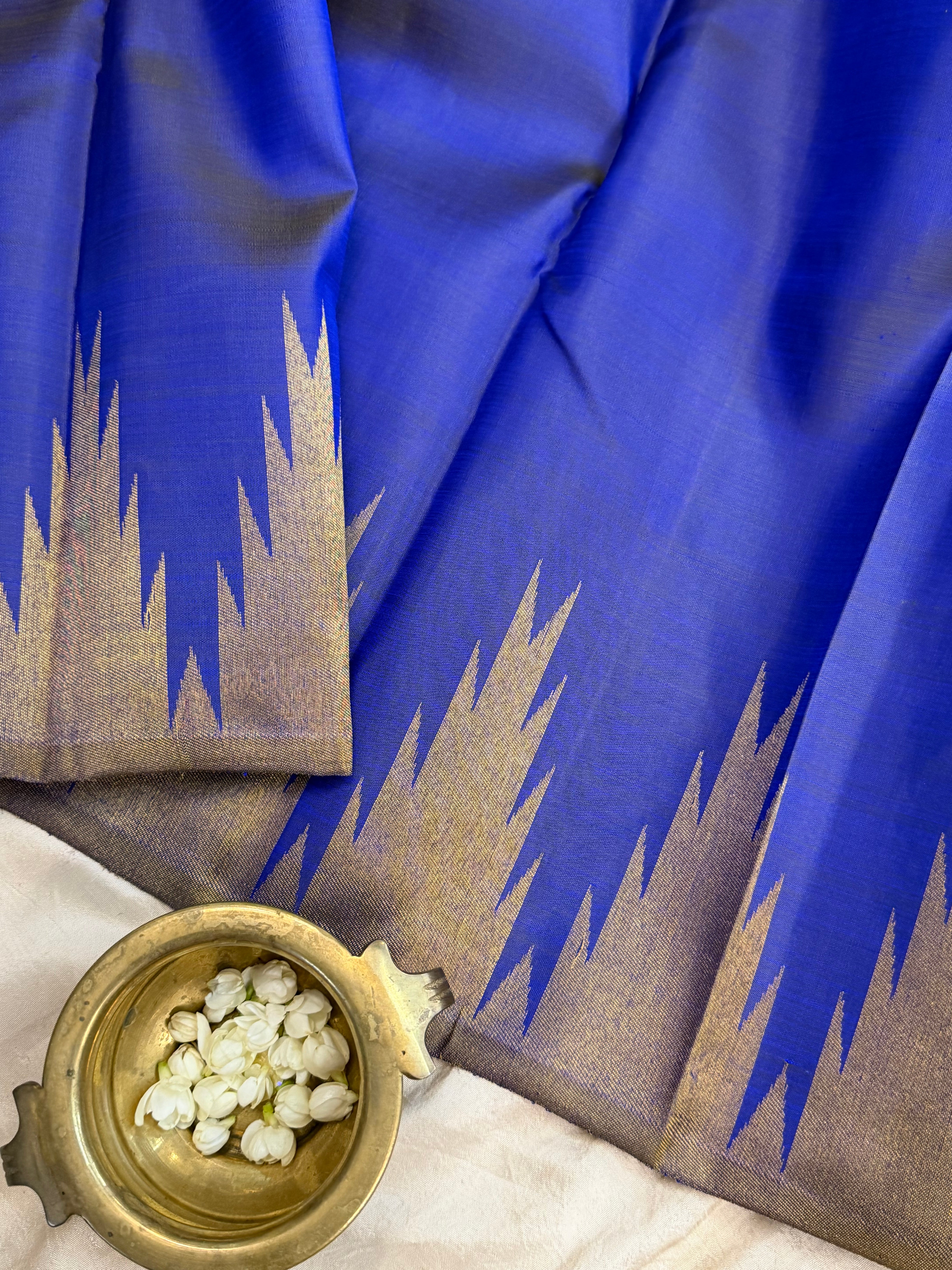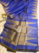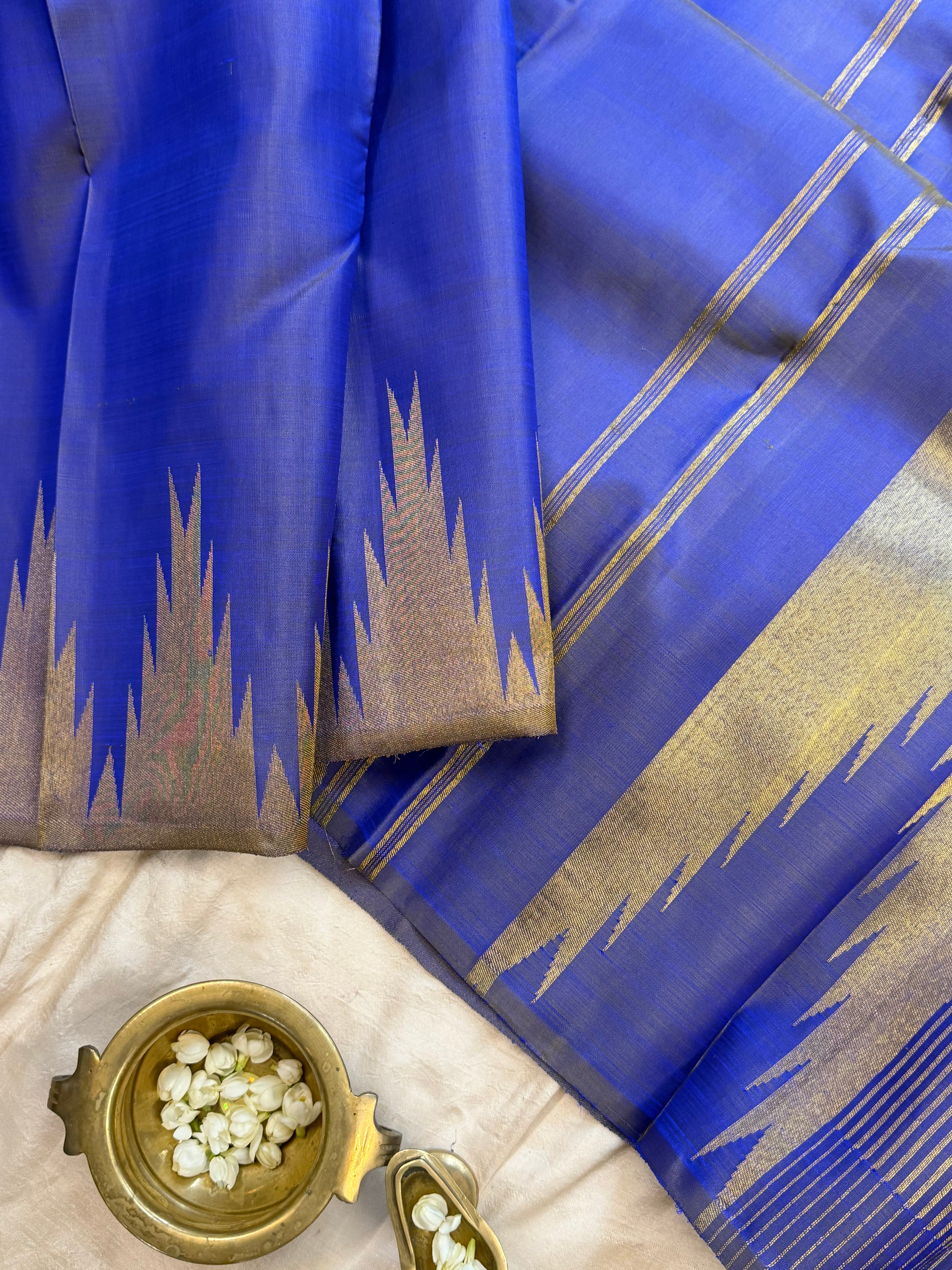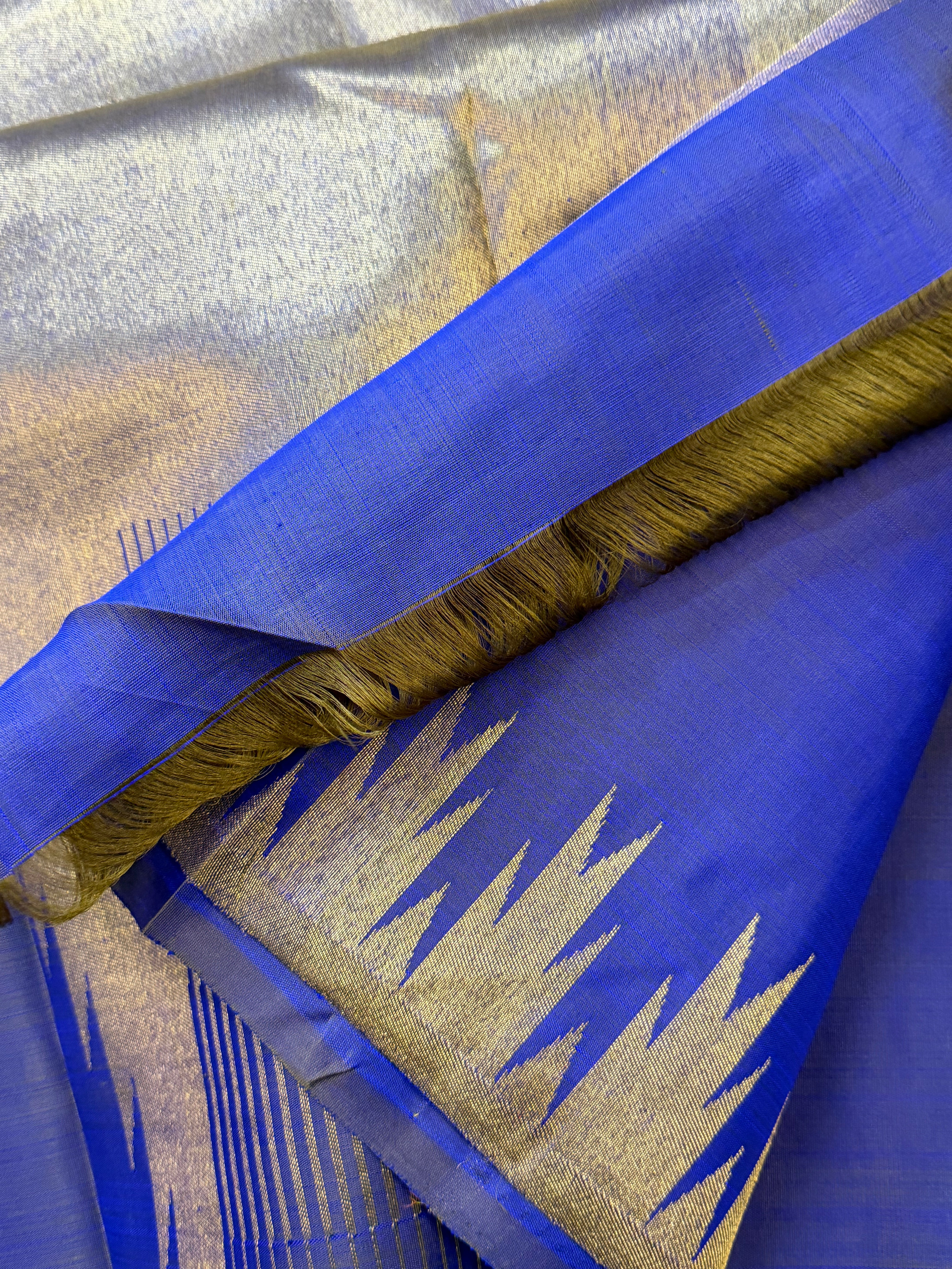 The body is bluish green   with gold Zari thazhamboo rekku and dense 8 kol Zari Palla in pure Zari and blouse attached.