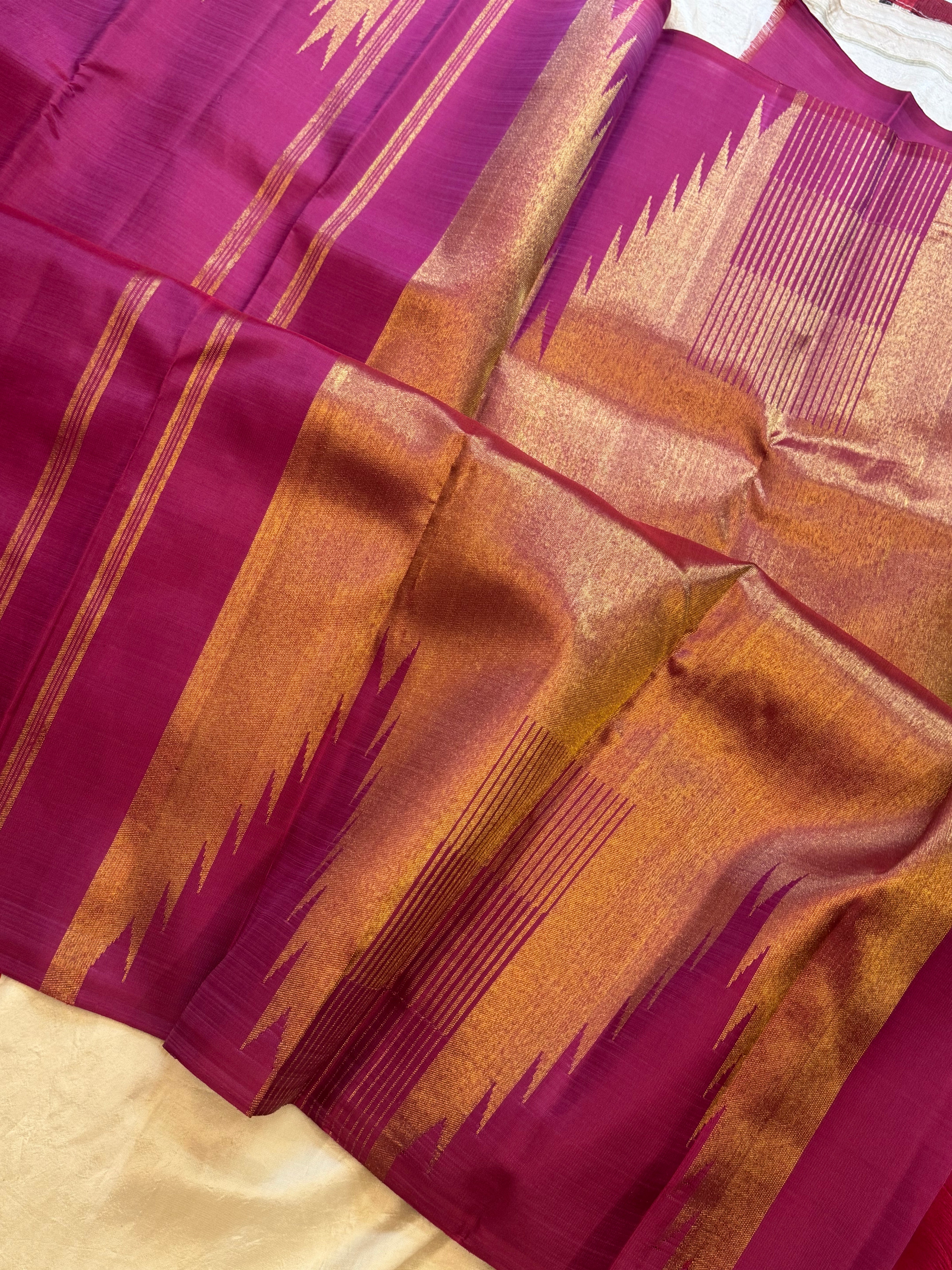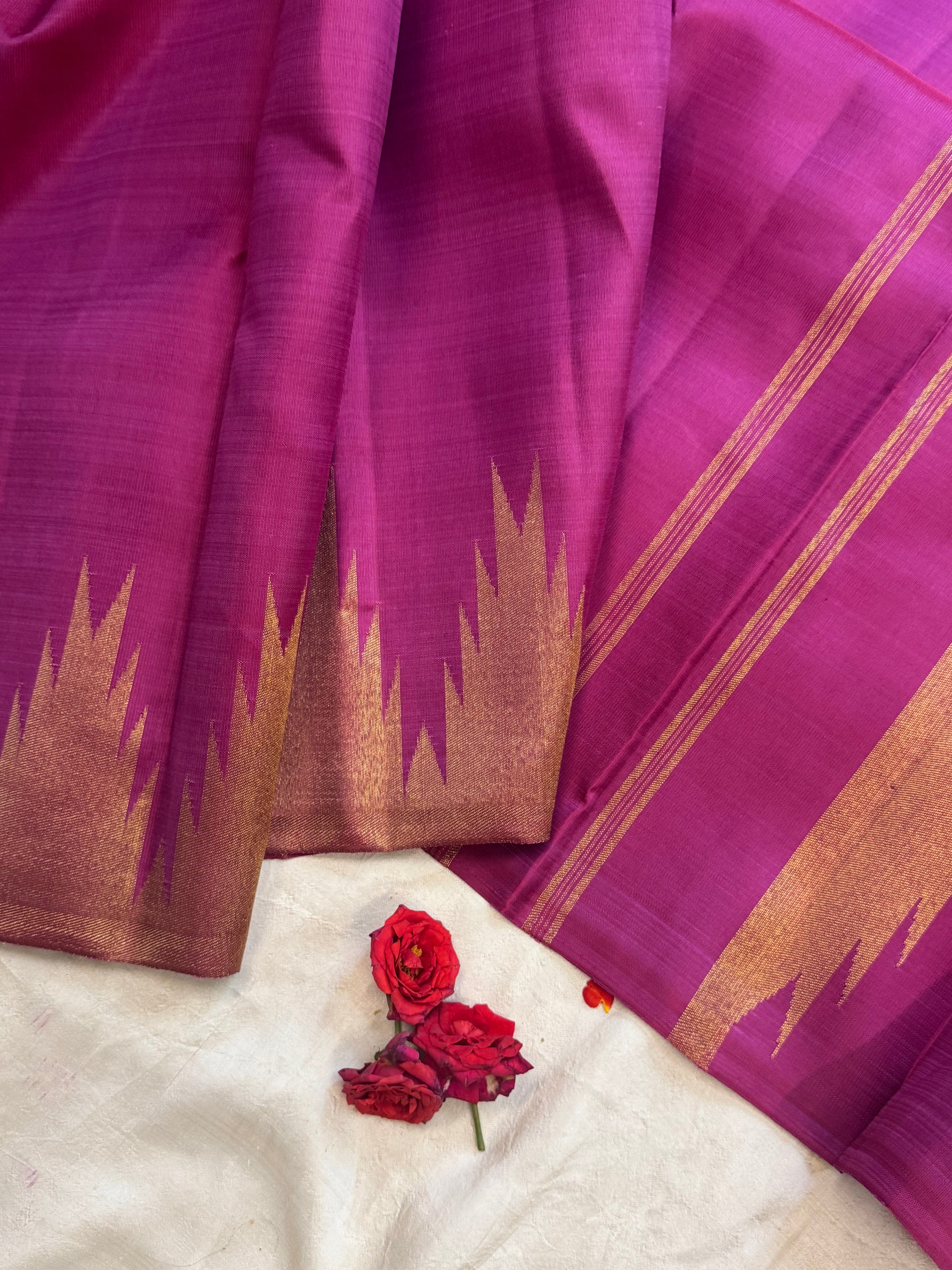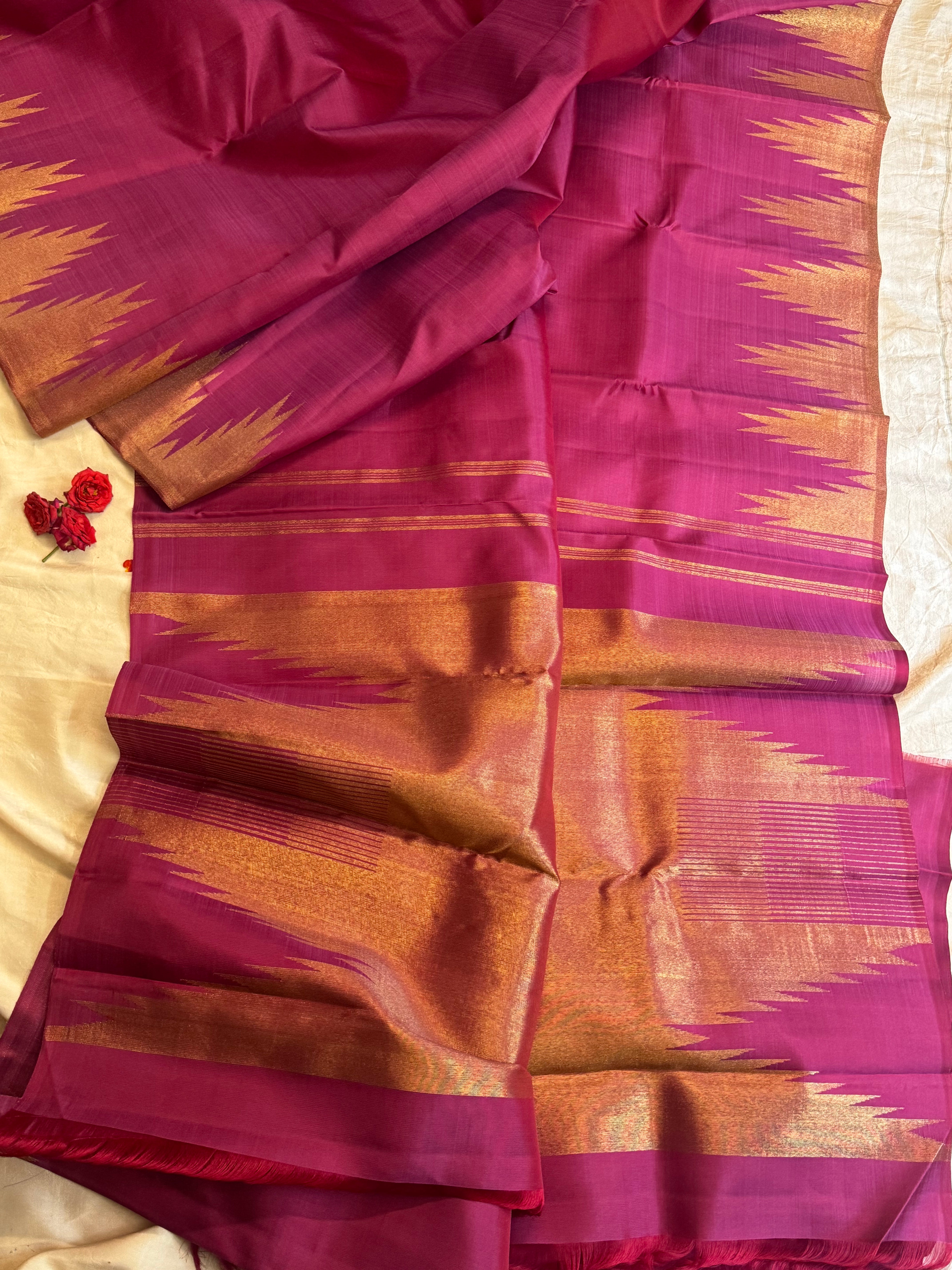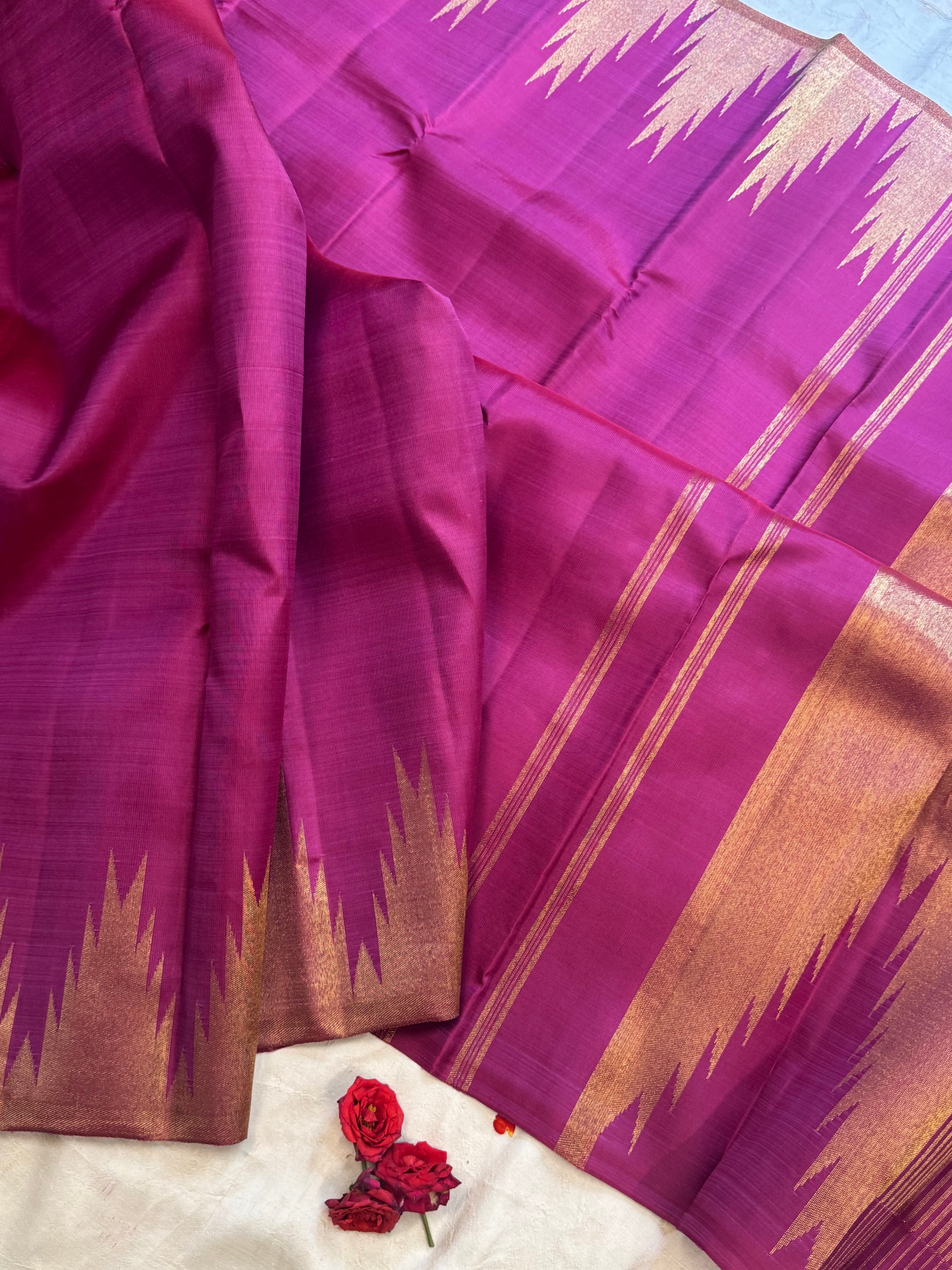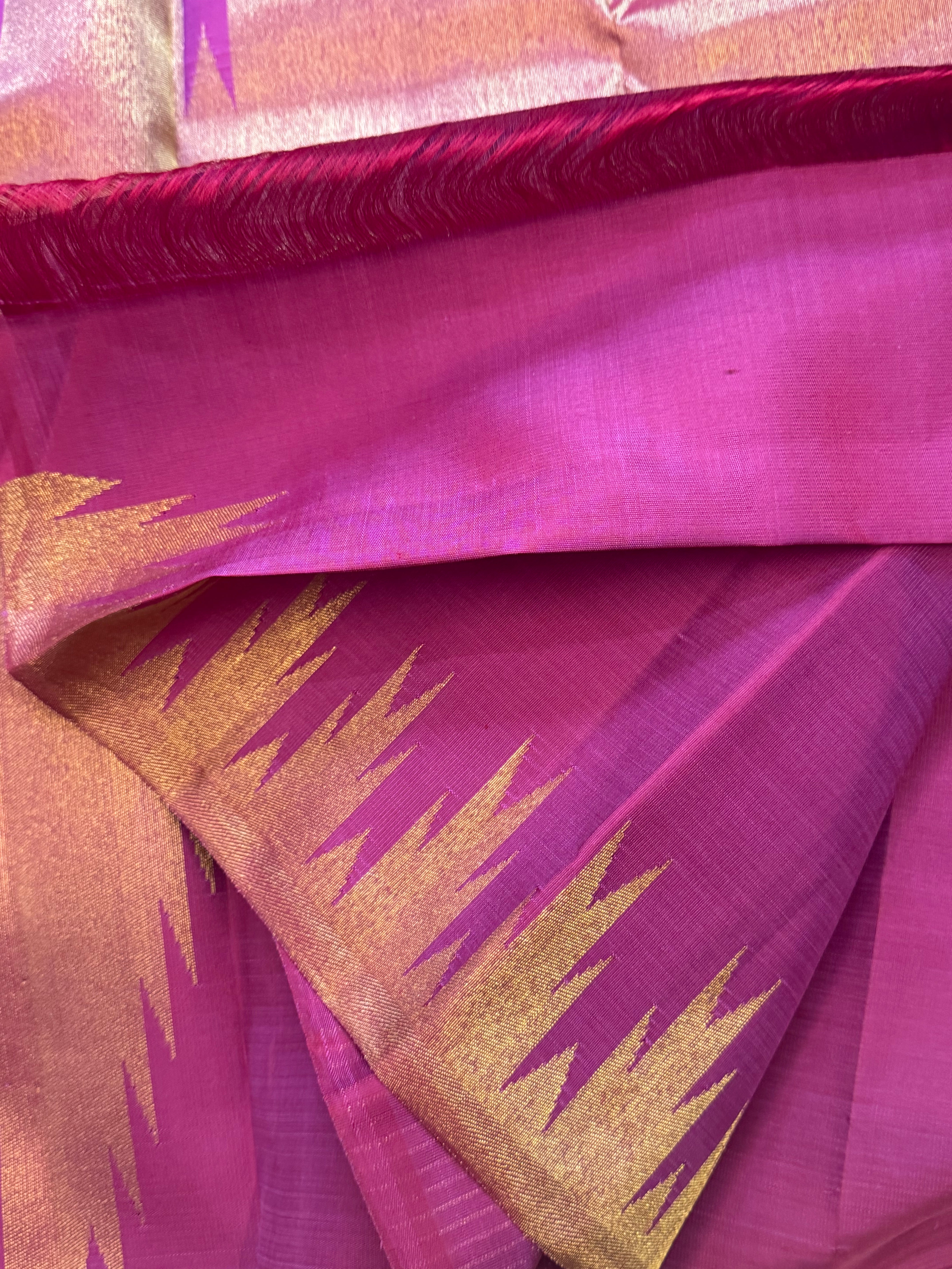 The body is onion pink  with thazhamboo woven 8 kol borders and dense pure zari Palla and attached blouse