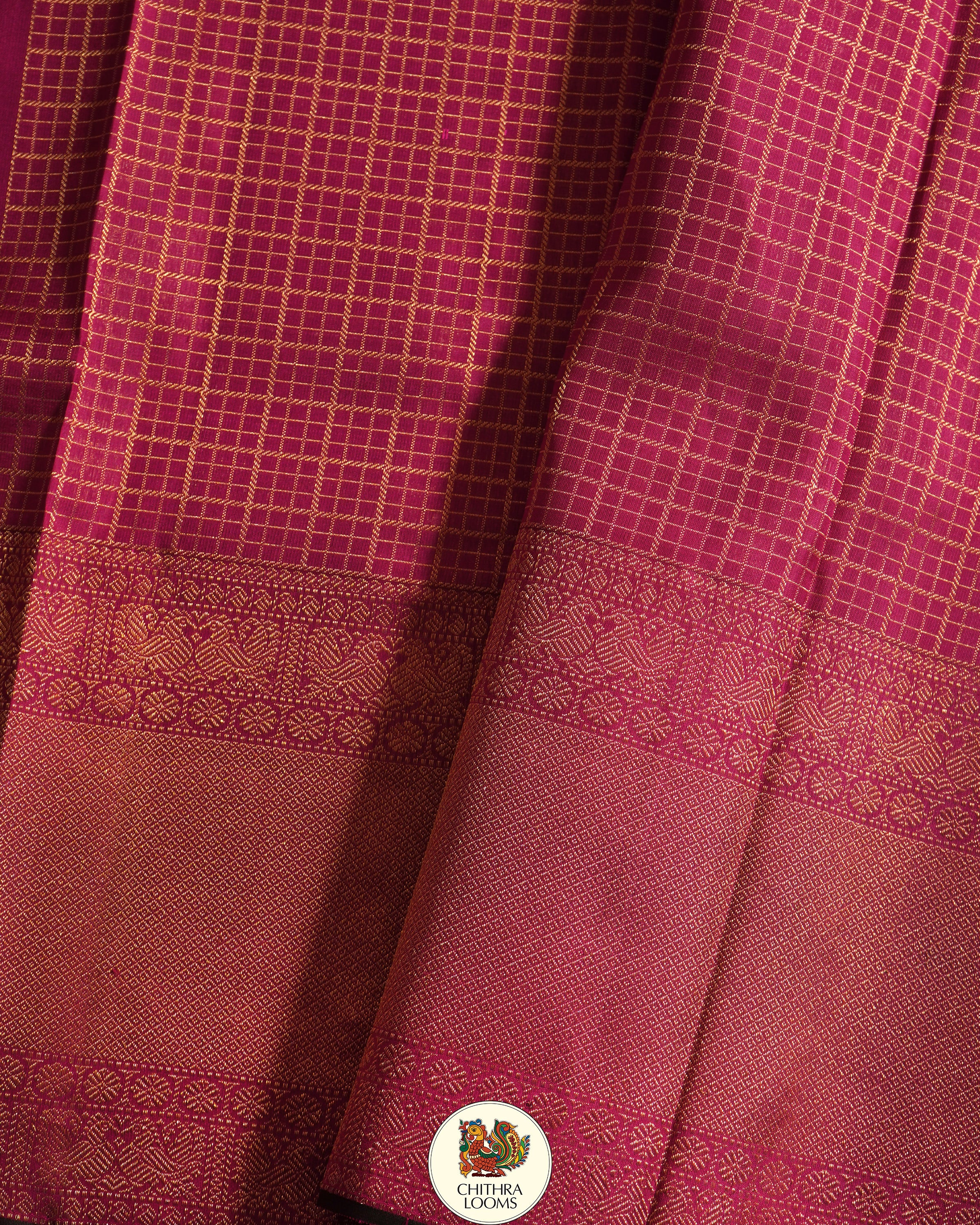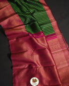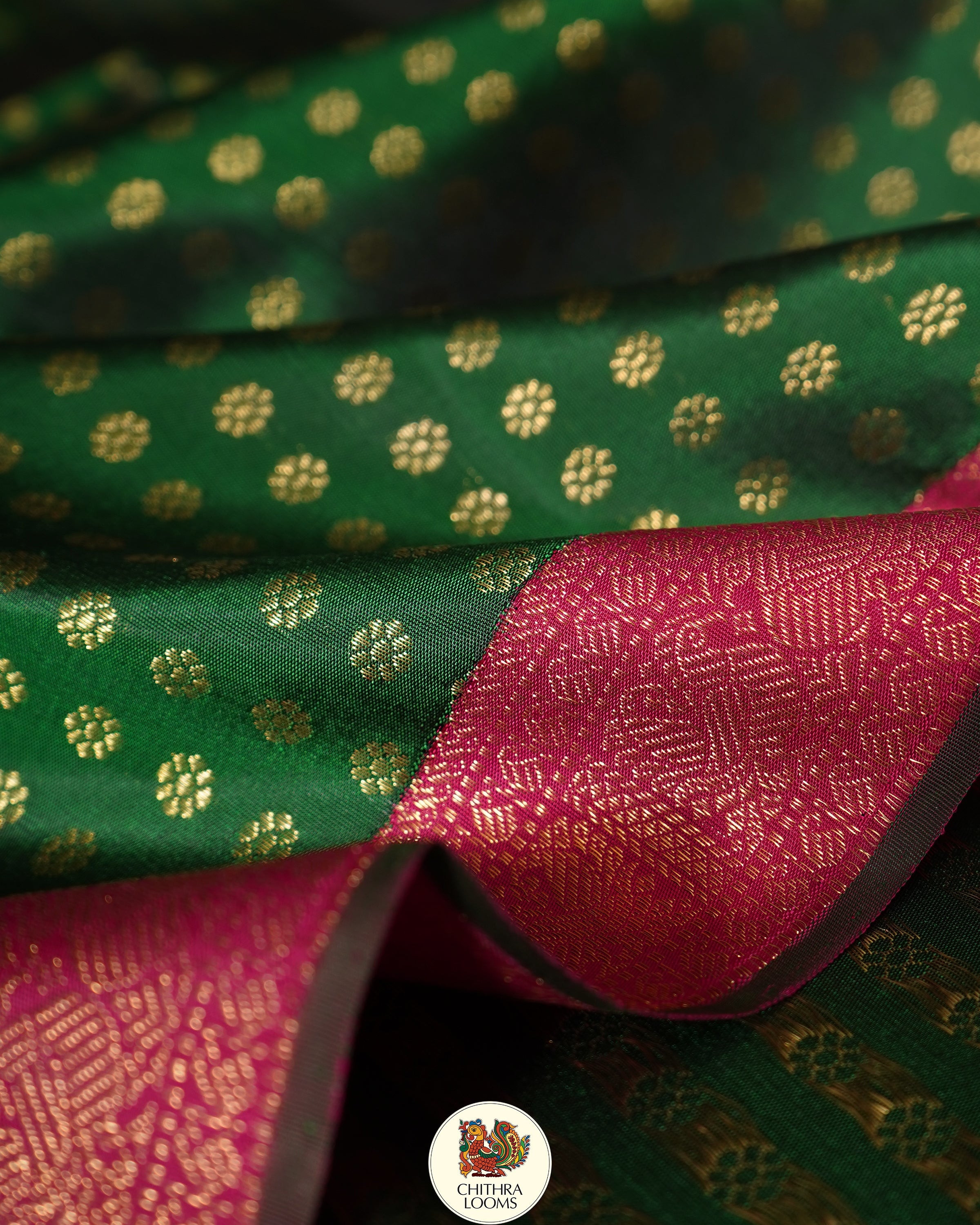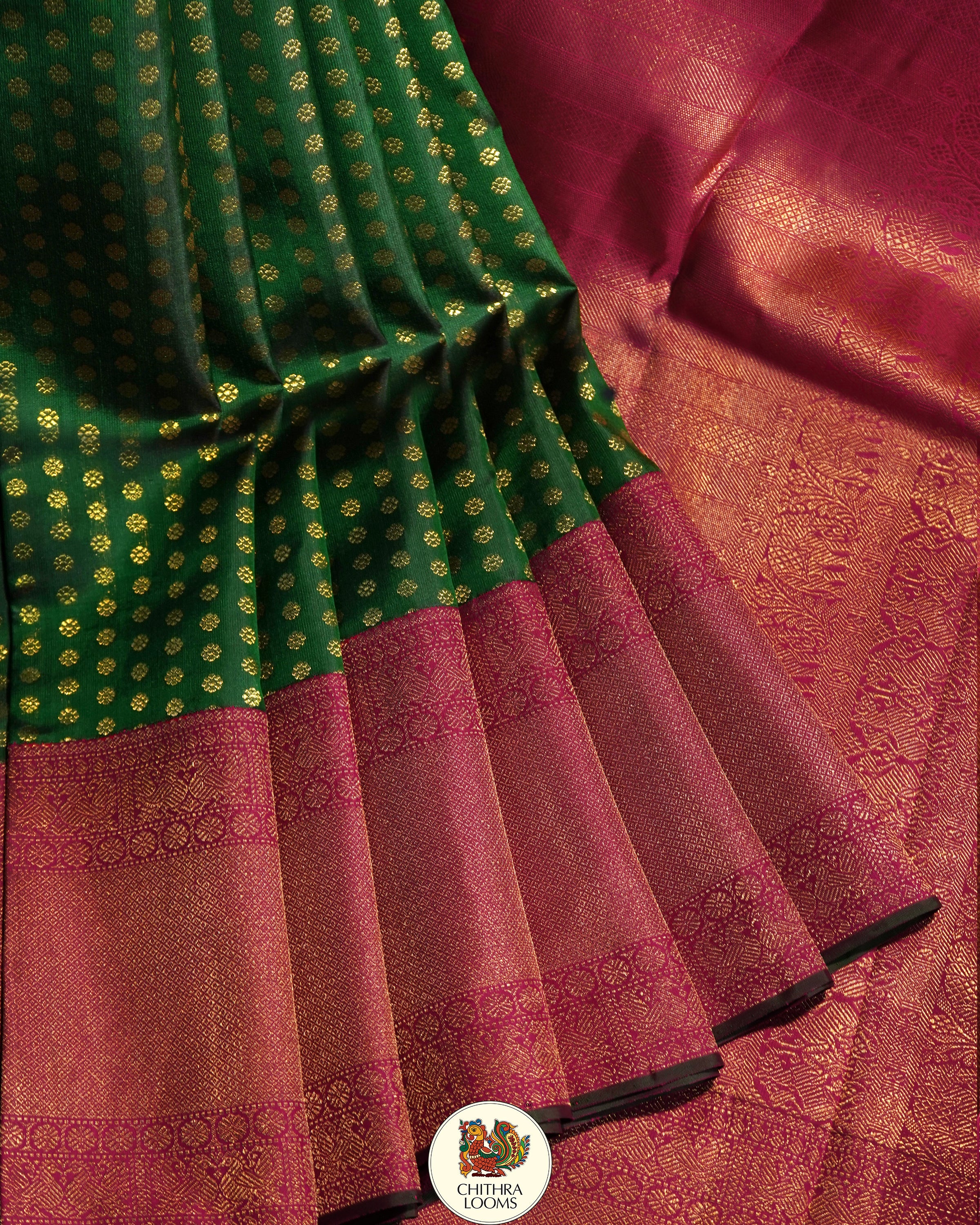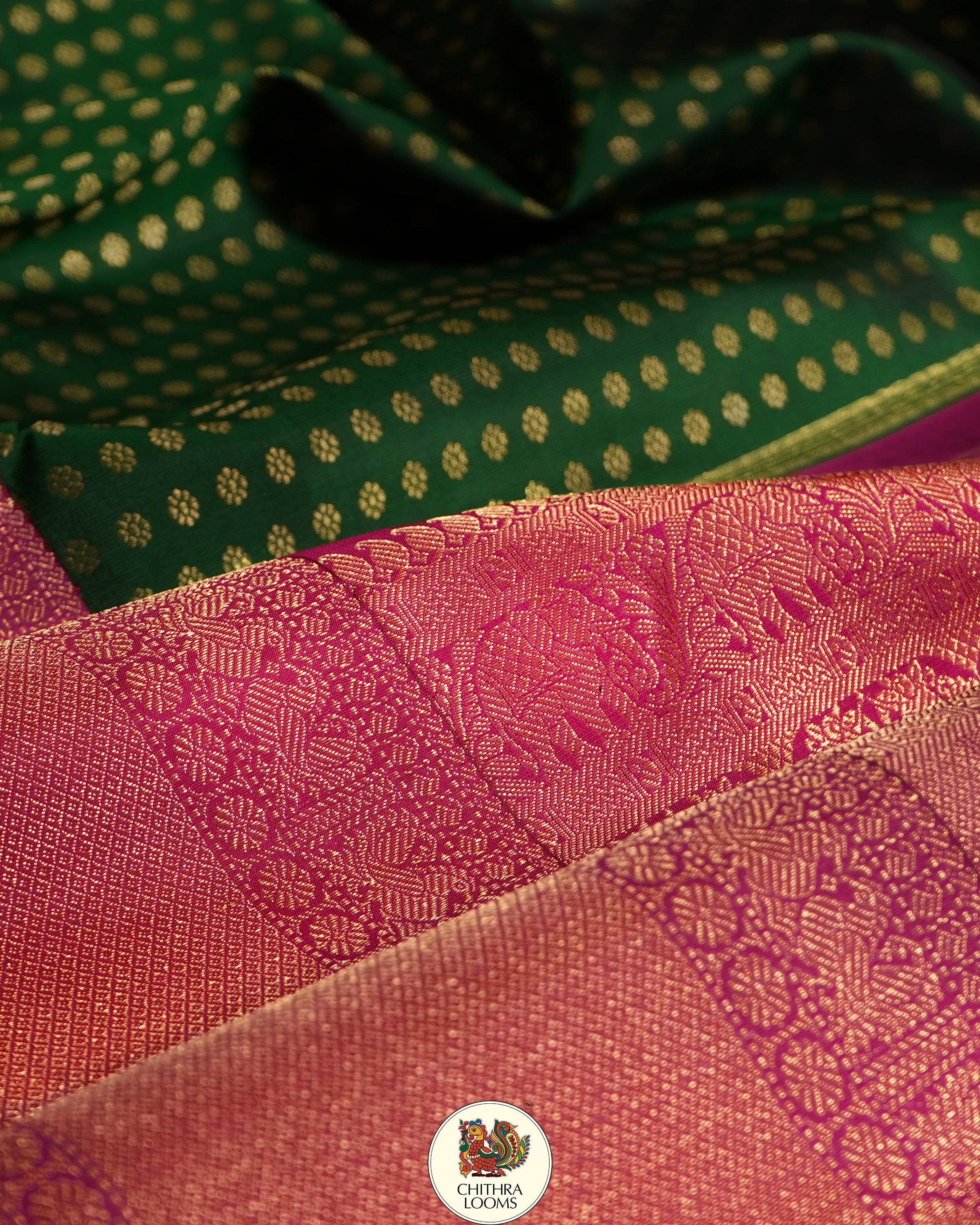 The body is dark green with Laksham kamalam butta and the borders are dark pink with annam and benars pet and the top is small border and the Palla is dense pure zari Palla and this pattern of saree is fully weft graph saree were borders are also designed via weft and worked blouse