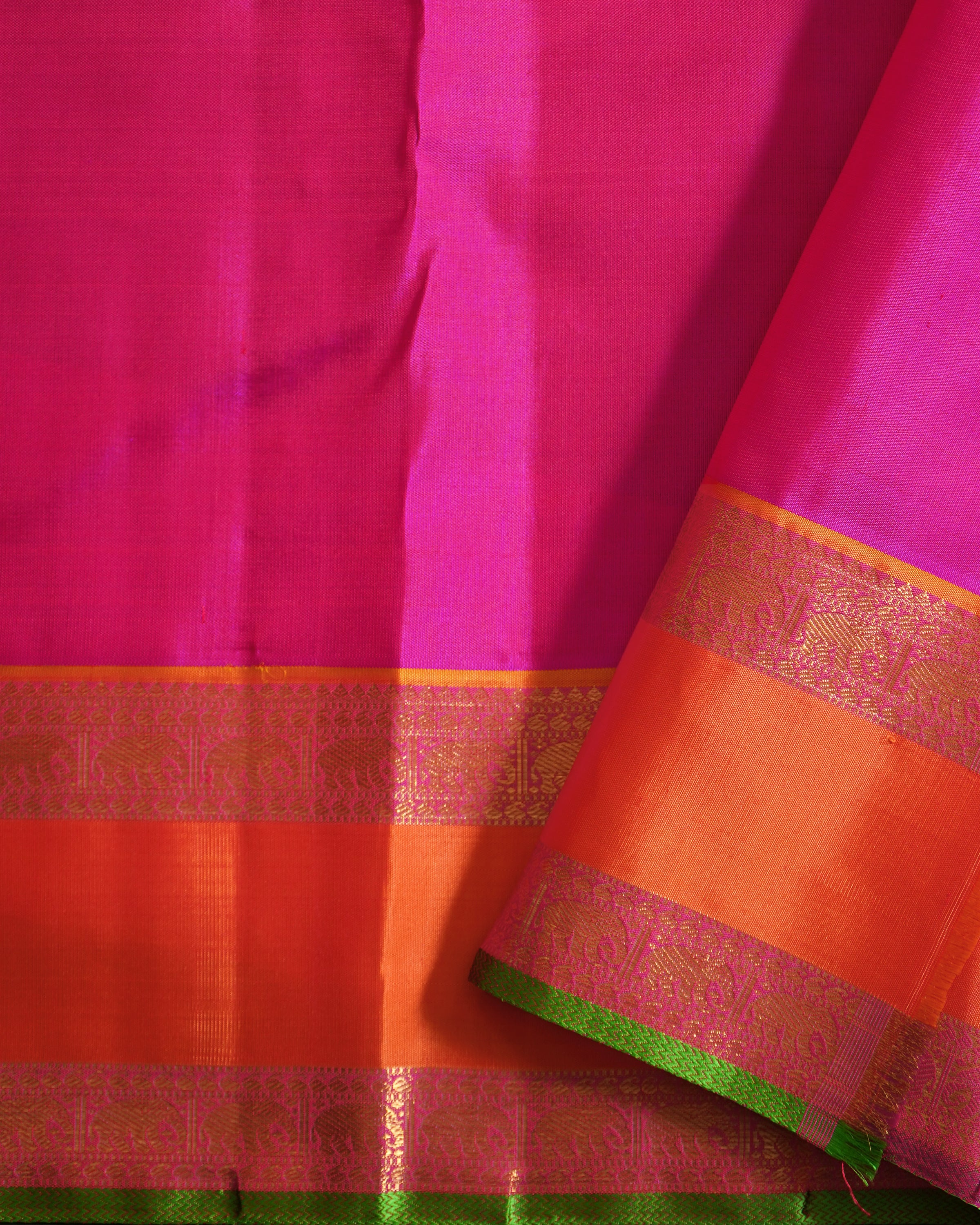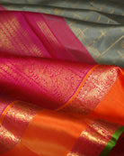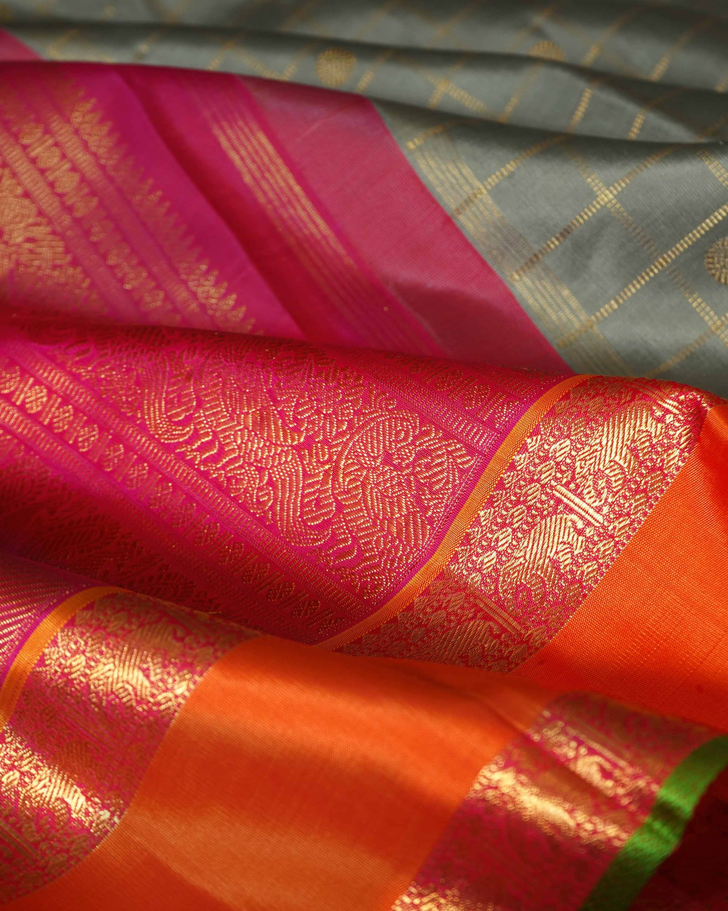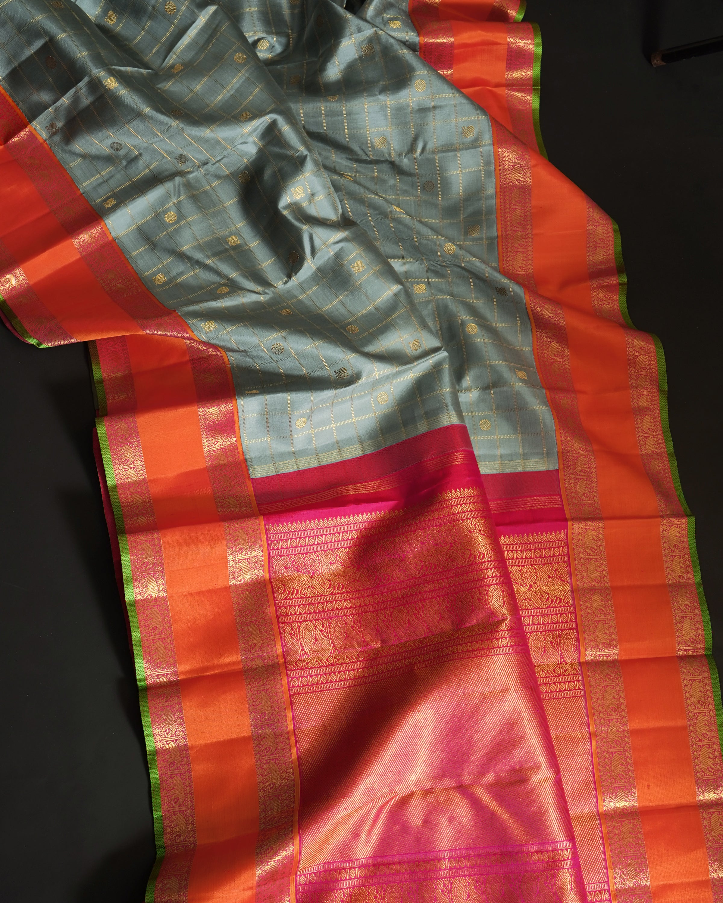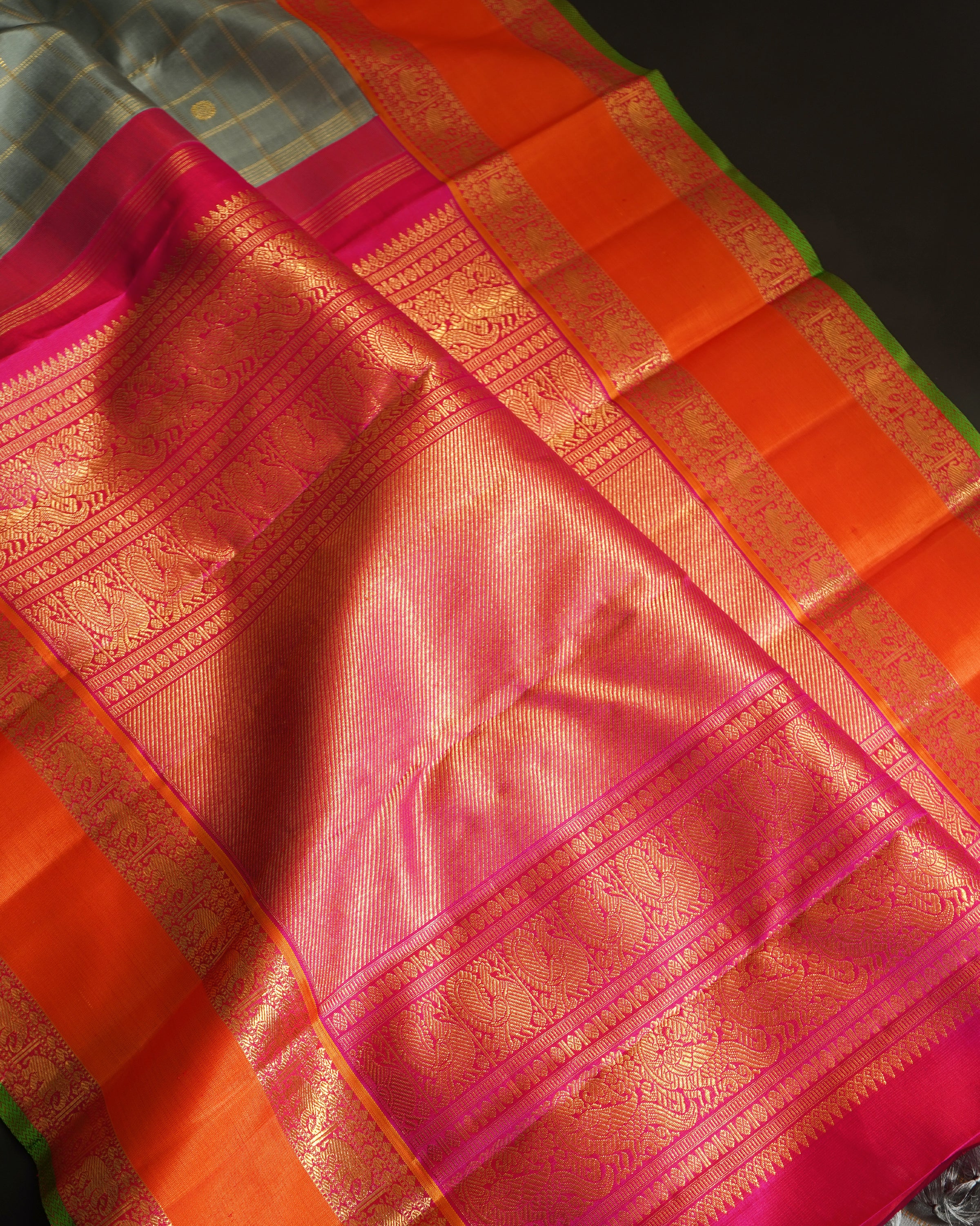 The saree is grey color with annam chakram Butta in kattam and kai korvai with orange retta pet and green selvedge and dense pure zari Palla and blouse