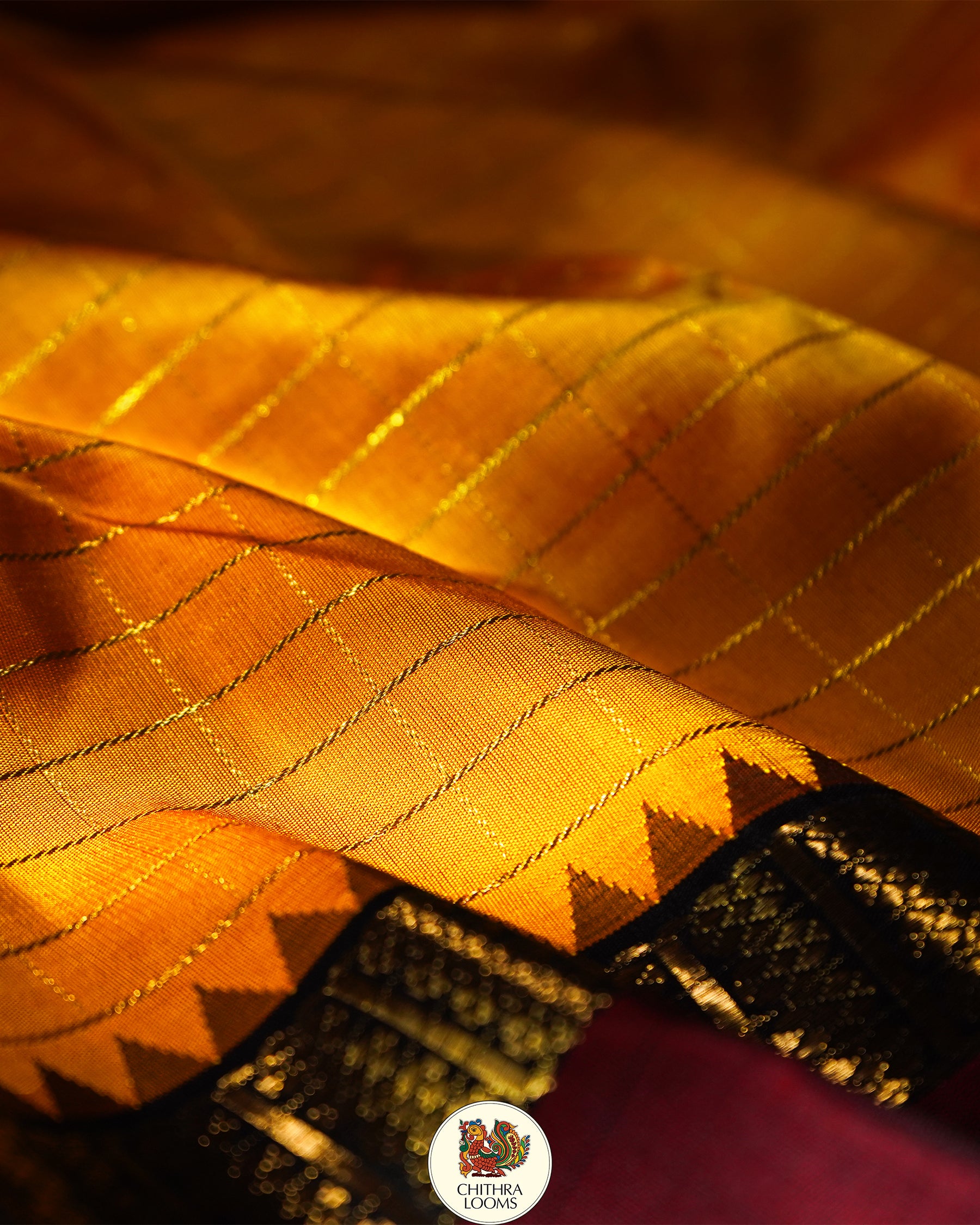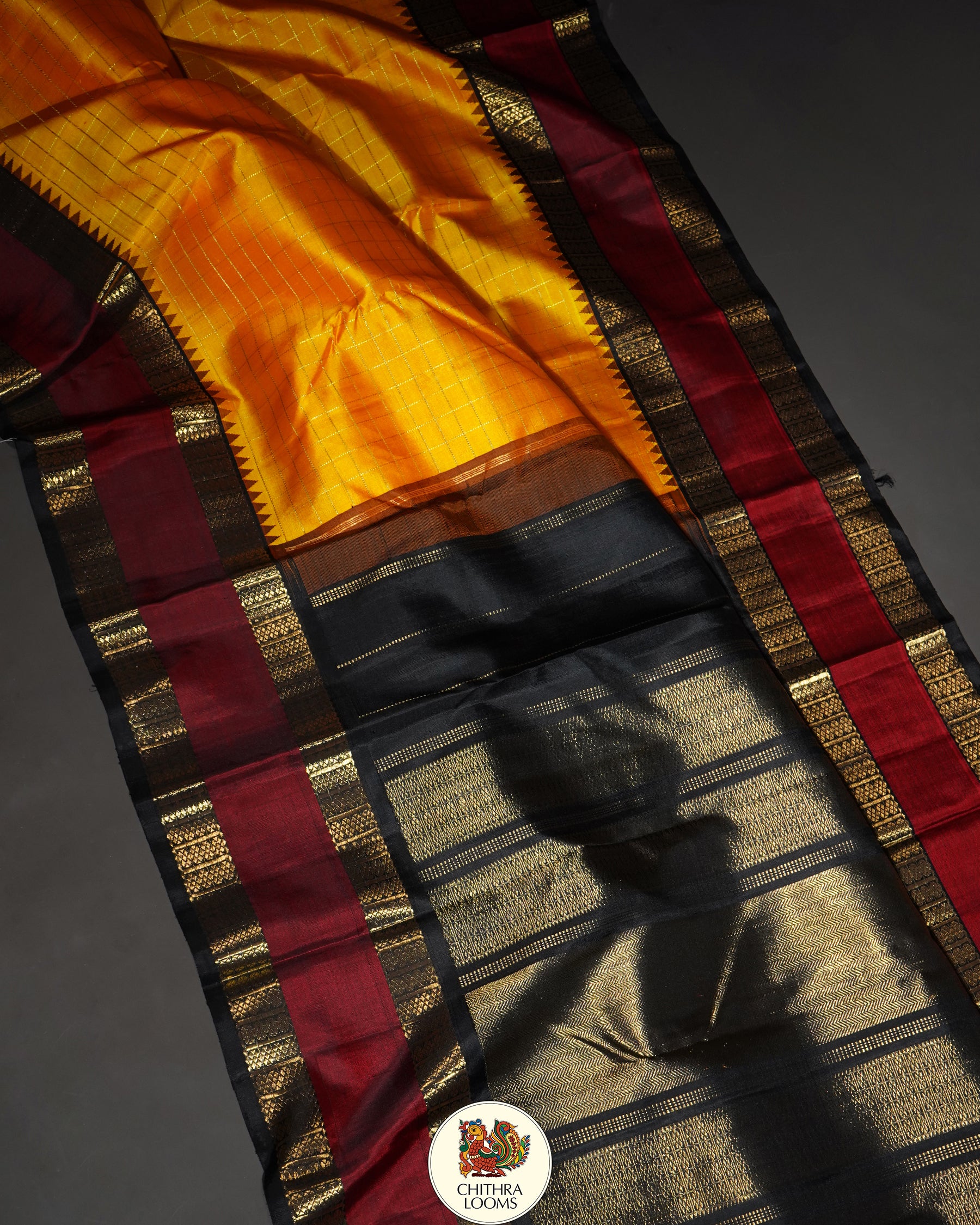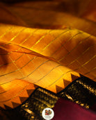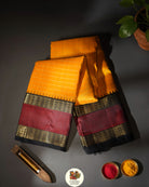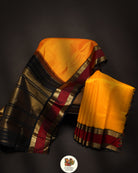 The saree is beautiful golden yellow colour with Zari Kattam with Kai Korvai retta pet black and Merron border and rich dense palla and blouse